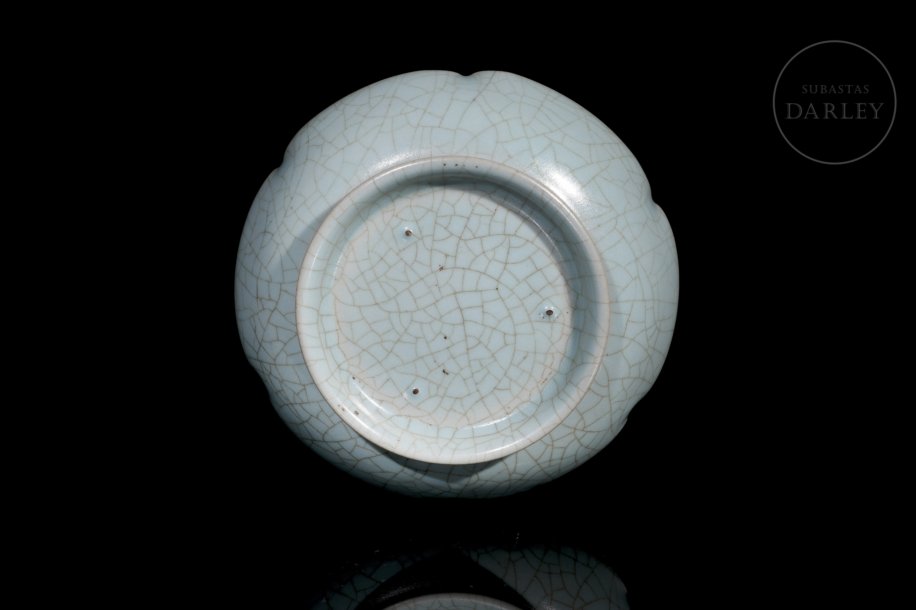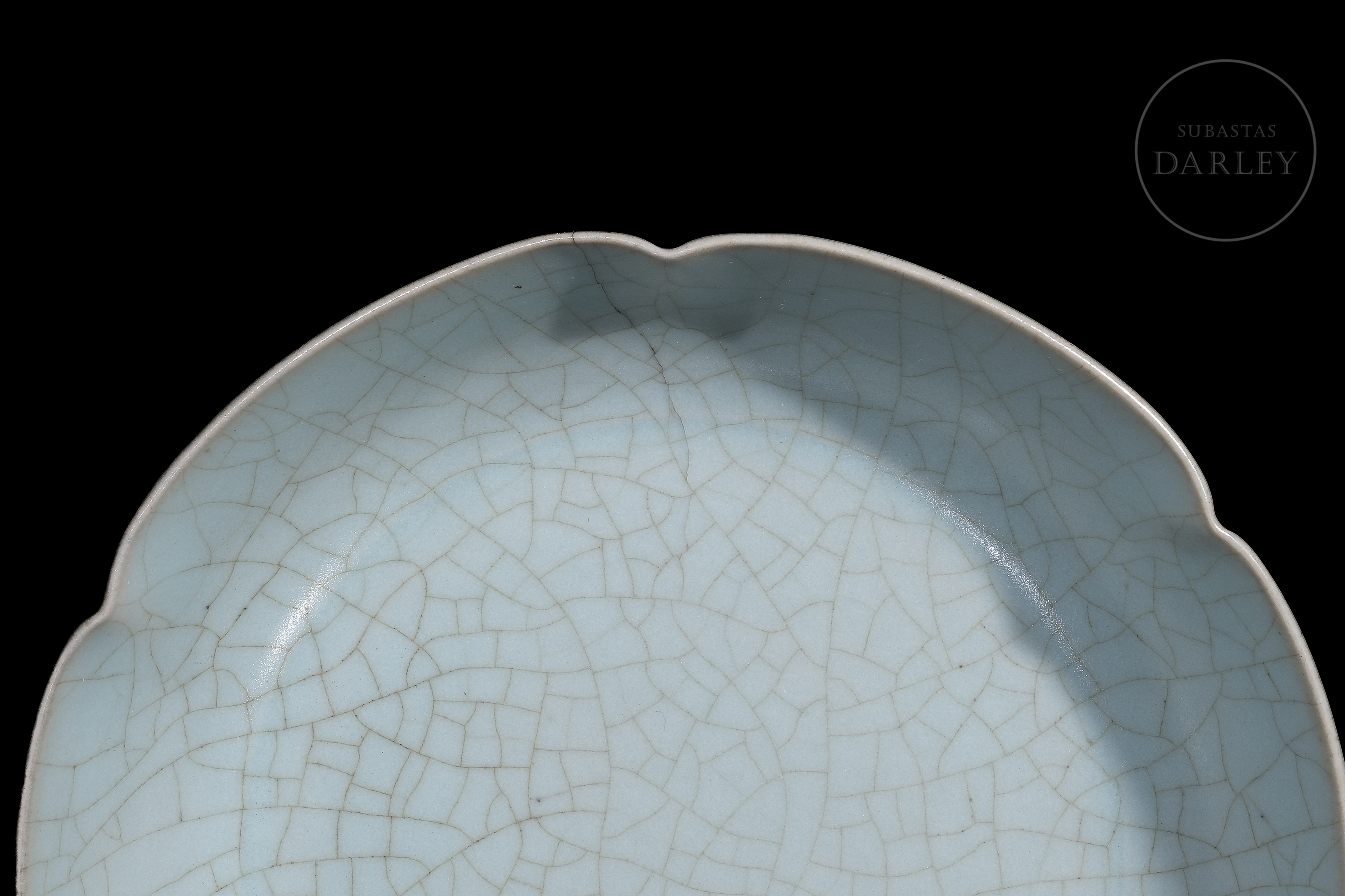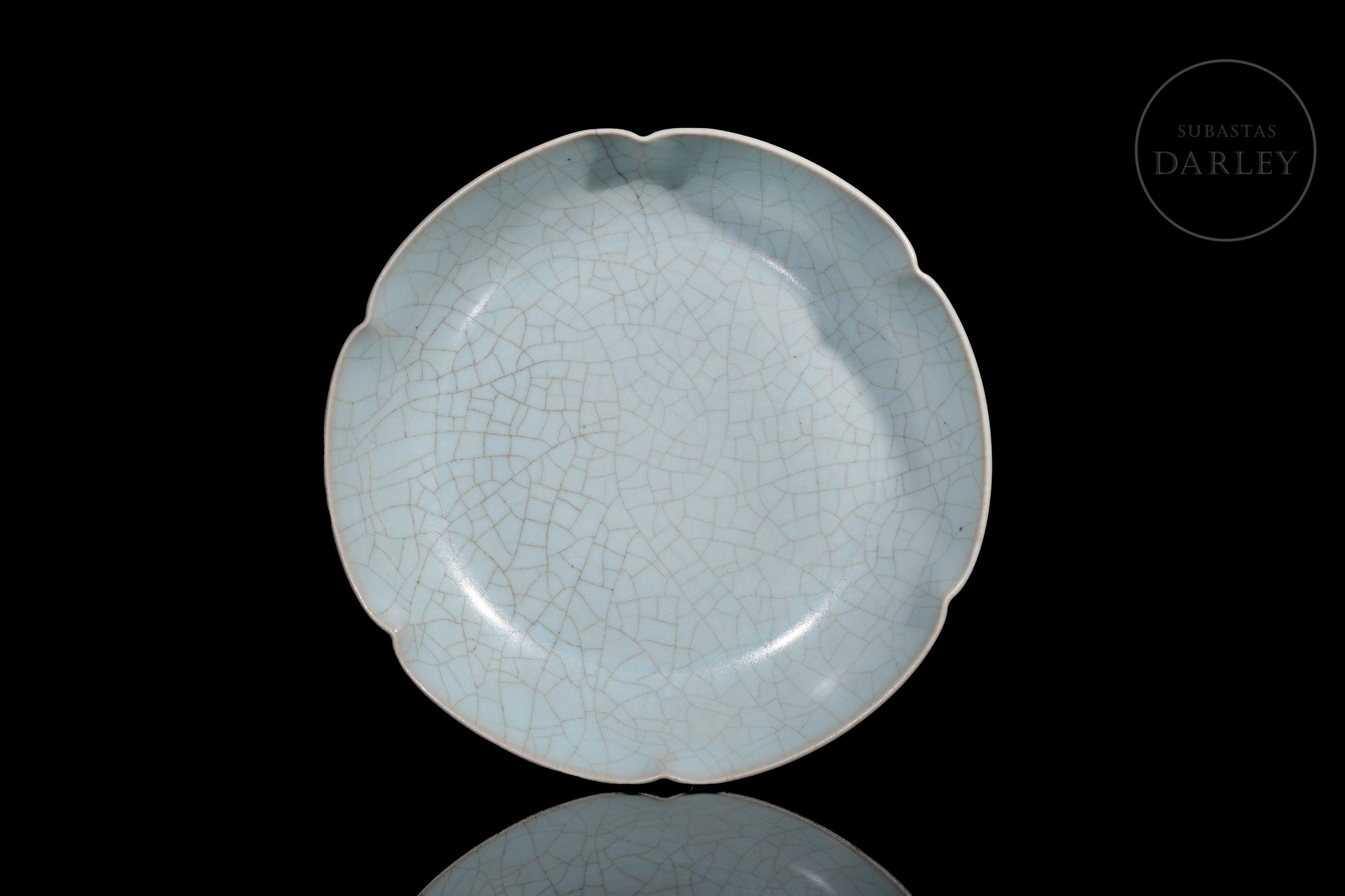 Plato de porcelana, de paredes suavemente curvadas y borde lobulado a modo de flor, enteramente cubierto por un esmalte de color celeste o celadón. Toda la superficie del vidriado está recorrida por una fina red de craquelado. La base, también vidriada, presenta tres diminutas marcas de espuela, de cocción. Dinastía Song (960 - 1279) o posterior.