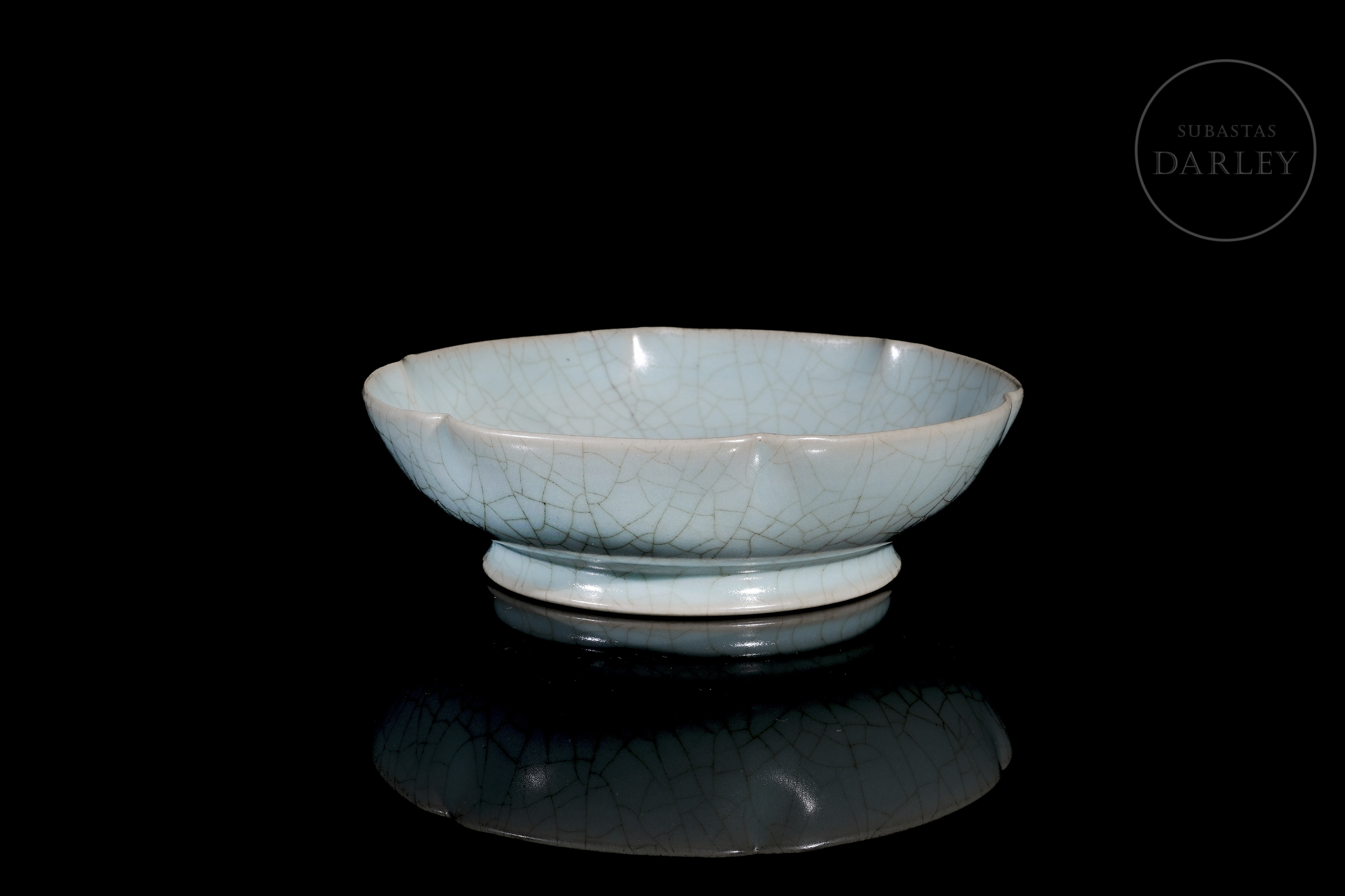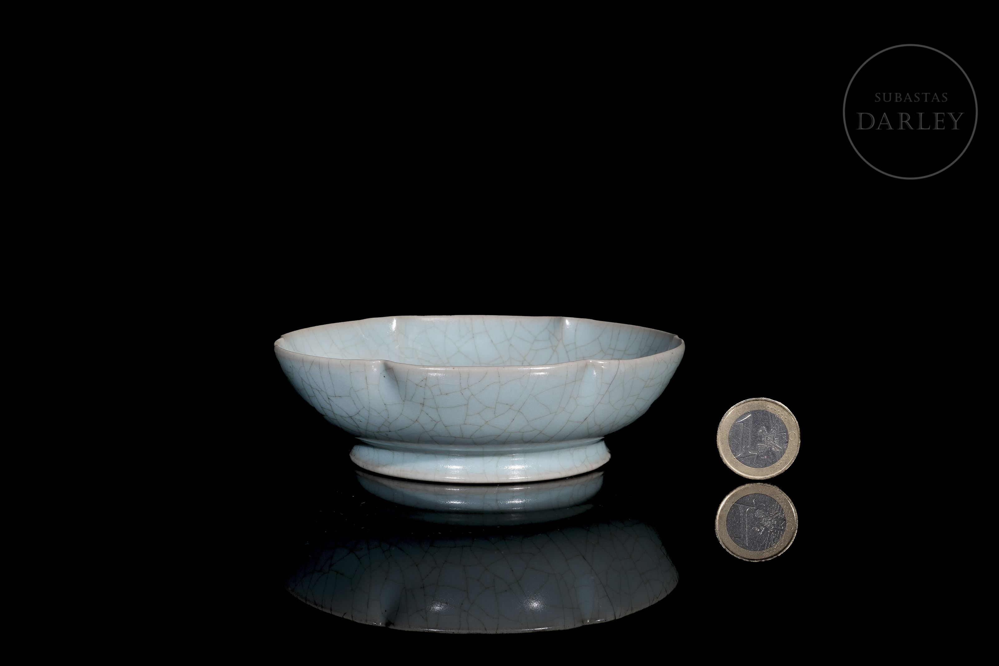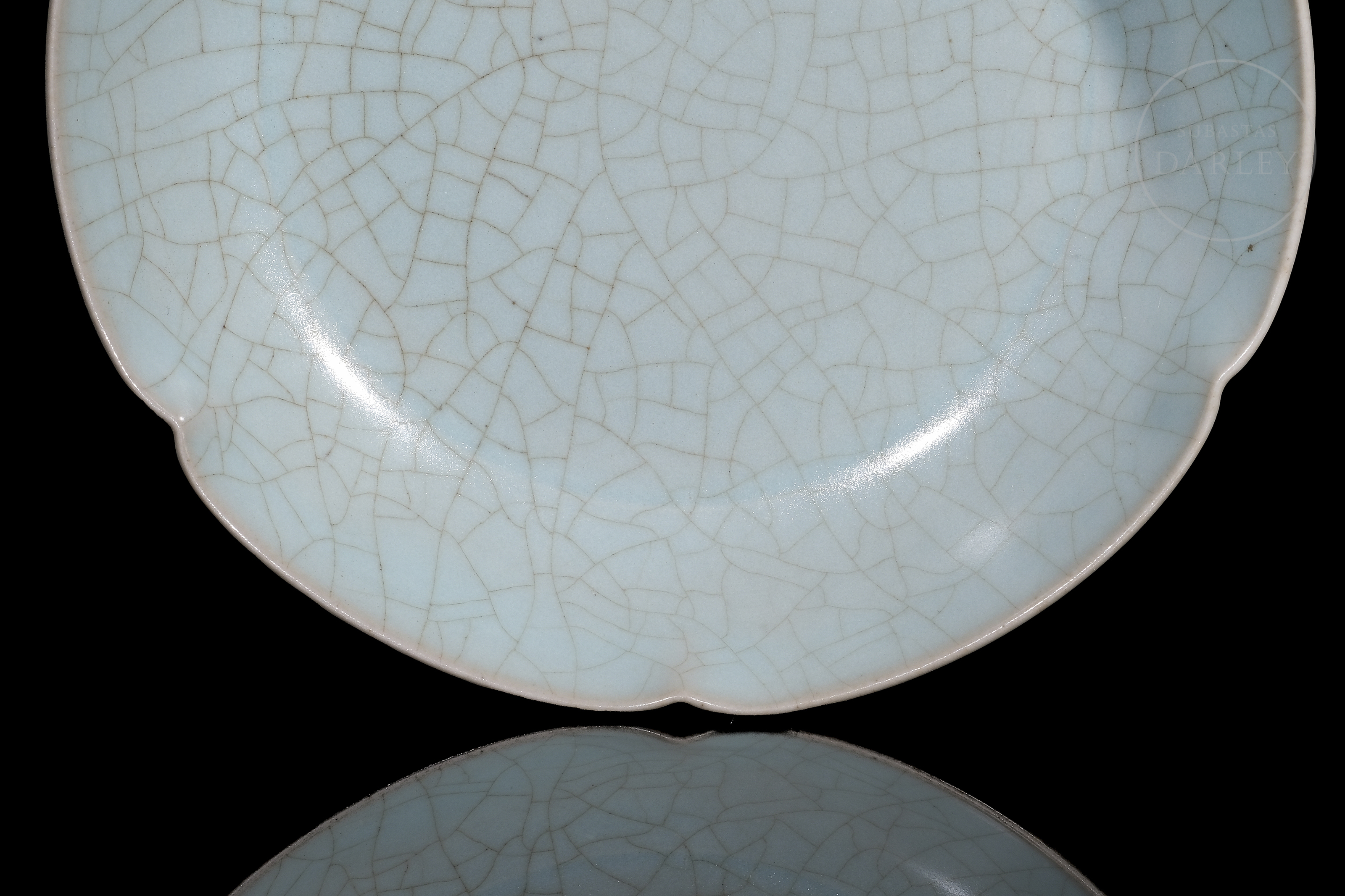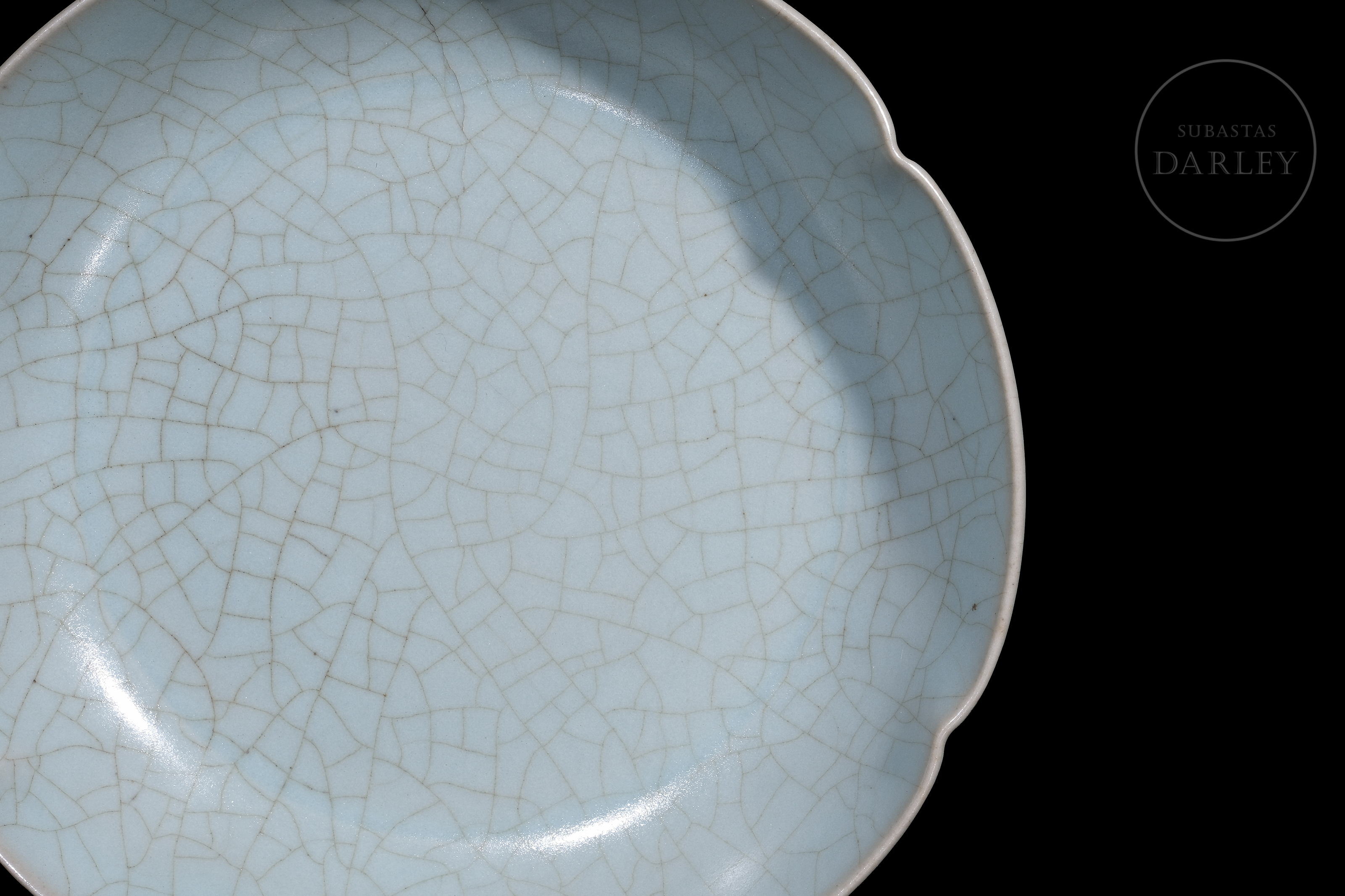 Plato de porcelana, de paredes suavemente curvadas y borde lobulado a modo de flor, enteramente cubierto por un esmalte de color celeste o celadón. Toda la superficie del vidriado está recorrida por una fina red de craquelado. La base, también vidriada, presenta tres diminutas marcas de espuela, de cocción. Dinastía Song (960 - 1279) o posterior.