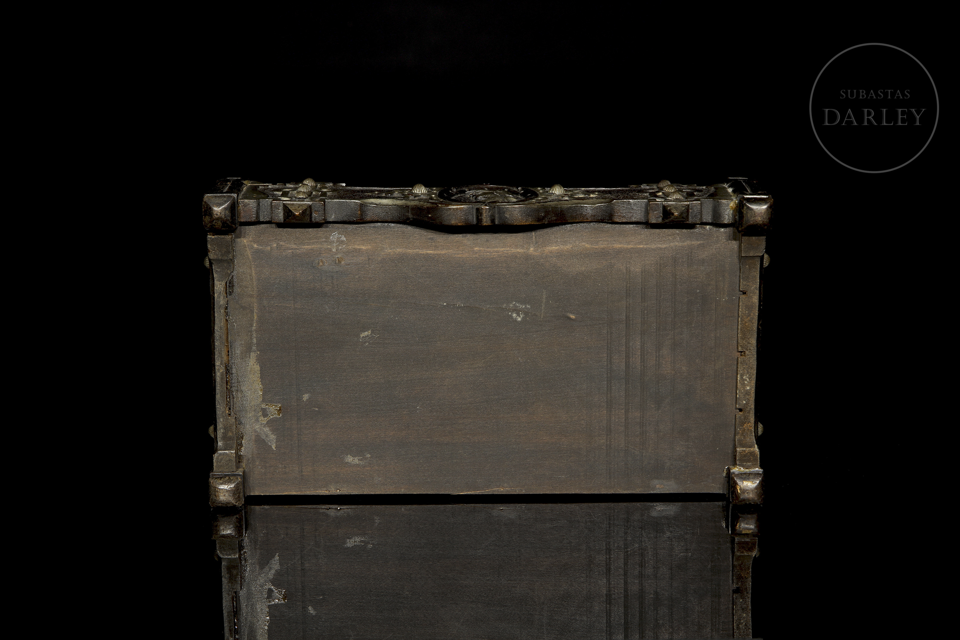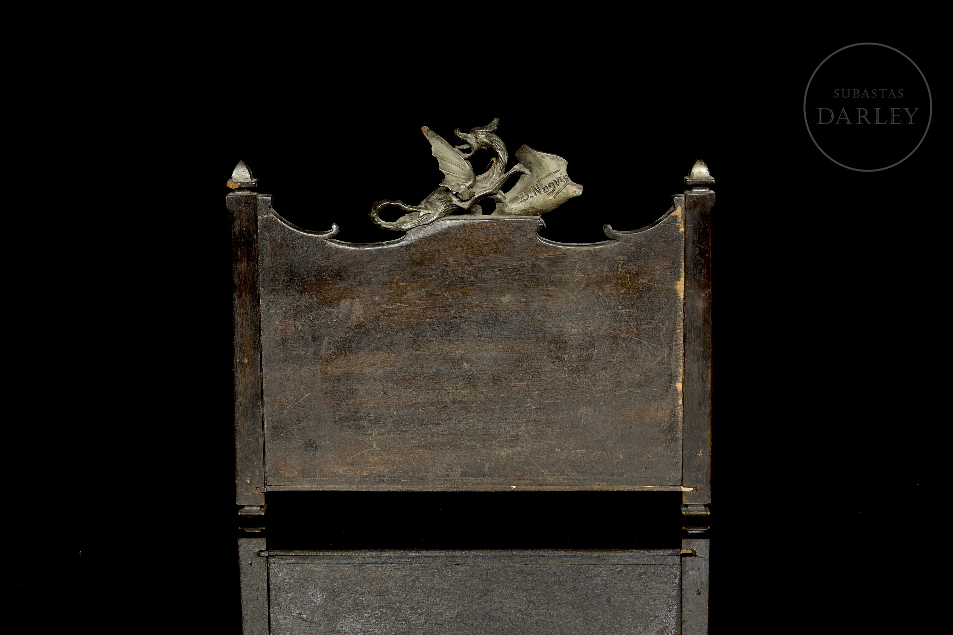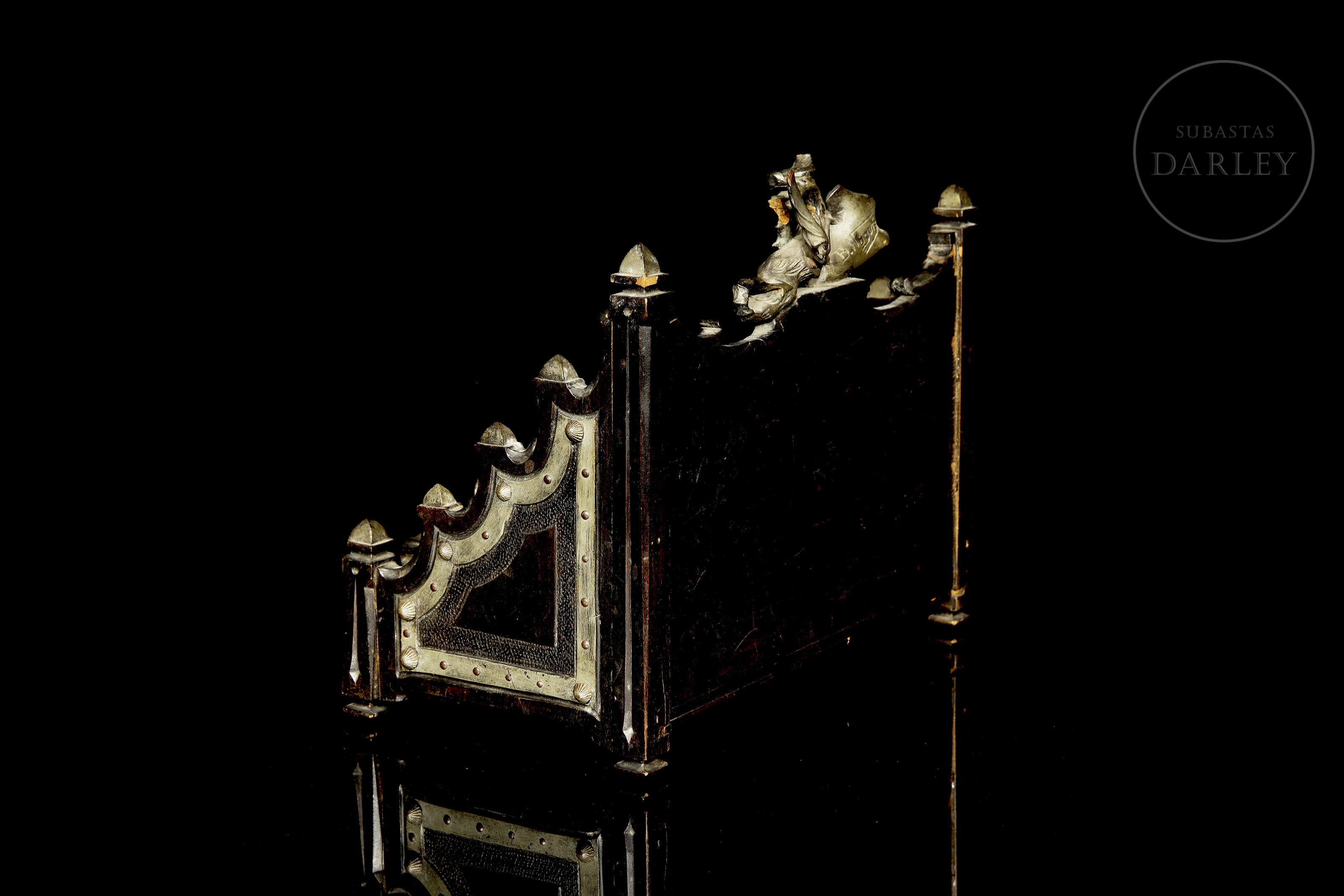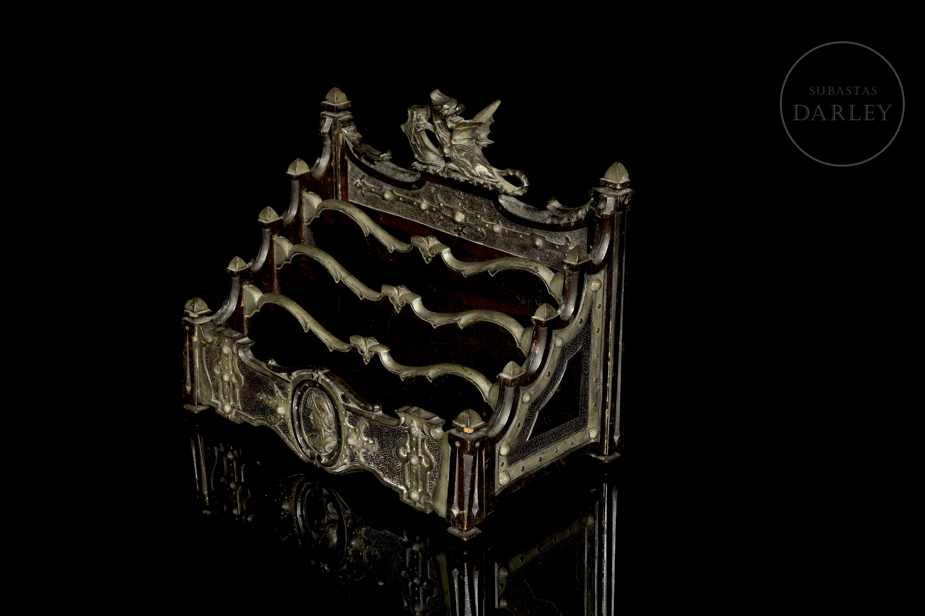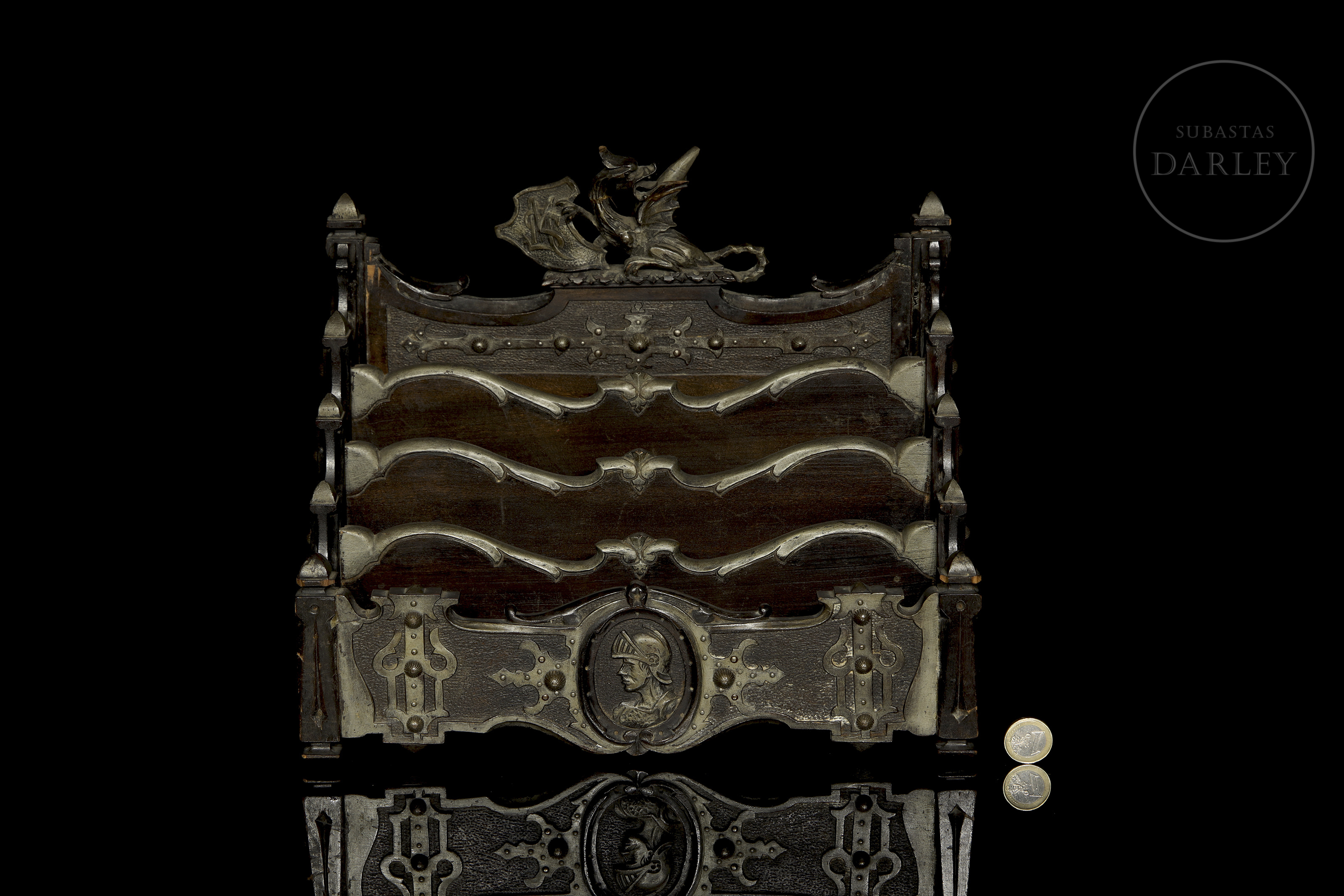 Organizador o porta cartas de estilo ornamental, fabricado en madera oscura con aplicaciones decorativas de metal. Cuenta con tres compartimentos o ranuras diseñadas para clasificar, parte inferior central, cuenta con un medallón que representa un perfil de guerrero o una figura histórica.