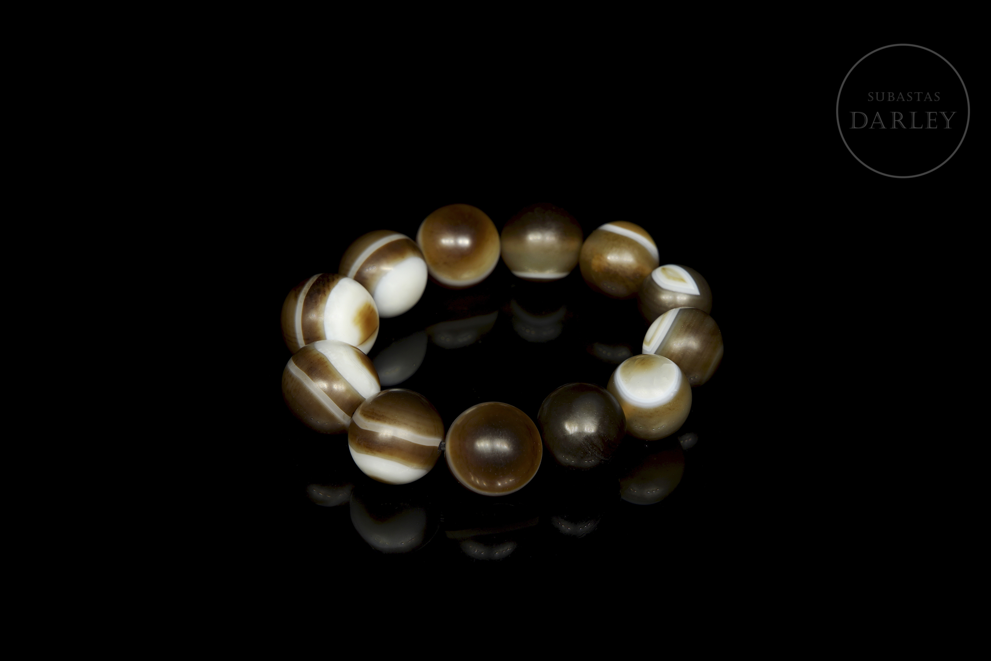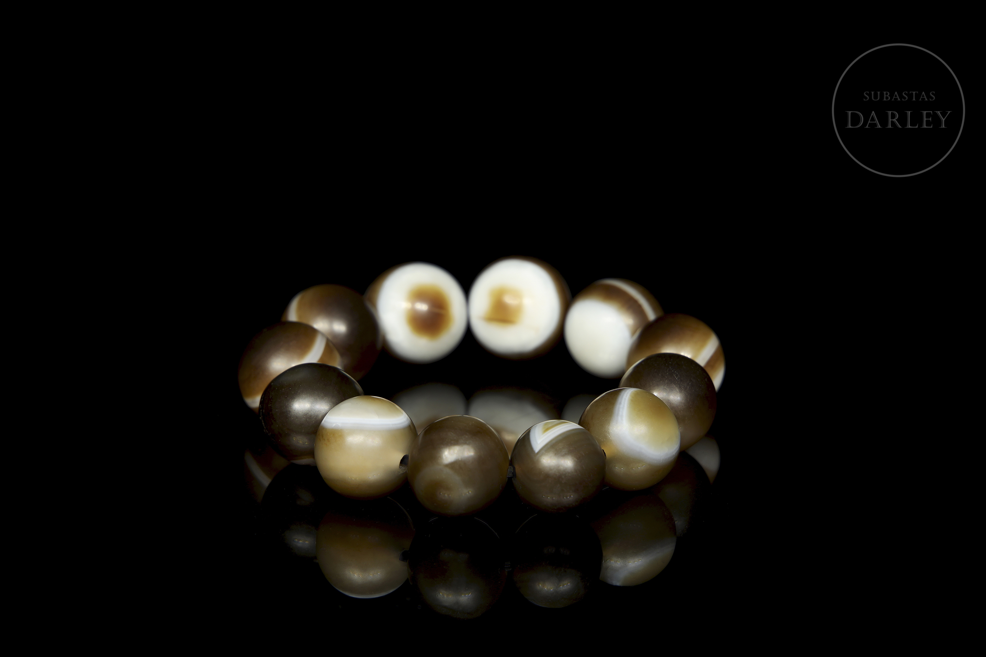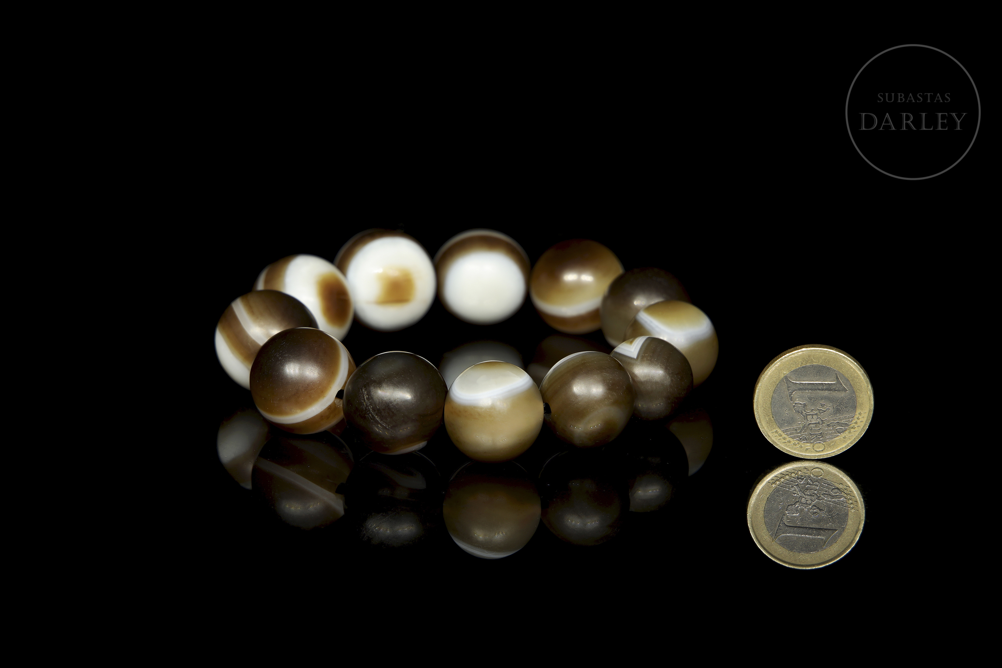 Pulsera de doce cuentas de ágata tallada. Adornada por la alternancia de bandas concéntricas naturales en tonos marrón chocolate, ocre, gris humo y blanco lechoso. Las doce cuentas poseen formato esférico que recuerda a la estructura de un ojo, símbolo tradicional de protección. Muestra pátina por envejecimiento. Dinastía Liao (916–1125).