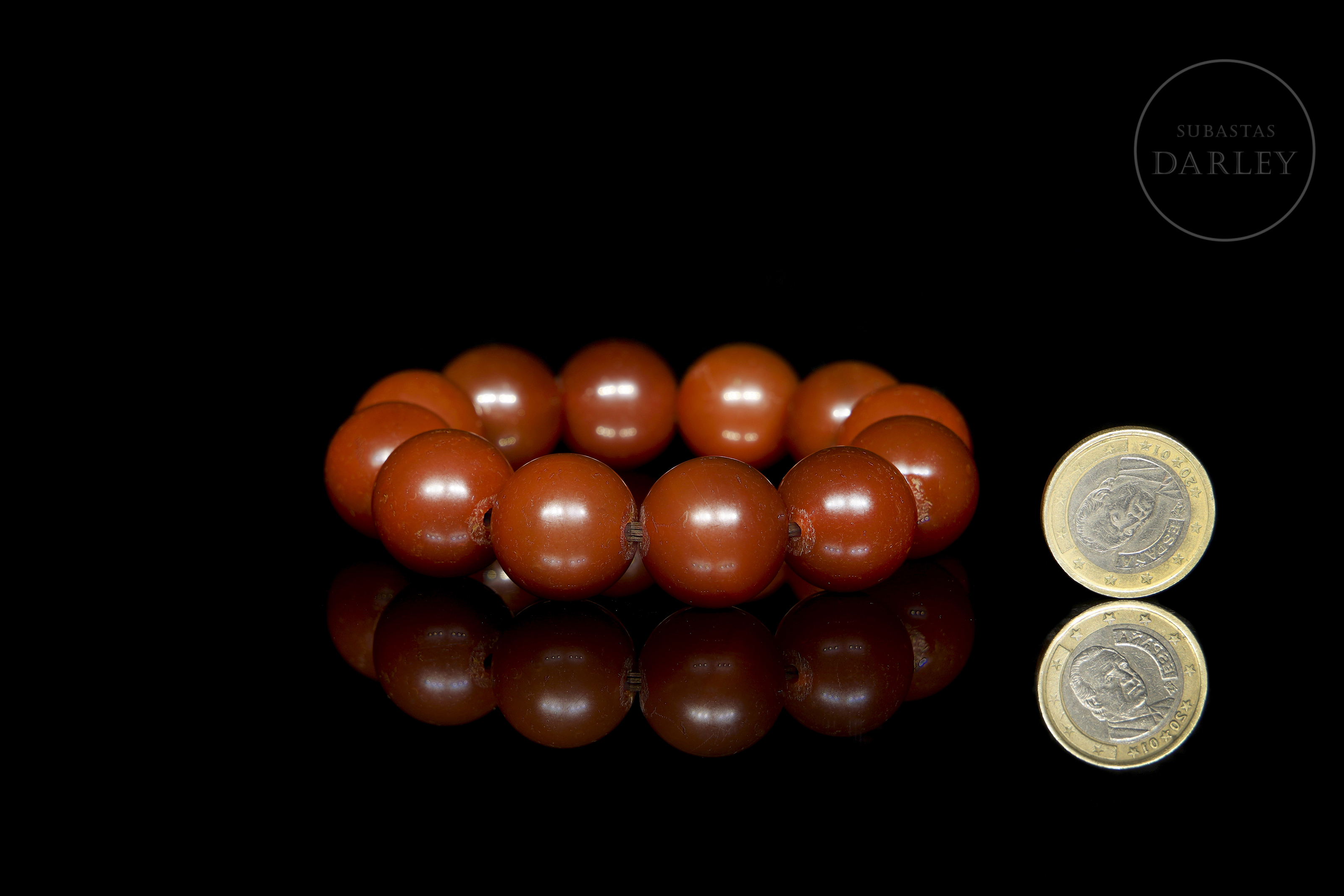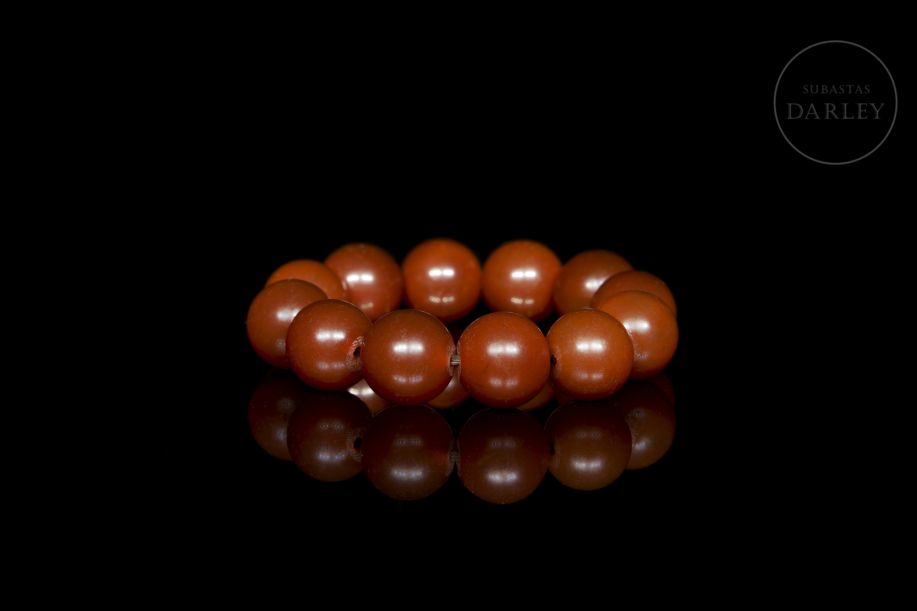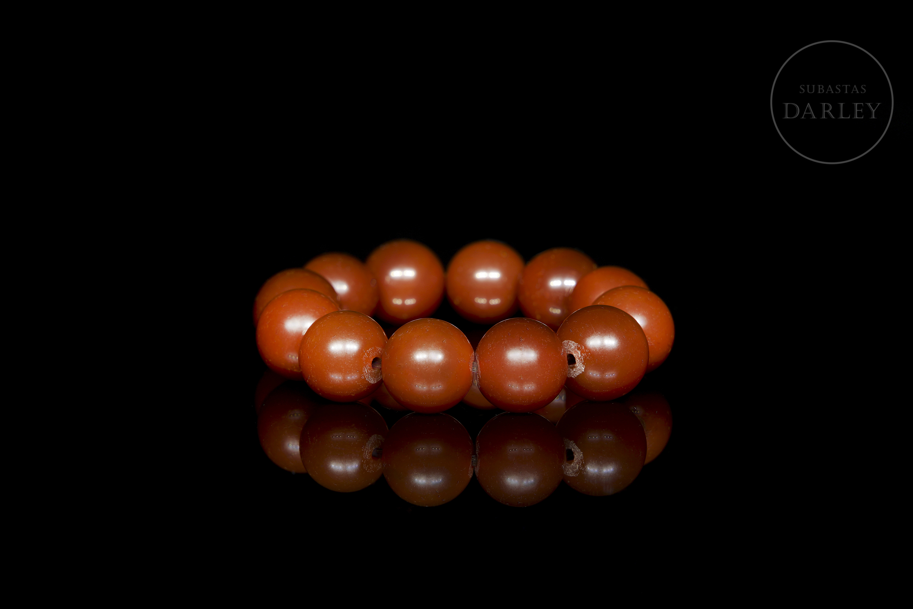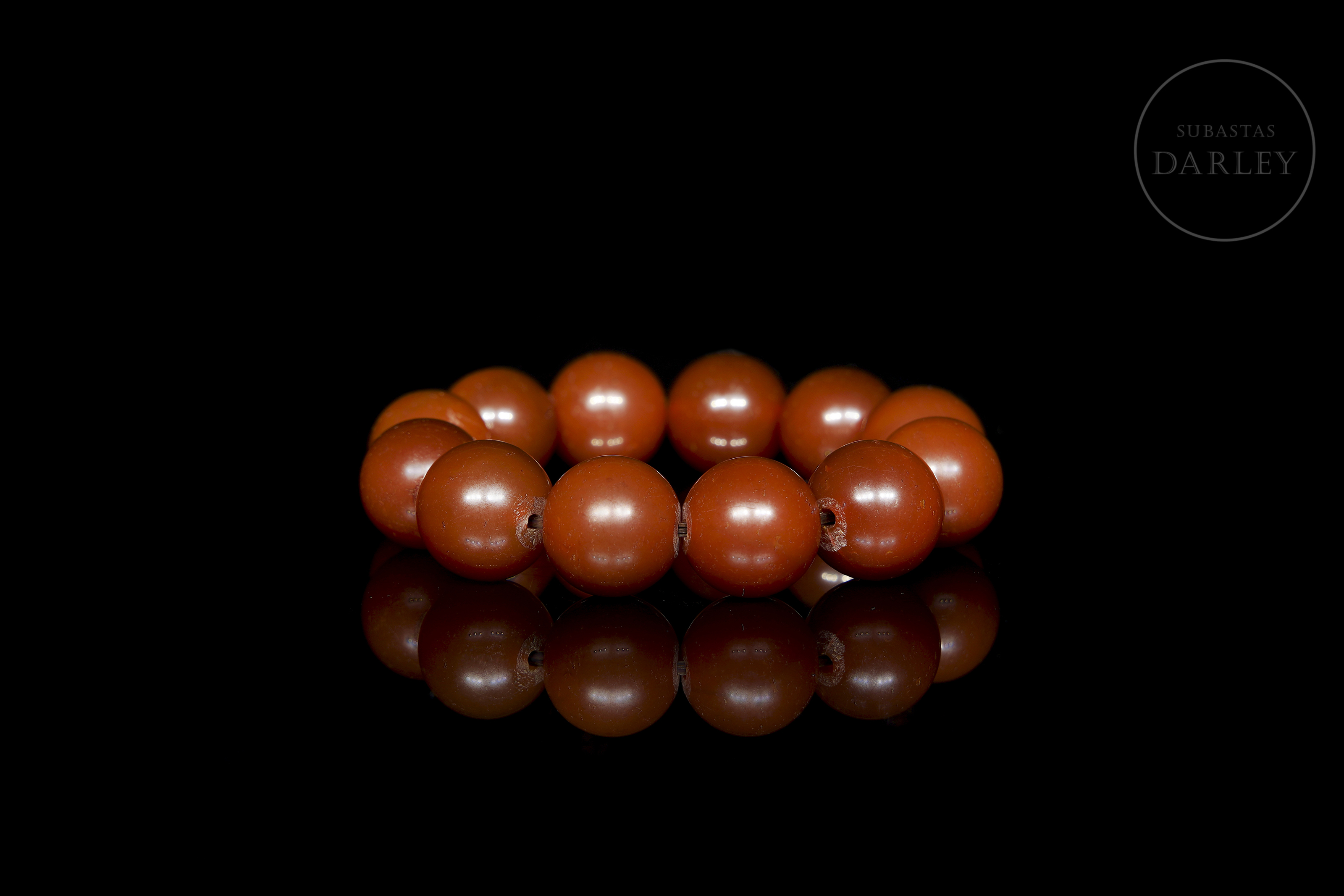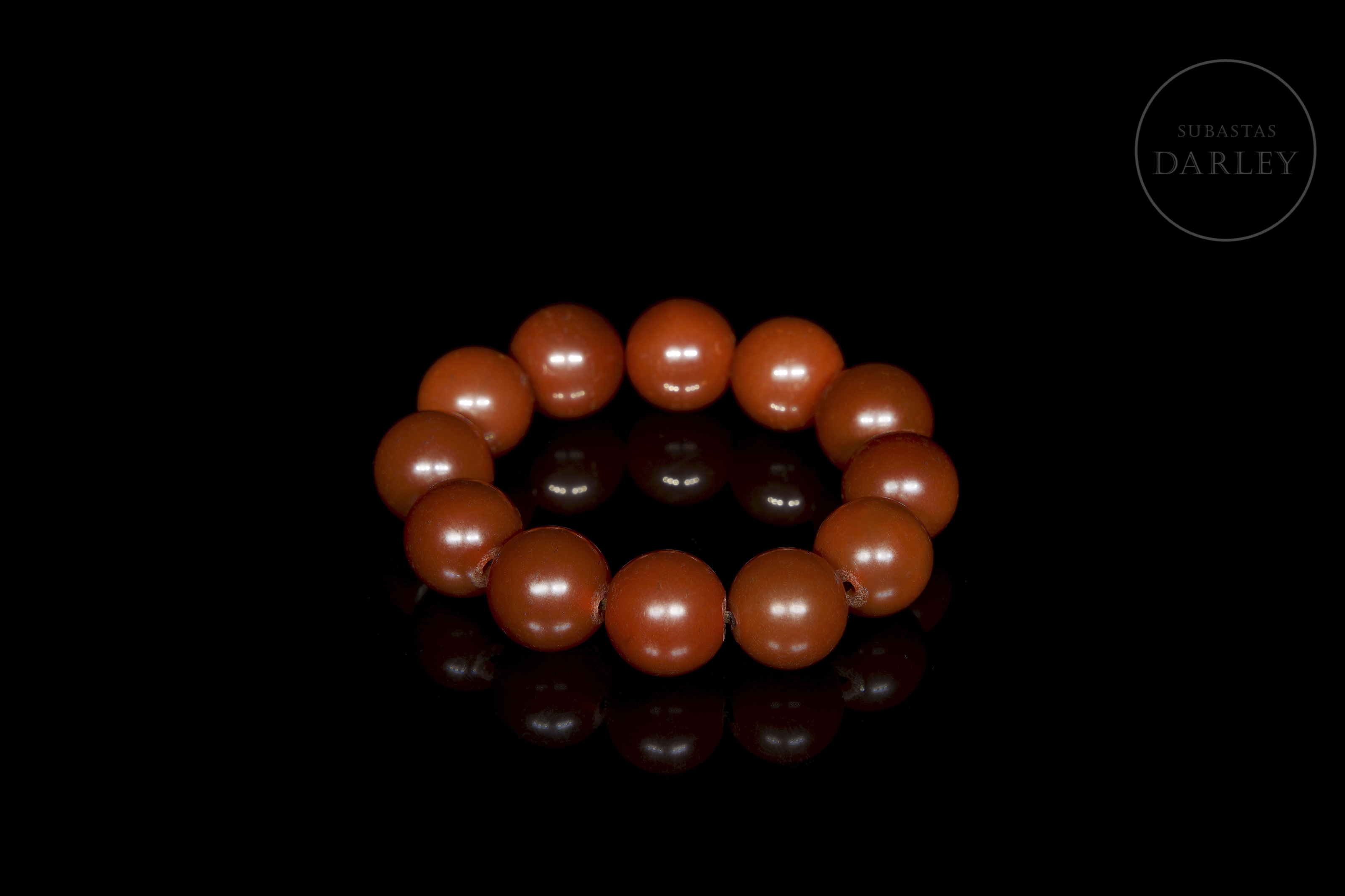 Formada por doce cuentas de ágata "Nanhong", caracterizadas por su intenso y profundo color rojo anaranjado con sutiles variaciones tonales y zonas de suave translucidez. Cada cuenta presenta un formato esférico con una perforación central. Muestra pátina y desgaste por antigüedad. Dinastía Liao (916–1125).
