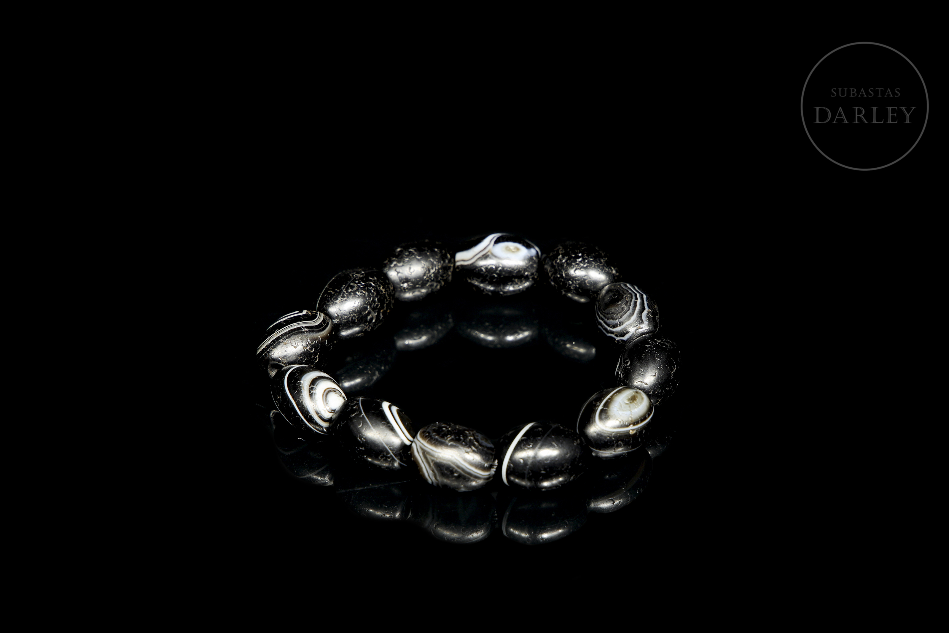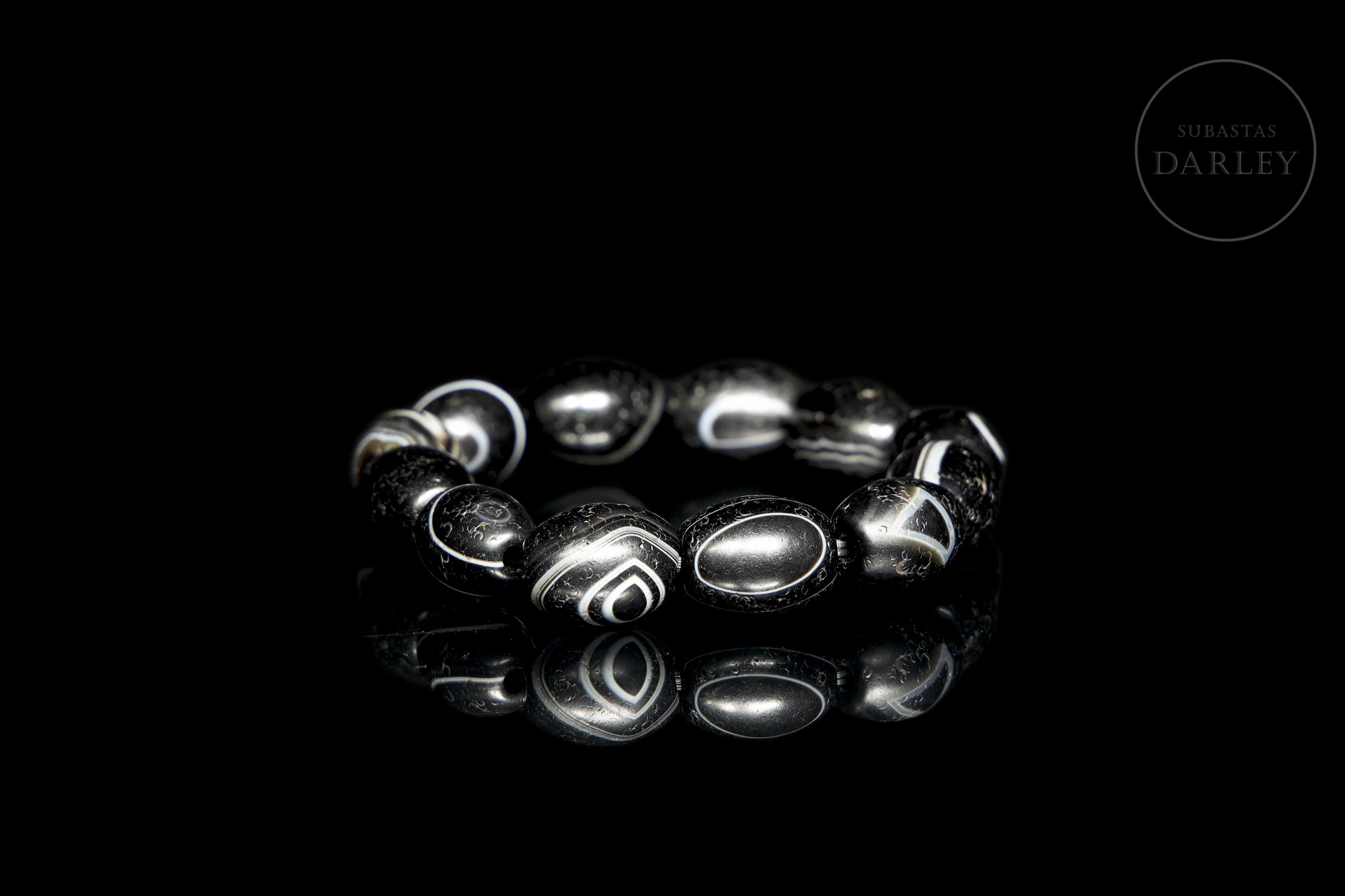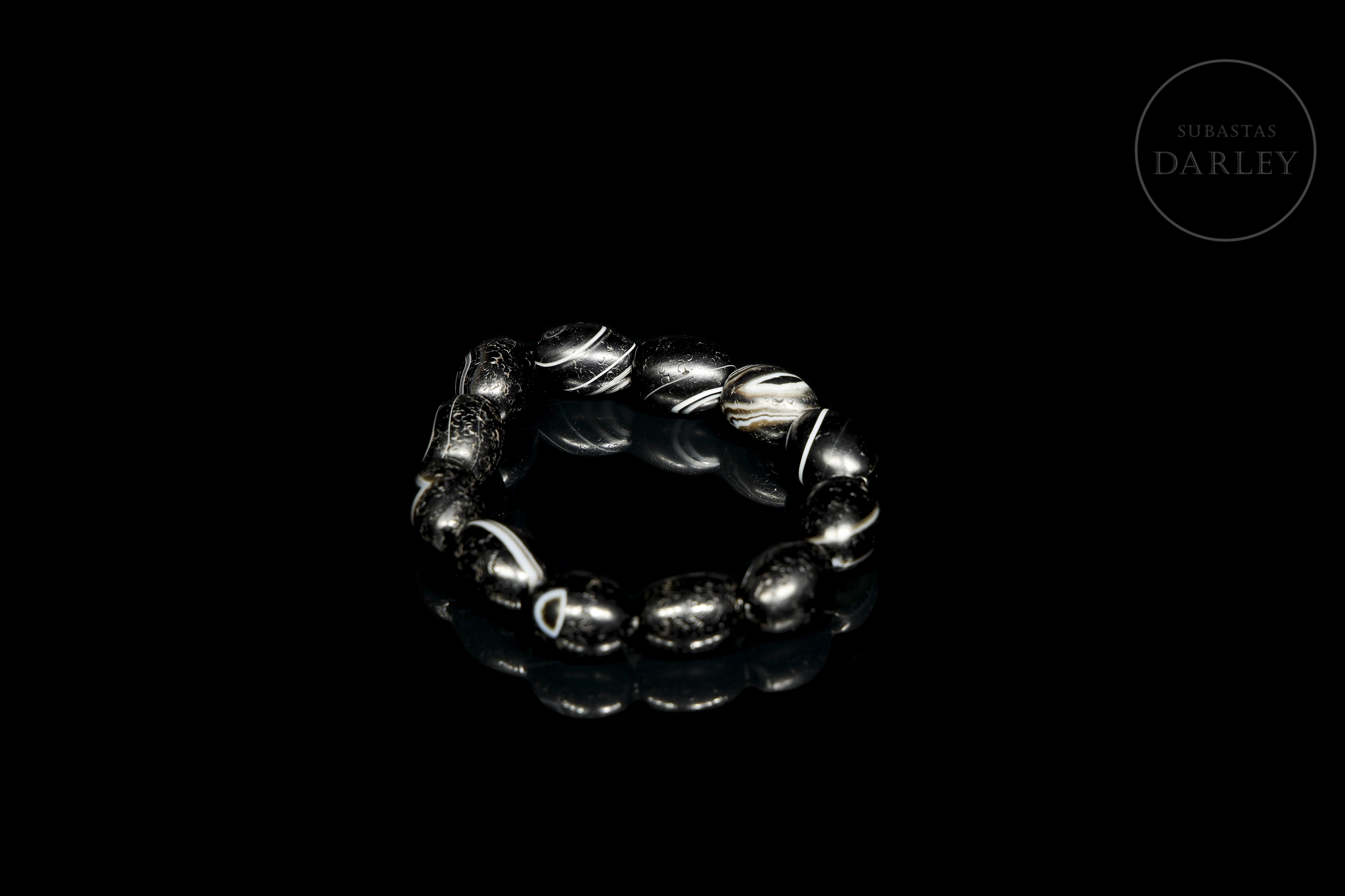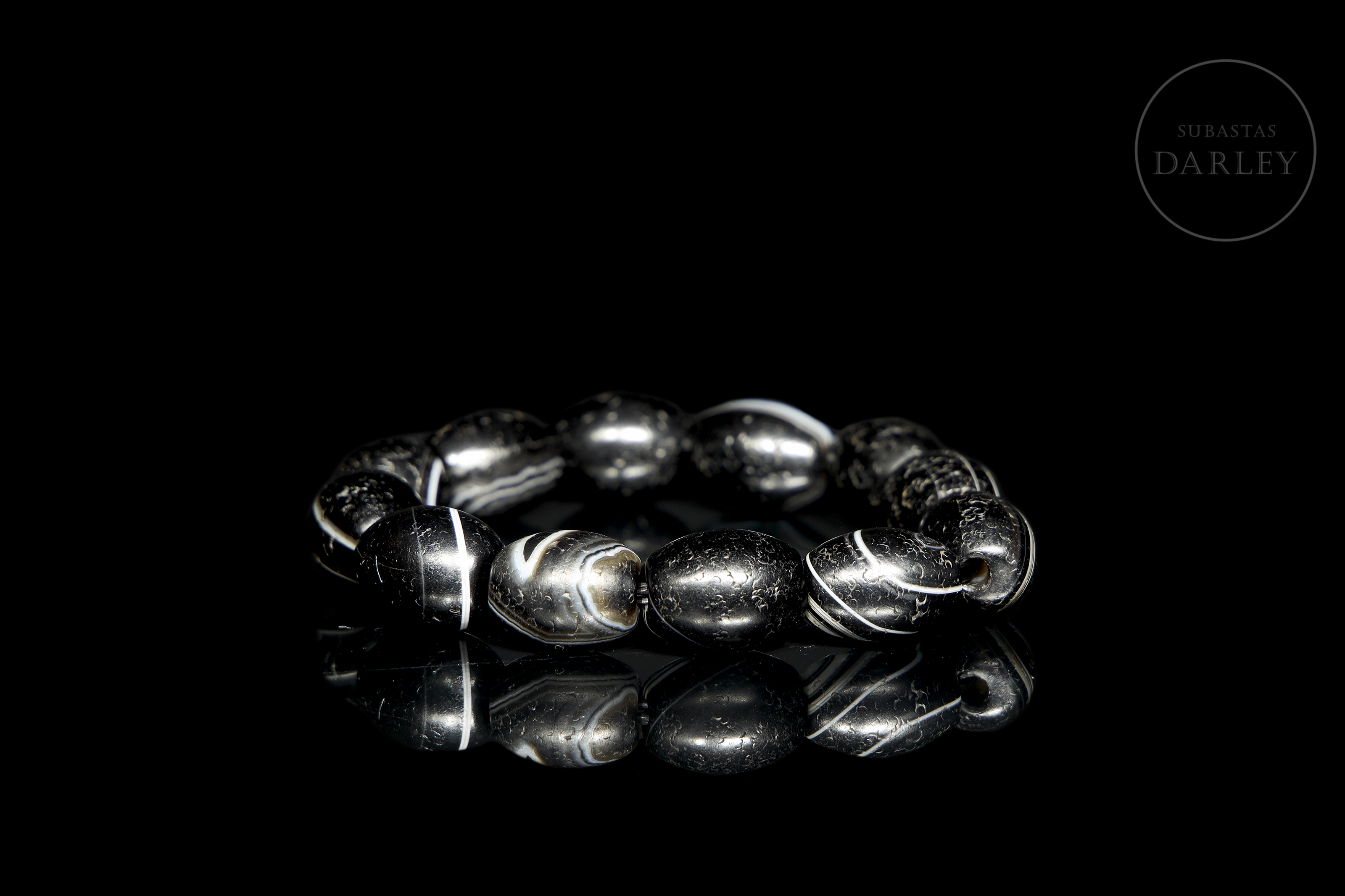 Compuesta por doce cuentas de ágata tallada de tonalidad negra con una intensa pátina por antigüedad. Cada cuenta posee una forma oval, de cantos redondeados, y una perforación central para ser ensartada. Las cuentas se muestran con un diseño de bandas en blanco lechoso que recorren la superficie. Dinastía Liao (916–1125).
