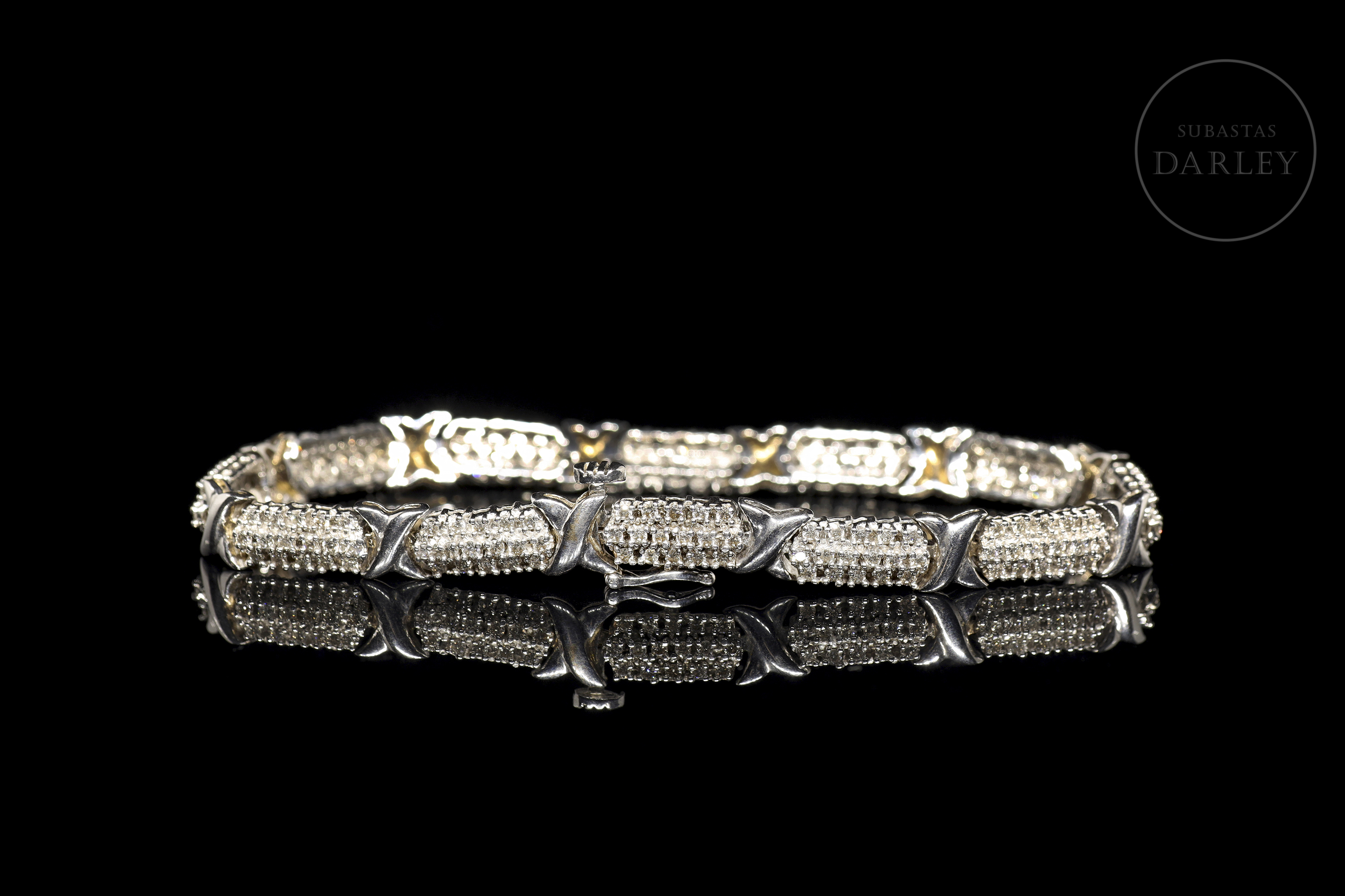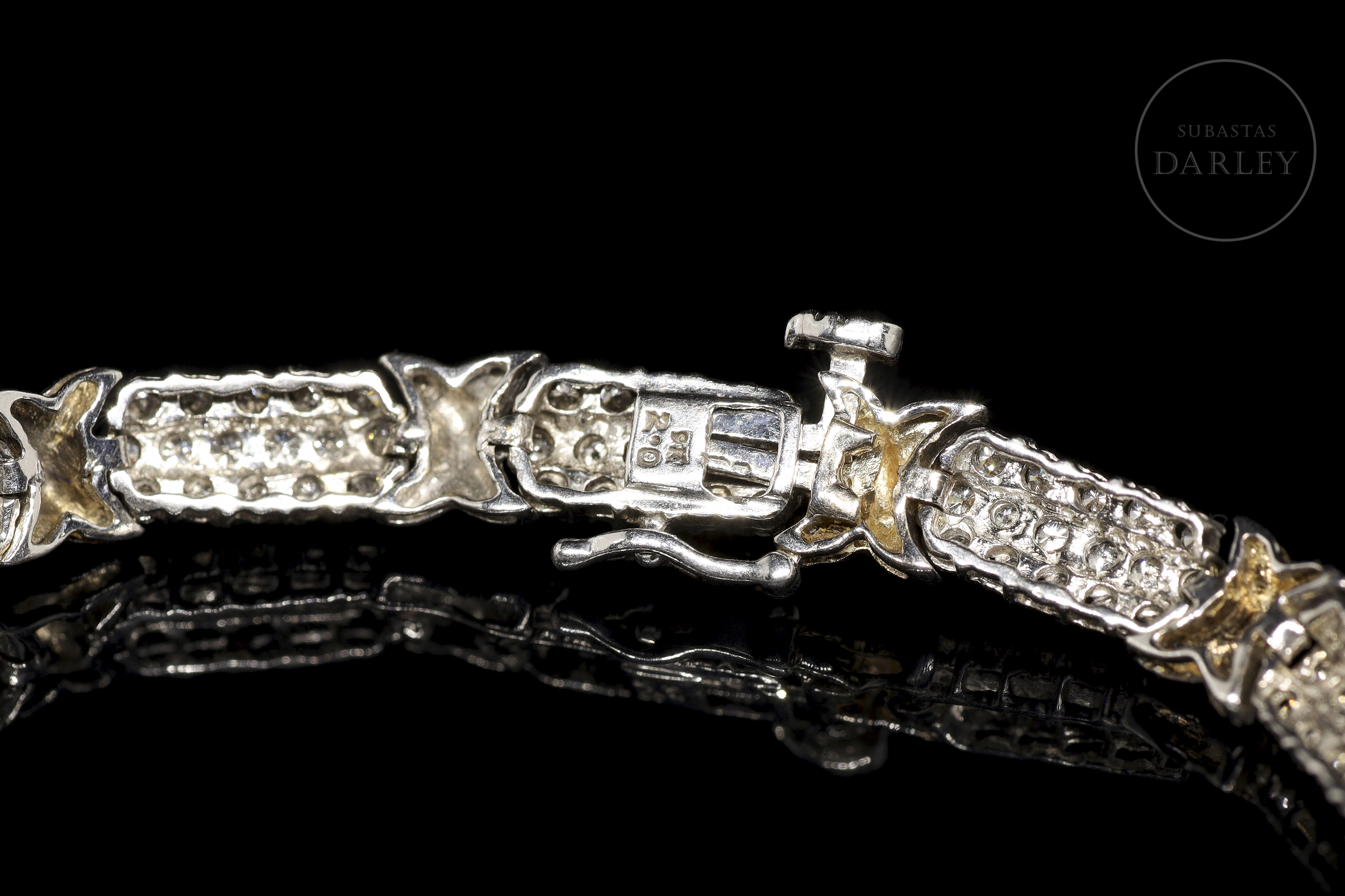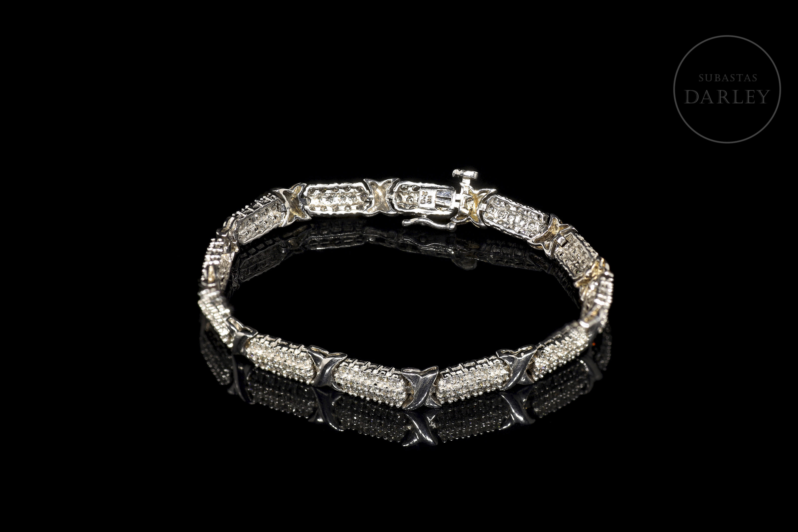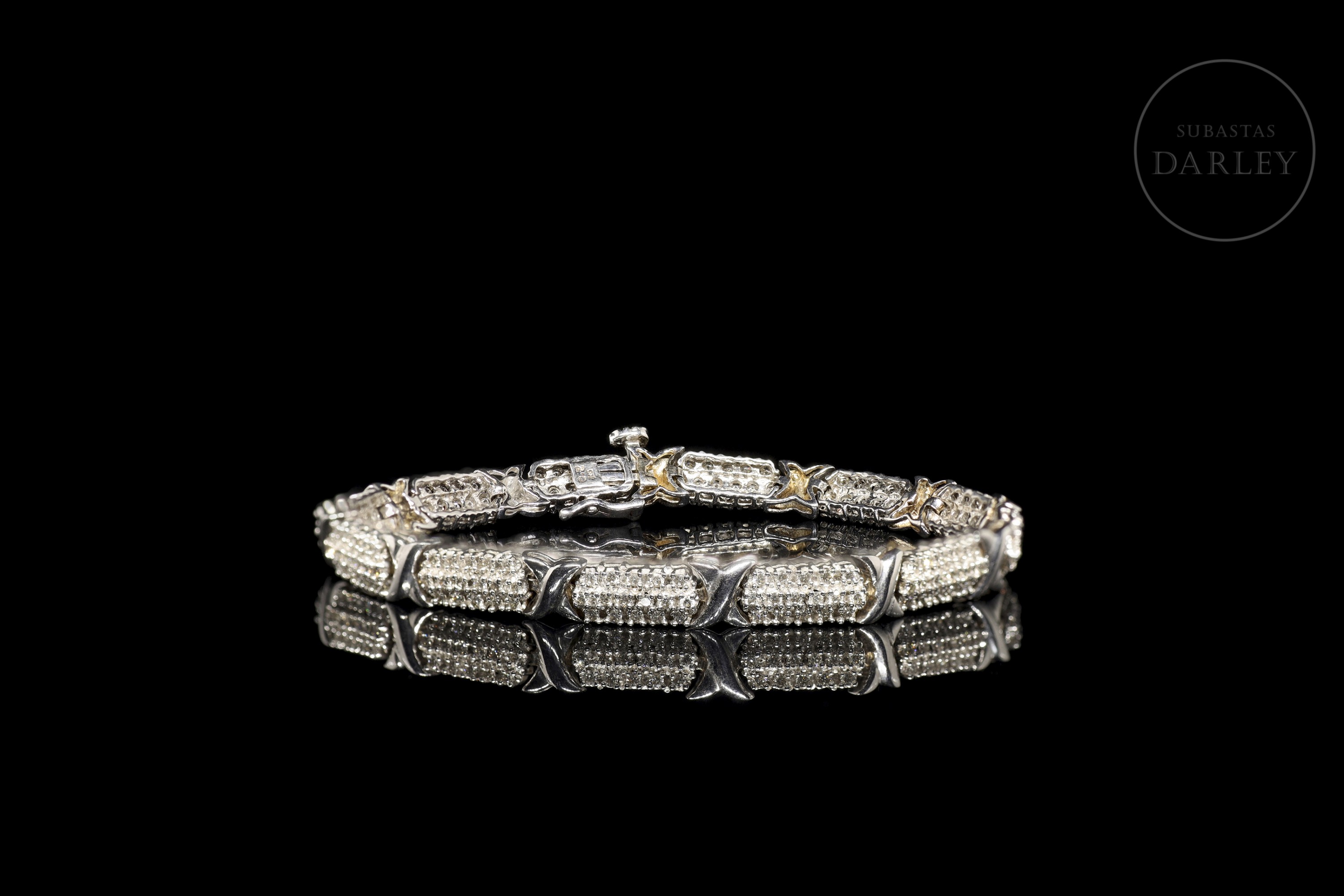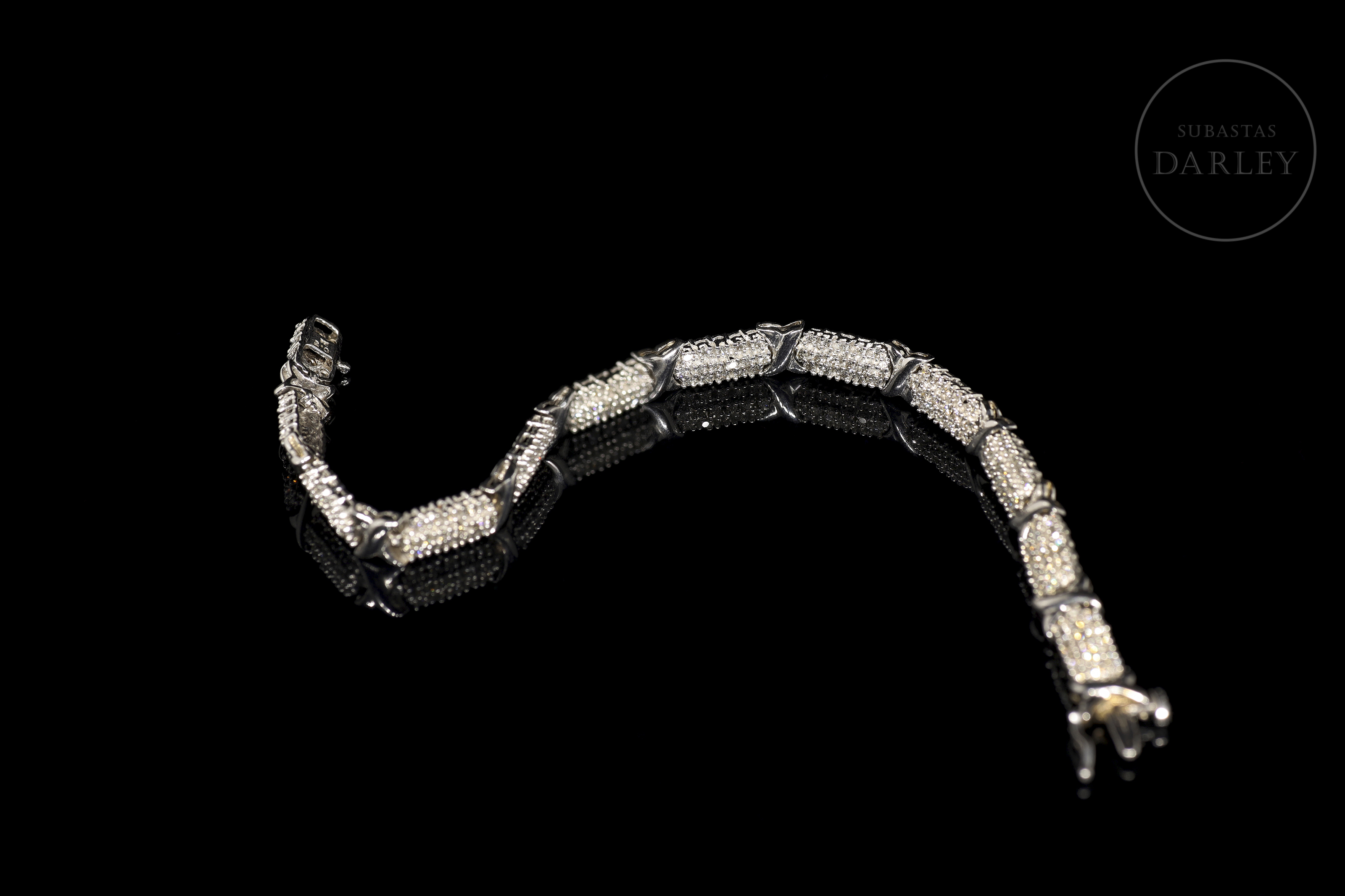 Pulsera realizada en oro blanco de 9 kt, compuesta por eslabones rectangulares unidos mediante un sistema articulado flexible. Cada tramo está completamente decorado con pequeños diamantes engastados en pavé, sumando aproximadamente 2 ct en total.