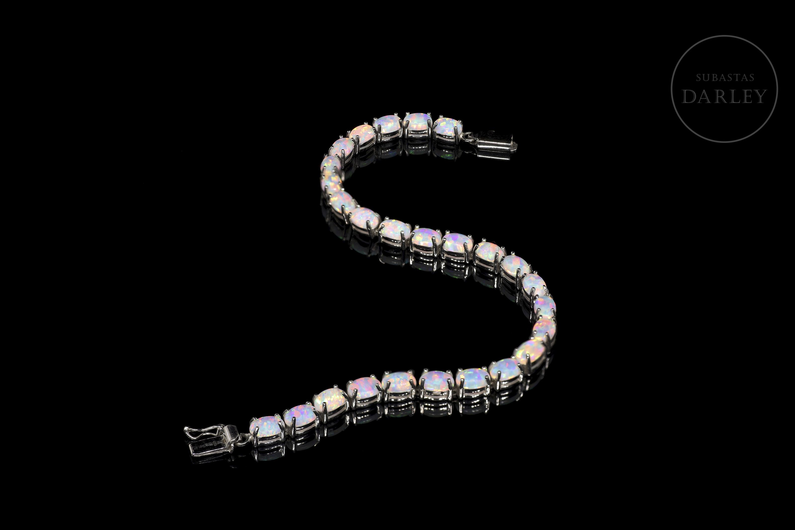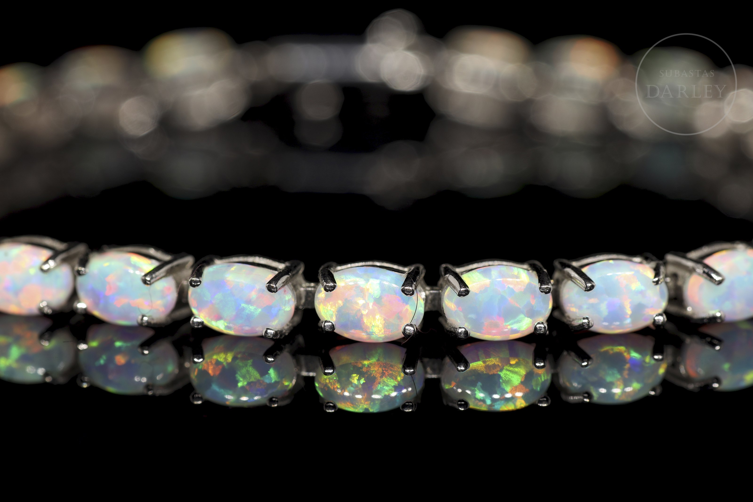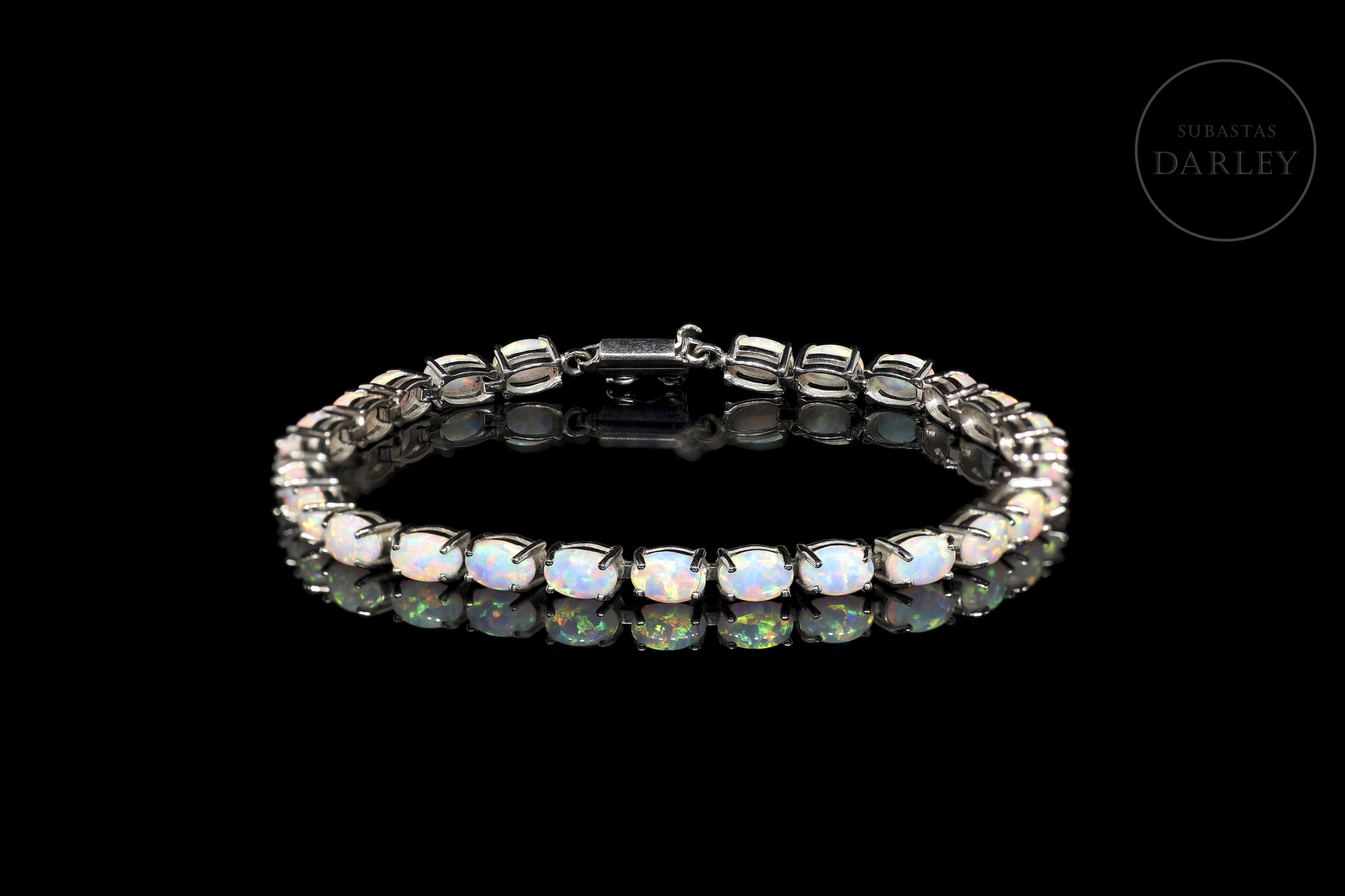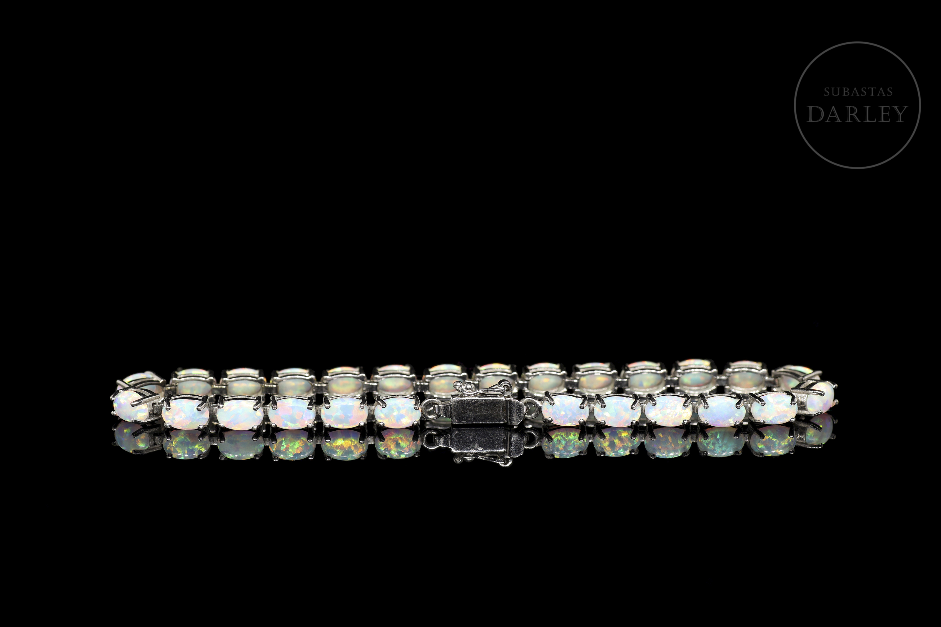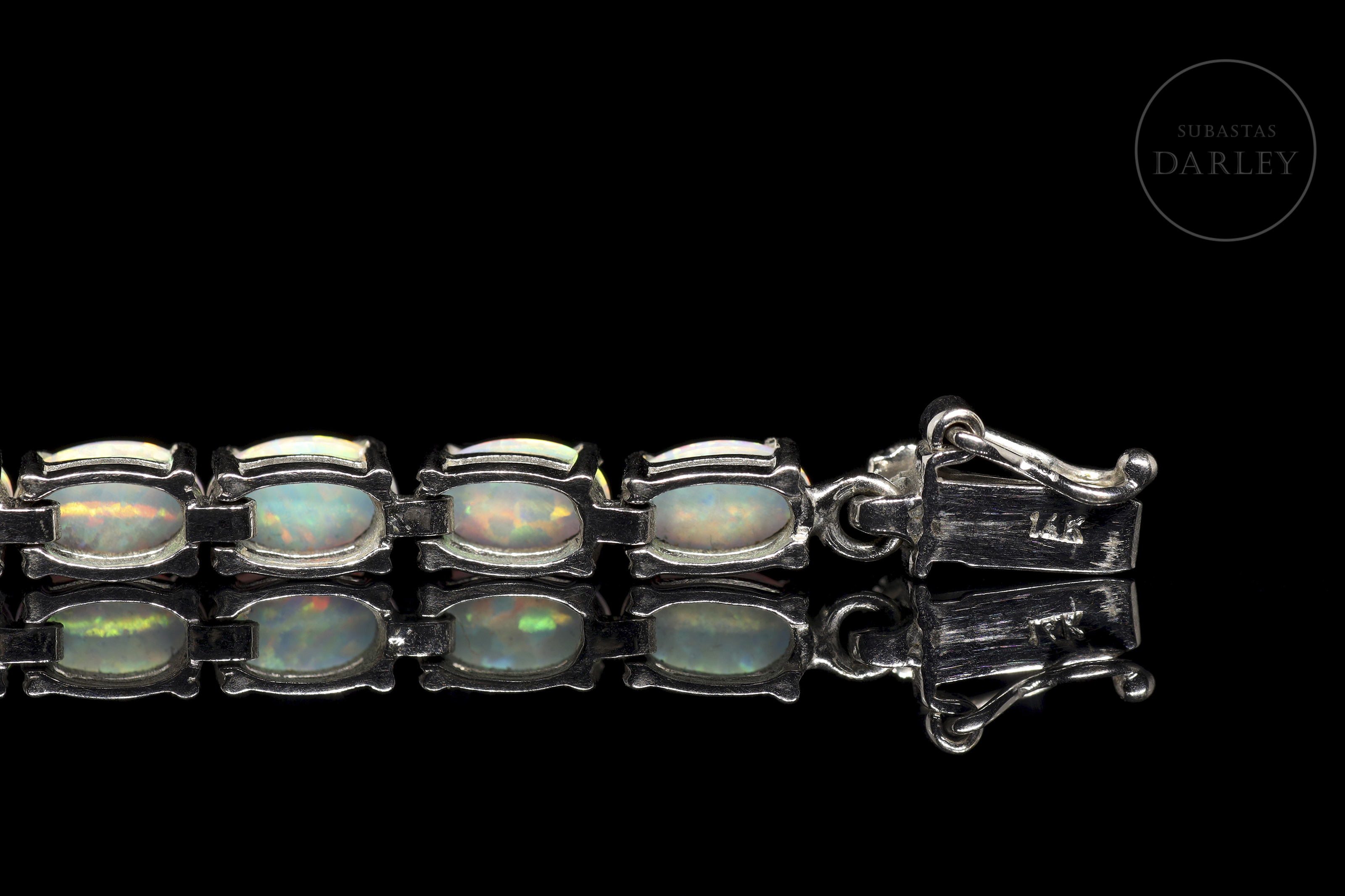 Pulsera realizada en oro blanco de 14 kt, formada por una sucesión de veintiséis ópalos tallados en cabujón ovalado, engastados en monturas de garras abiertas que permiten apreciar el juego cromático de la gema.