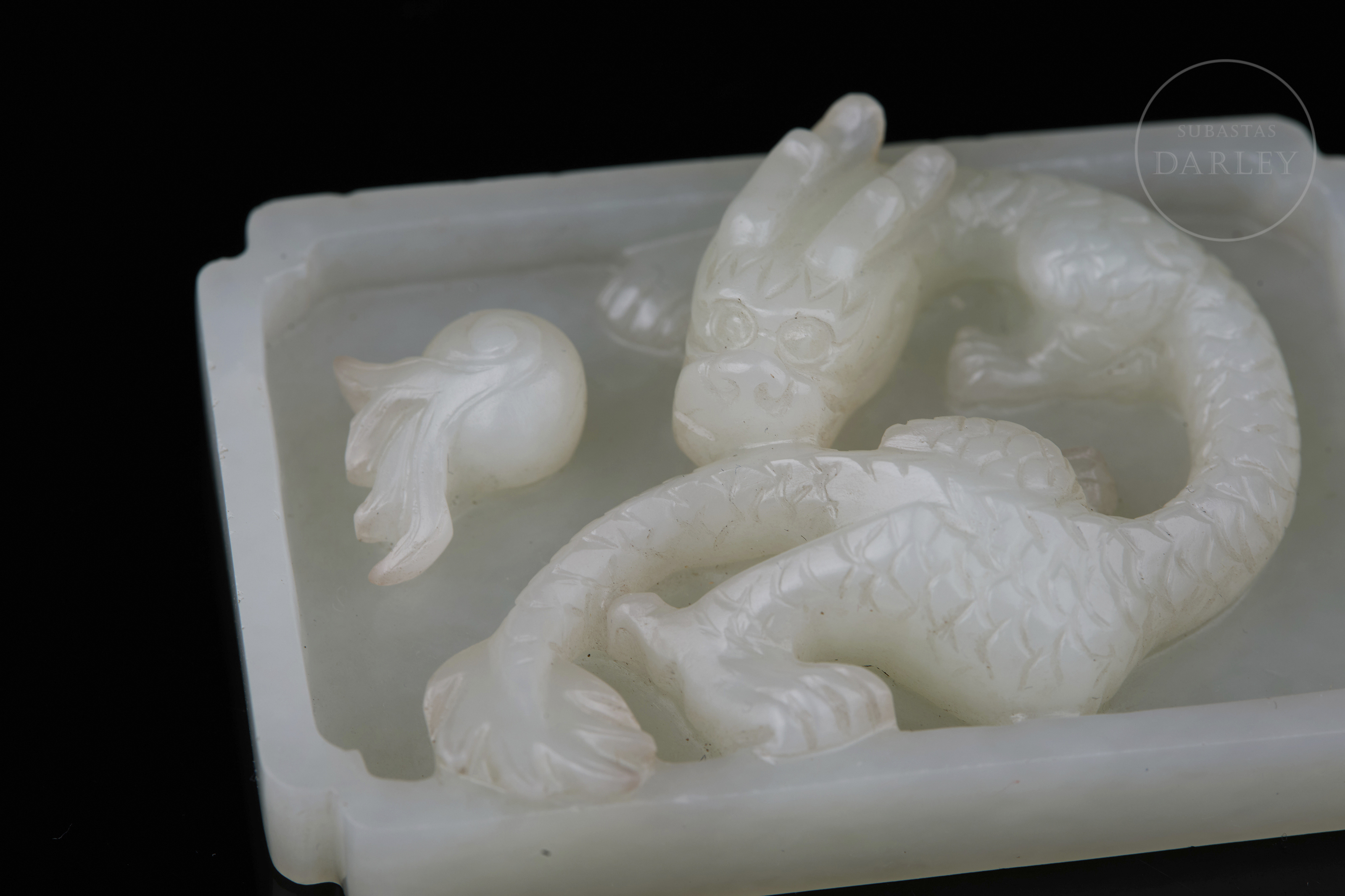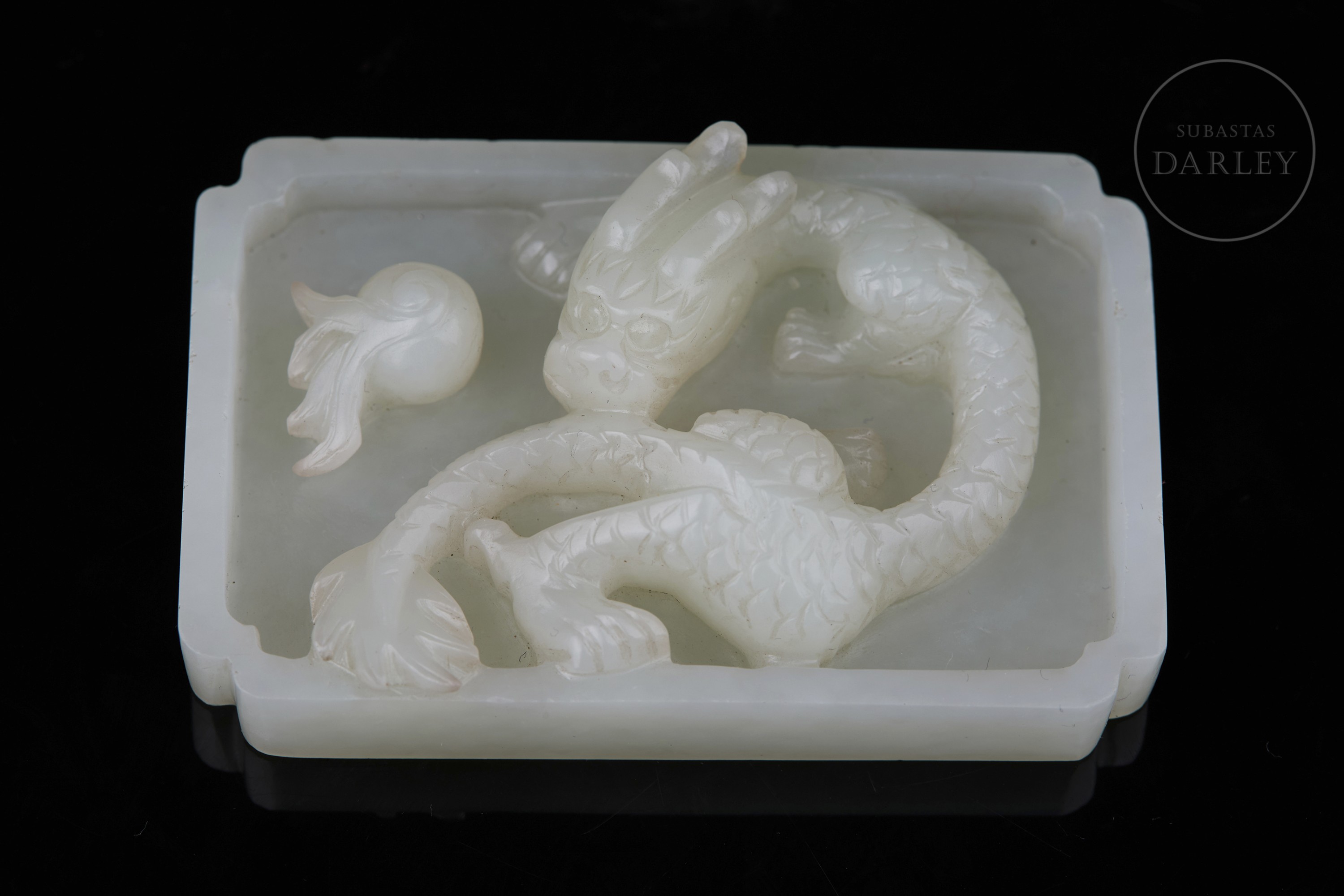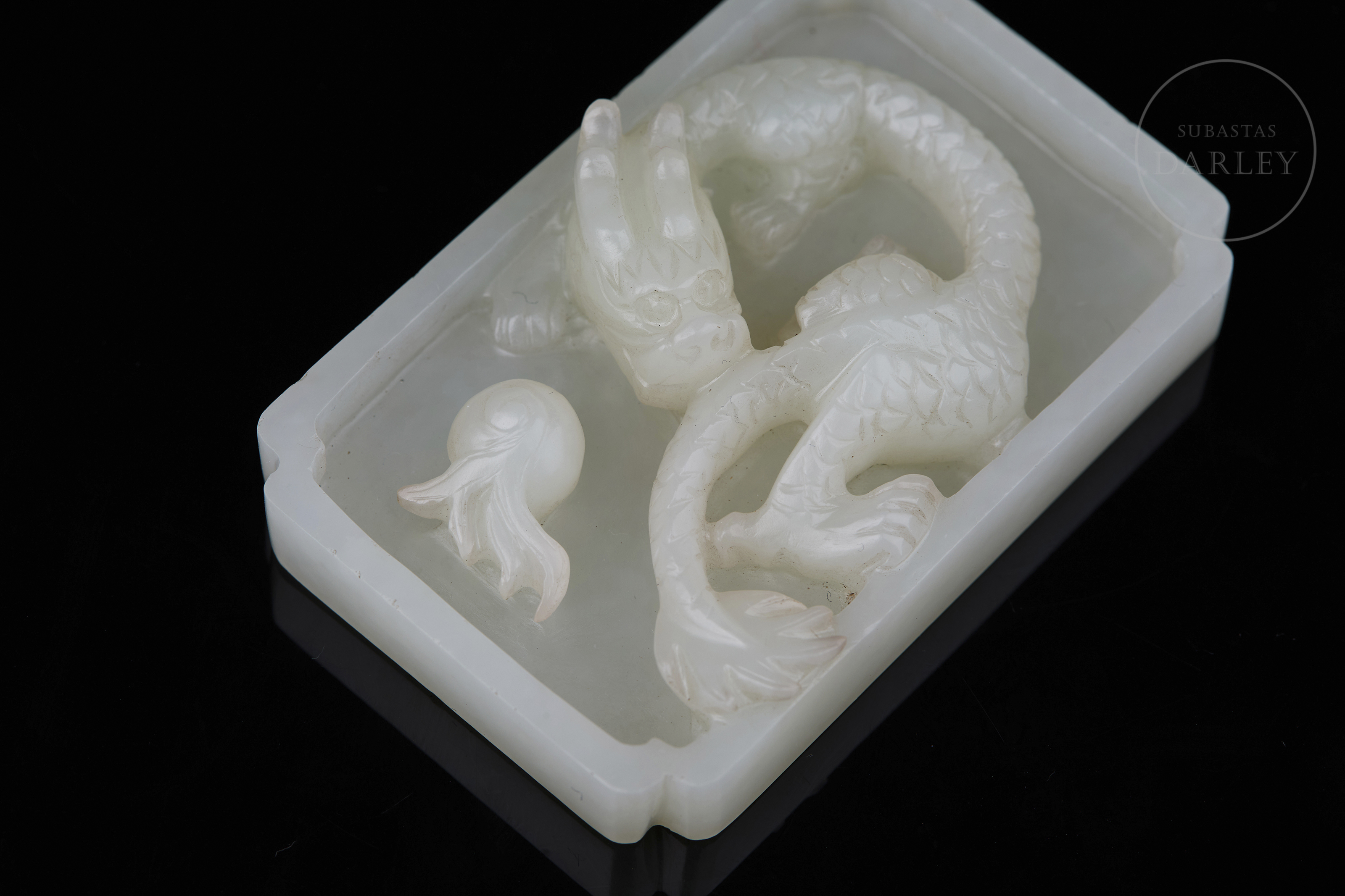 Jade tallado de suave color blanco. Posee un formato plano y rectangular de bandeja, con las esquinas escalonadas. En su interior, destaca el relieve de un dragón de cuerpo sinuoso que emerge del fondo de la pieza persiguiendo una "perla llameante". La criatura está esculpida con gran detalle, definiendo las escamas y rasgos faciales mediante precisas incisiones. Muestra pátina por envejecimiento. Dinastía Qing (1644–1912).