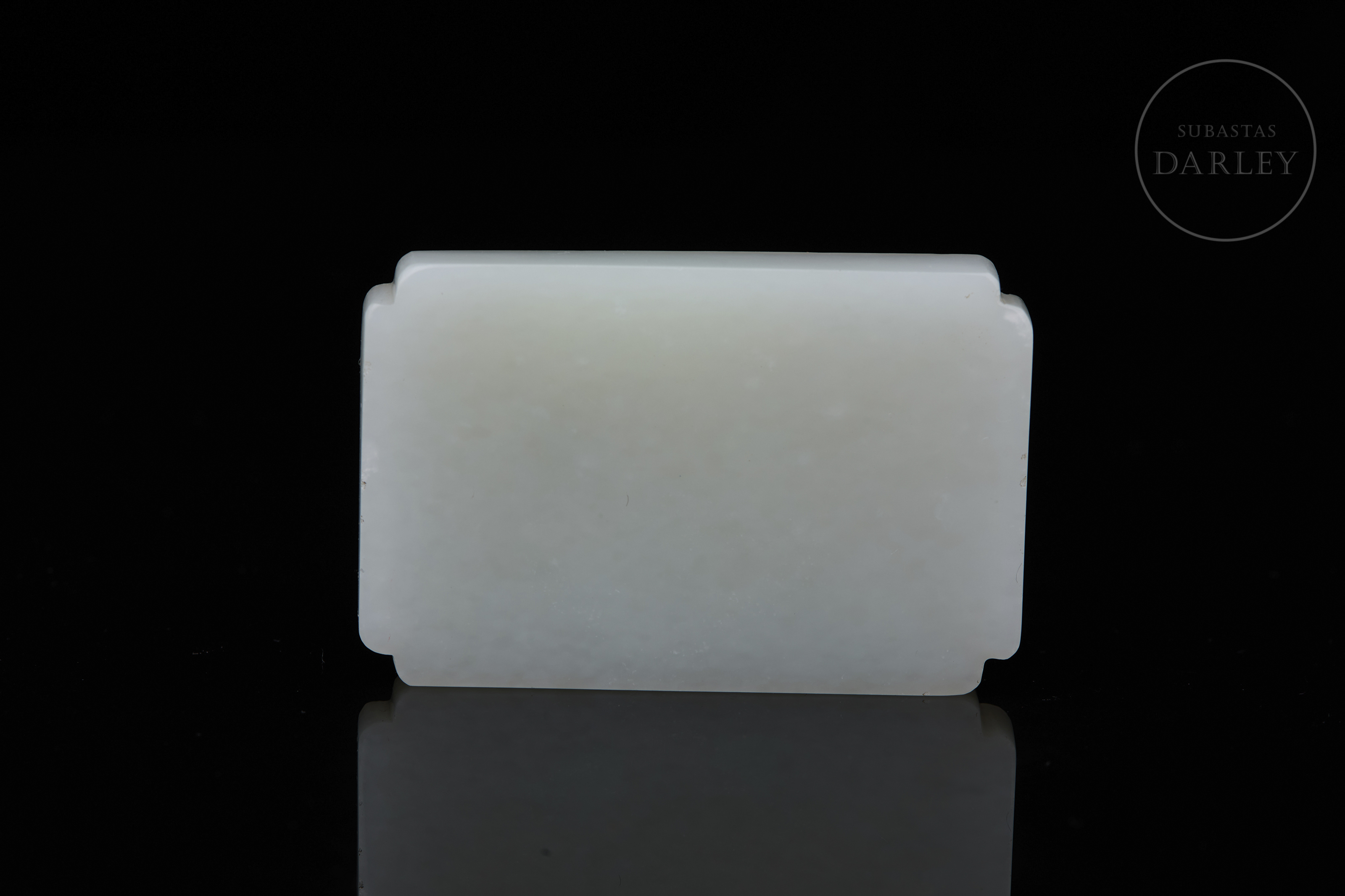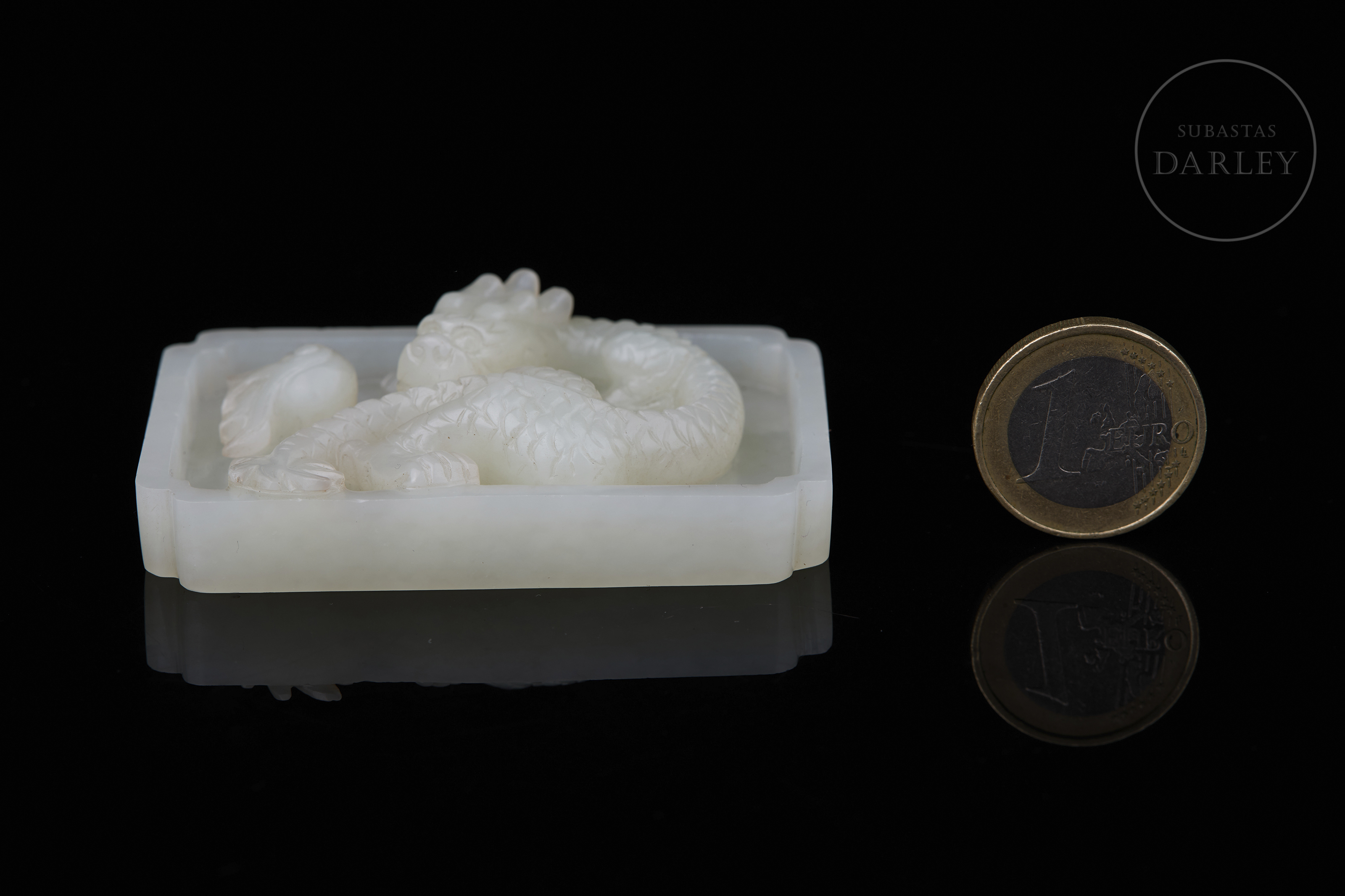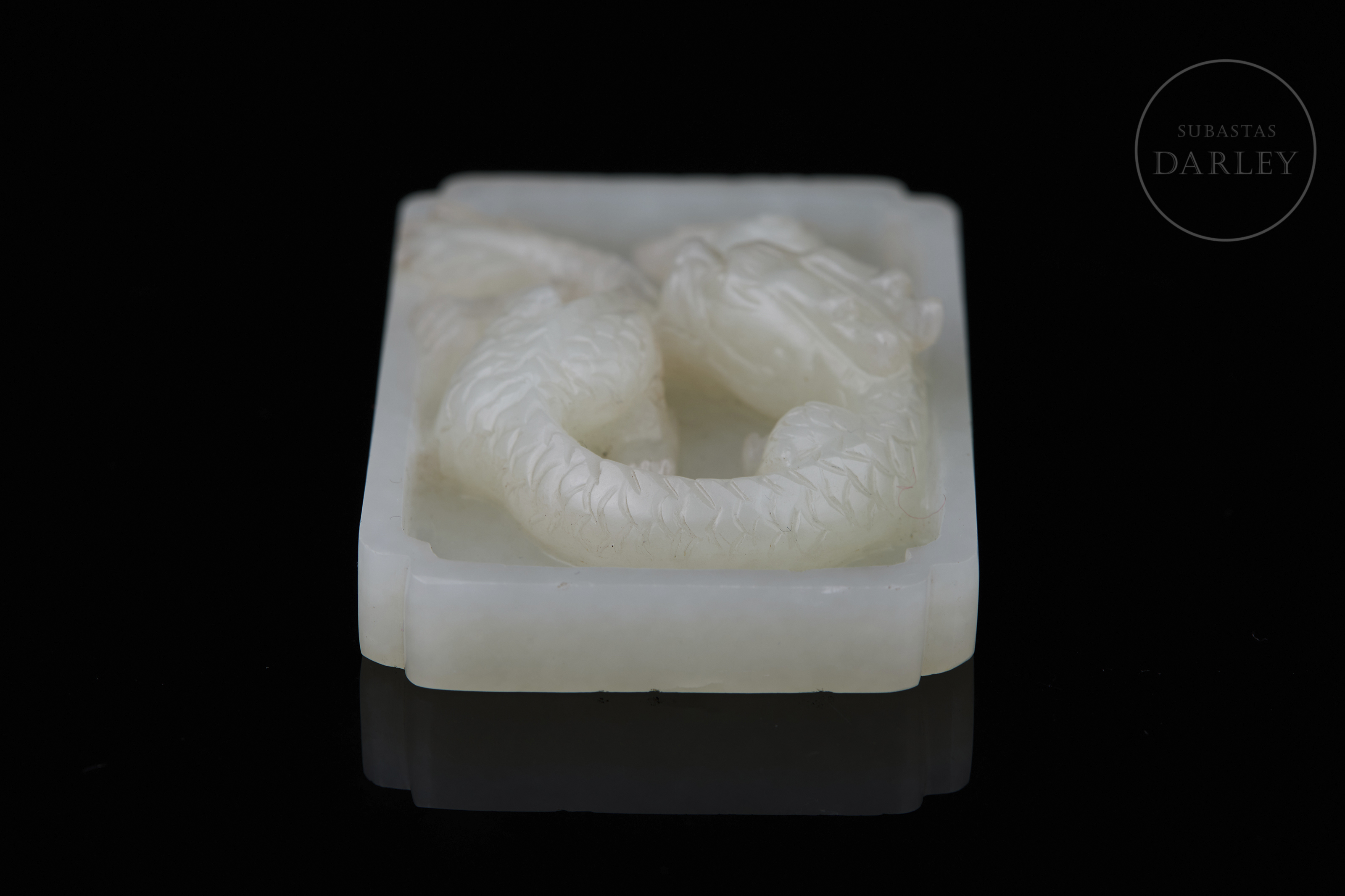 Jade tallado de suave color blanco. Posee un formato plano y rectangular de bandeja, con las esquinas escalonadas. En su interior, destaca el relieve de un dragón de cuerpo sinuoso que emerge del fondo de la pieza persiguiendo una "perla llameante". La criatura está esculpida con gran detalle, definiendo las escamas y rasgos faciales mediante precisas incisiones. Muestra pátina por envejecimiento. Dinastía Qing (1644–1912).