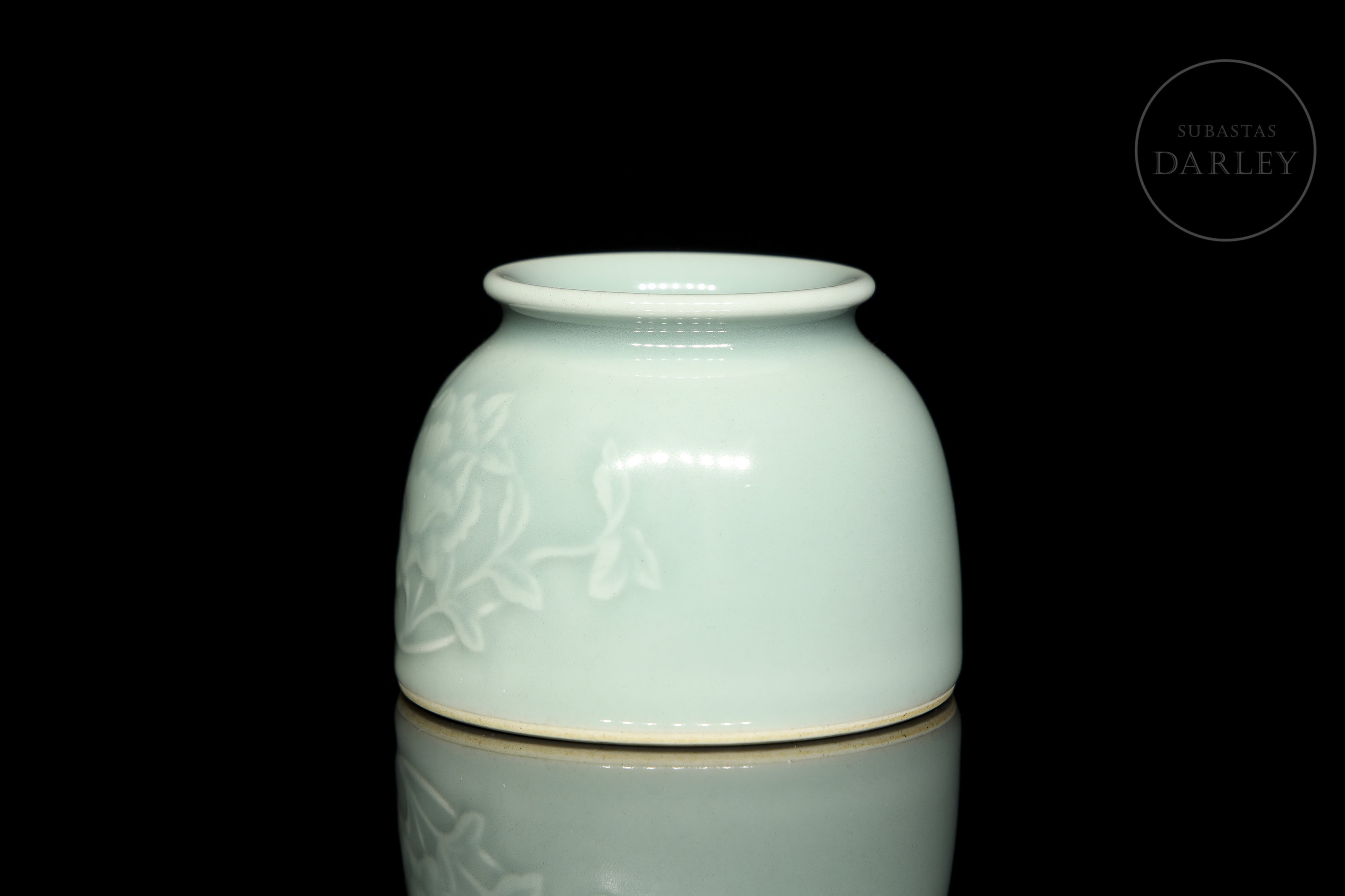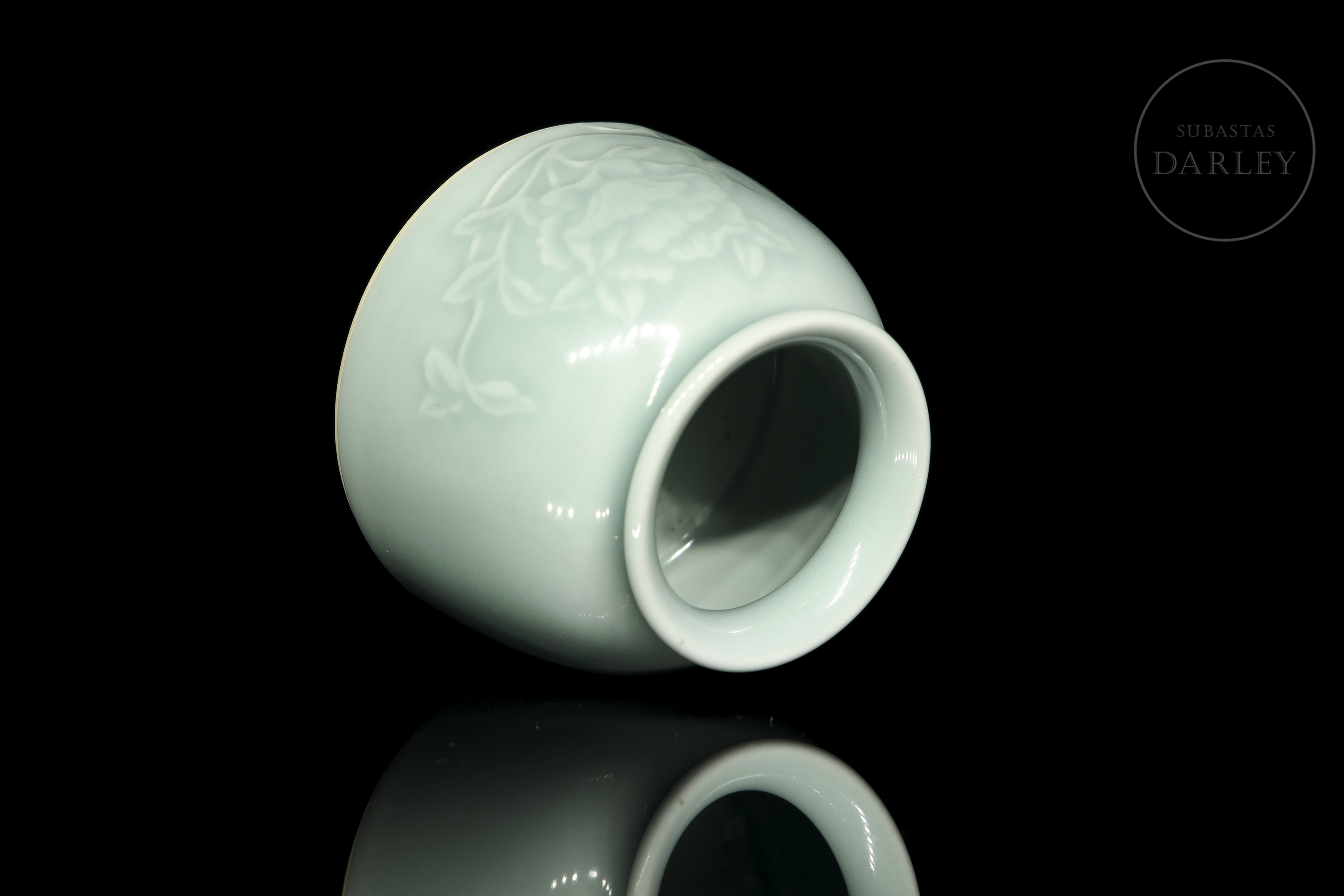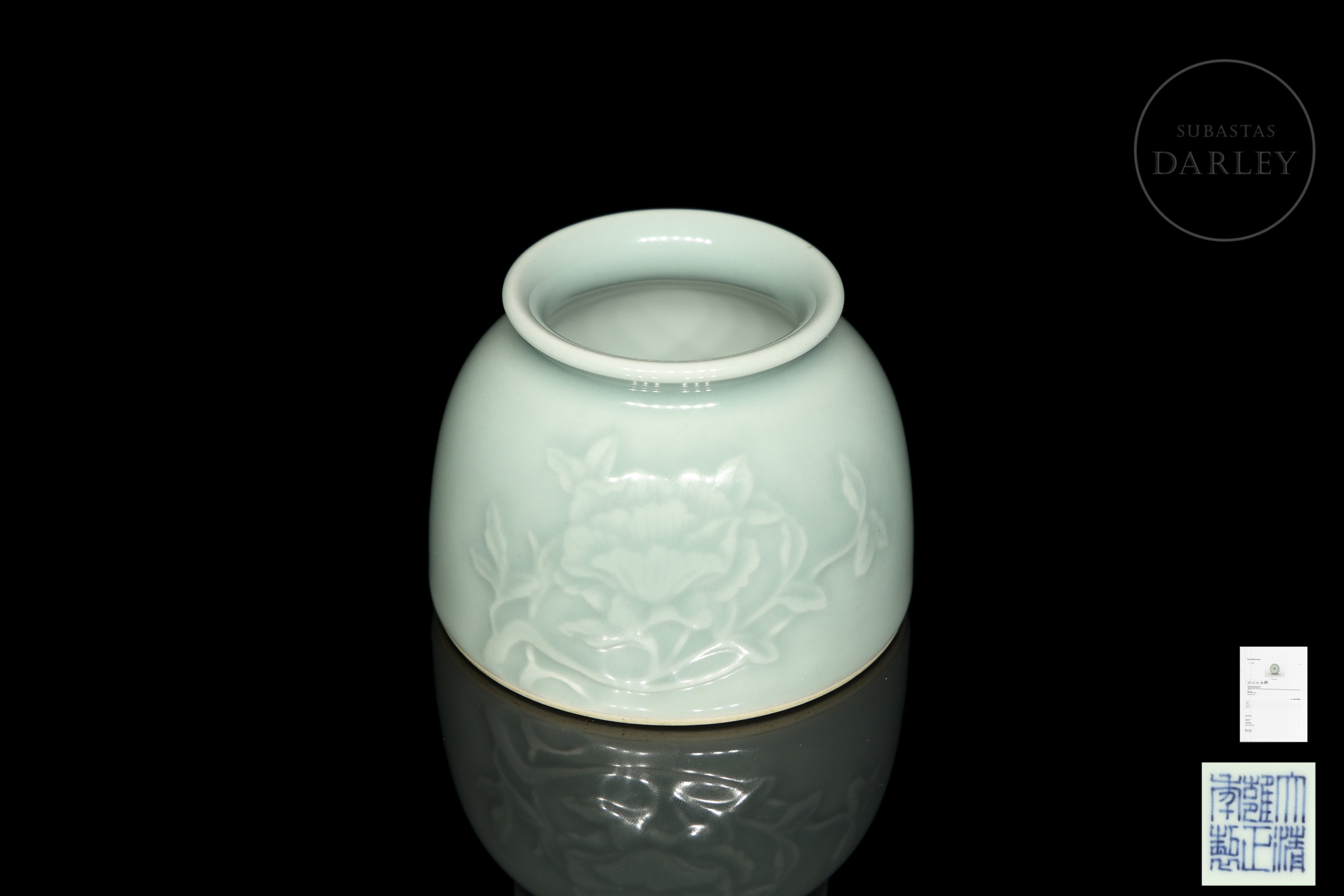 Recipiente de porcelana celadón "Peonía", dinastía Qing, con sello Yongzheng