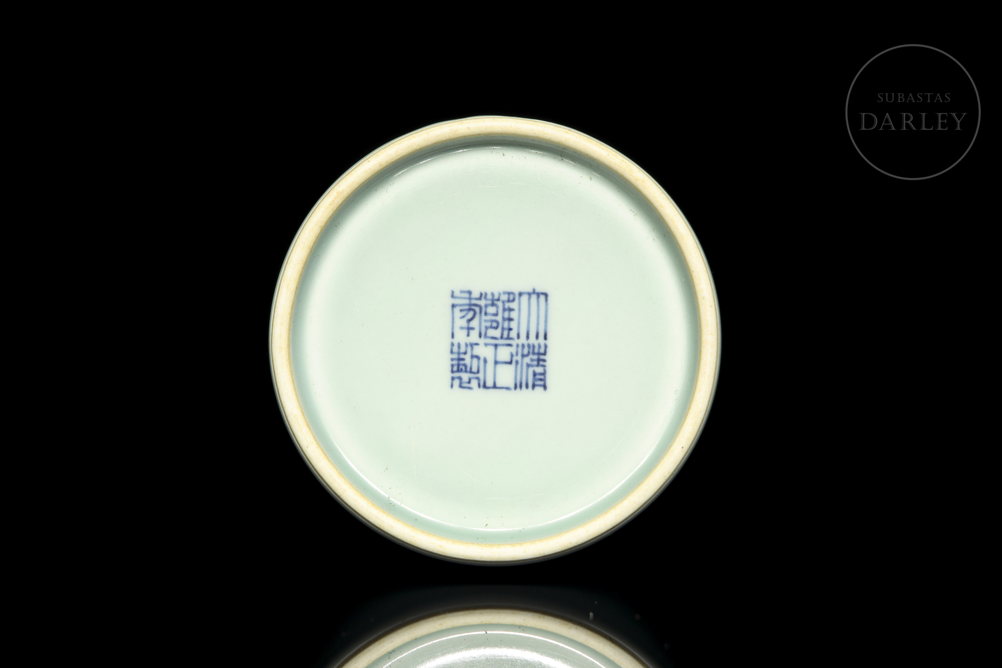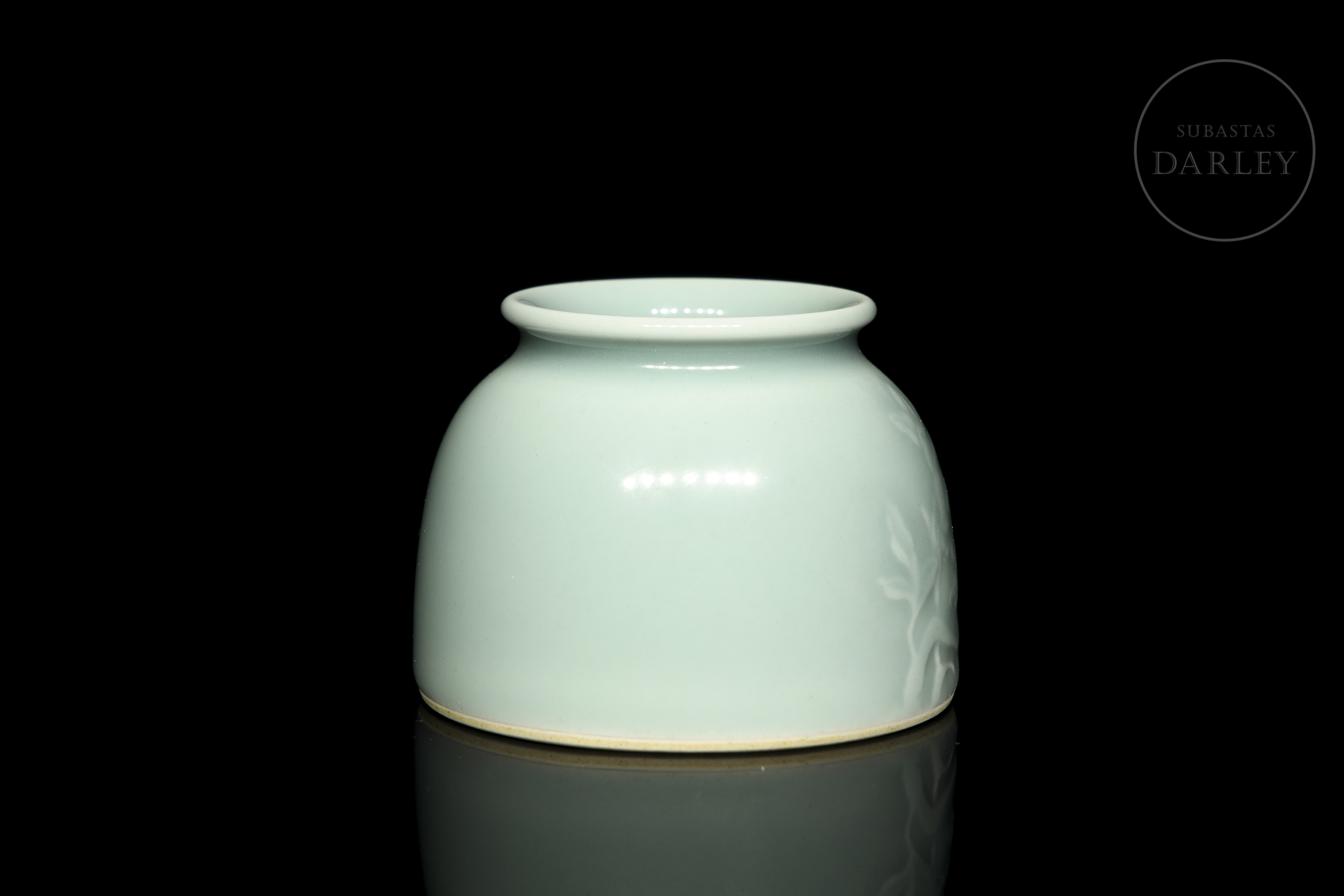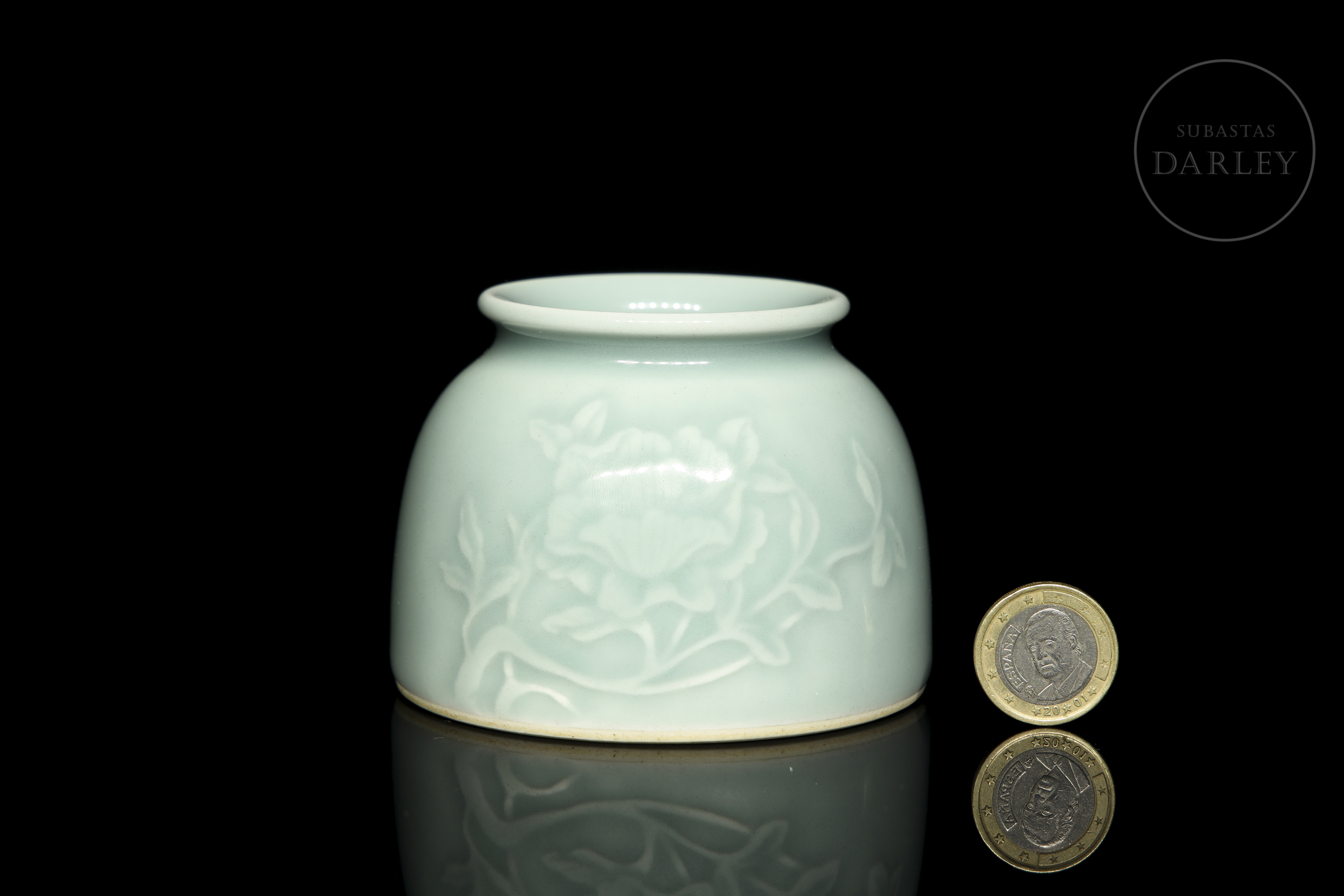 Recipiente de porcelana celadón "Peonía", dinastía Qing, con sello Yongzheng