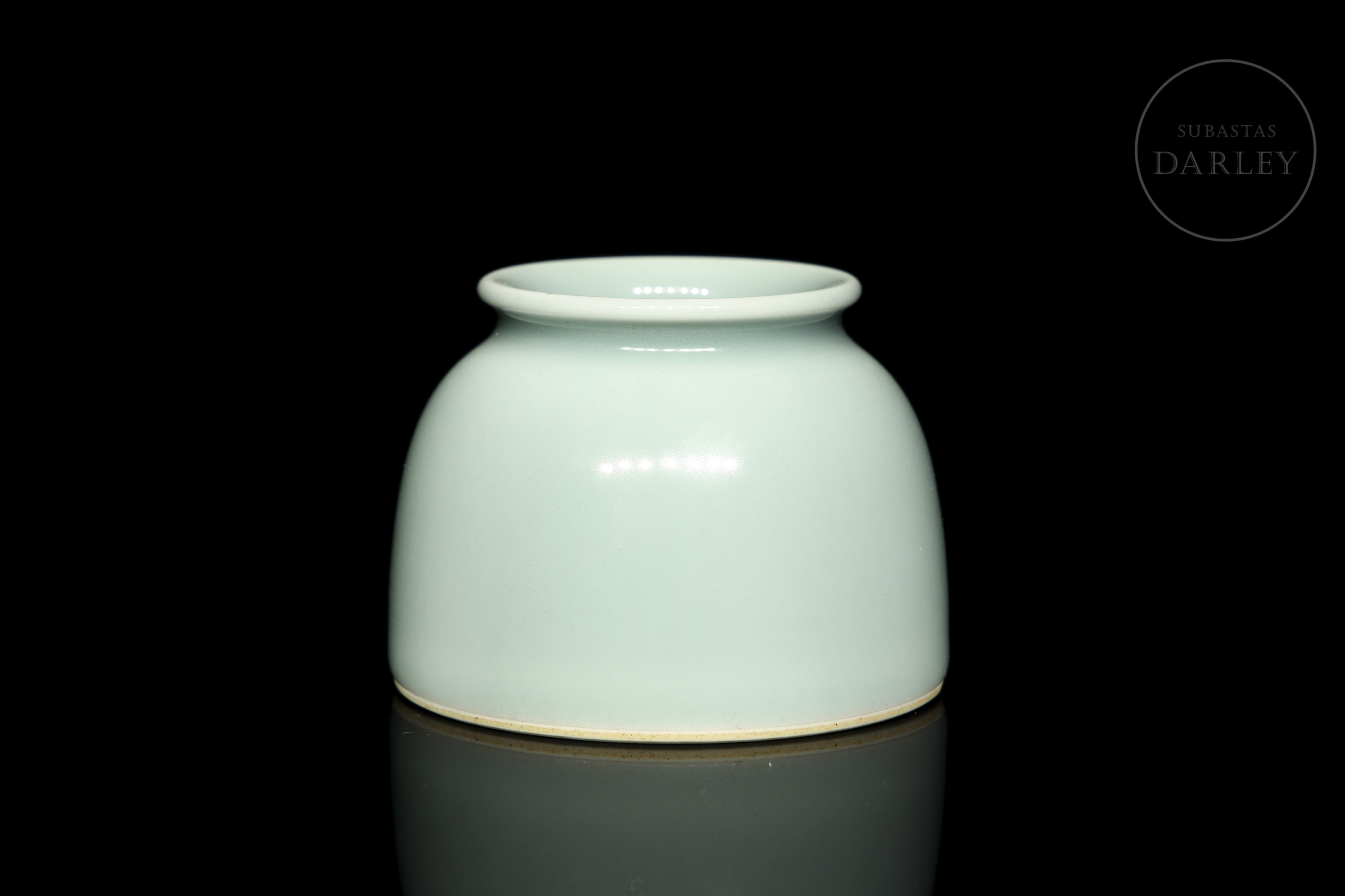 Refinado aguamanil para erudito de porcelana, con una elegante forma de campana, con paredes curvadas y estrecha boca vuelta. La pieza está cubierta por un delicado esmalte monocromo de color verde celadón pálido. El exterior está decorado en una de sus caras con un motivo de flor de peonía en bajorrelieve con tallos de hojas naturales. La base de la pieza presenta un sello de seis caracteres “大清雍正年制” en azul bajo vidriado.