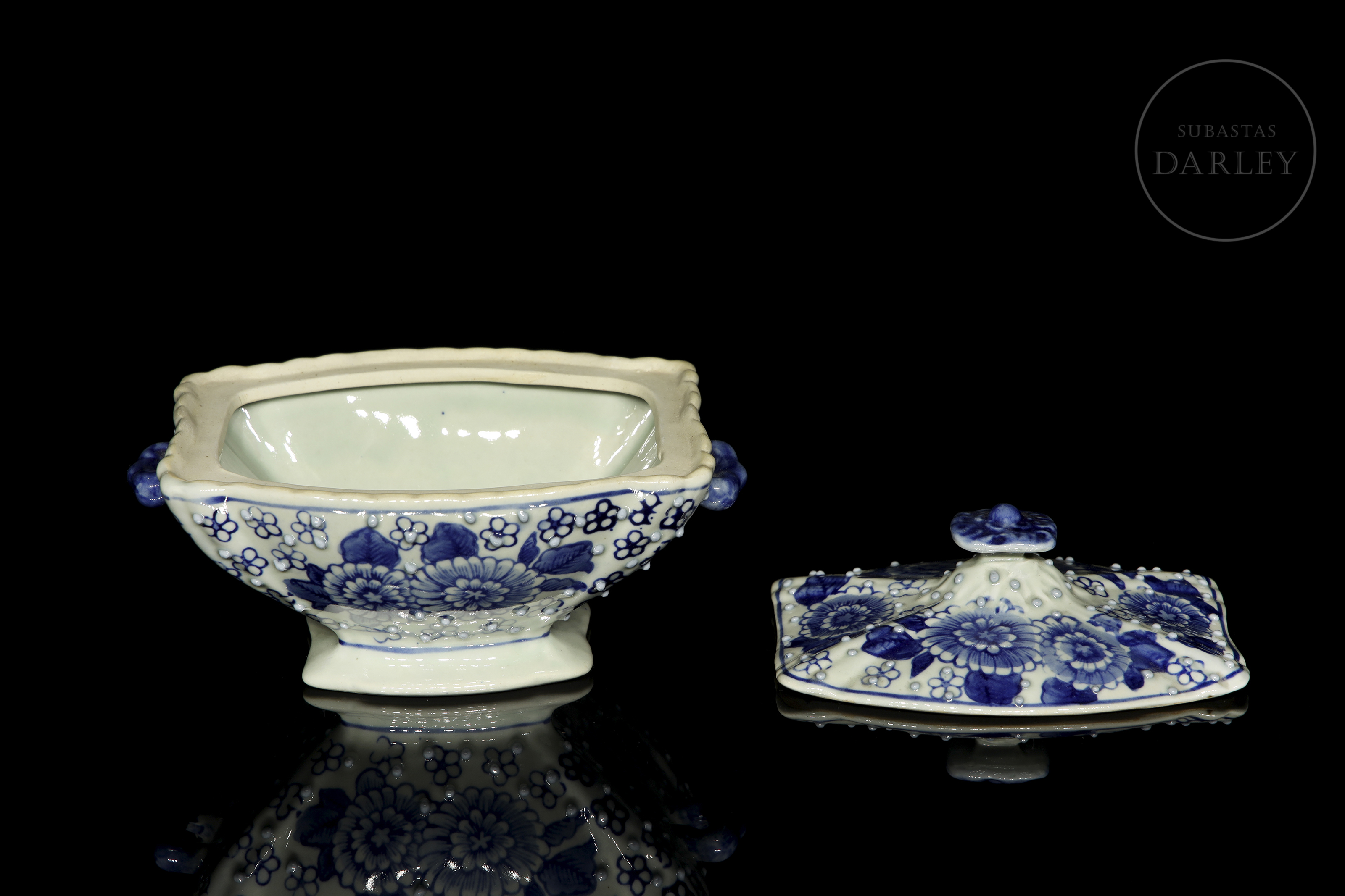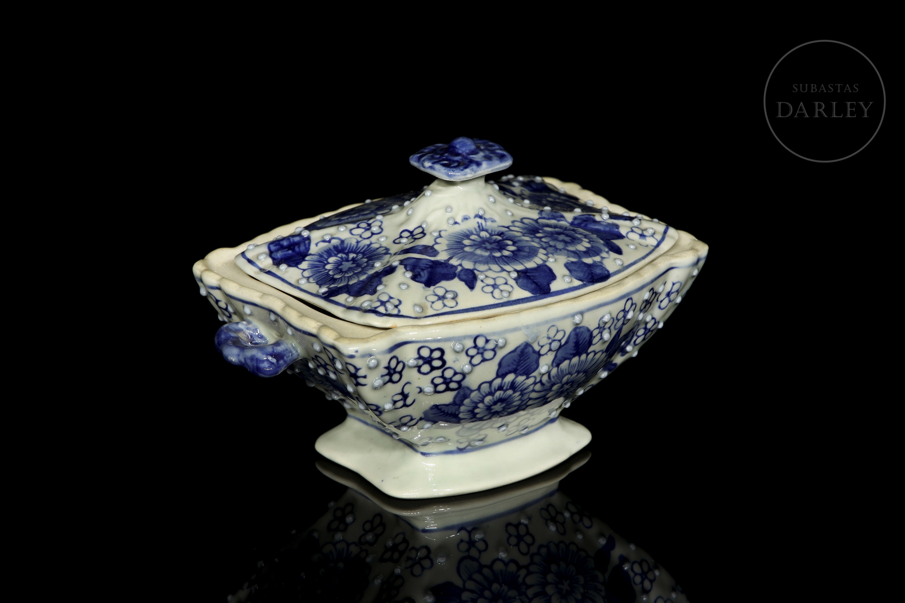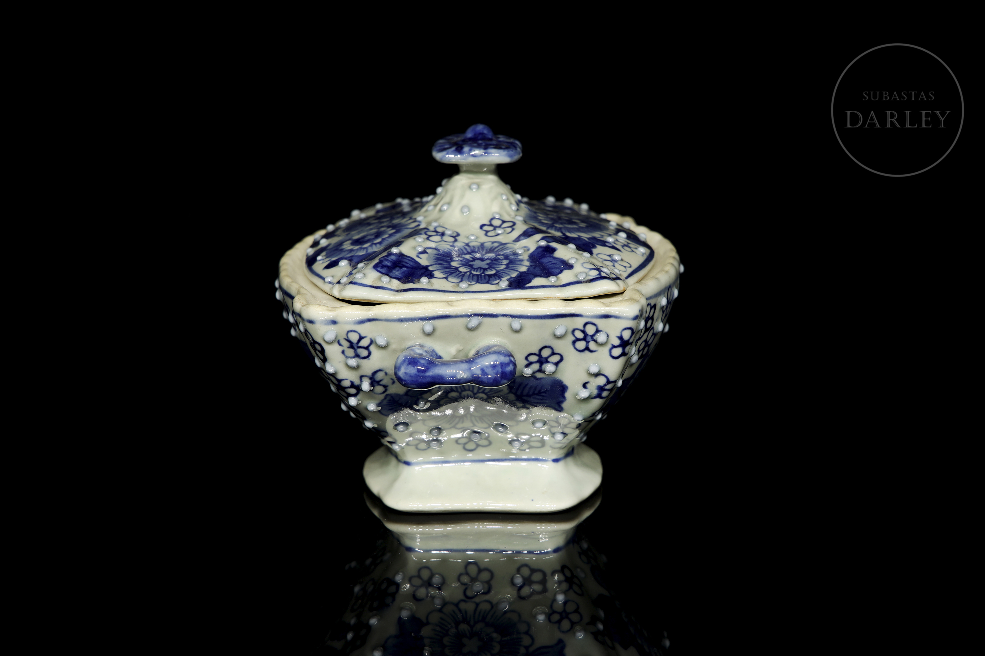 Recipiente con tapa de porcelana esmaltada. Posee un cuerpo rectangular lobulado, y un pie acampanado, con asas aplicadas a la altura de los hombros y una tapa rematada con un pomo floral. Está decorado con un motivo de crisantemos y pequeñas flores, sobre un fondo picado de perlas en relieve.