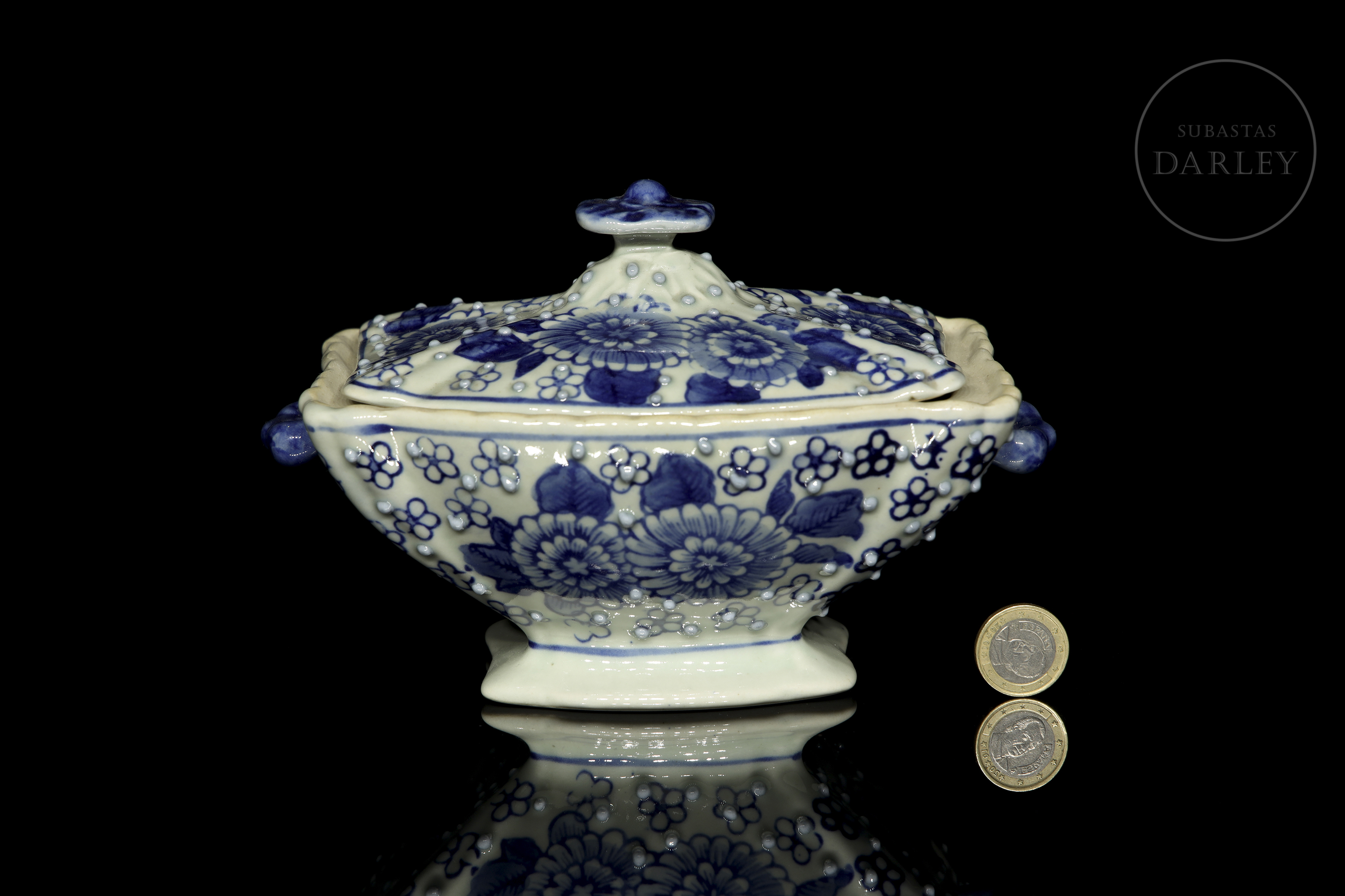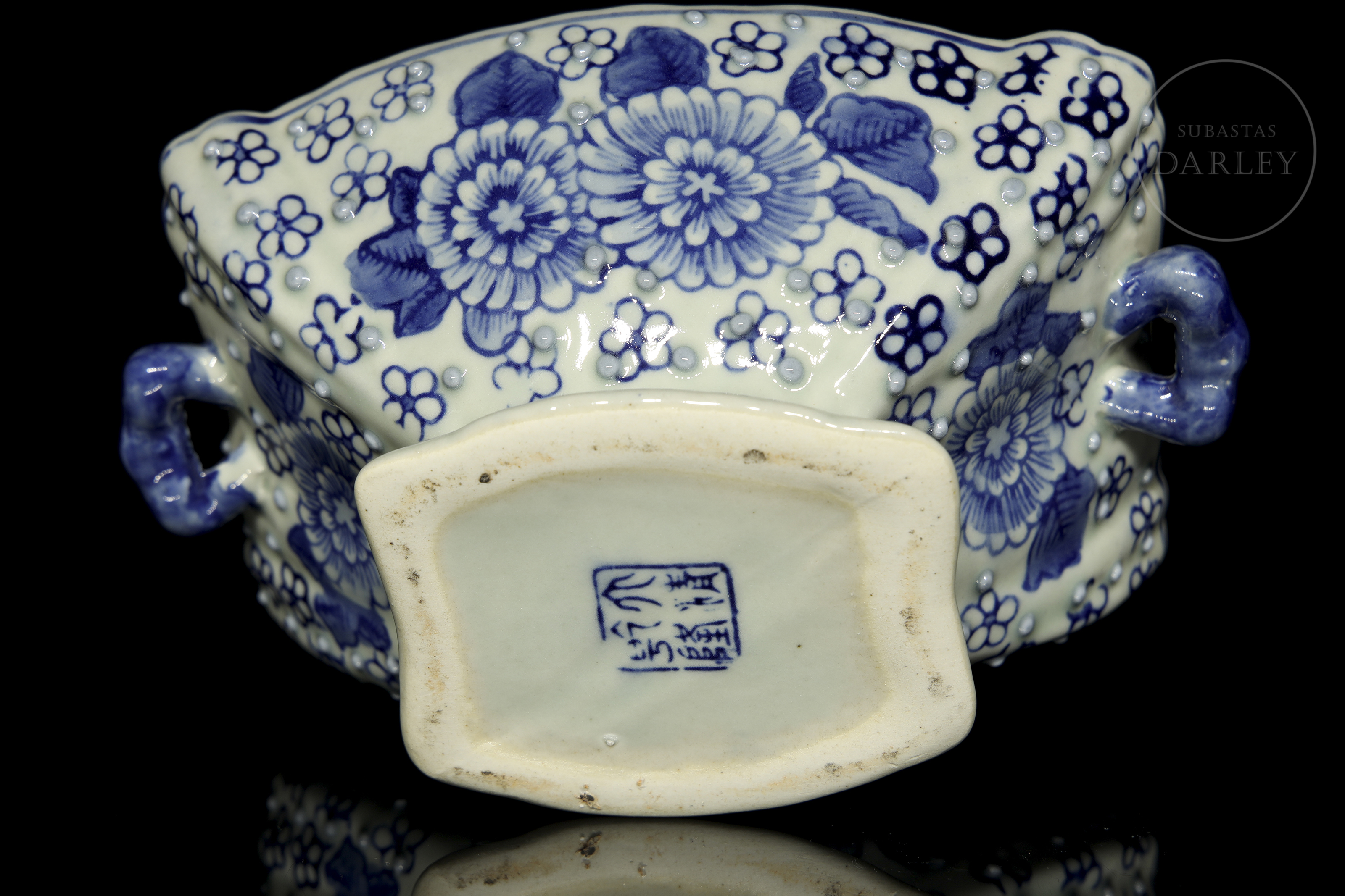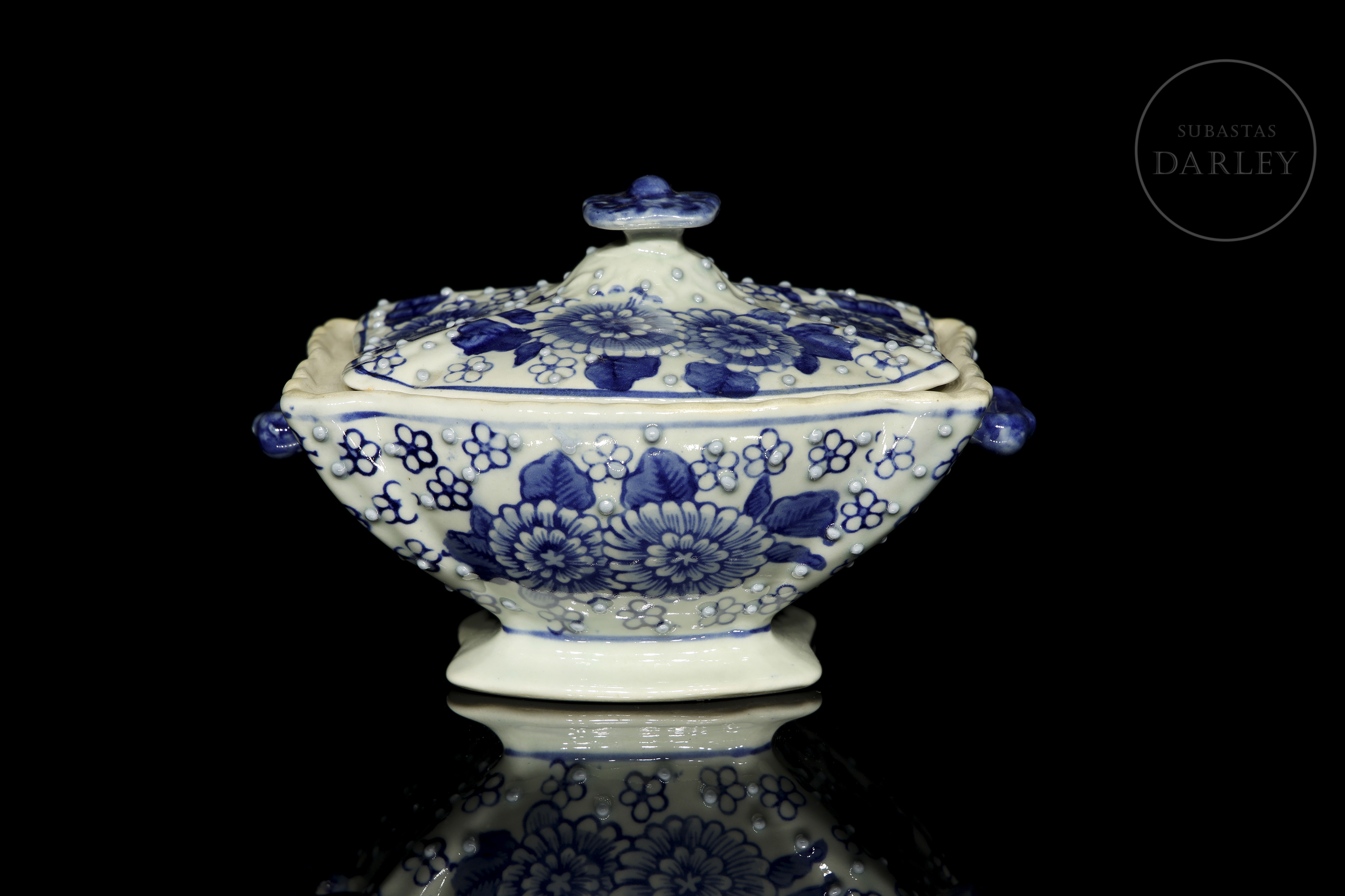 Recipiente con tapa de porcelana esmaltada. Posee un cuerpo rectangular lobulado, y un pie acampanado, con asas aplicadas a la altura de los hombros y una tapa rematada con un pomo floral. Está decorado con un motivo de crisantemos y pequeñas flores, sobre un fondo picado de perlas en relieve.
