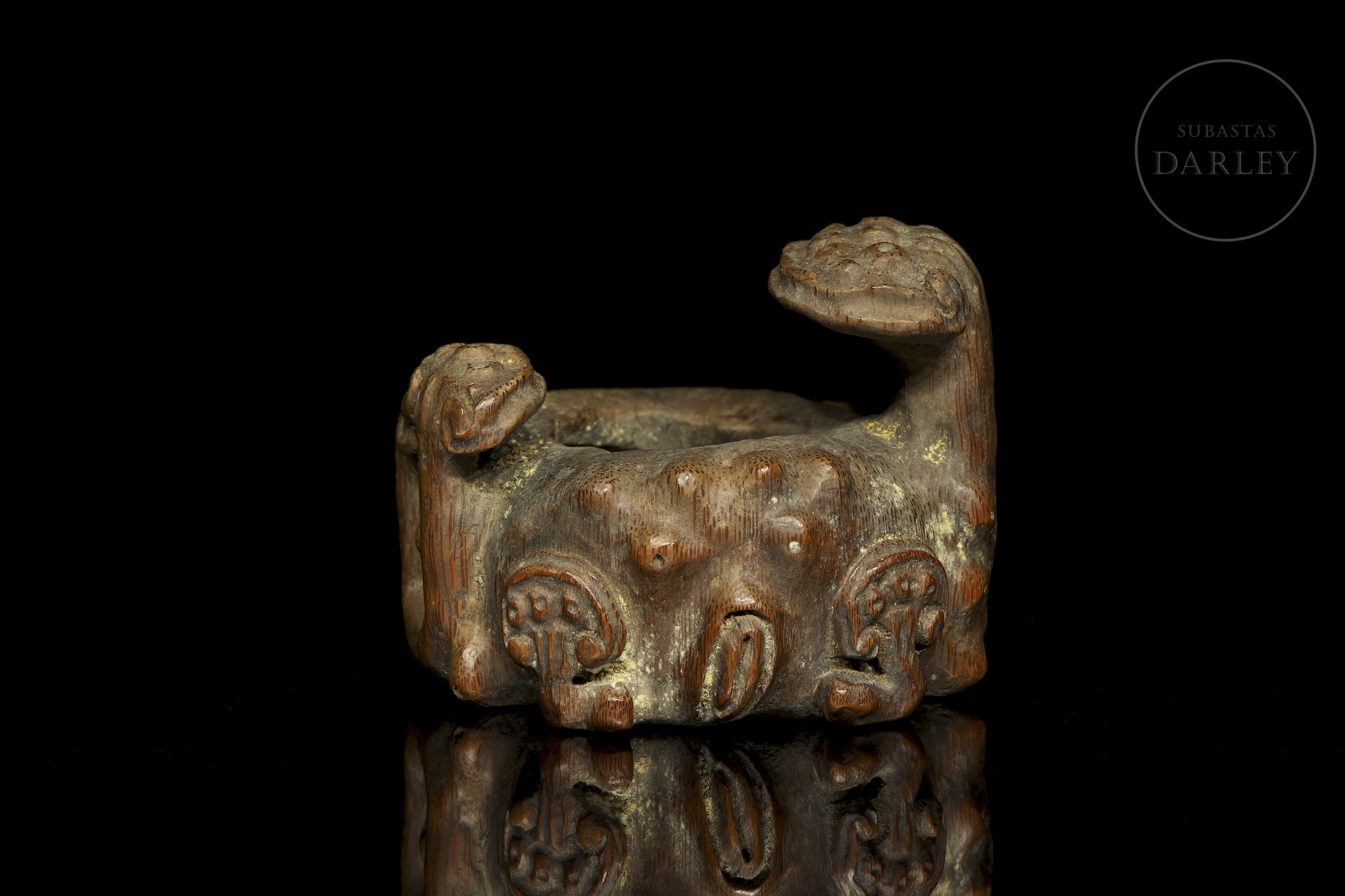 Recipiente para agua tallado en madera, trabajado imitando las texturas de la raíz y decorado con hongos lingzhi en relieve. La superficie presenta pátina natural y variaciones tonales propias de la madera. Dinastía Qing (1644-1912) o posterior.