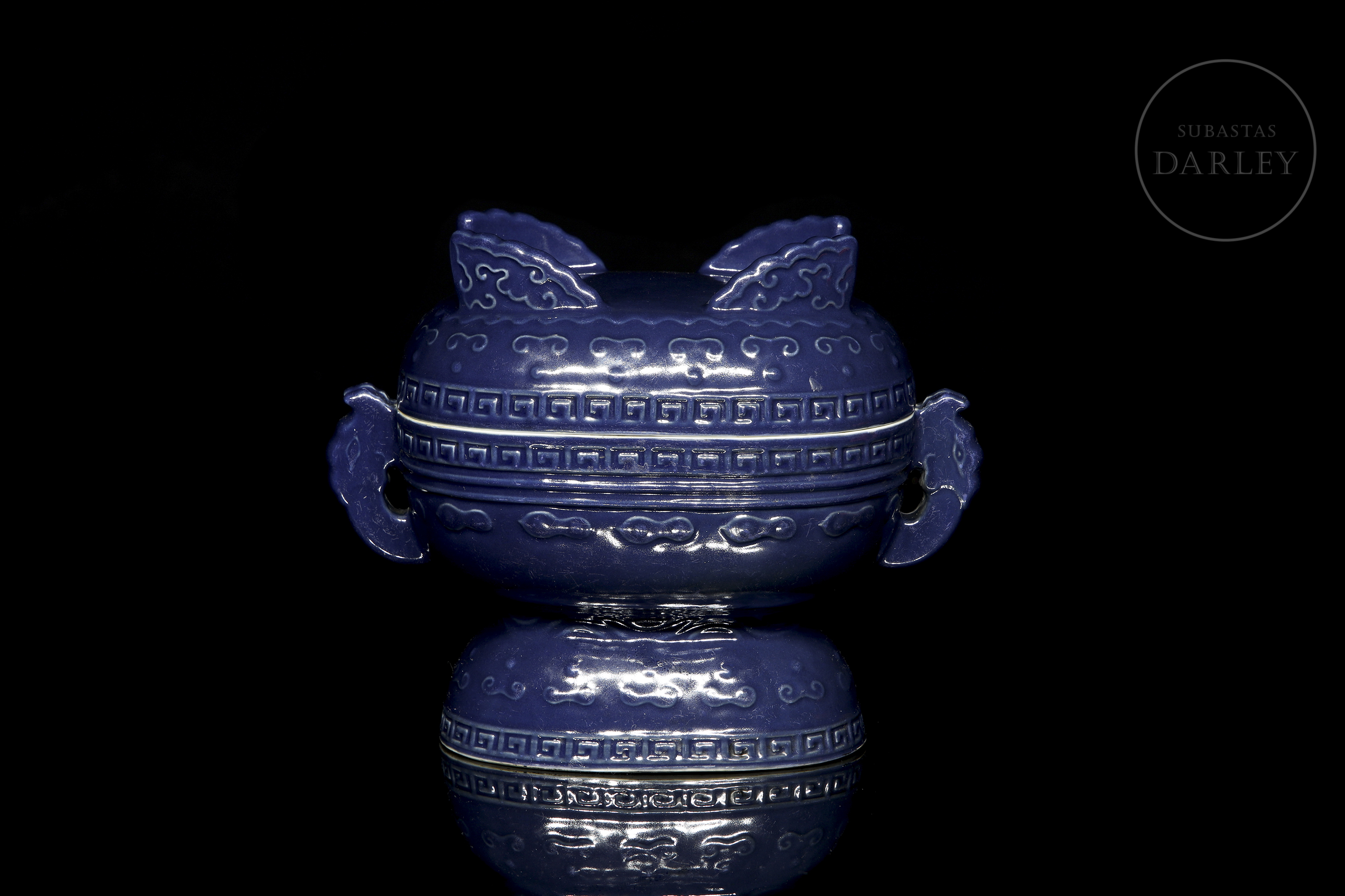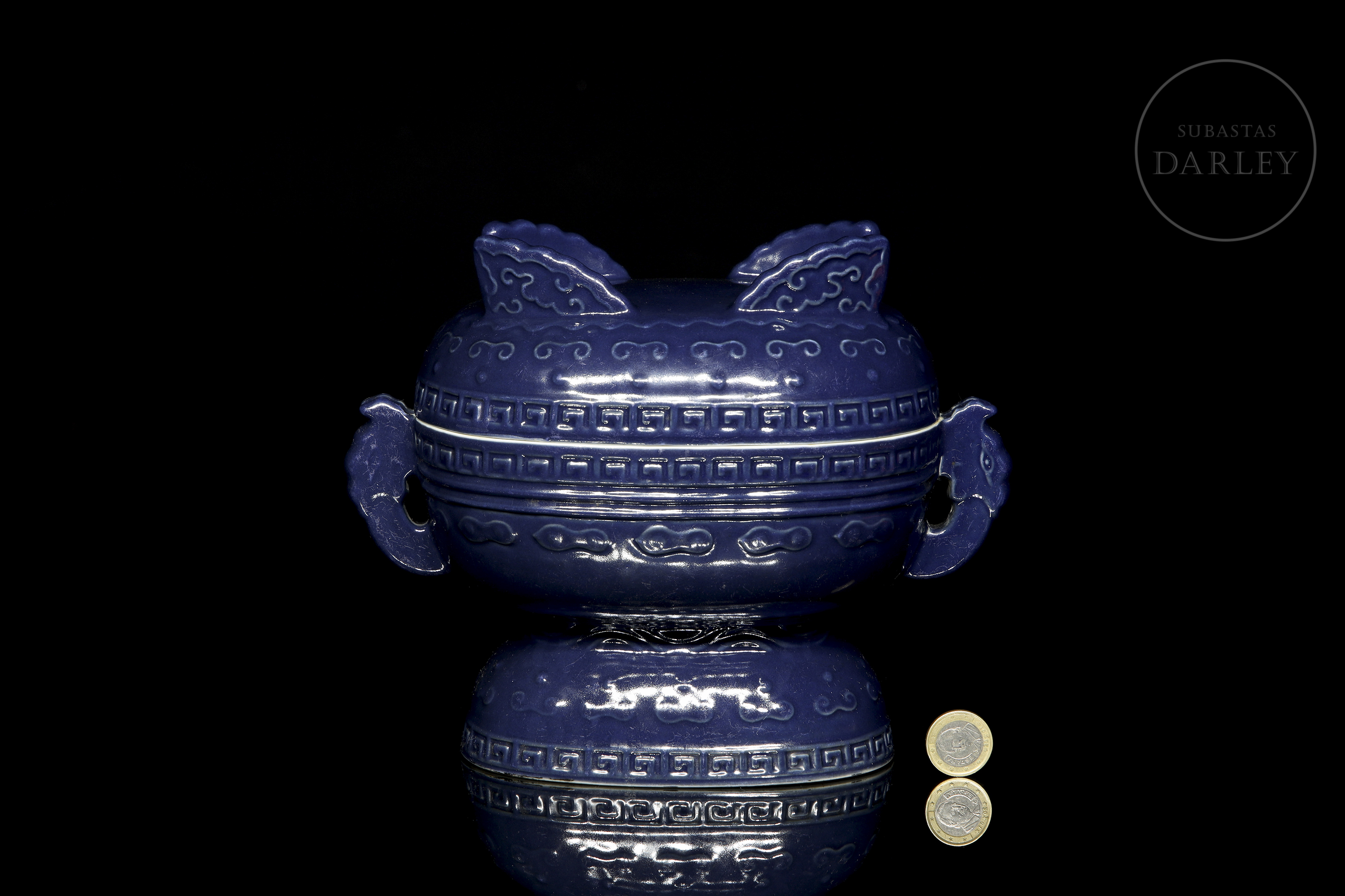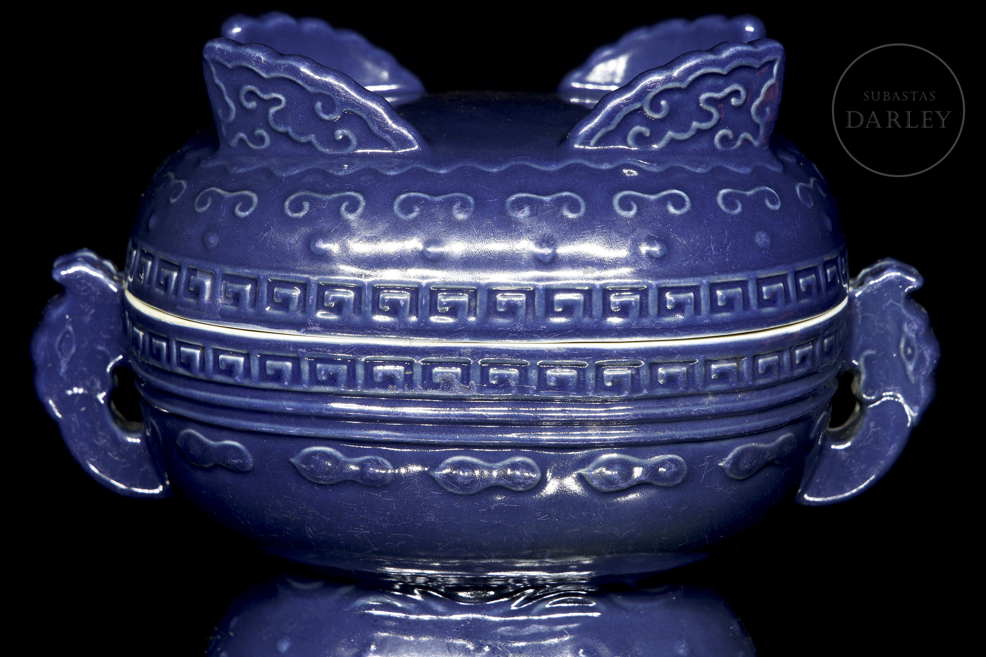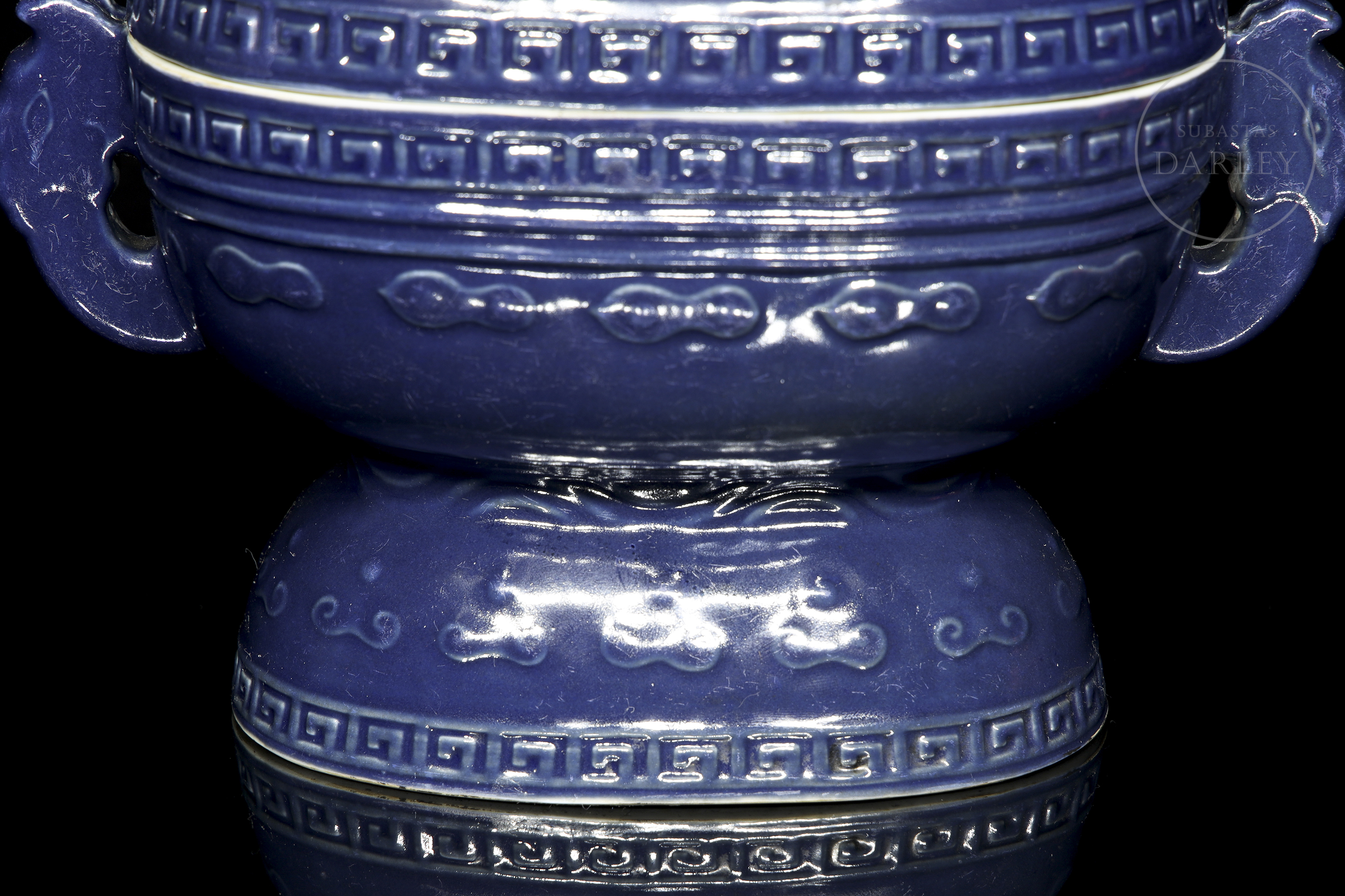 Porcelana esmaltada en intenso azul cobalto. De cuerpo globular, se eleva sobre pie elíptico y presenta tapa decorada con apliques en relieve que evocan estilizadas aletas. El conjunto está ornamentado con grecas geométricas y motivos de nubes en relieve. Las asas laterales, moldeadas en forma de cabezas de elefante, aportan un carácter zoomorfo característico de estas reinterpretaciones rituales. En la base se conserva un sello apócrifo en caracteres “大清嘉庆年制”.