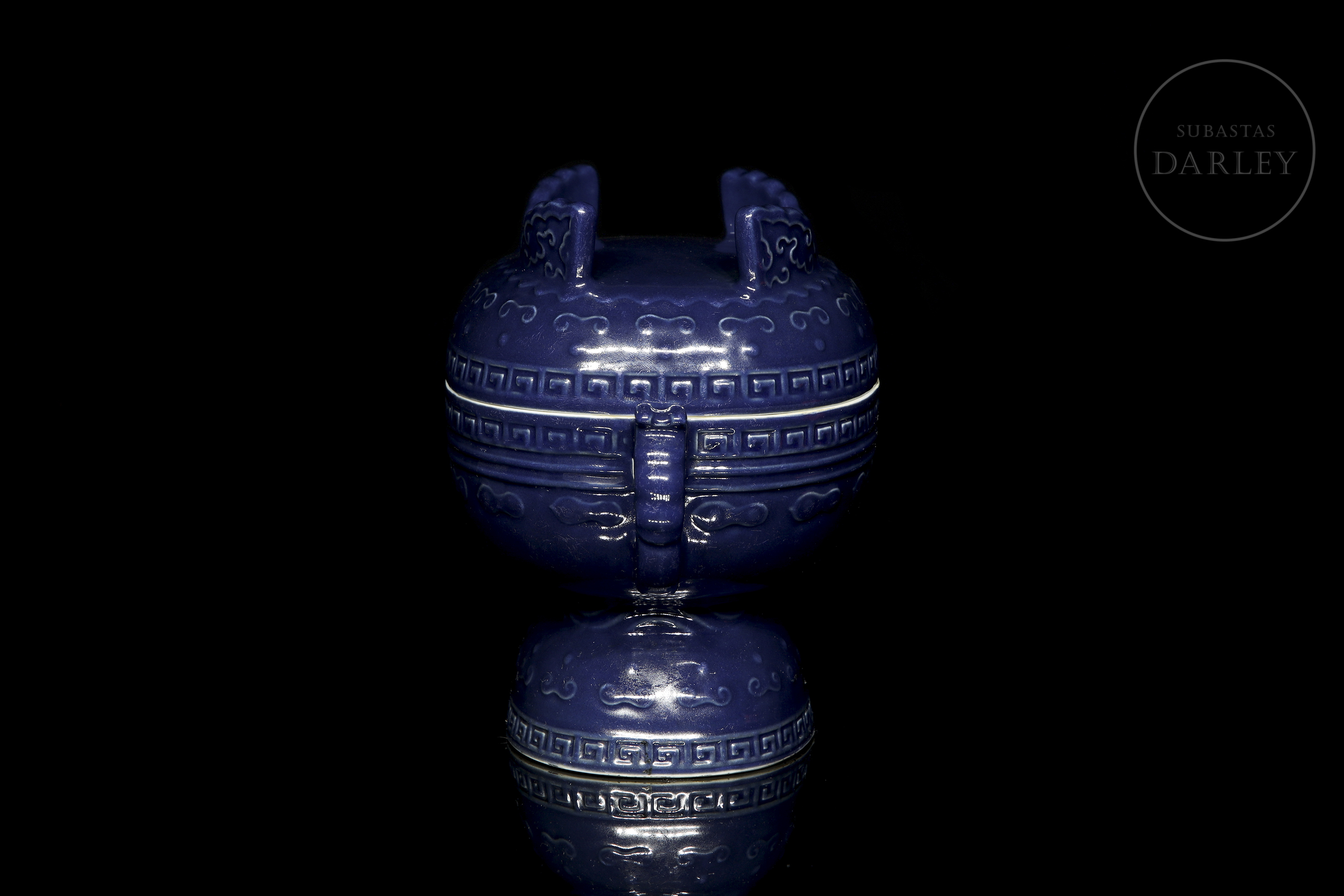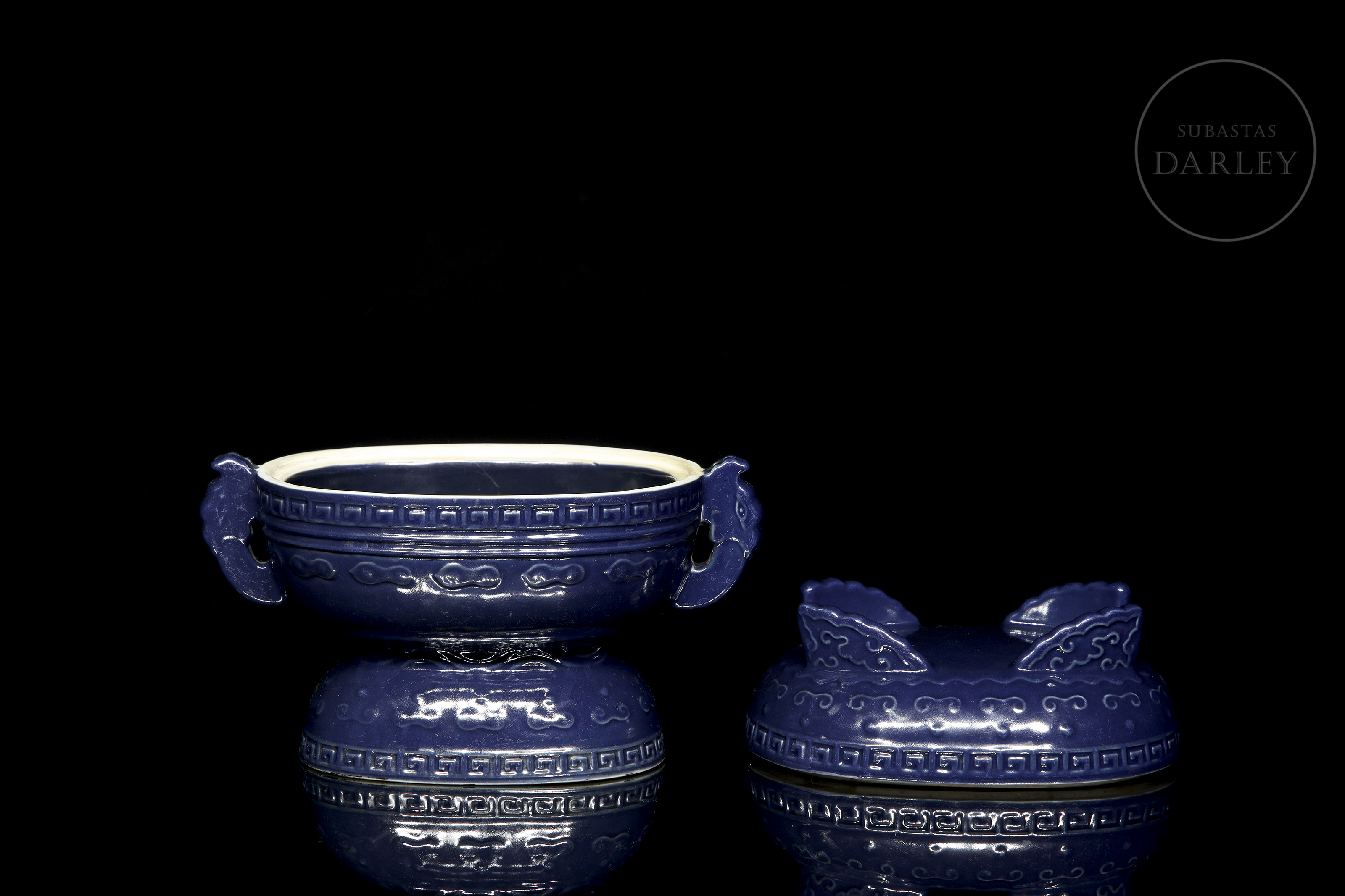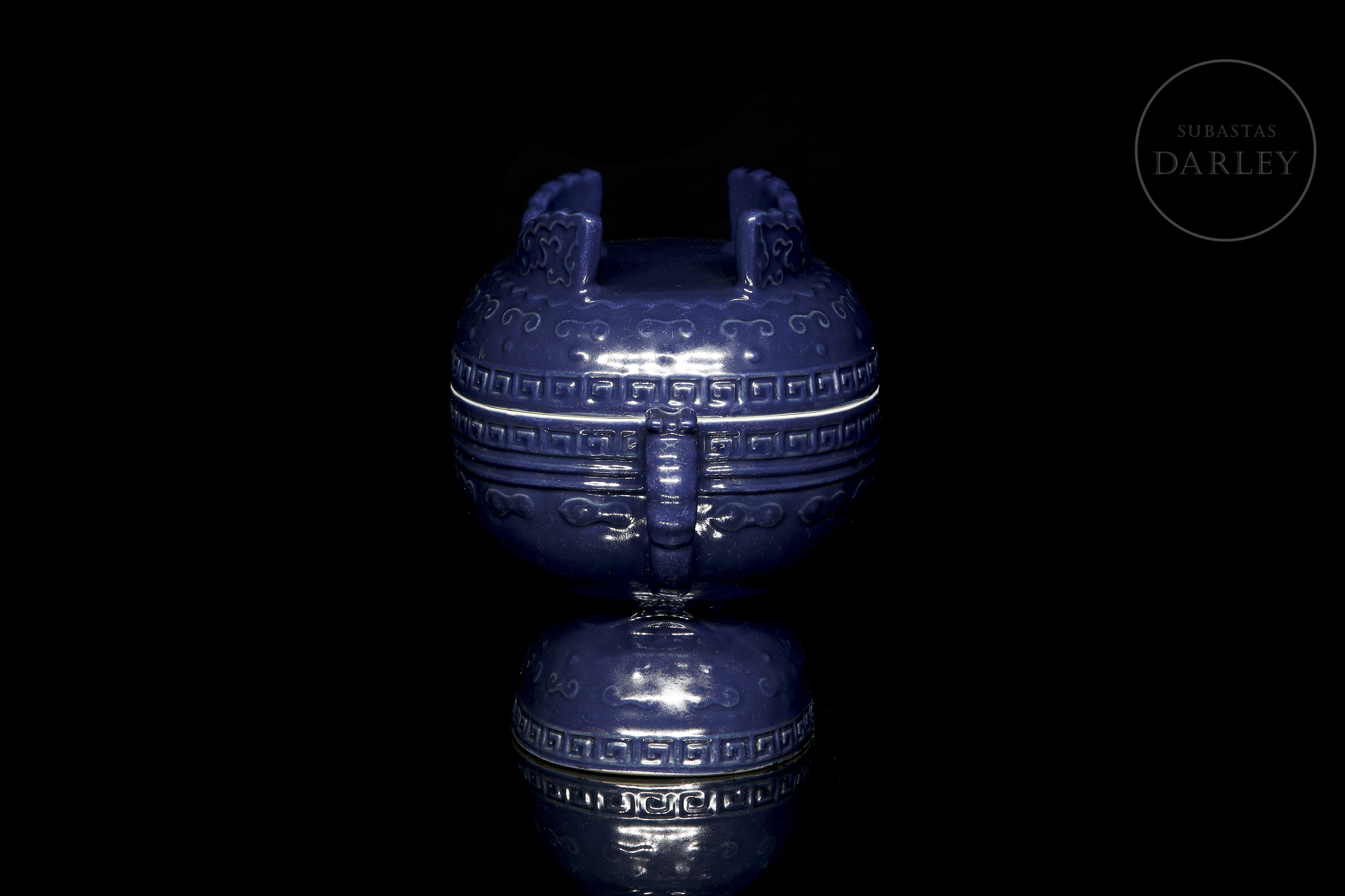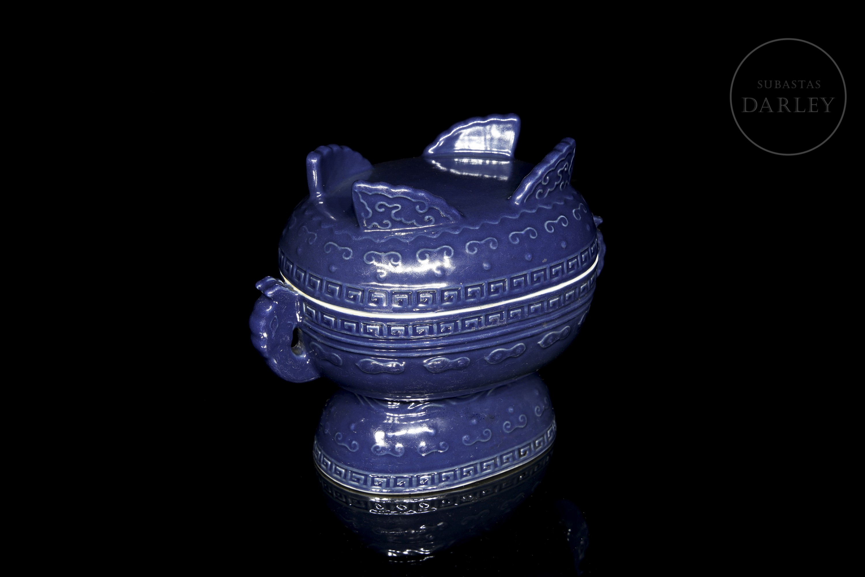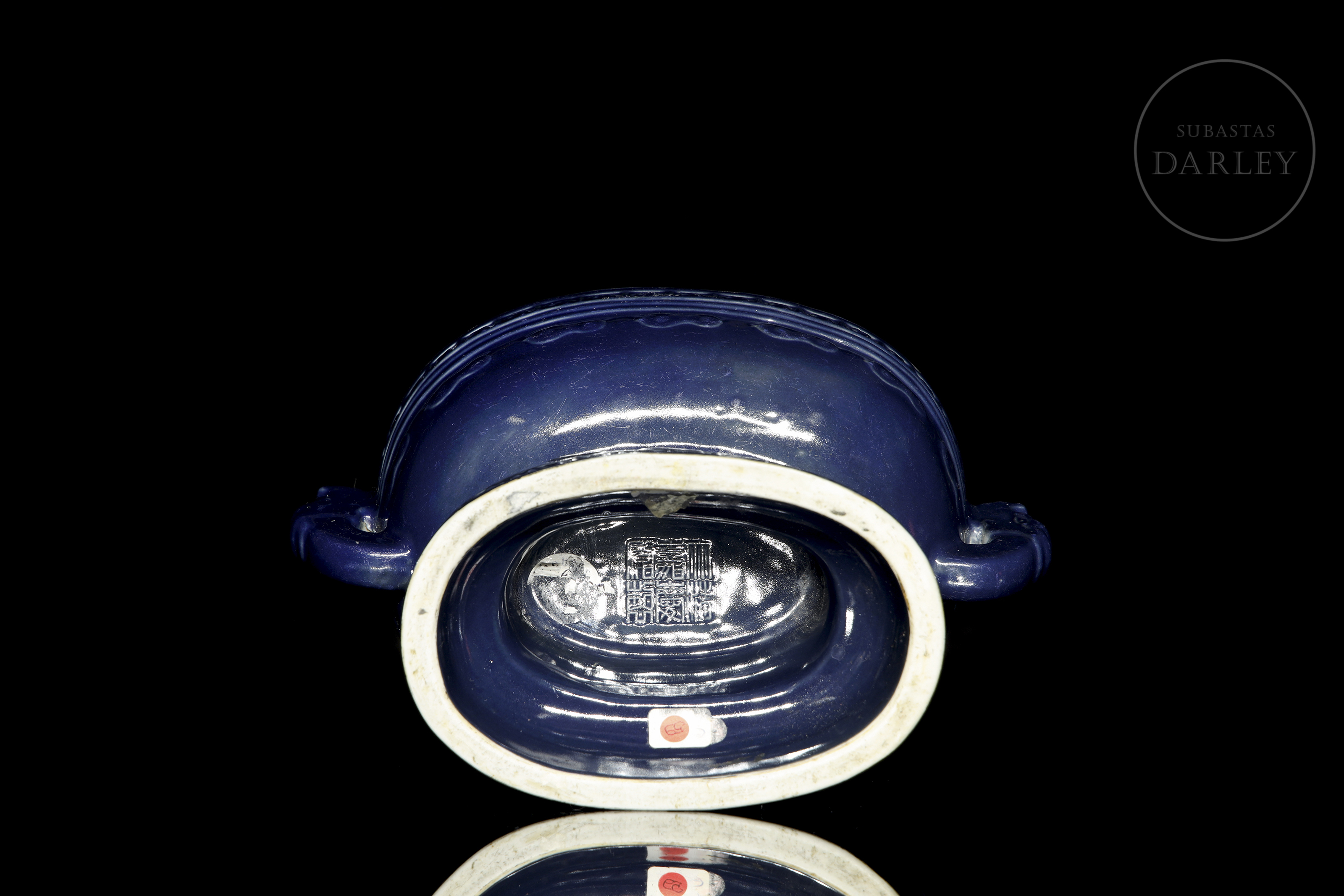 Porcelana esmaltada en intenso azul cobalto. De cuerpo globular, se eleva sobre pie elíptico y presenta tapa decorada con apliques en relieve que evocan estilizadas aletas. El conjunto está ornamentado con grecas geométricas y motivos de nubes en relieve. Las asas laterales, moldeadas en forma de cabezas de elefante, aportan un carácter zoomorfo característico de estas reinterpretaciones rituales. En la base se conserva un sello apócrifo en caracteres “大清嘉庆年制”.