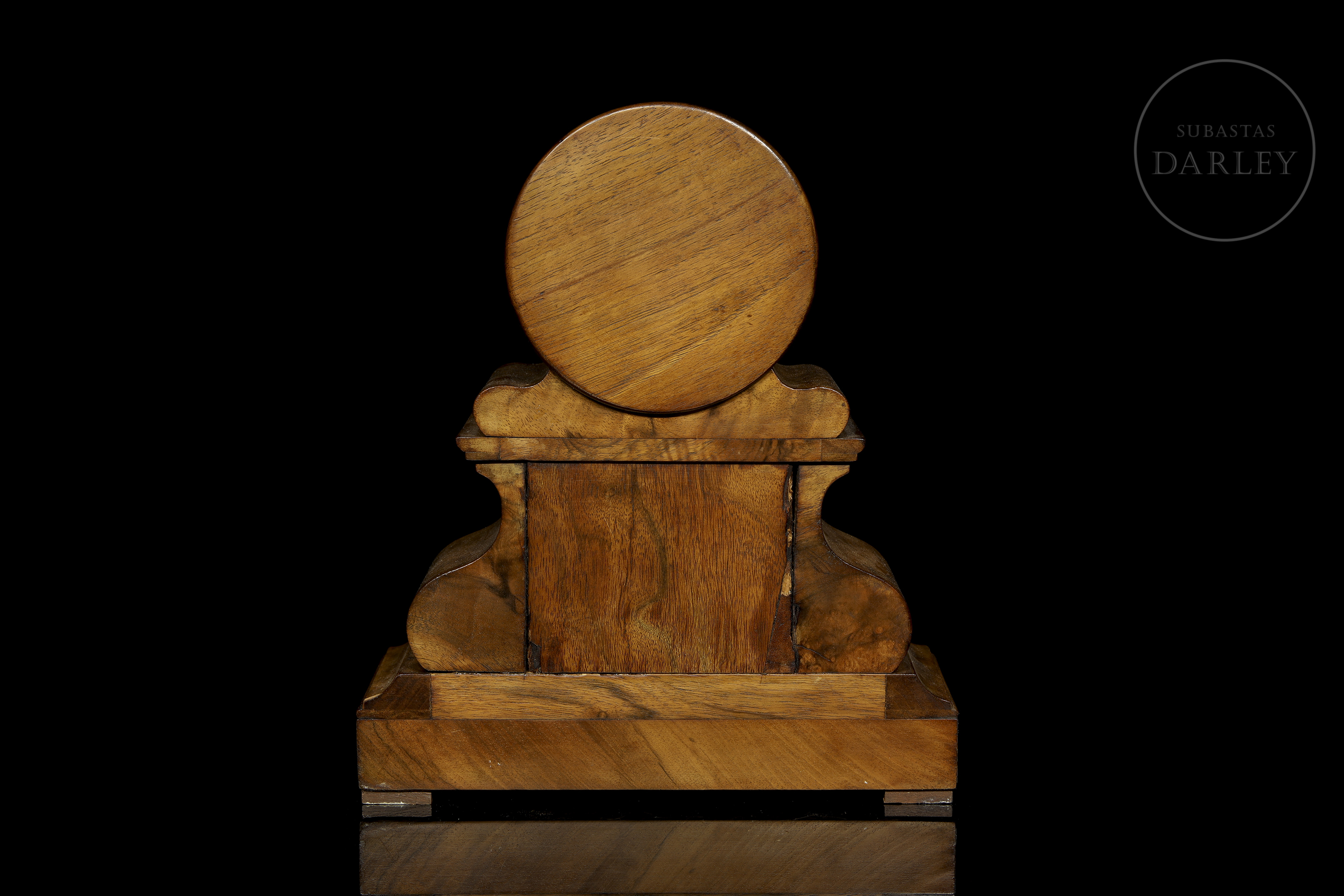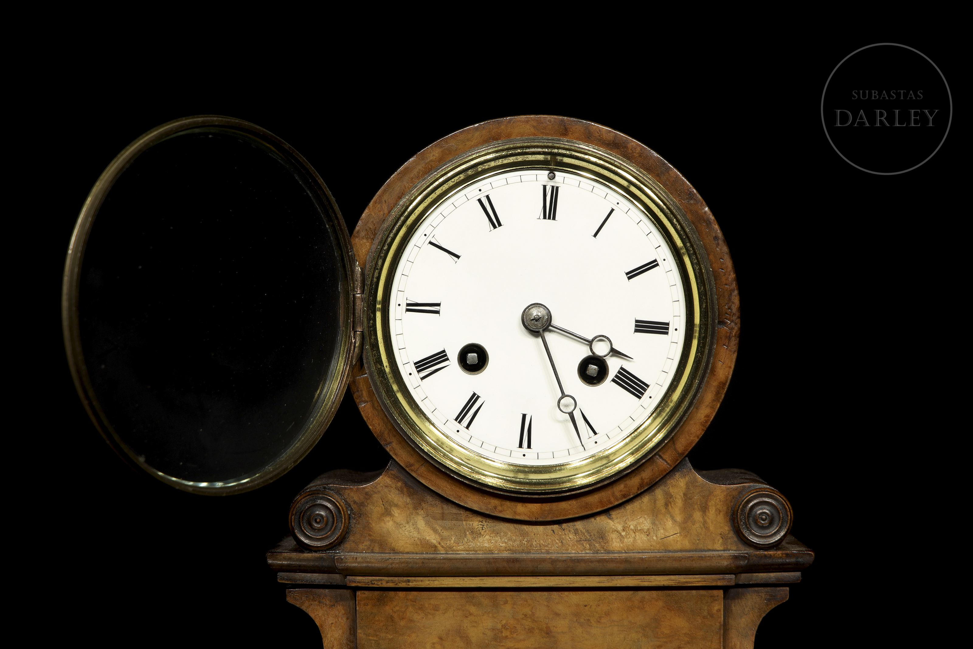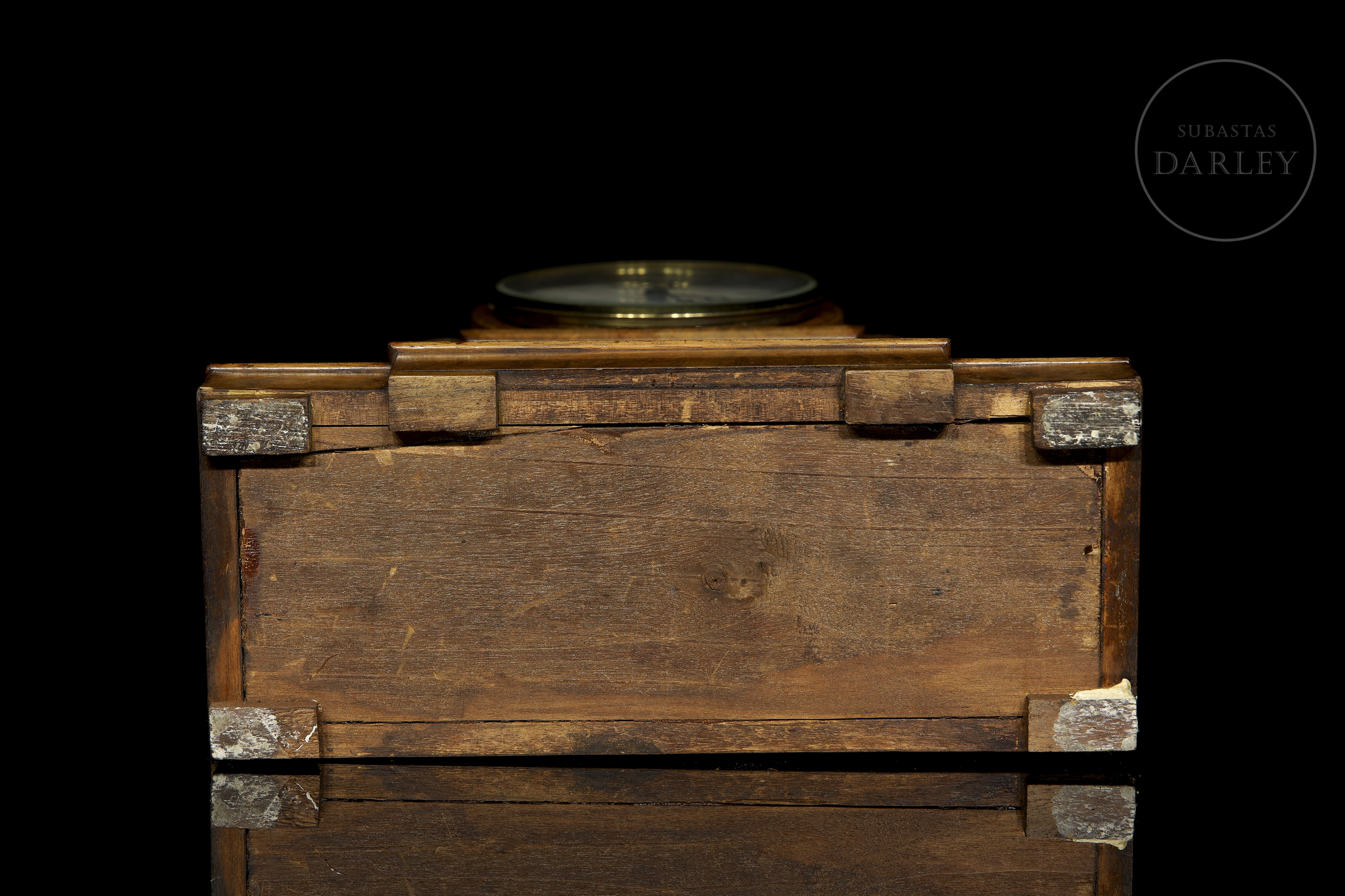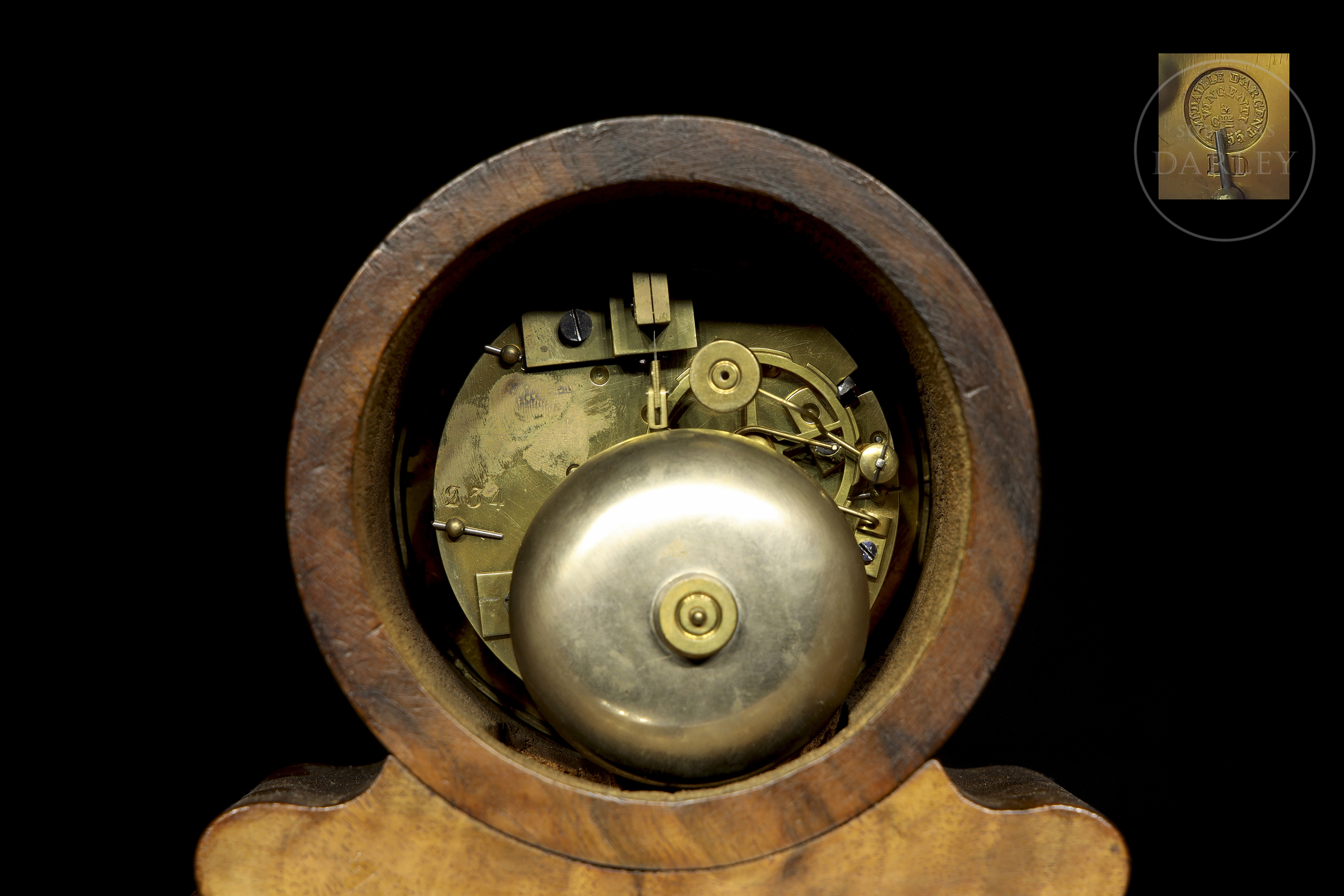 El mecanismo presenta numeración grabada “234” y sello circular del fabricante (visible en detalle), correspondiente a manufactura del siglo XIX. Mecanismo de cuerda manual con doble tren accionado mediante llave.
