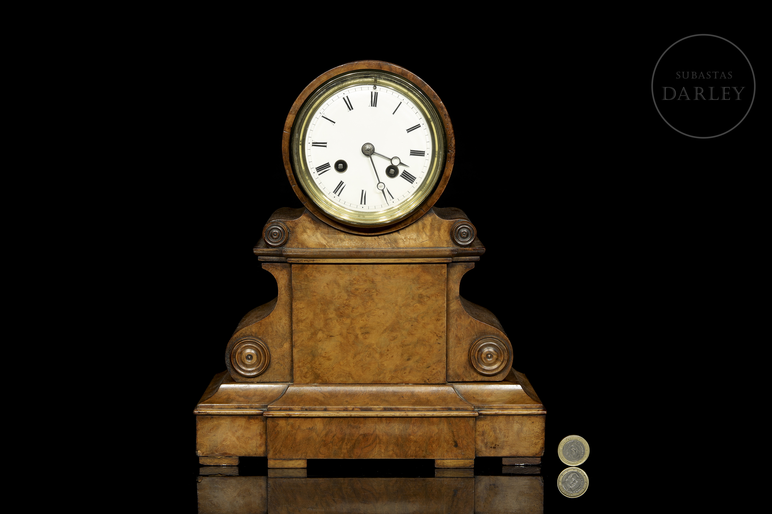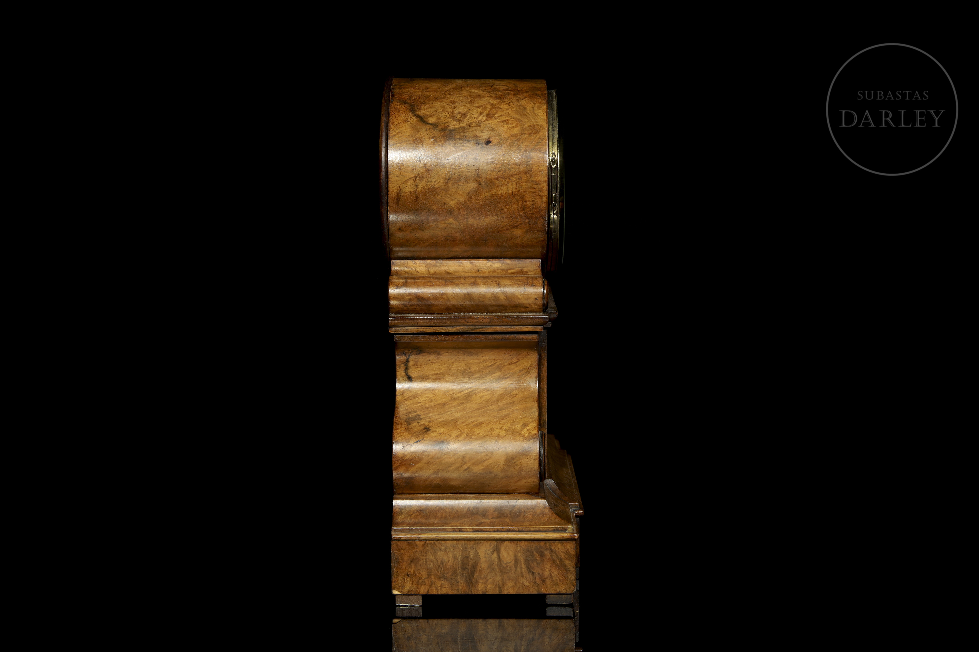 Reloj de sobremesa victoriano producido por Camerer, Kuss & Co. Elaborado en madera con acabado pulido, presenta caja arquitectónica con cuerpo superior cilíndrico que alberga la esfera circular esmaltada en blanco, numeración romana en negro y agujas tipo Breguet. Esfera protegida por bisel acristalado con aro metálico dorado.