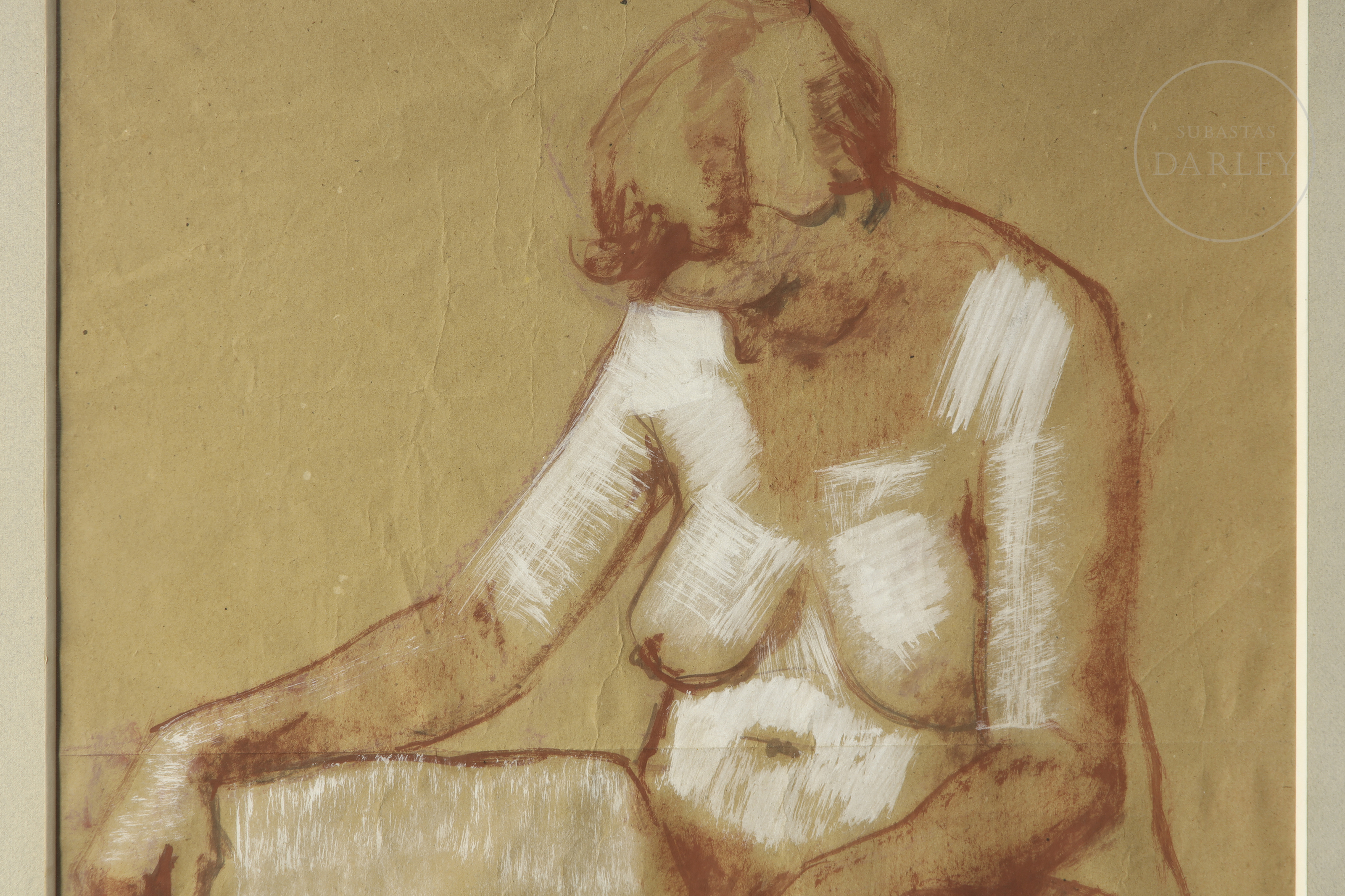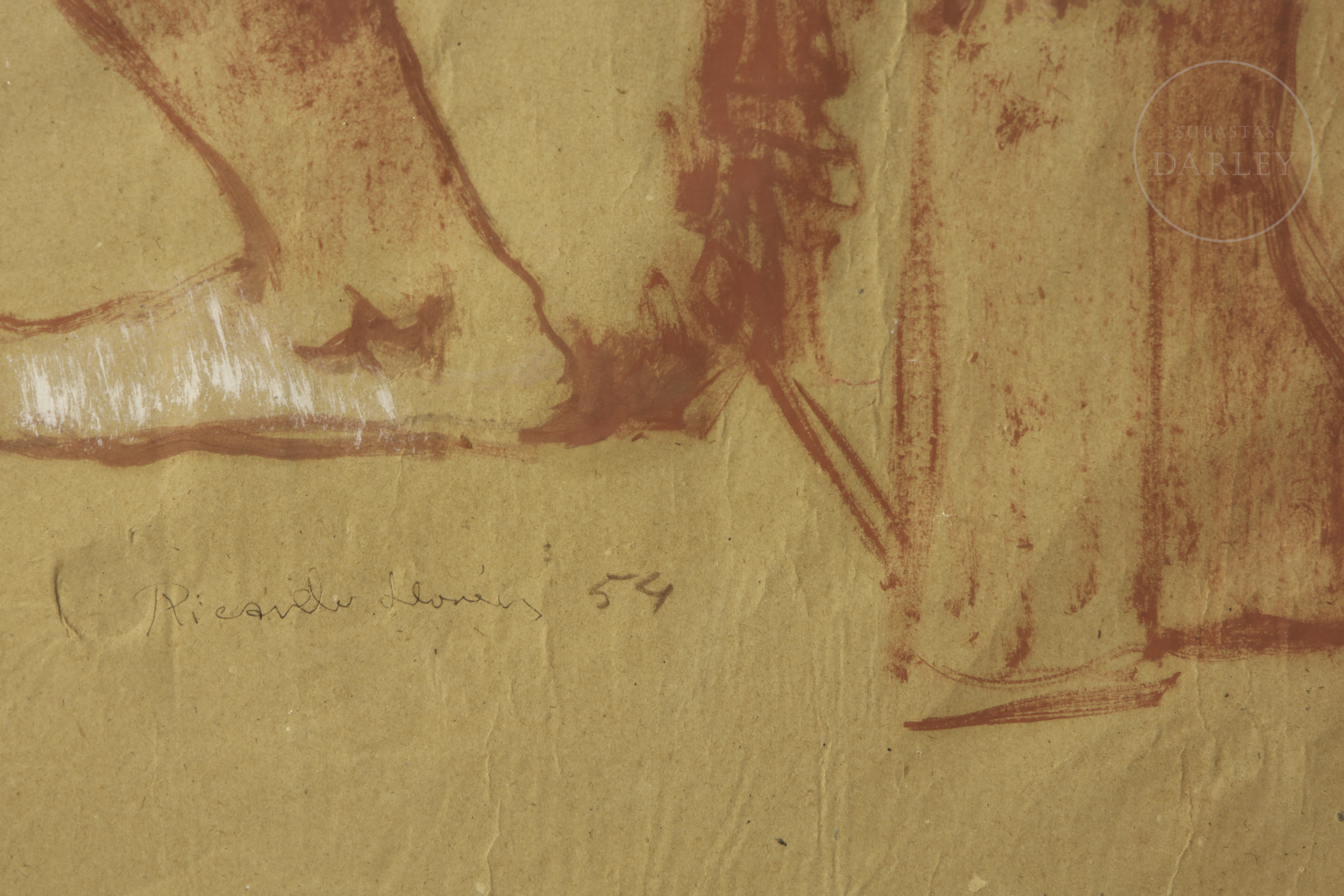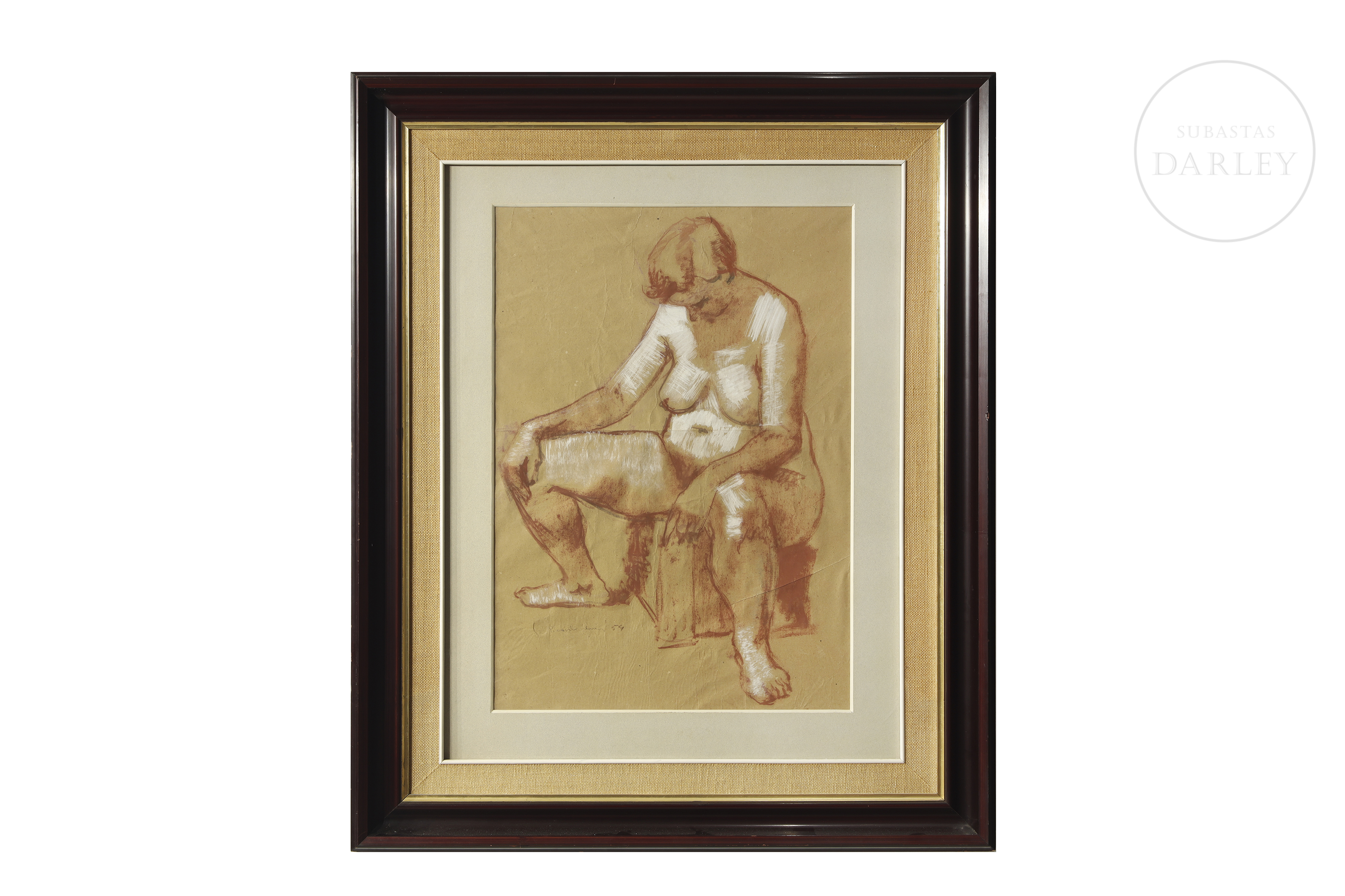 Lápiz compuesto y sanguina sobre papel. Estudio del natural que representa un desnudo femenino sentado. Firmado y fechado "Ricardo Llorens / 54" en el ángulo inferior izquierdo.