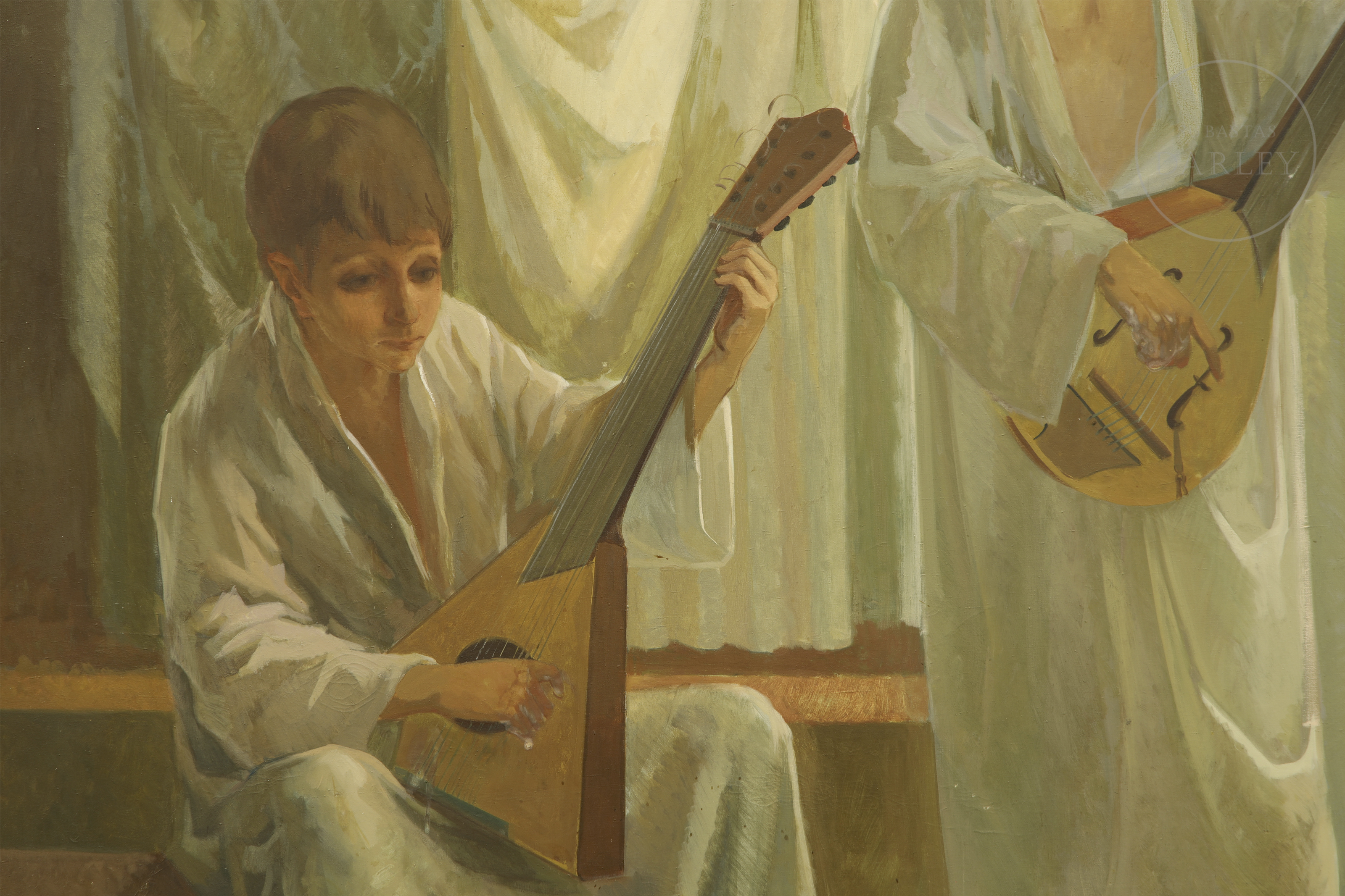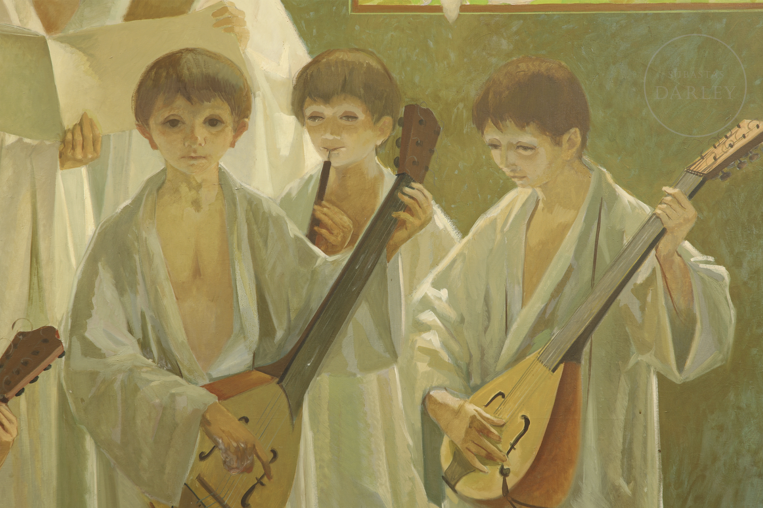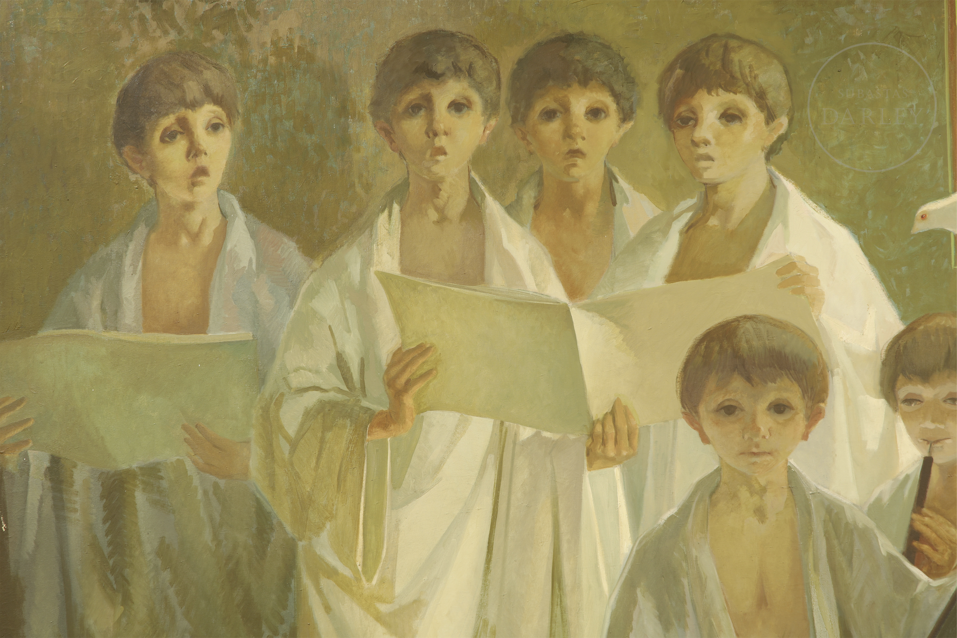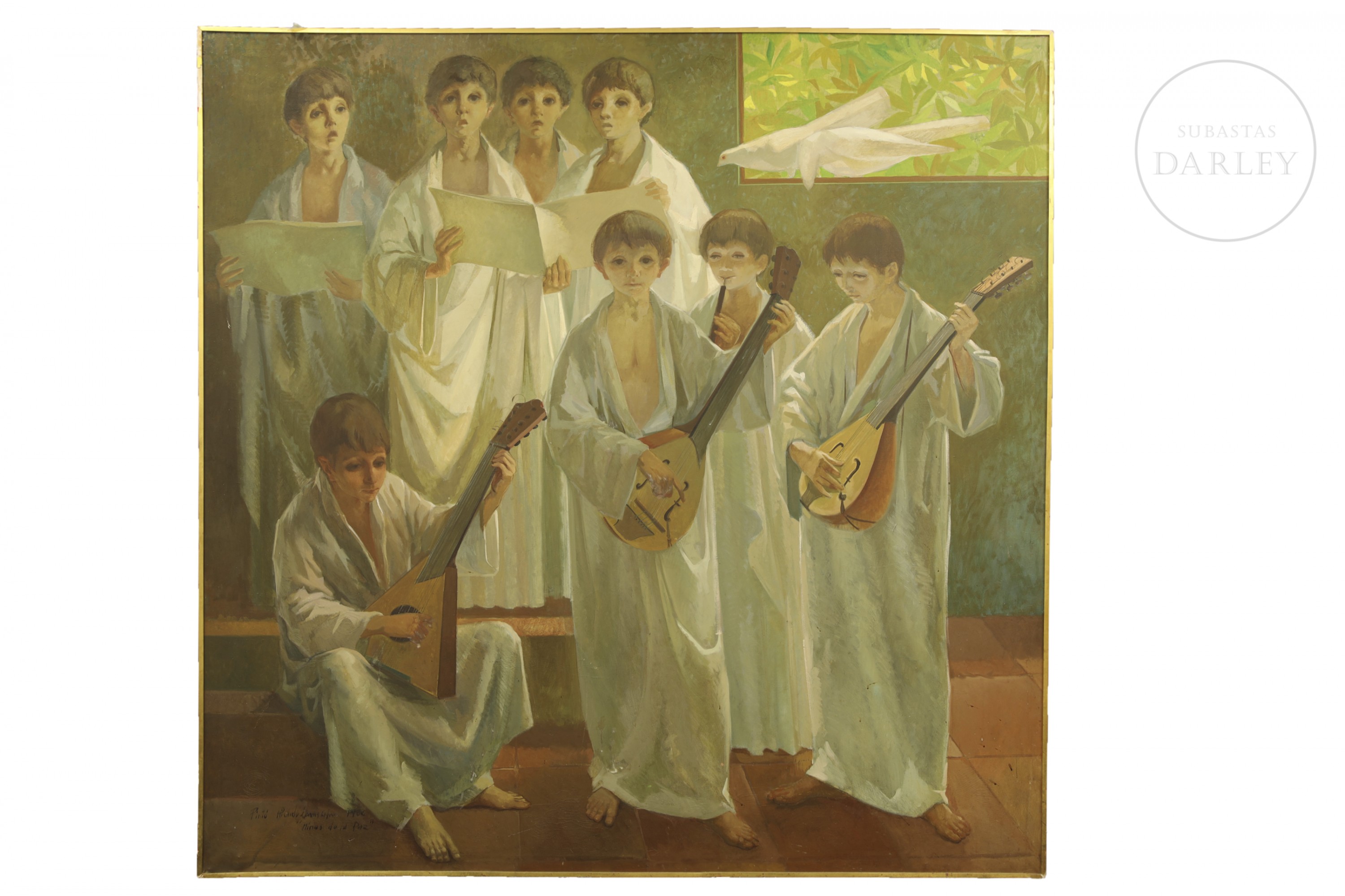 Simbólica y monumental composición que representa a un coro de jóvenes músicos y cantores ataviados con túnicas blancas. Firmado en la esquina inferior izquierda "Ricardo Llorens Cifre", indicando fecha y título. Presenta ligeros desperfectos en la capa pictórica.