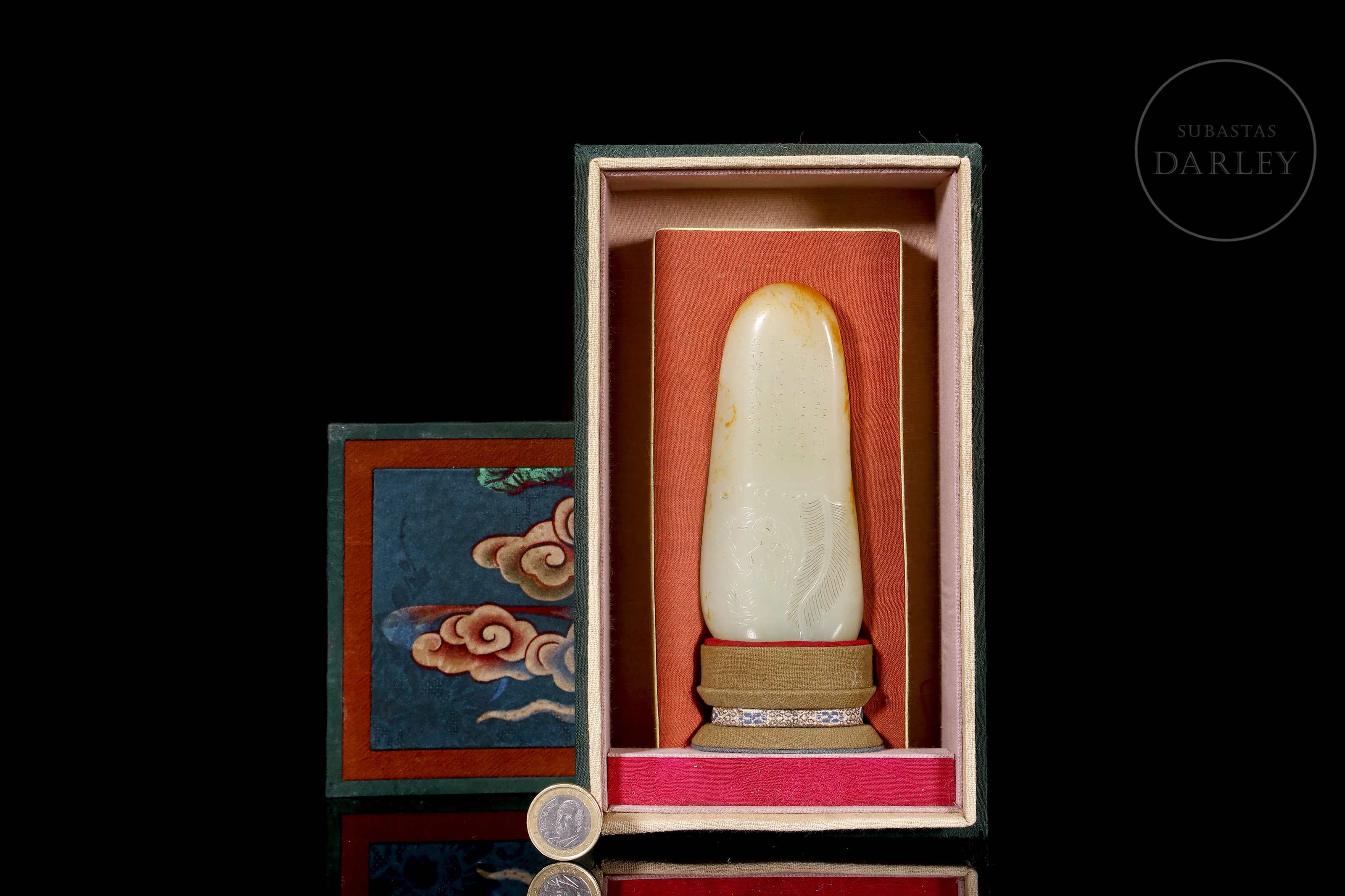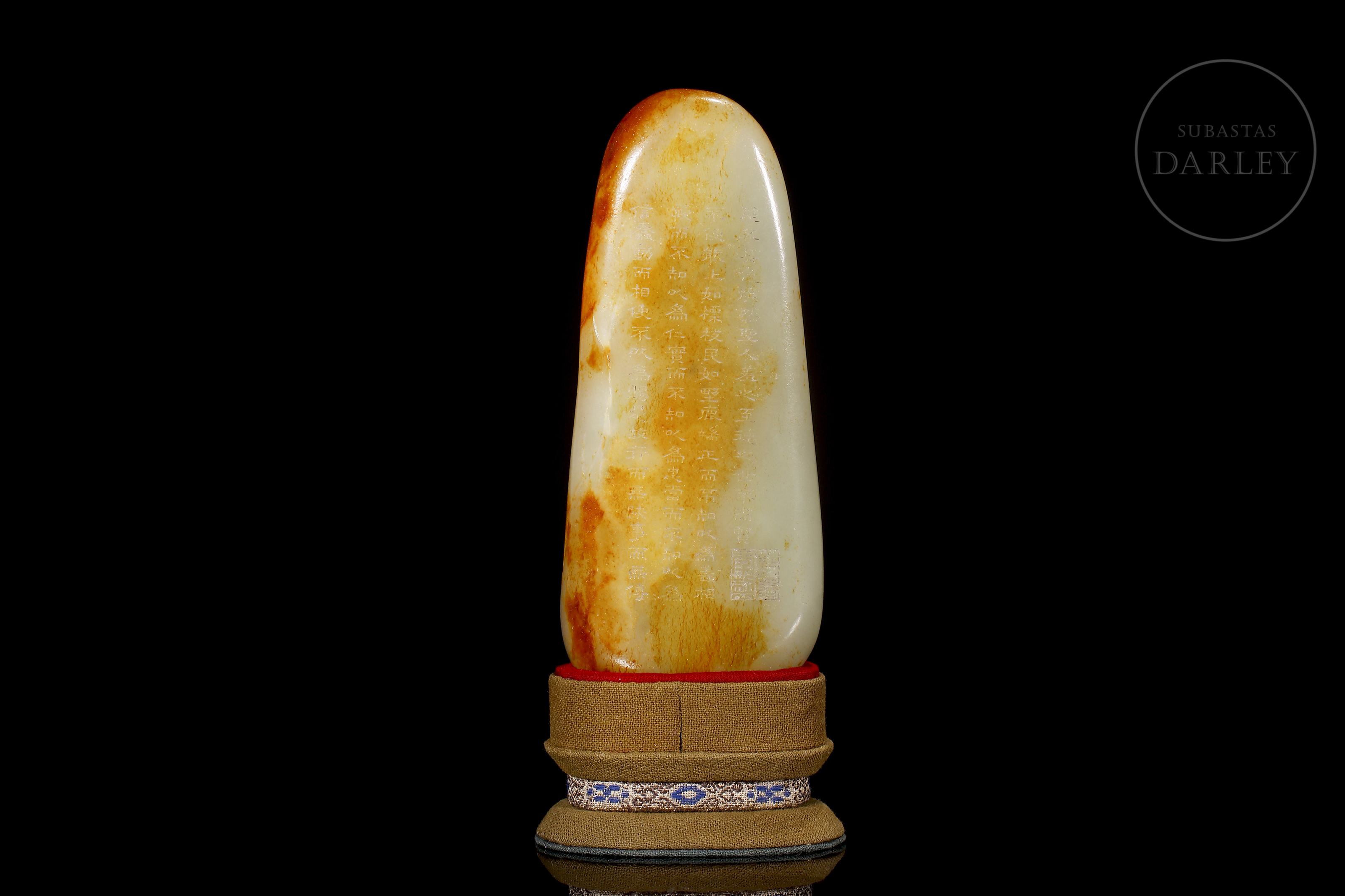 Roca de jade blanco de Hetian de tonalidad nívea con pulido de gran suavidad. Presenta un formato de roca, de morfología irregular alargada, y bordes redondeados. La superficie se muestra decorada en el anverso con una talla incisa de caballos en un paisaje, bajo la sombra de un pino, acompañando un largo poema inciso junto a dos sellos cuadrados. Descansa sobre una peana a medida y se adjunta una caja de presentación. Dinastía Qing (1644–1911).