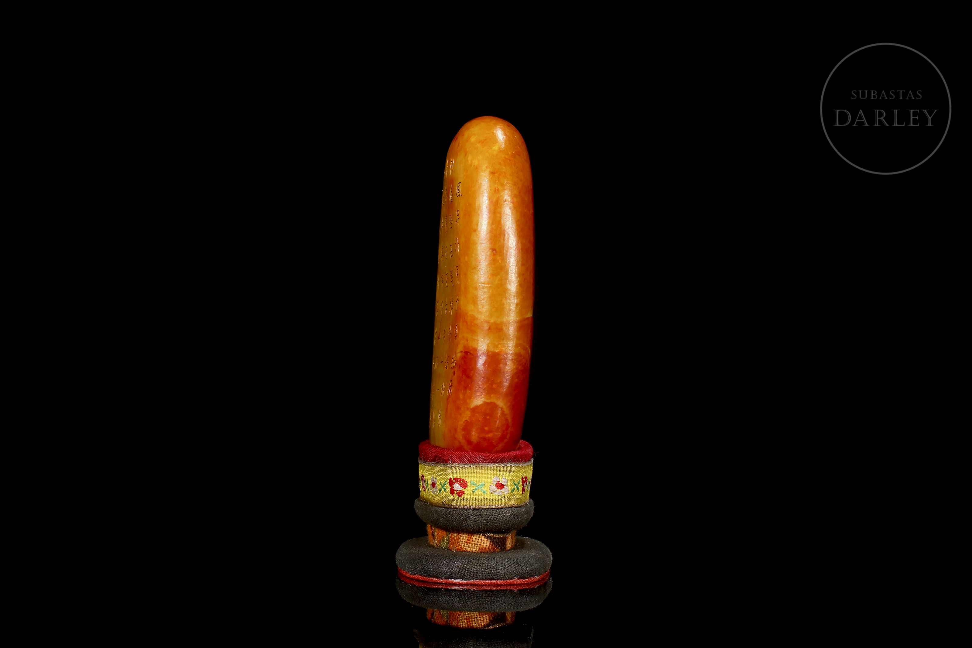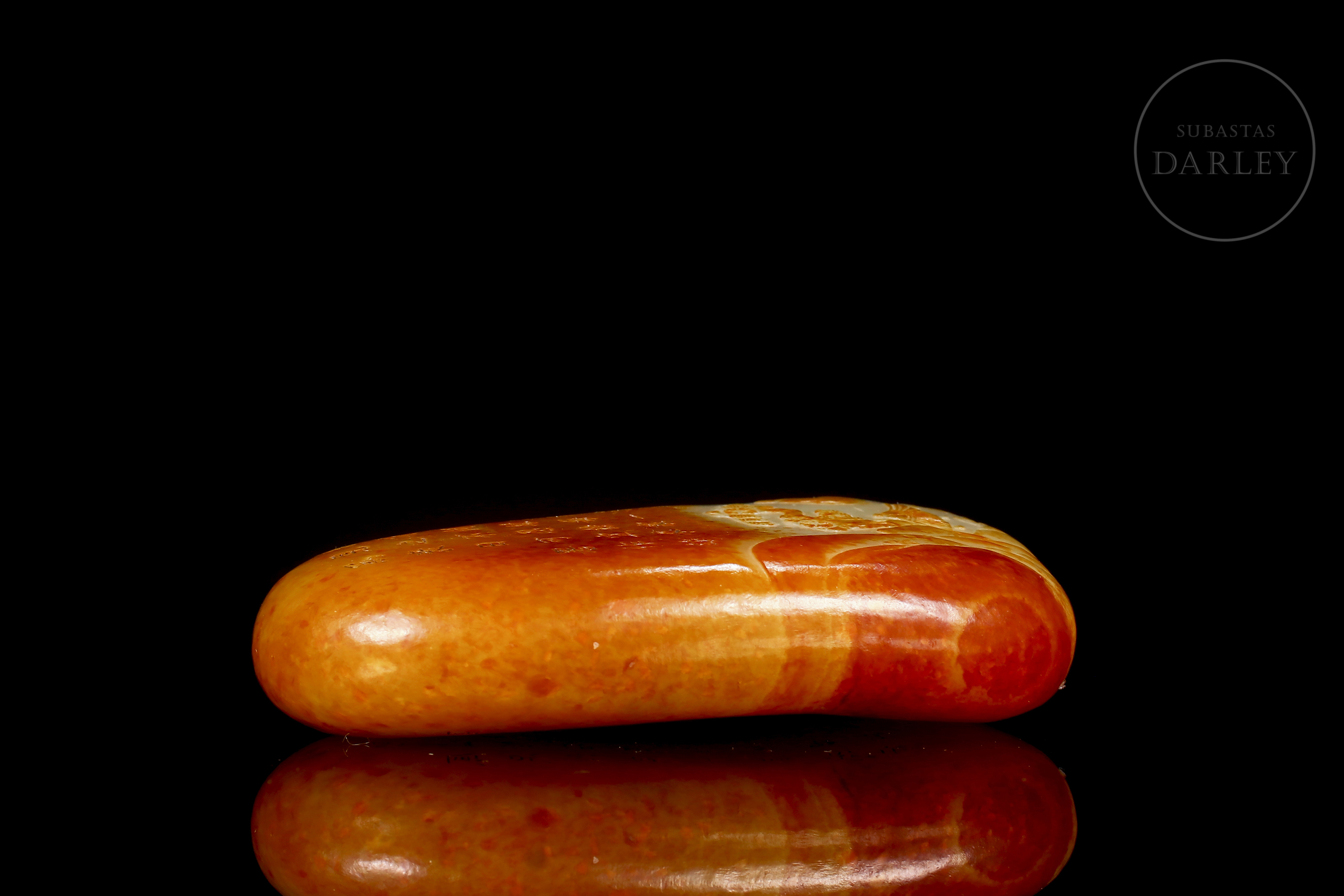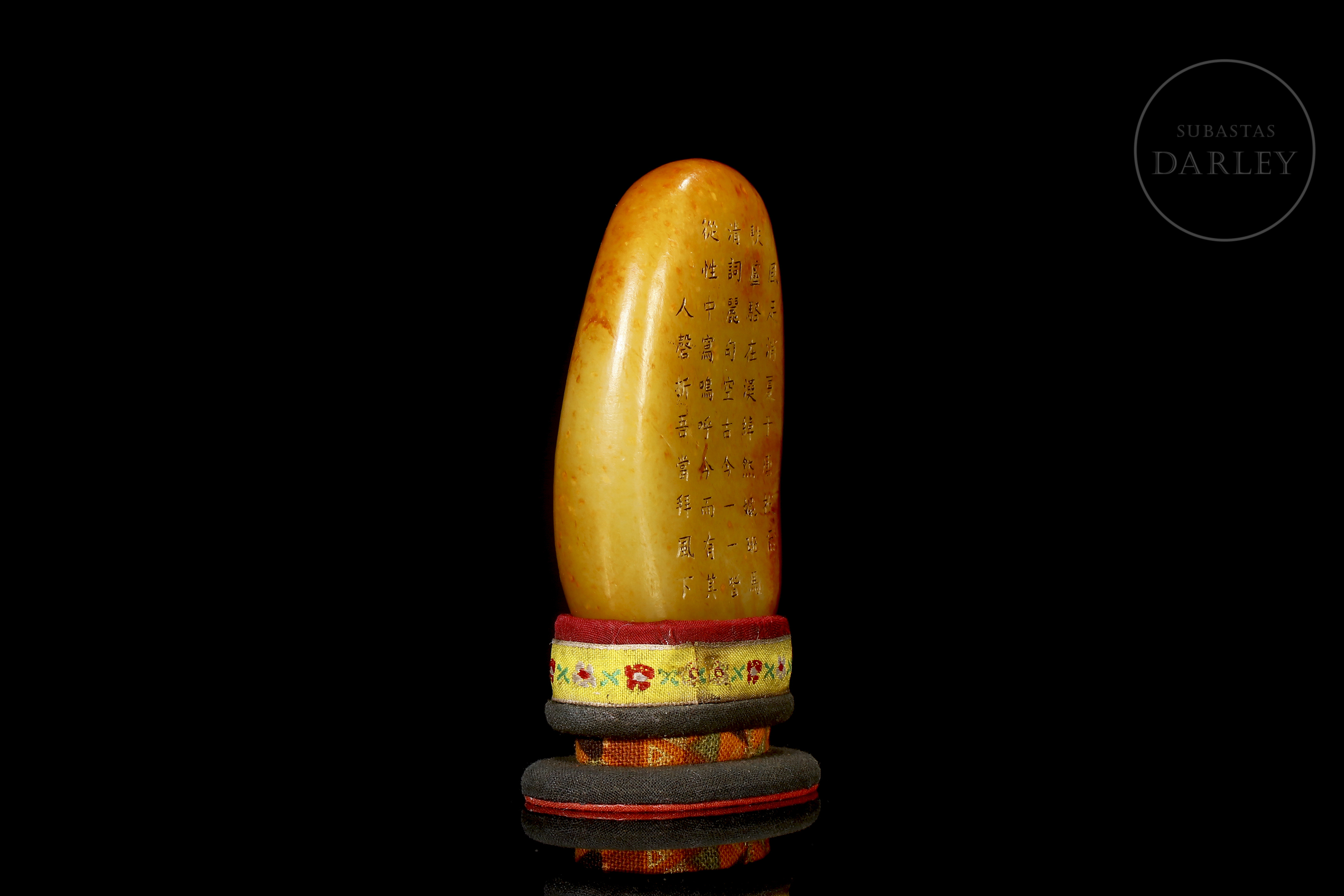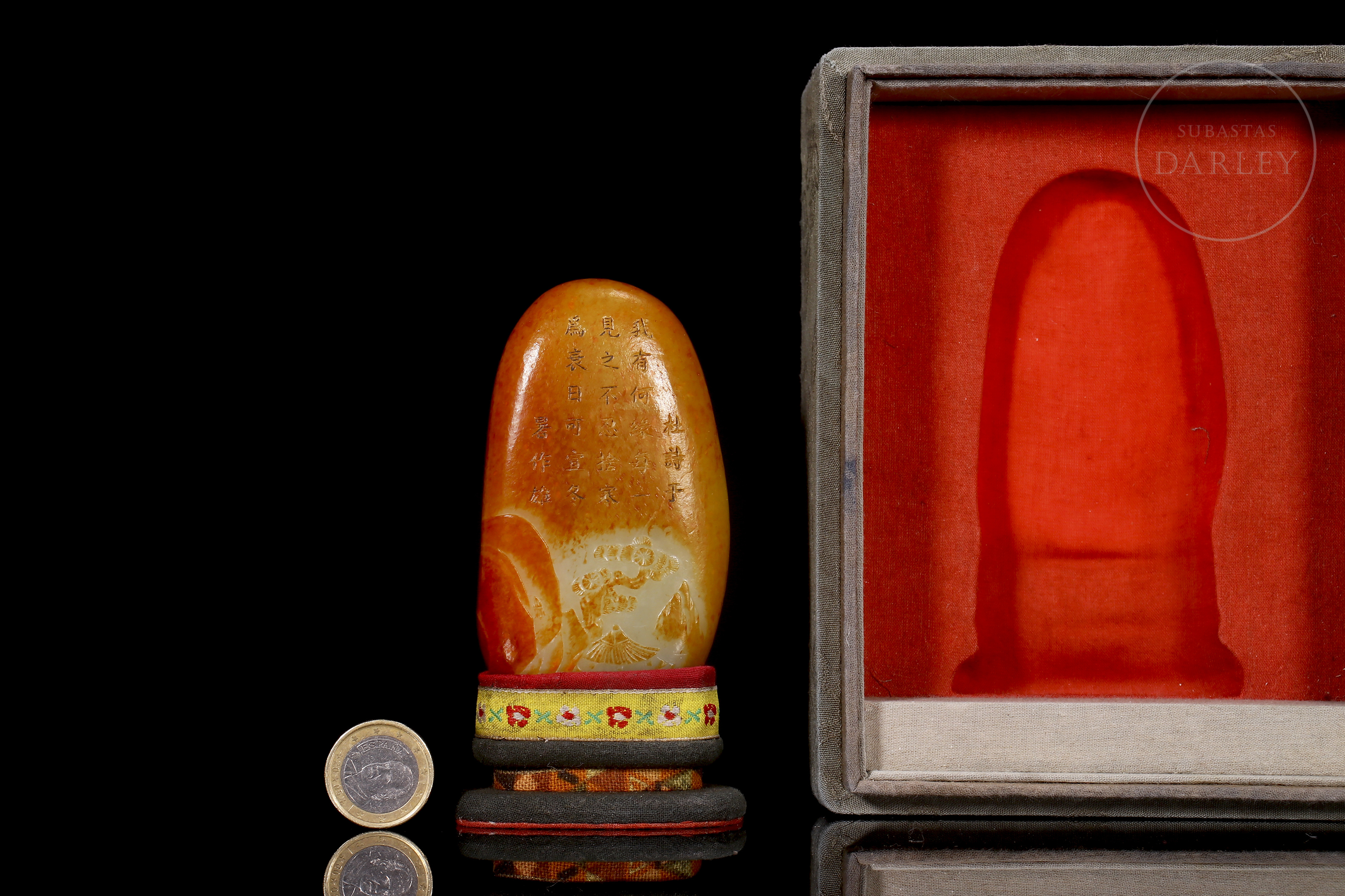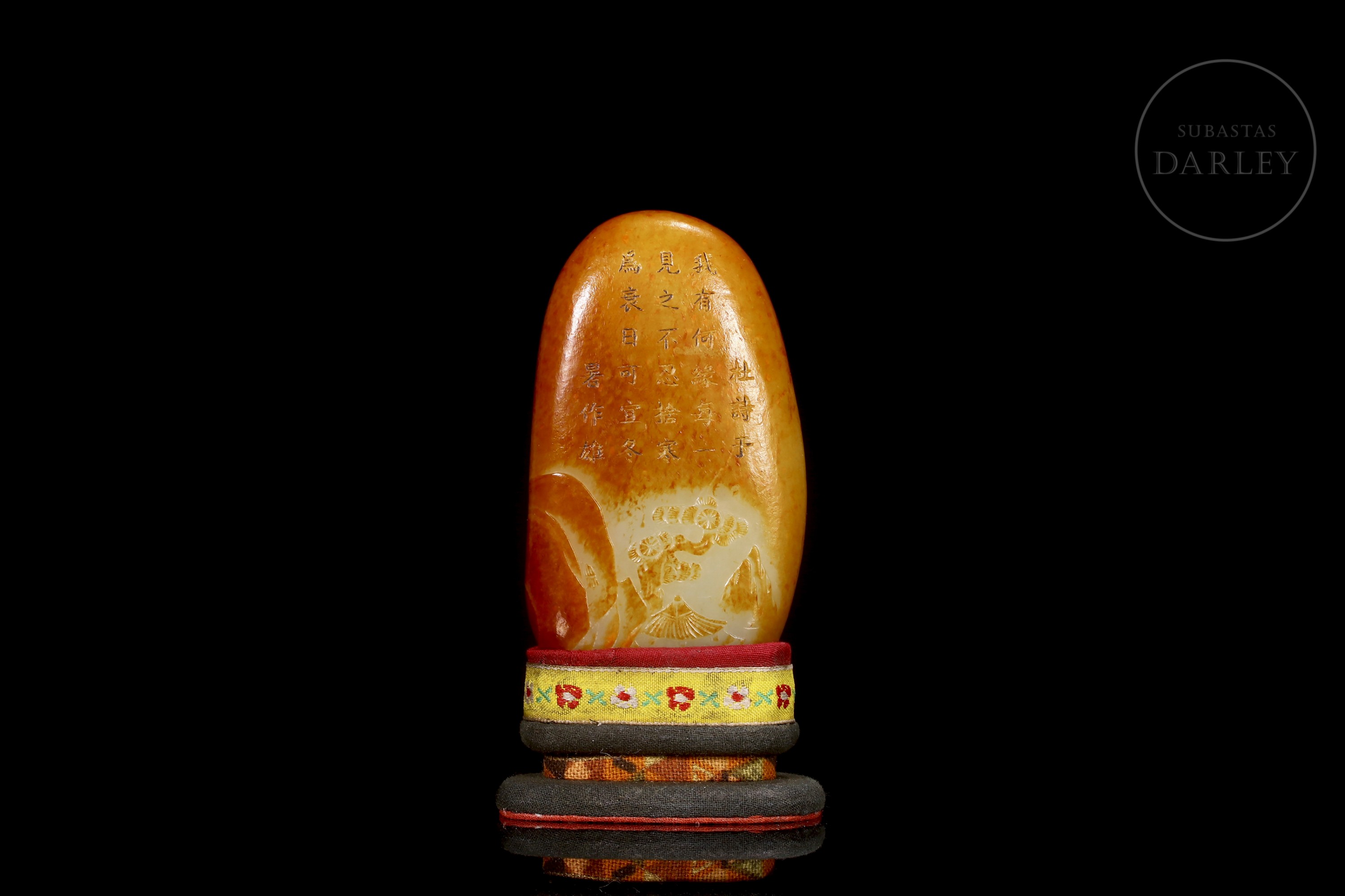 Jade nefrita blanco, cubierto por una intensa pátina de tonalidad rojizo y ámbar. La obra presenta un formato de roca natural de bordes redondeados. La superficie se muestra dividida en dos registros narrativos: el anverso exhibe, en la zona inferior, una talla en bajorrelieve de un paisaje montañoso con pinos centenarios y riscos escarpados, coronado por un largo poema inciso que se extiende en el reverso. Muestra pátina por envejecimiento. Se acompaña de una peana y caja a medida forrados con seda brocado policromada. Dinastía Qing (1644–1911).