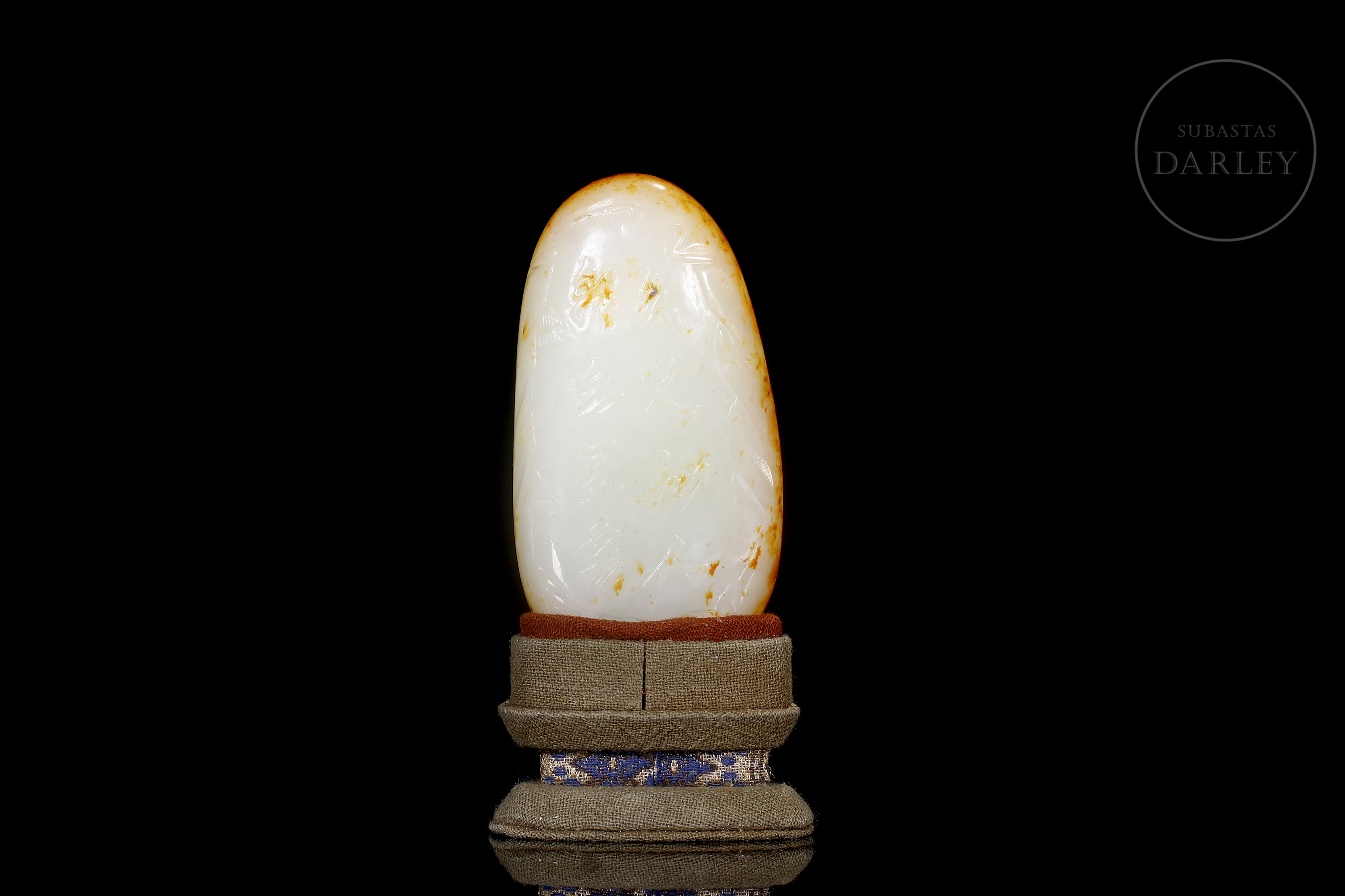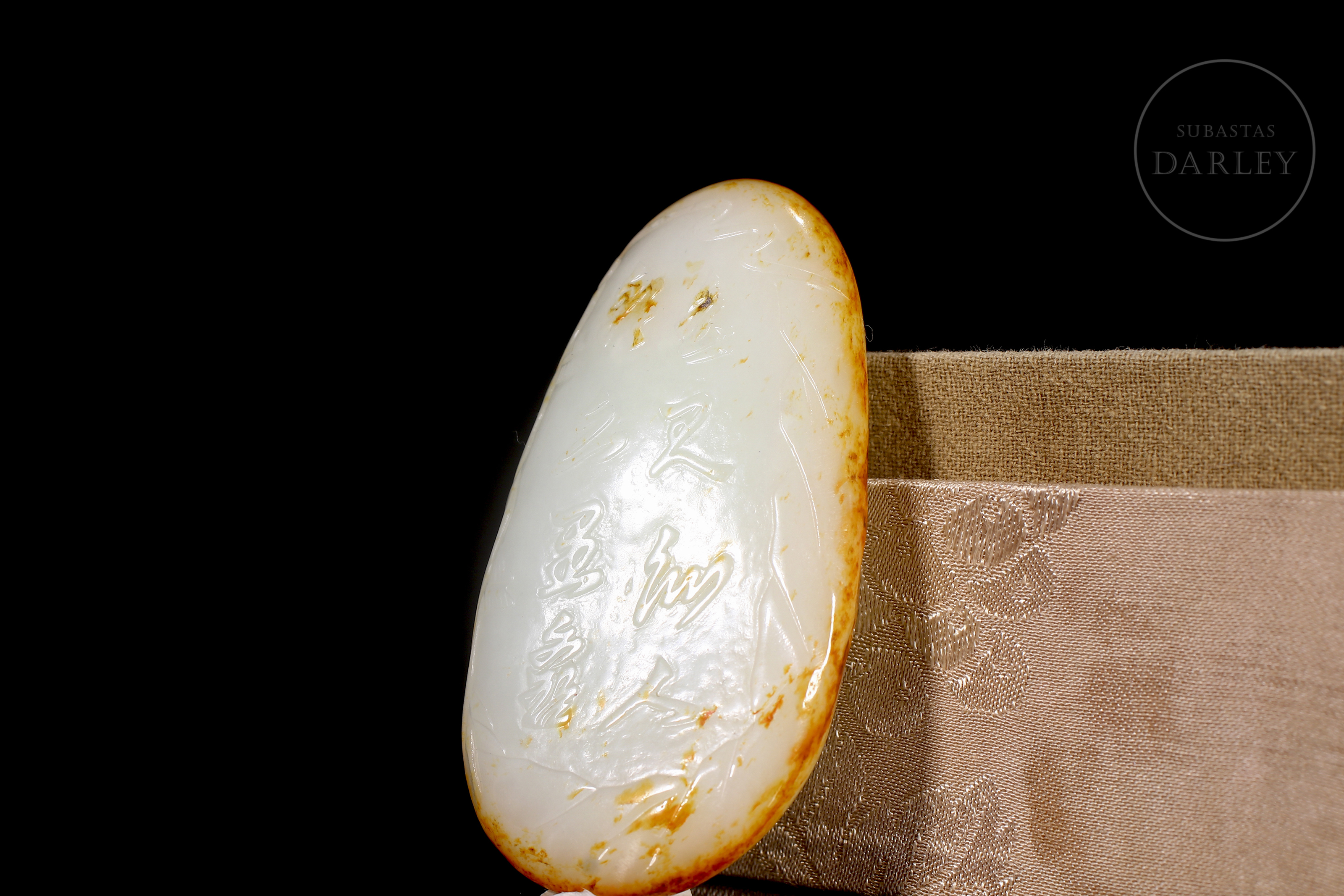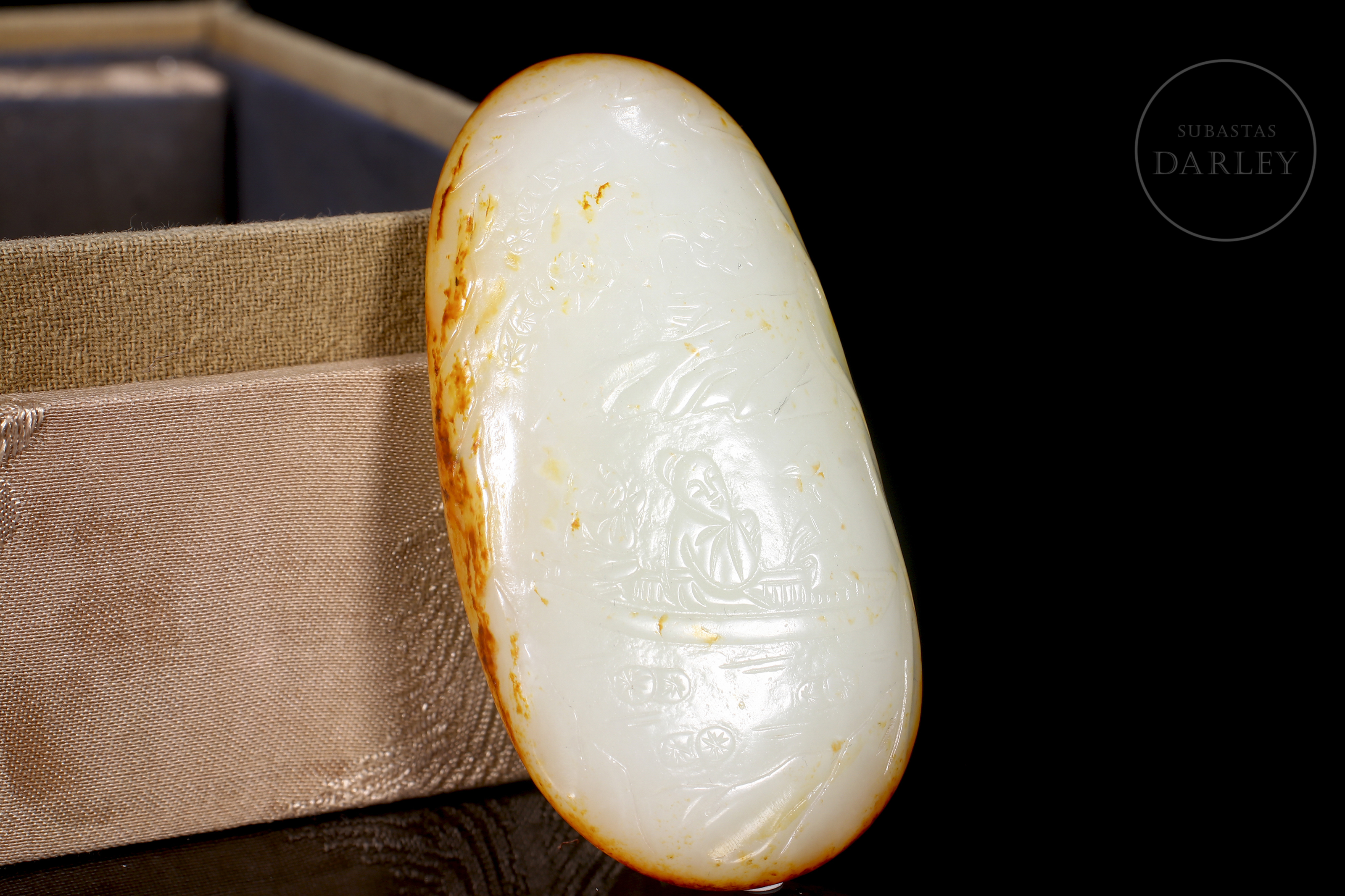 Jade de una tonalidad blanca con áreas de tonalidad rojiza que se extienden por la superficie, fruto de una pátina de oxidación natural. La pieza posee un formato de roca irregular de bordes redondeados. Se muestra decorada en el anverso con una escena de paisaje, con un anciano navegando en un lago. El reverso muestra una inscripción en relieve. Se acompaña de una peana y una caja a medida, ambas forradas con tejidos tradicionales. Dinastía Qing (1644–1911).