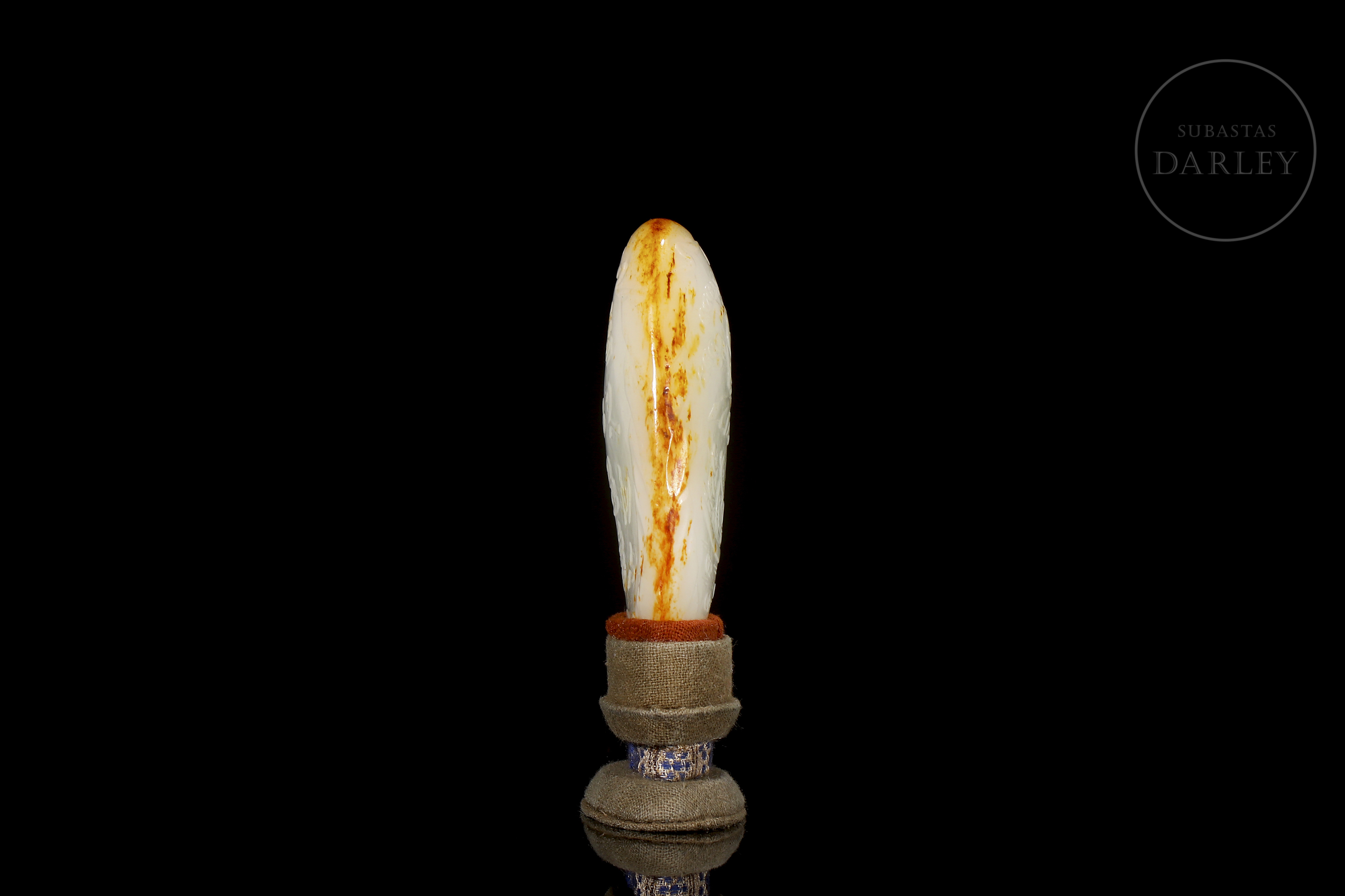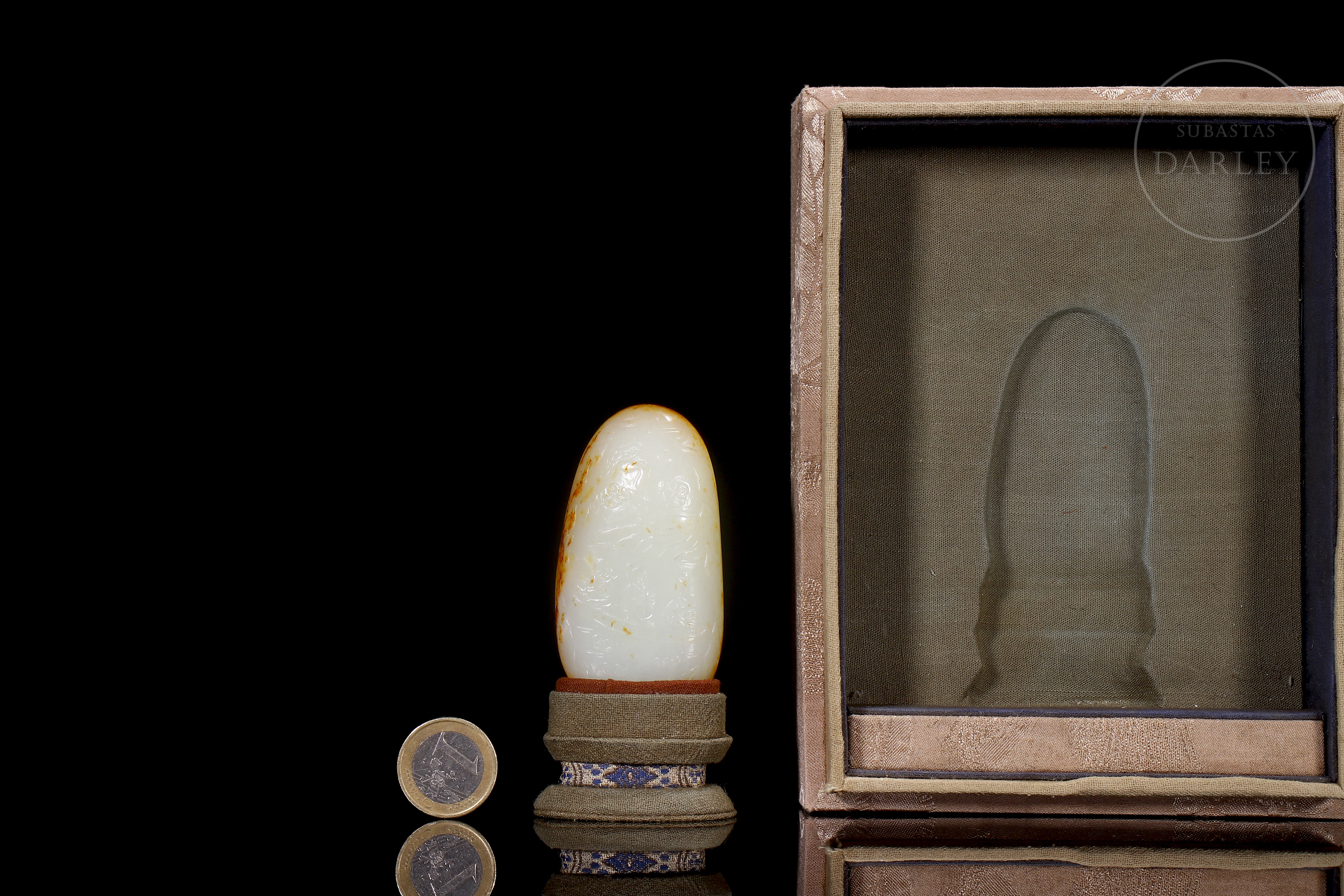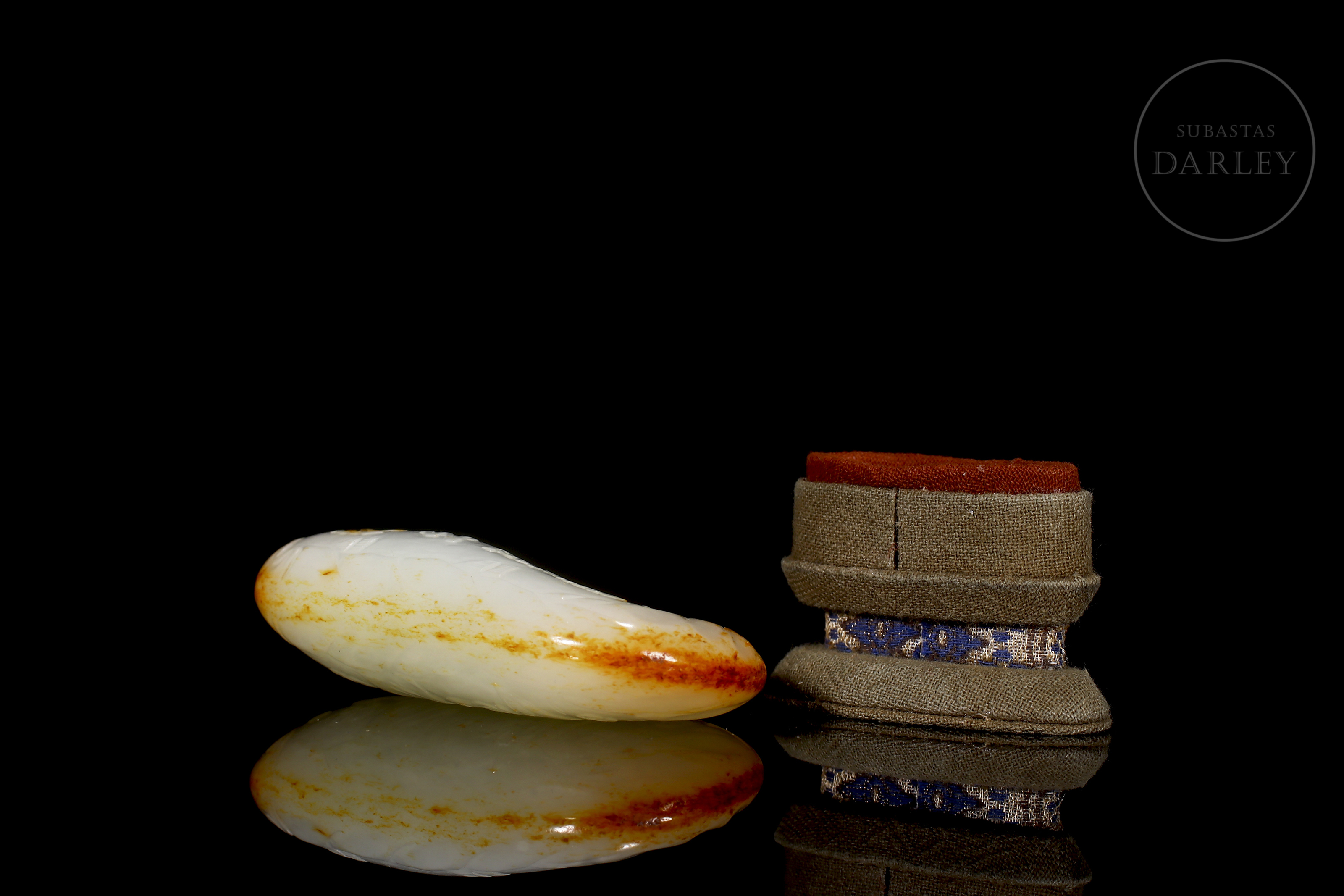 Jade de una tonalidad blanca con áreas de tonalidad rojiza que se extienden por la superficie, fruto de una pátina de oxidación natural. La pieza posee un formato de roca irregular de bordes redondeados. Se muestra decorada en el anverso con una escena de paisaje, con un anciano navegando en un lago. El reverso muestra una inscripción en relieve. Se acompaña de una peana y una caja a medida, ambas forradas con tejidos tradicionales. Dinastía Qing (1644–1911).