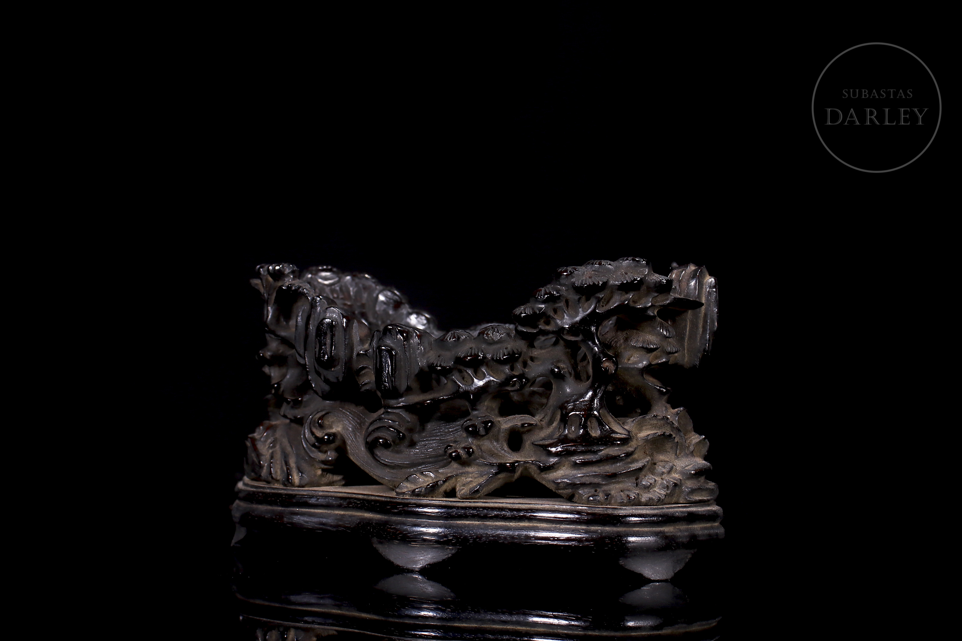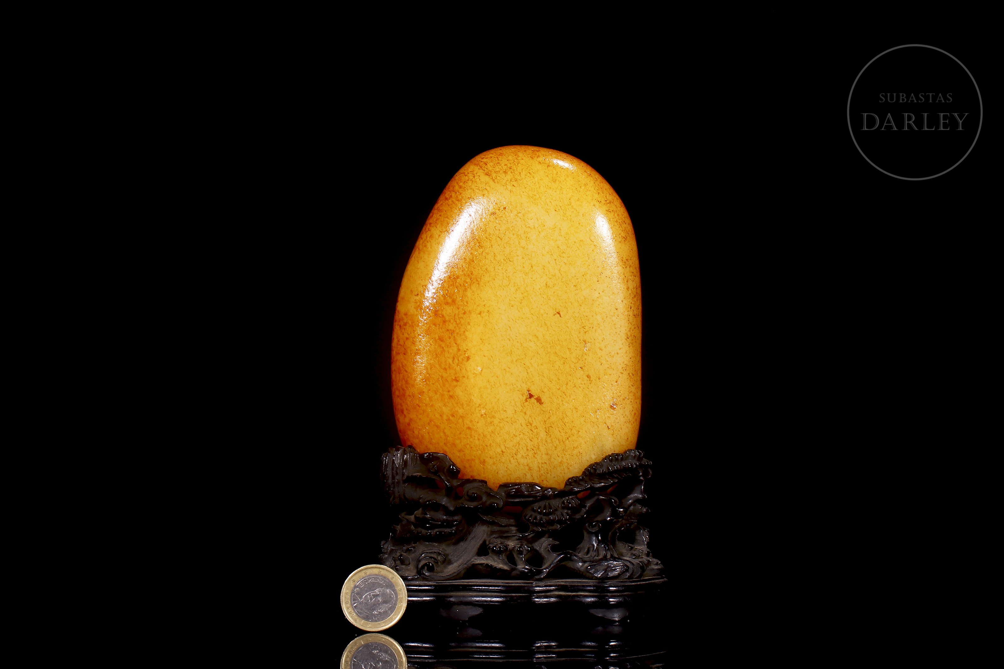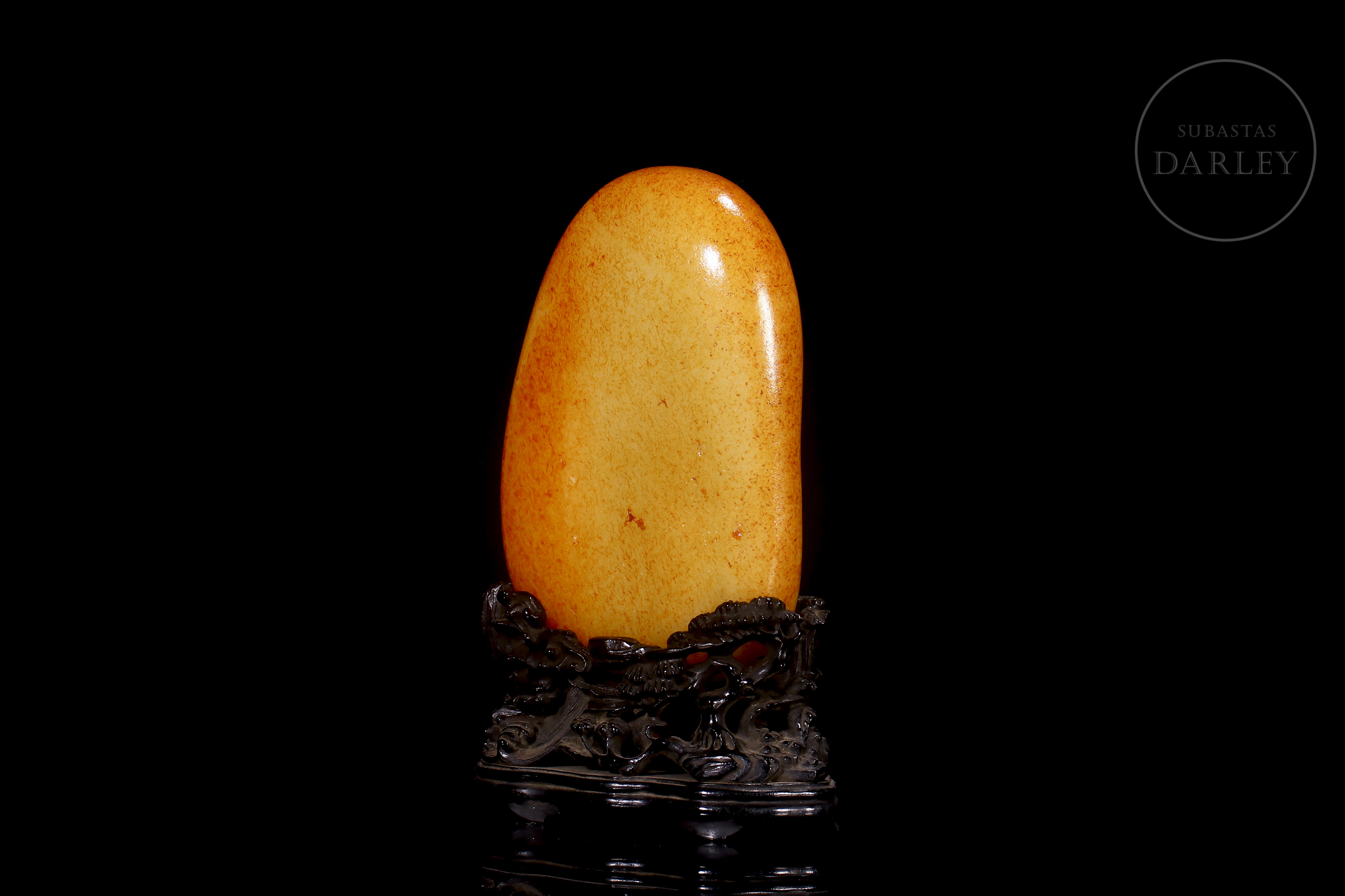 Roca en bruto de jade tallado, de tonalidad blanca, cubierta con atractivas costras de pátina de oxidación natural en tonos ocre, miel y rojizo. La pieza presenta un formato de roca orgánica, de morfología irregular con bordes suavizados y redondeados. Descansa sobre una peana de oscura madera tallada a medida, cuya forma calada imita raíces, rocas, frondosos árboles y olas sinuosas. Dinastía Qing (1644–1911).