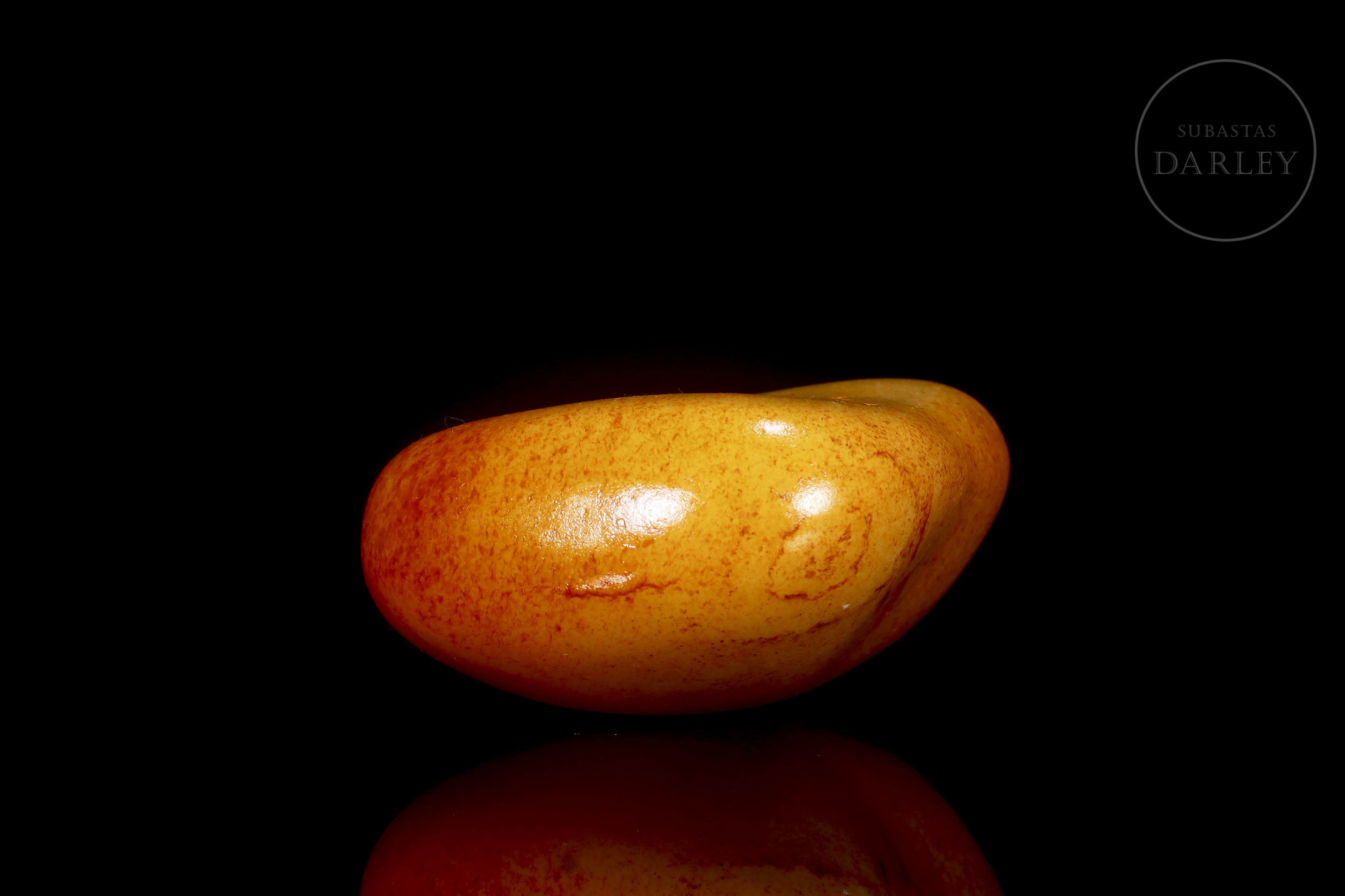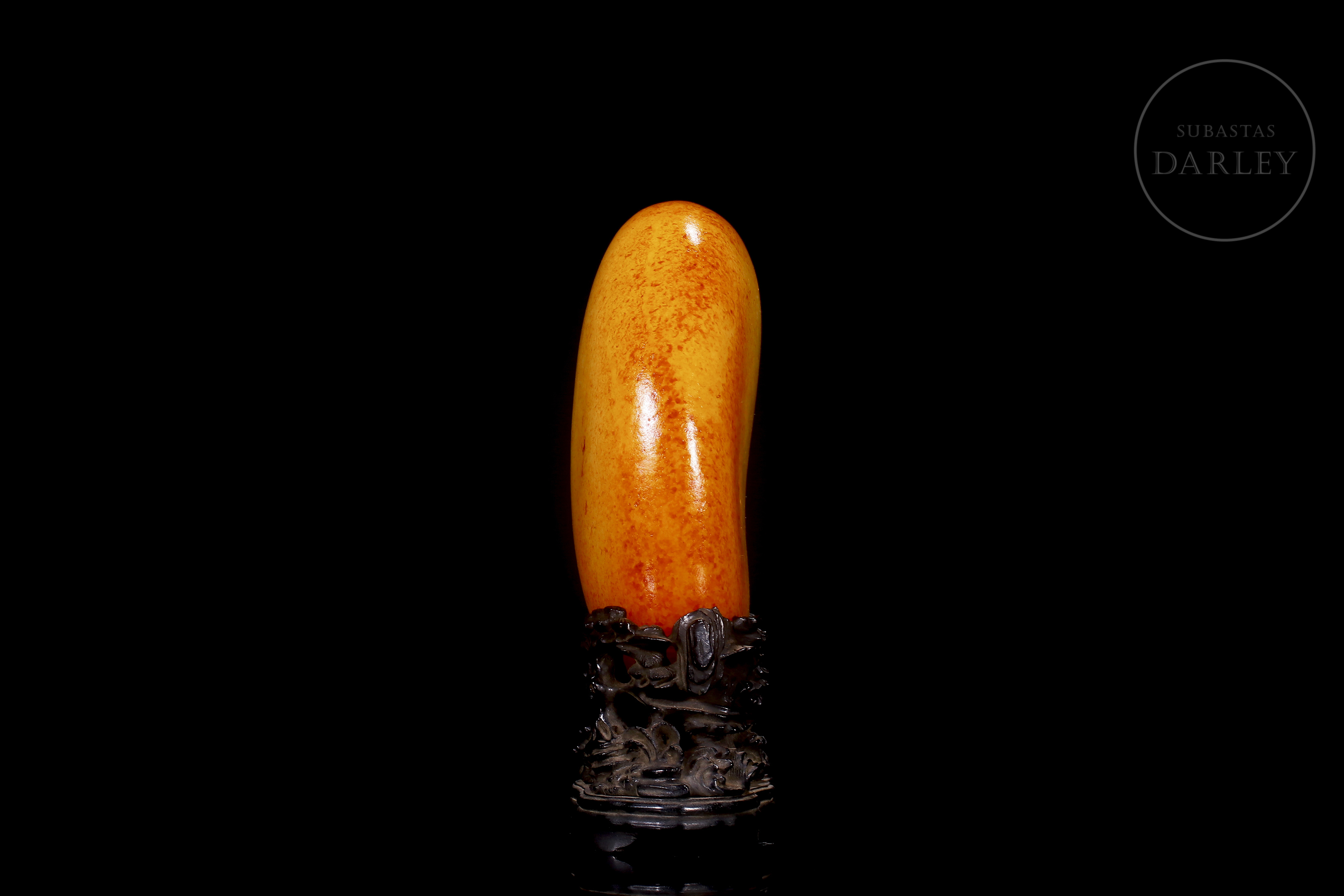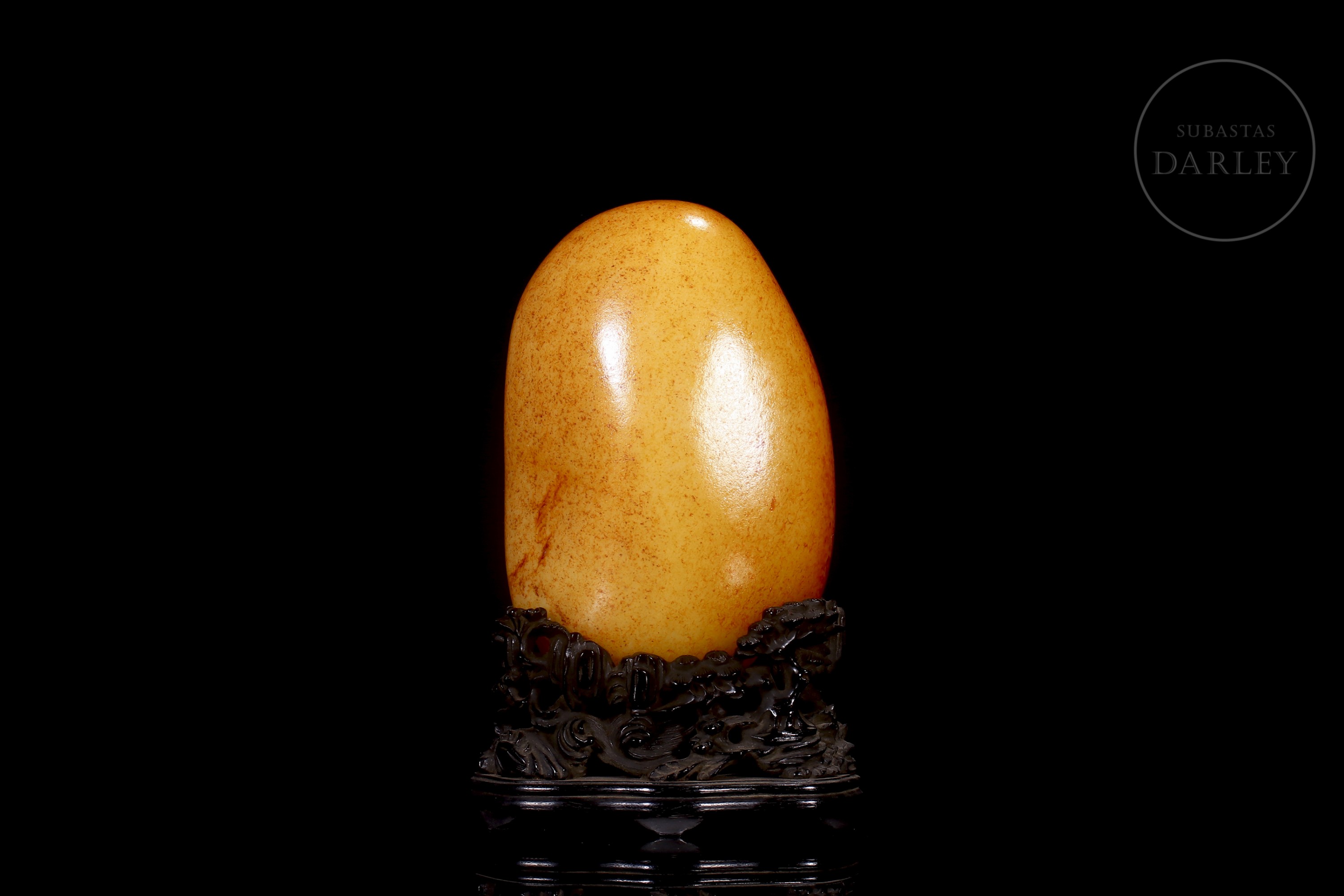 Roca en bruto de jade tallado, de tonalidad blanca, cubierta con atractivas costras de pátina de oxidación natural en tonos ocre, miel y rojizo. La pieza presenta un formato de roca orgánica, de morfología irregular con bordes suavizados y redondeados. Descansa sobre una peana de oscura madera tallada a medida, cuya forma calada imita raíces, rocas, frondosos árboles y olas sinuosas. Dinastía Qing (1644–1911).