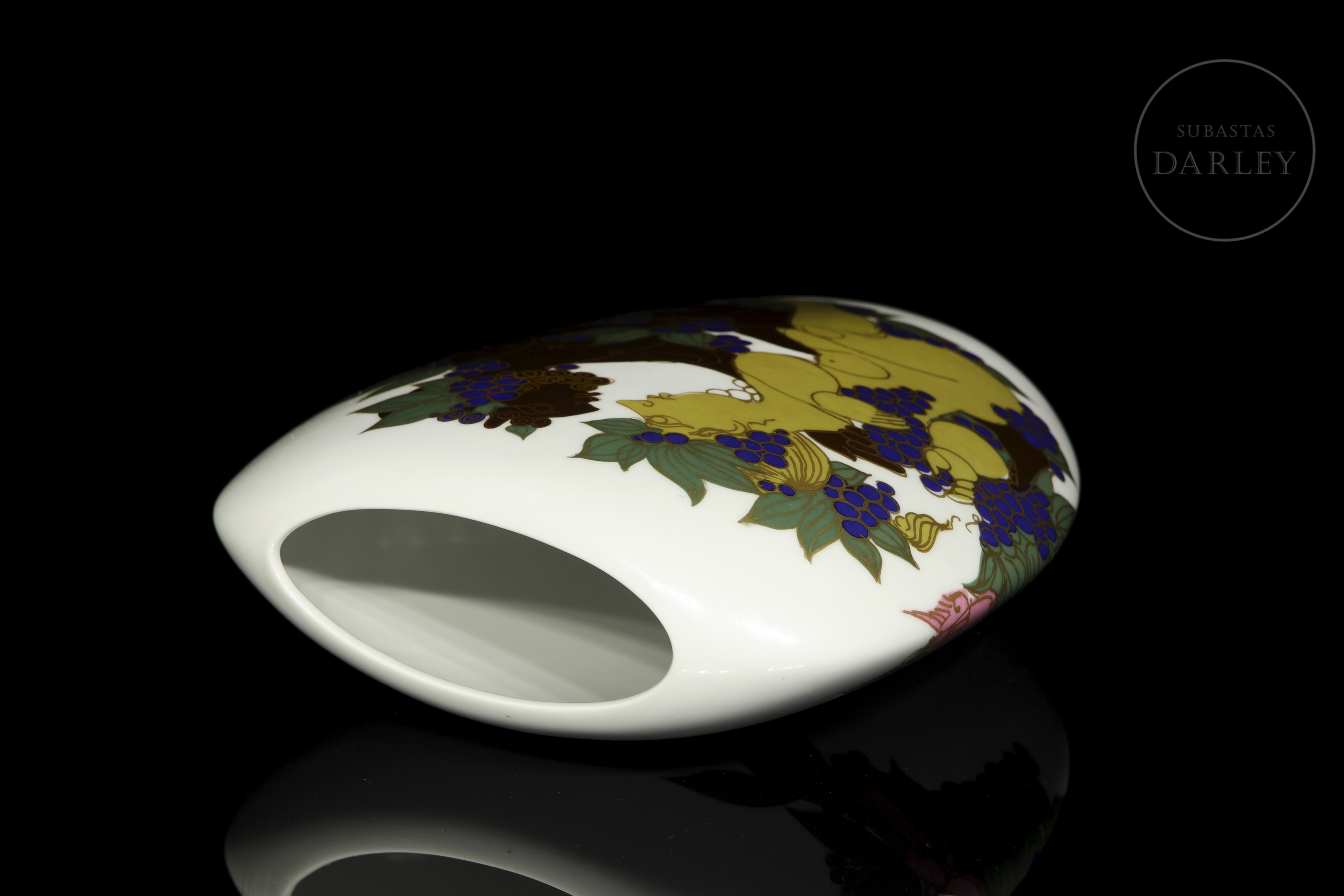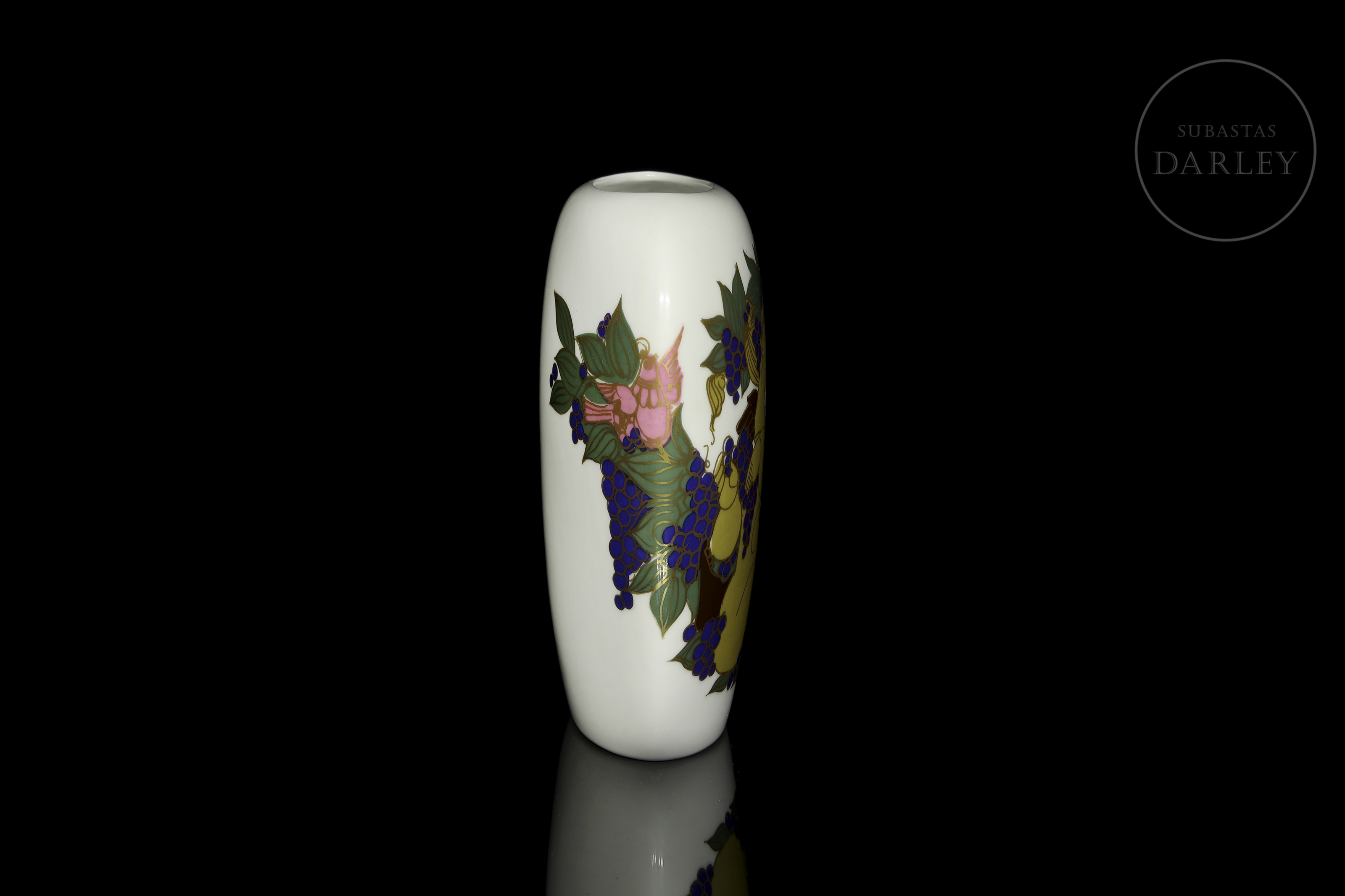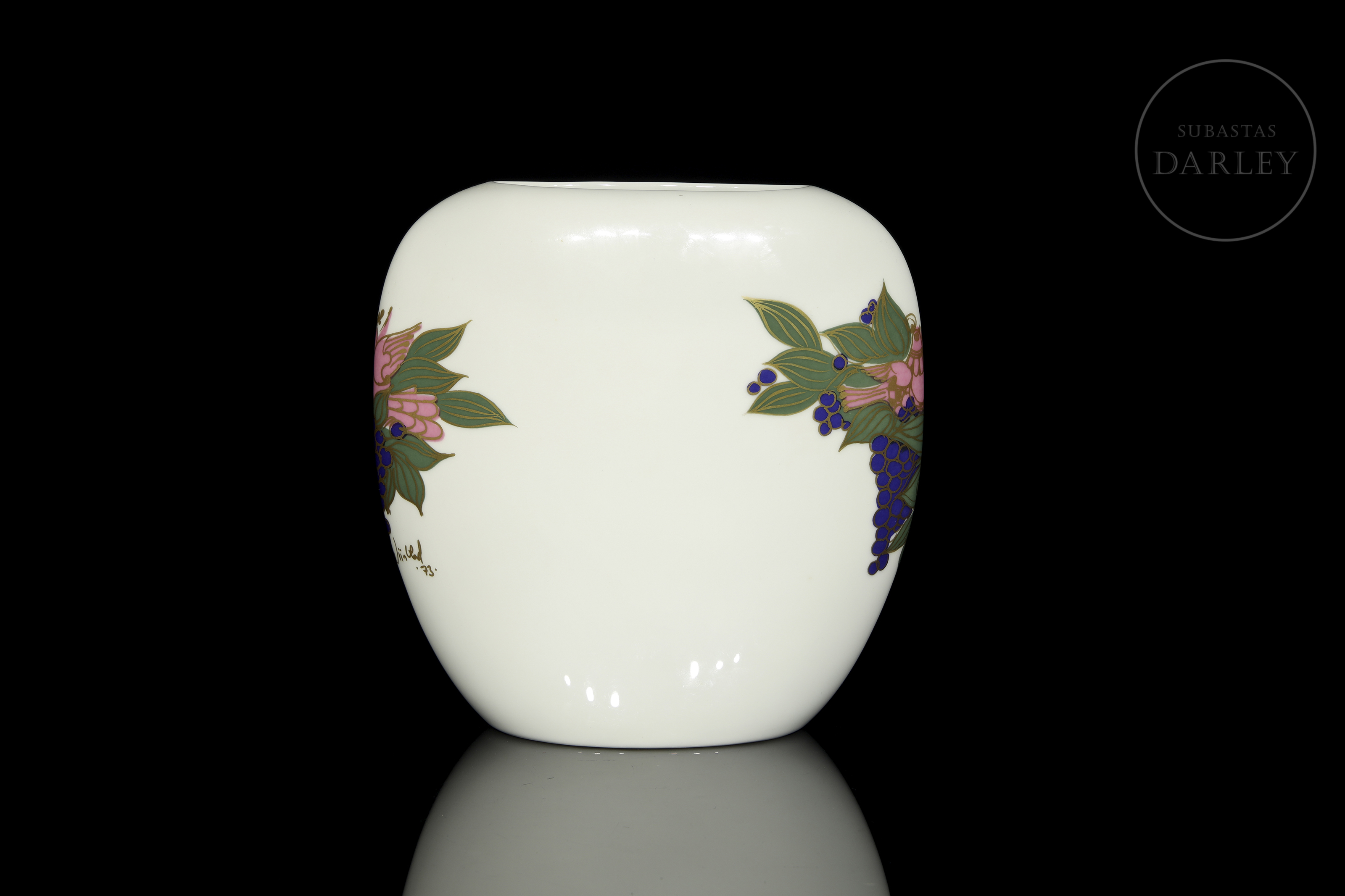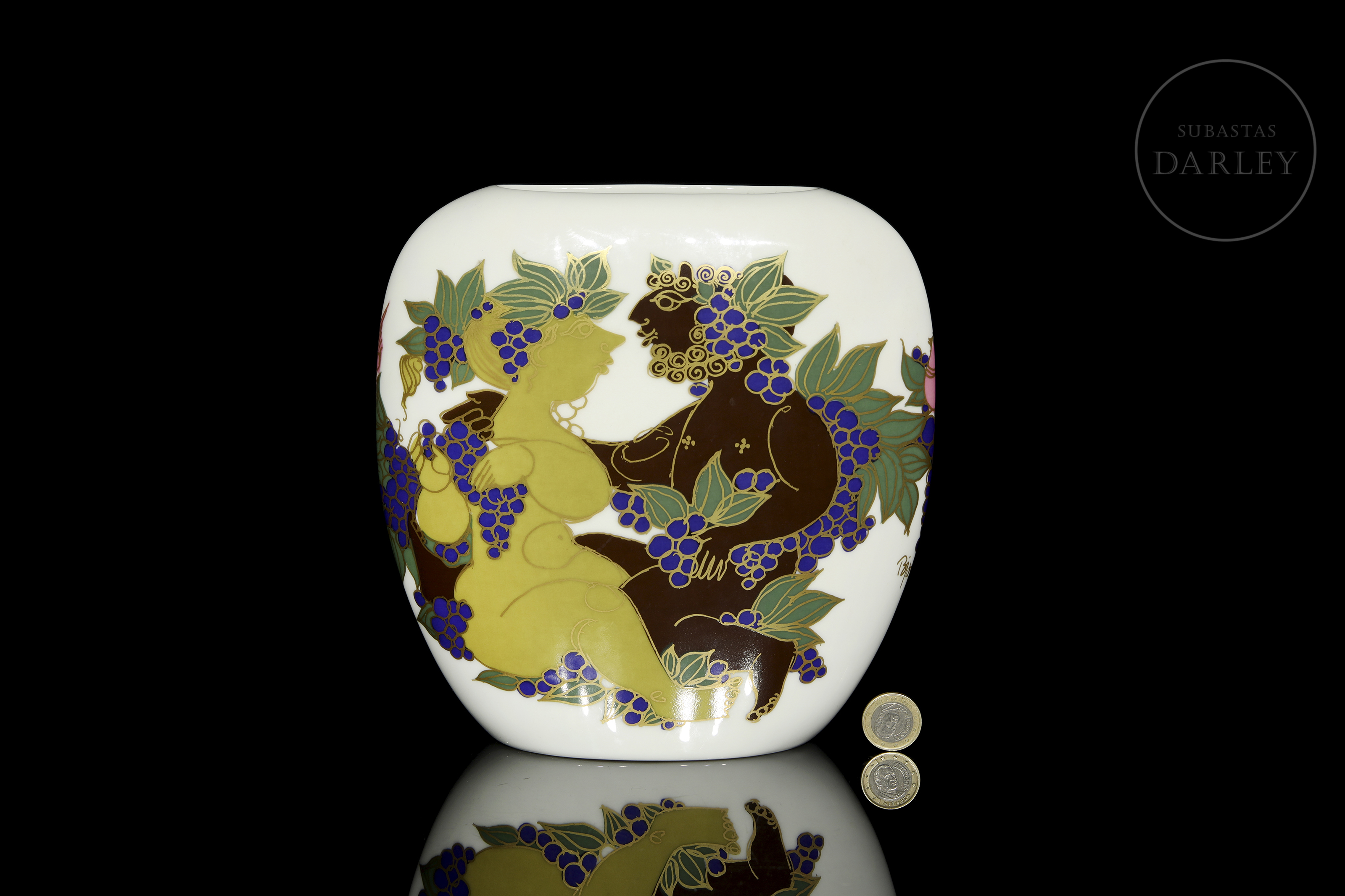 Jarrón de porcelana de la serie "Studio-Linie" con forma ovoide aplanada. Presenta una decoración que muestra personajes mitológicos rodeados de motivos de vid y pájaros con un detallado perfilado en oro. Firmado y fechado "Björn Wiinblad, 73" en el lateral y sellado en la base.