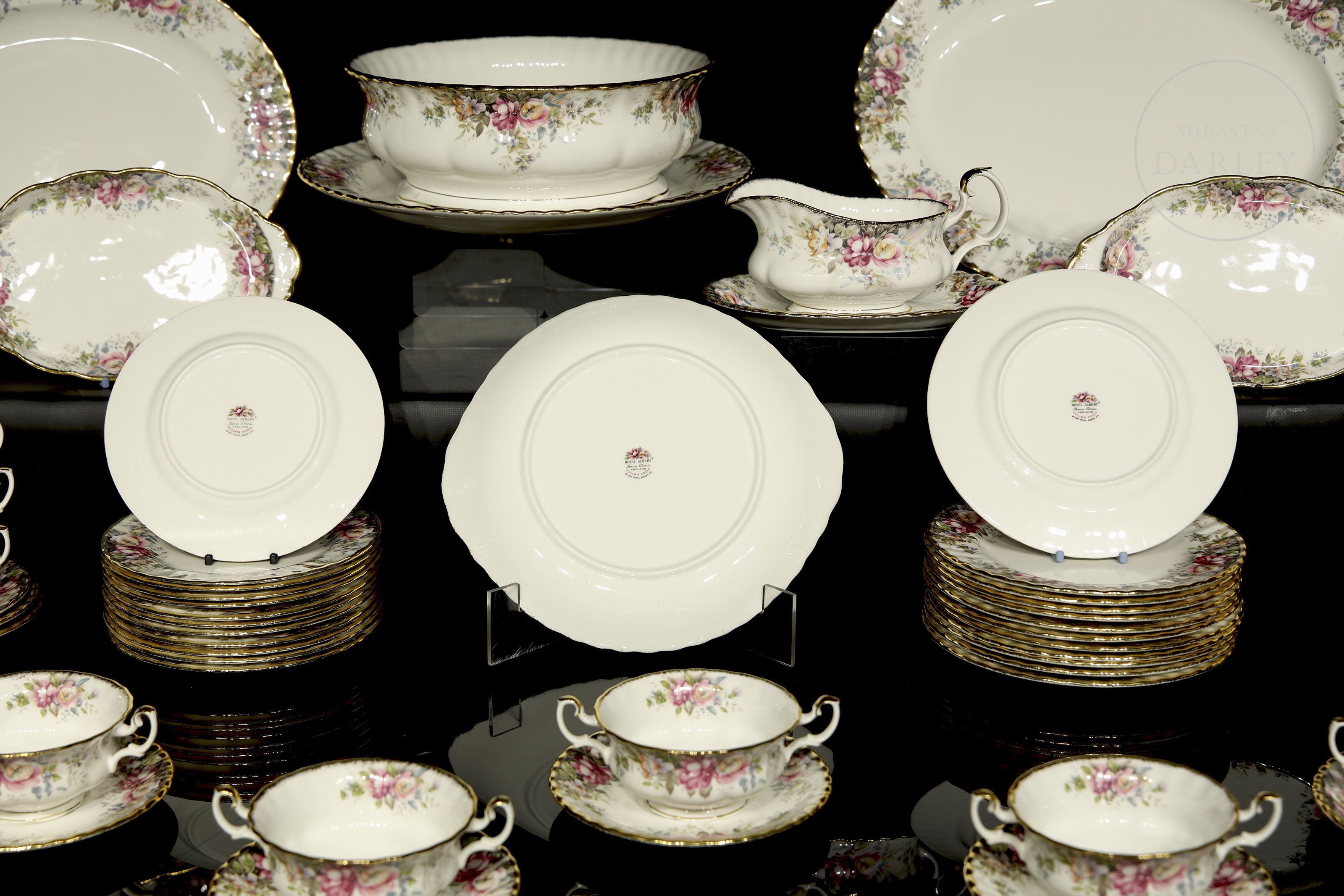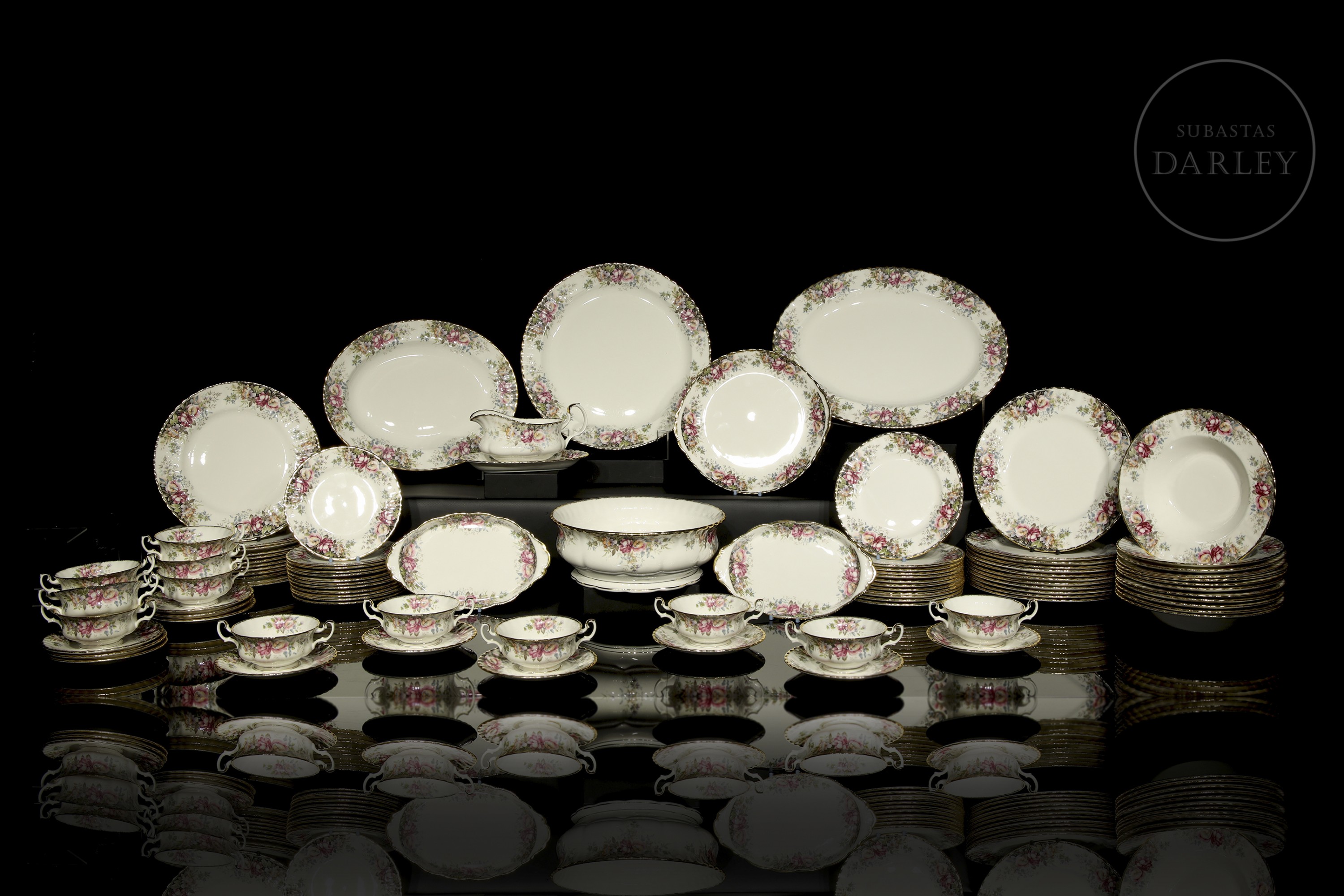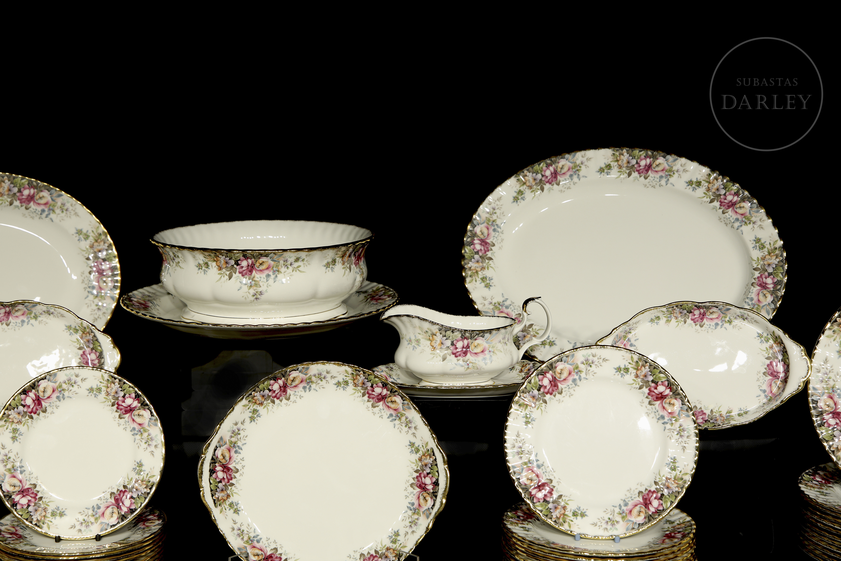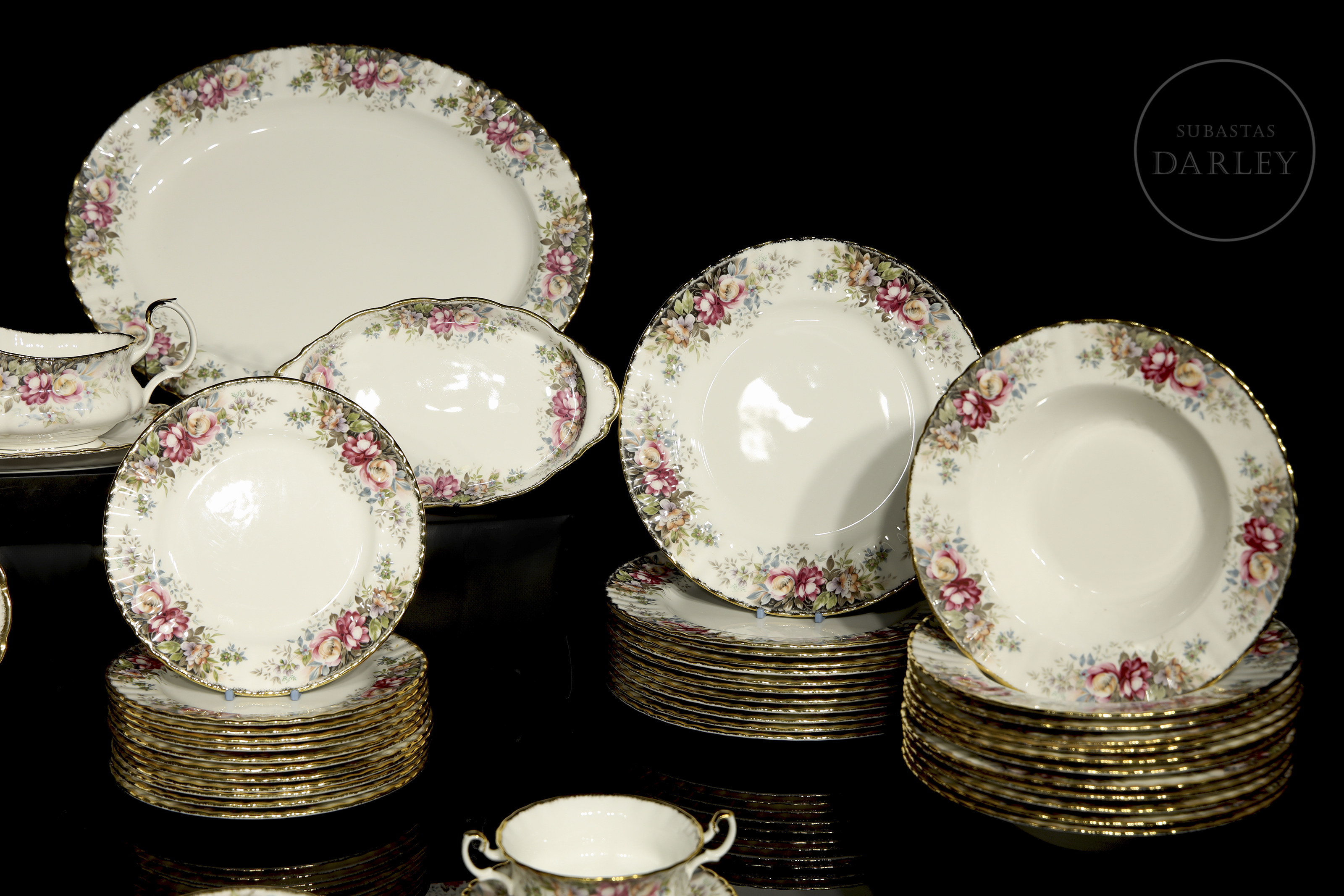 Servicio de mesa realizado en porcelana inglesa. Presenta el modelo "Autumn Roses", decorado con profusos ramilletes de rosas en tonos rosados y malvas, follaje otoñal y bordes ondulados con acabado en oro. Compuesto por: platos llanos (24), platos hondos (12), platos de pan (12), platos de postre (12), cuencos de consomé con plato (12), bandejas (6), ensaladera, salsera. Con sello de fabricación en la base.