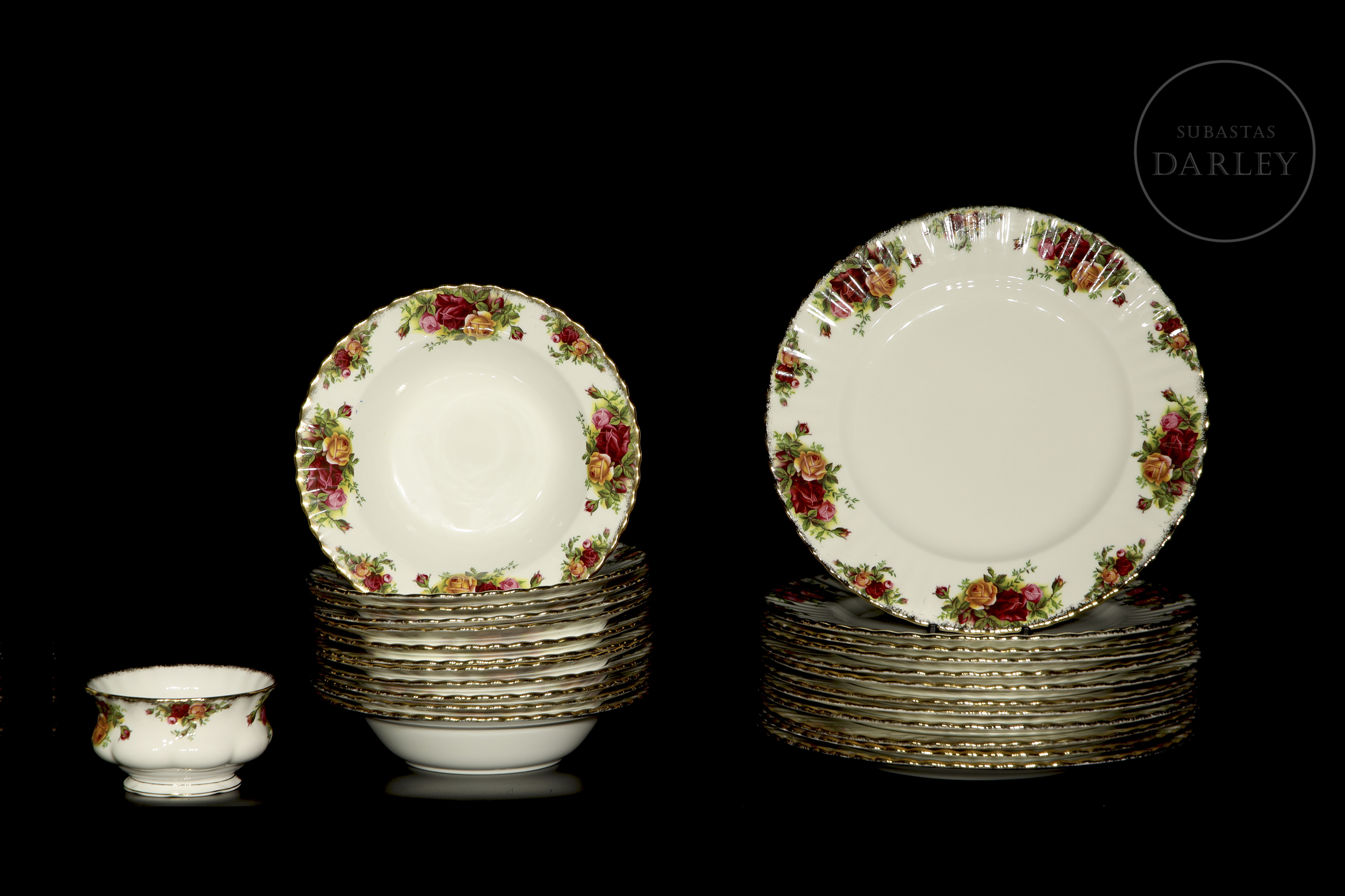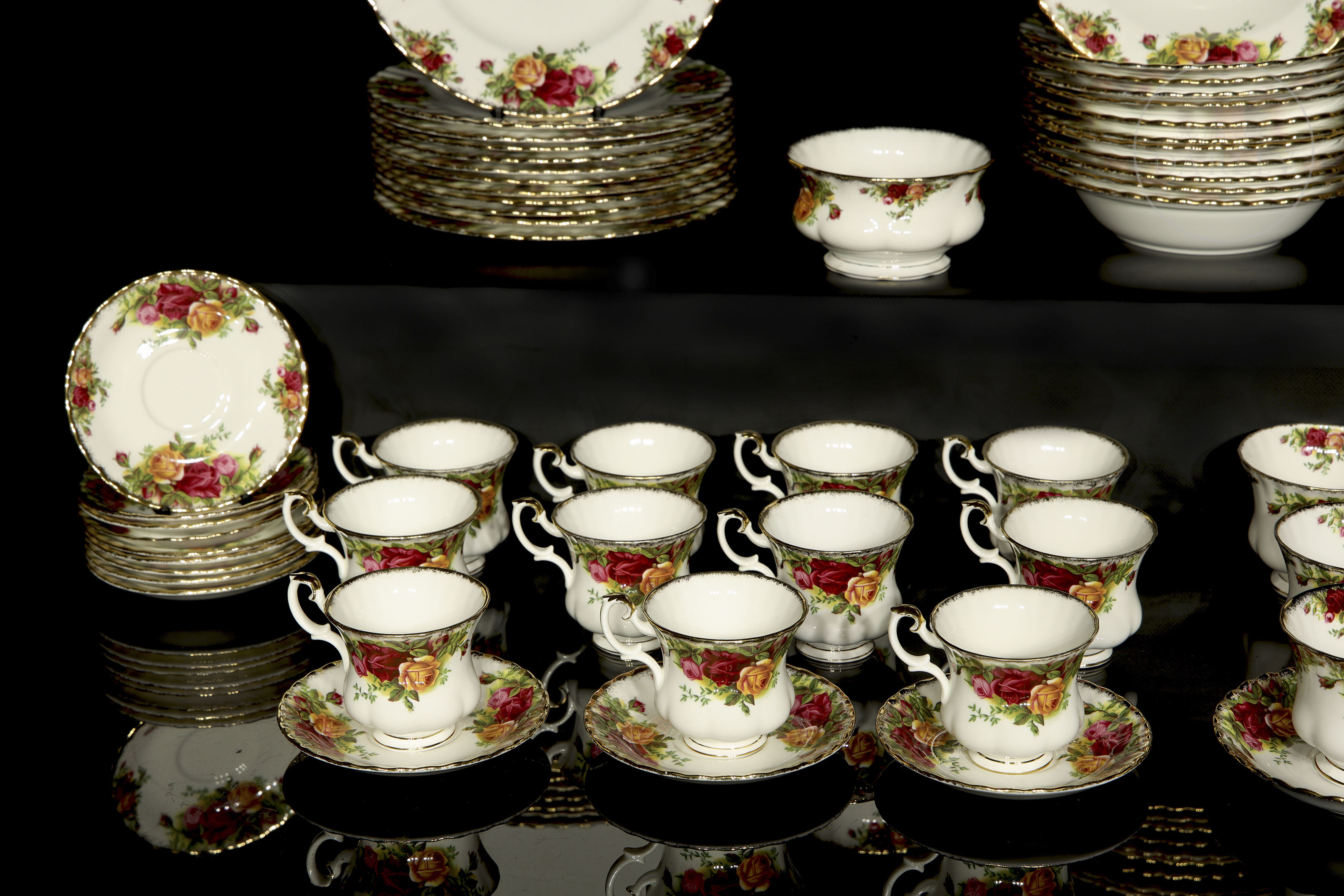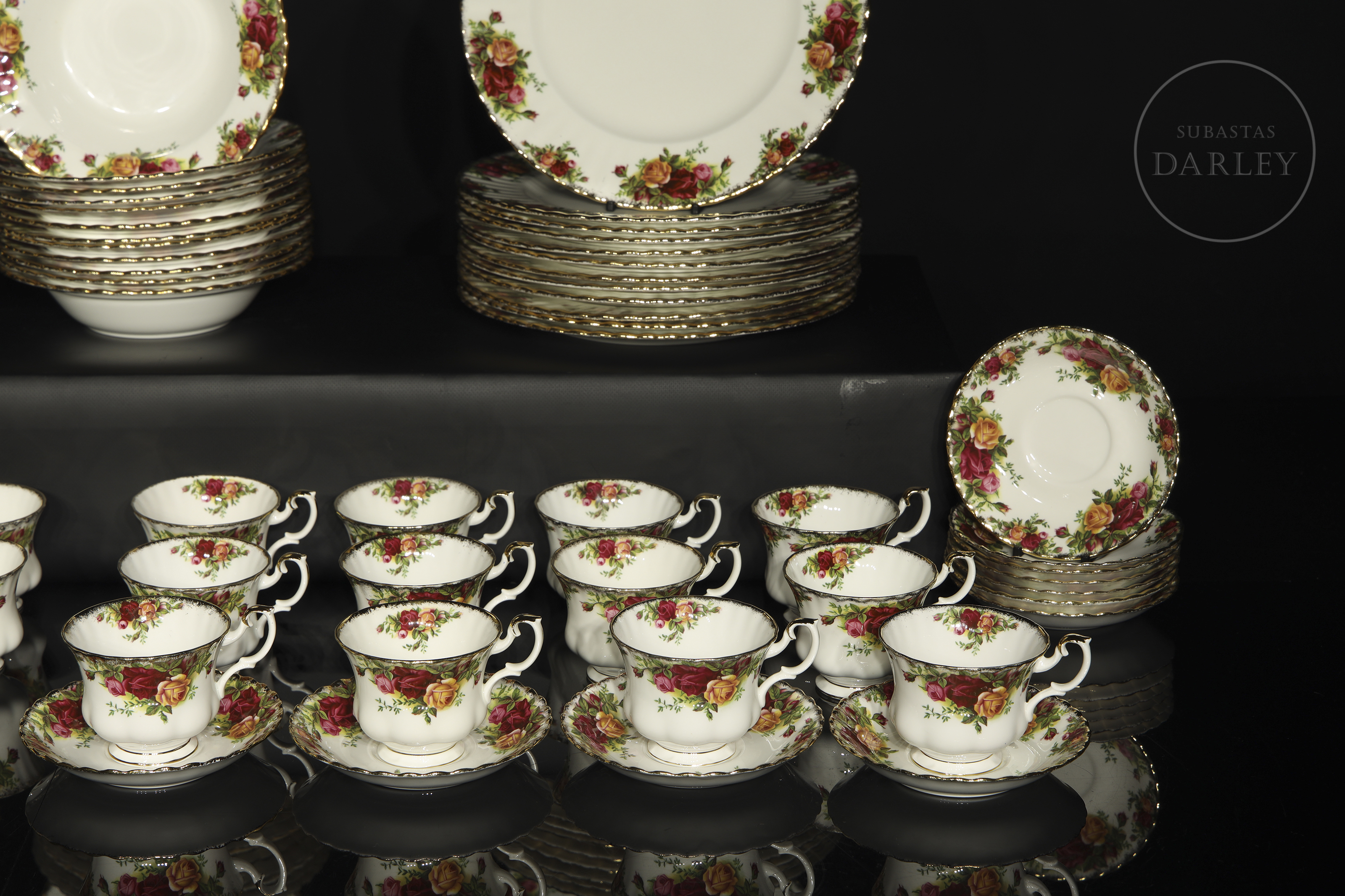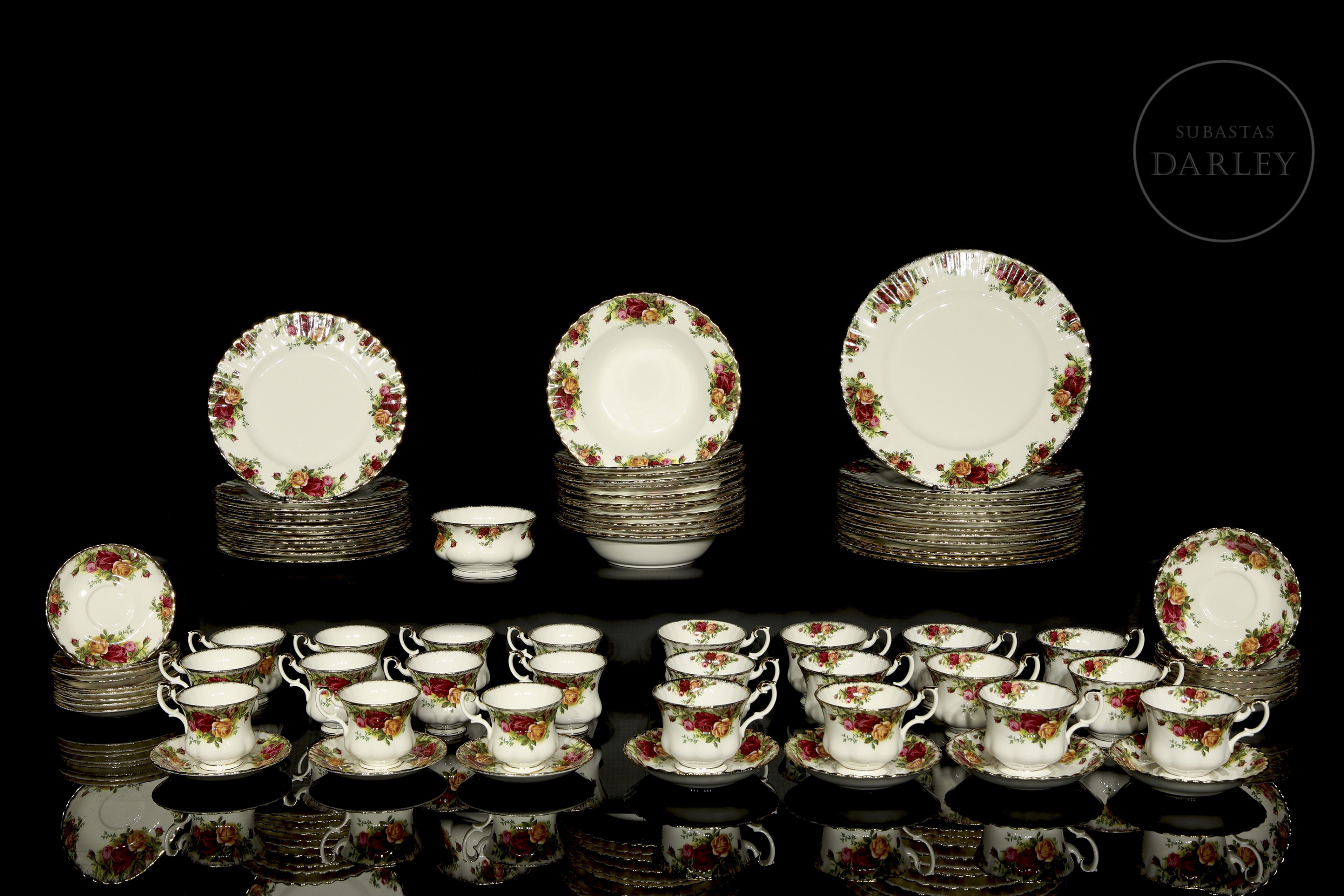 Extenso servicio de mesa, té y café realizado en porcelana de alta calidad con el icónico diseño "Old Country Roses". Presenta una profusa decoración floral de rosas en tonos rojos, rosados y amarillos con bordes festoneados y remates en oro amarillo. Se compone de 12 platos llanos, 12 platos hondos, 12 platos de té, 12 tazas de té, 12 platos de café, 11 tazas de café y un azucarero.