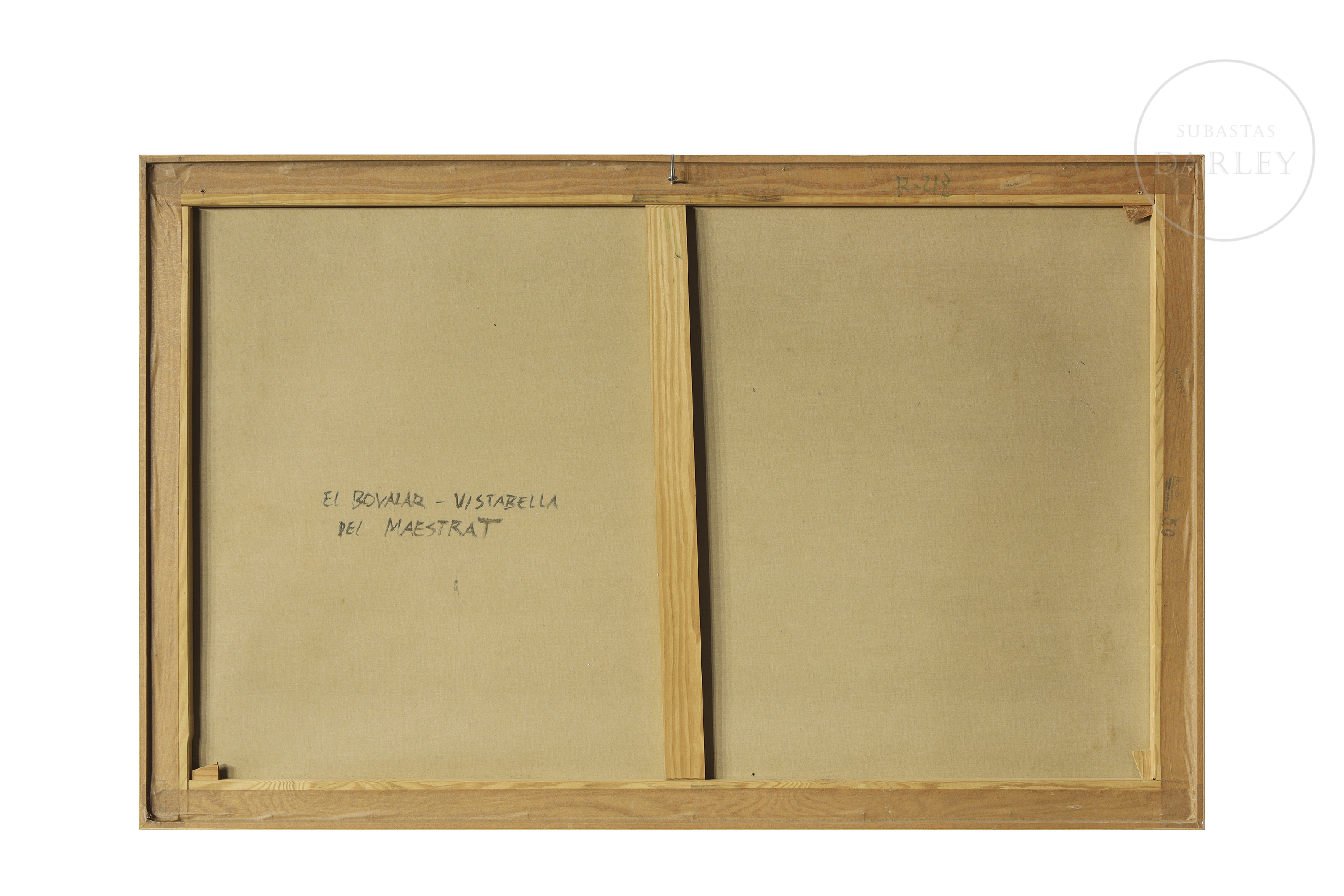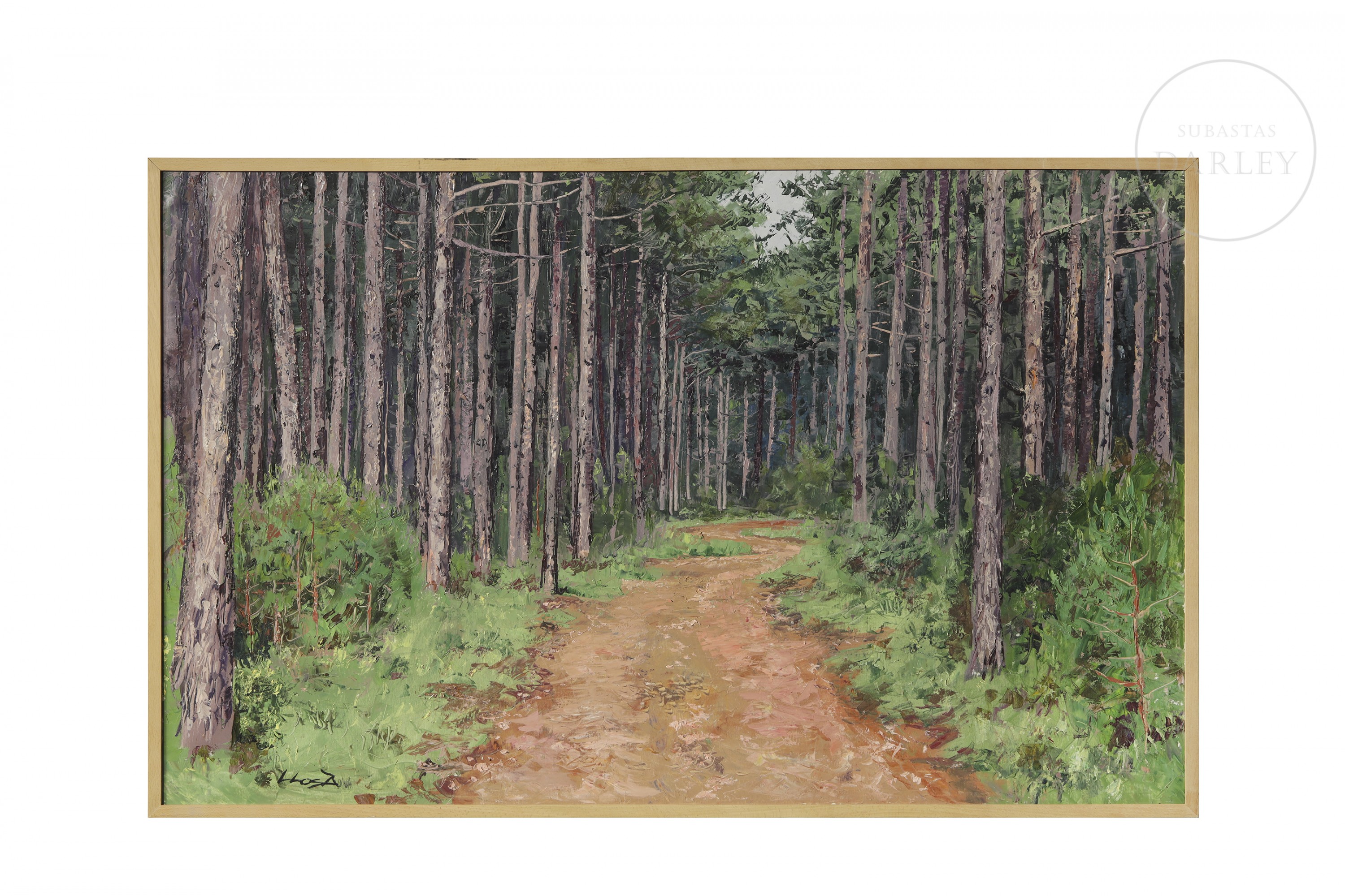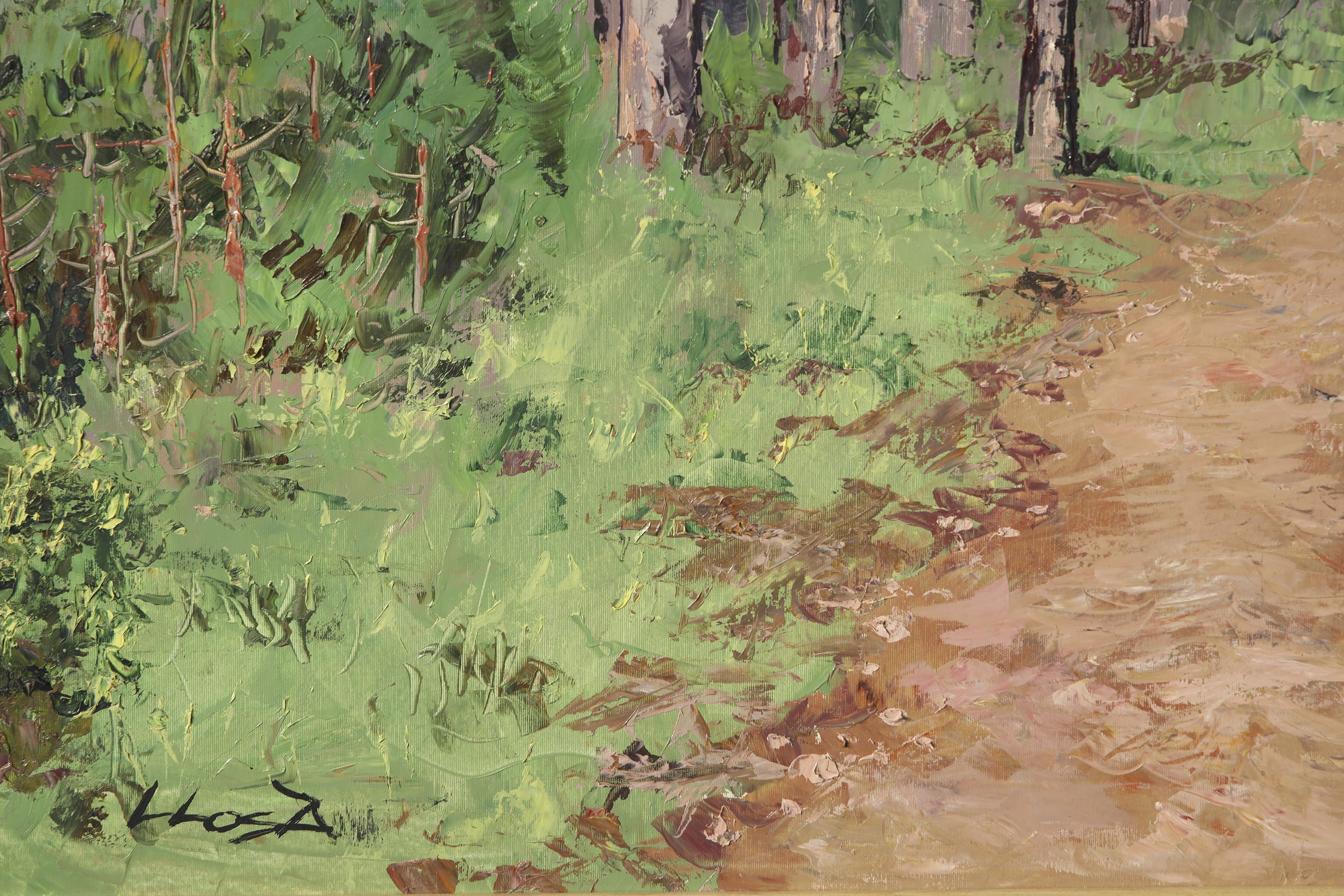 Óleo sobre lienzo. Paisaje forestal que representa un camino de tierra serpenteante atravesando un denso pinar en la zona de "El Bovalar", Vistabella del Maestrat. Firmado "LLOSÀ" en la esquina inferior izquierda. Titulado en el reverso.
