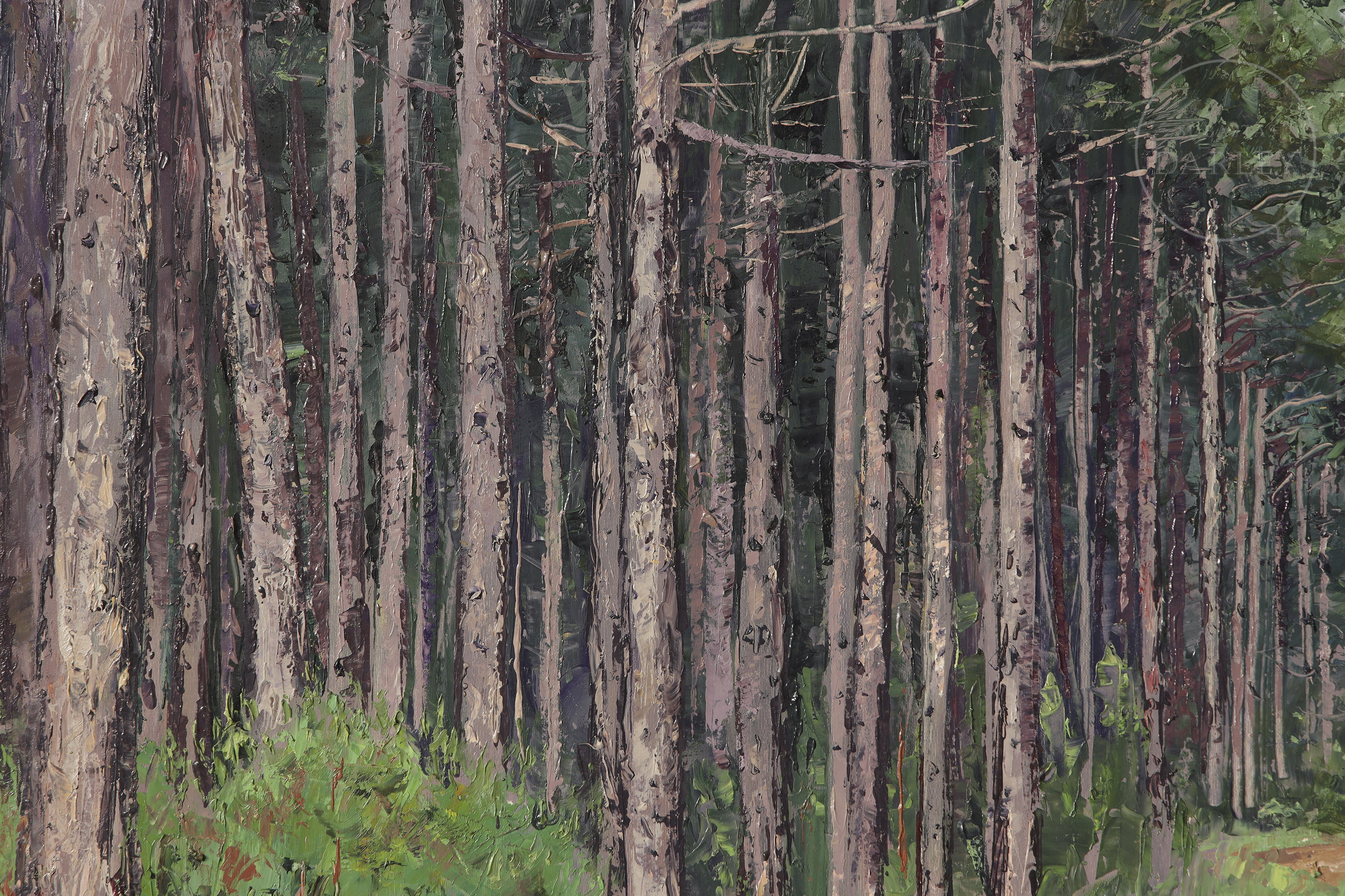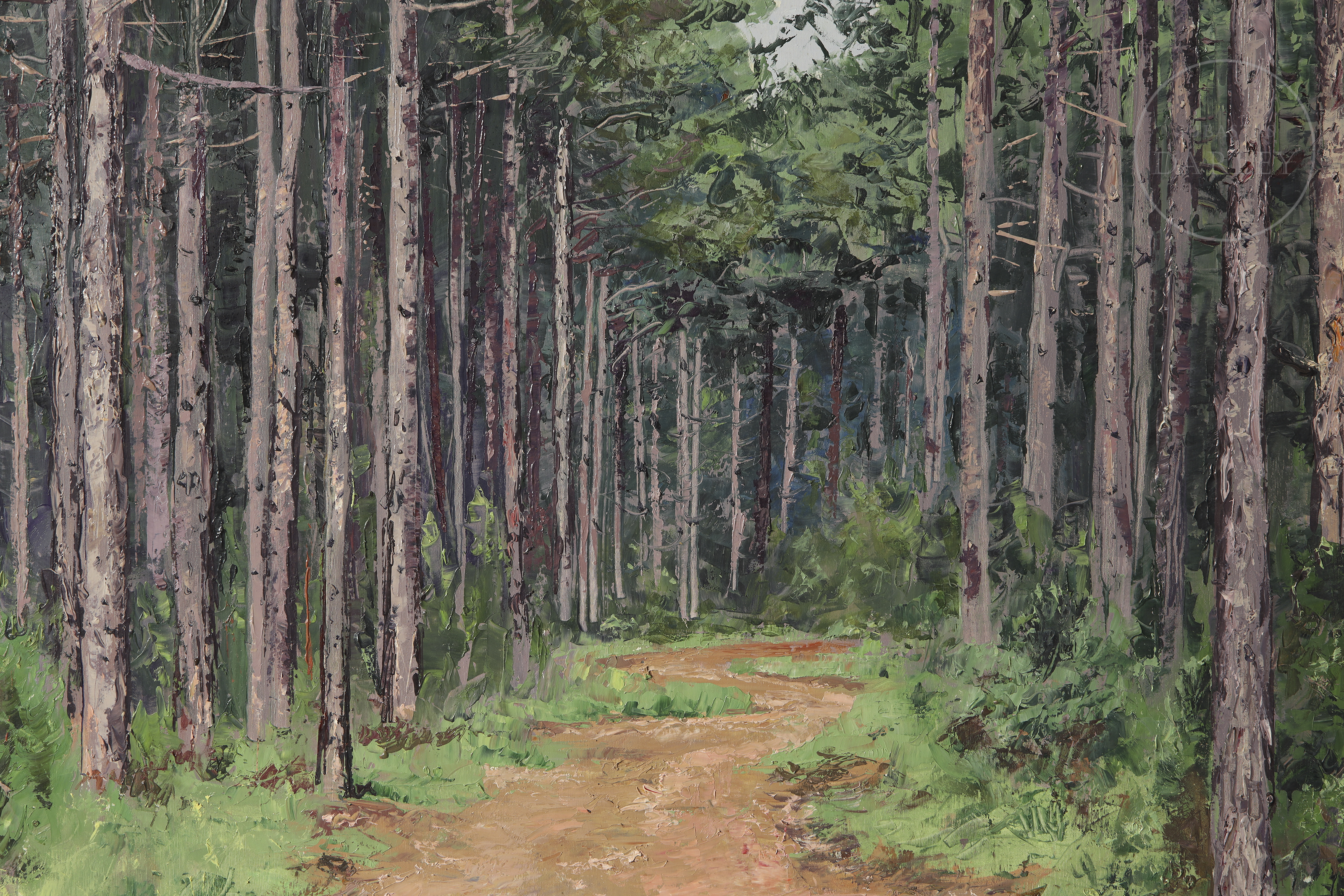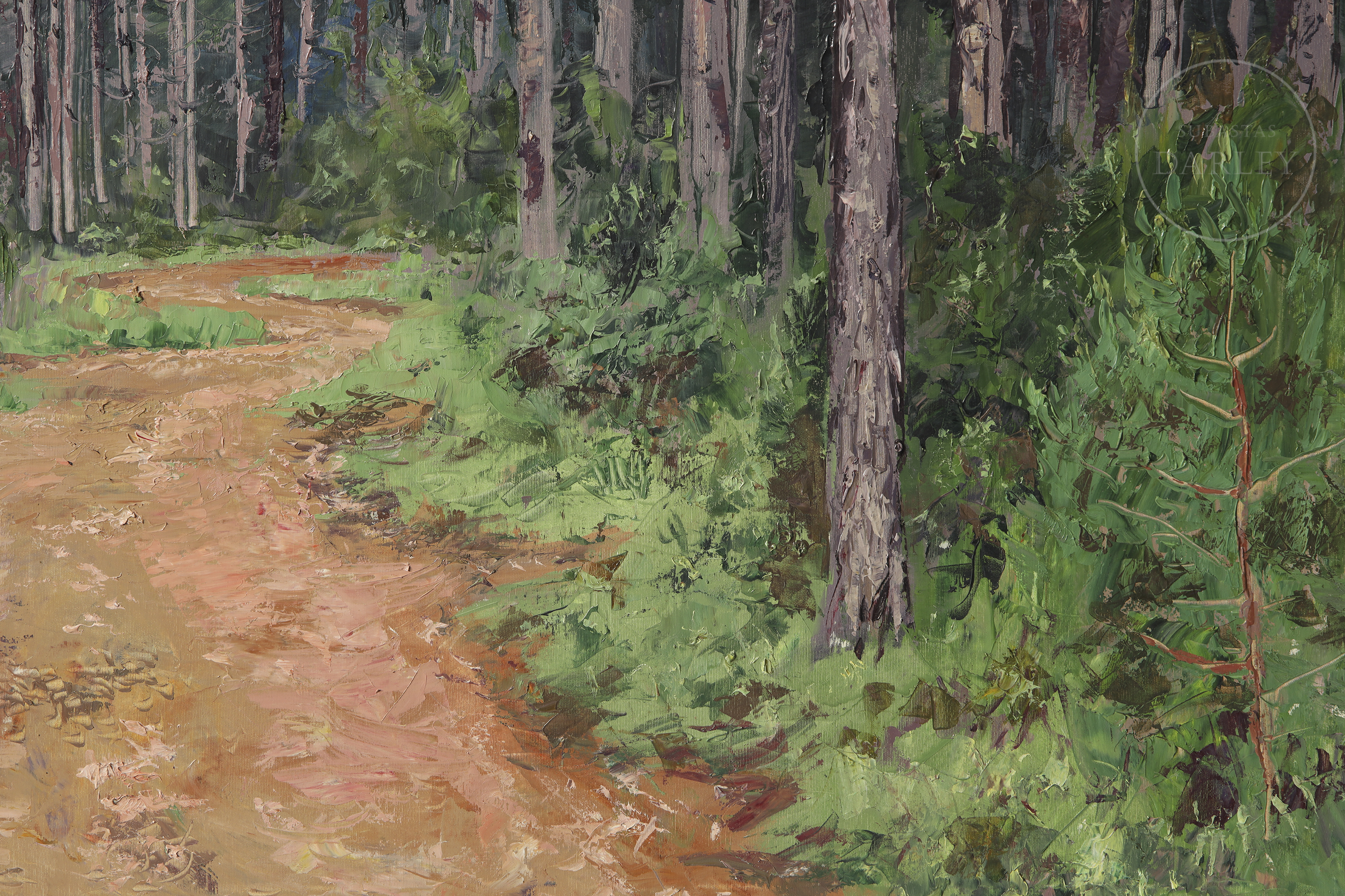 Óleo sobre lienzo. Paisaje forestal que representa un camino de tierra serpenteante atravesando un denso pinar en la zona de "El Bovalar", Vistabella del Maestrat. Firmado "LLOSÀ" en la esquina inferior izquierda. Titulado en el reverso.