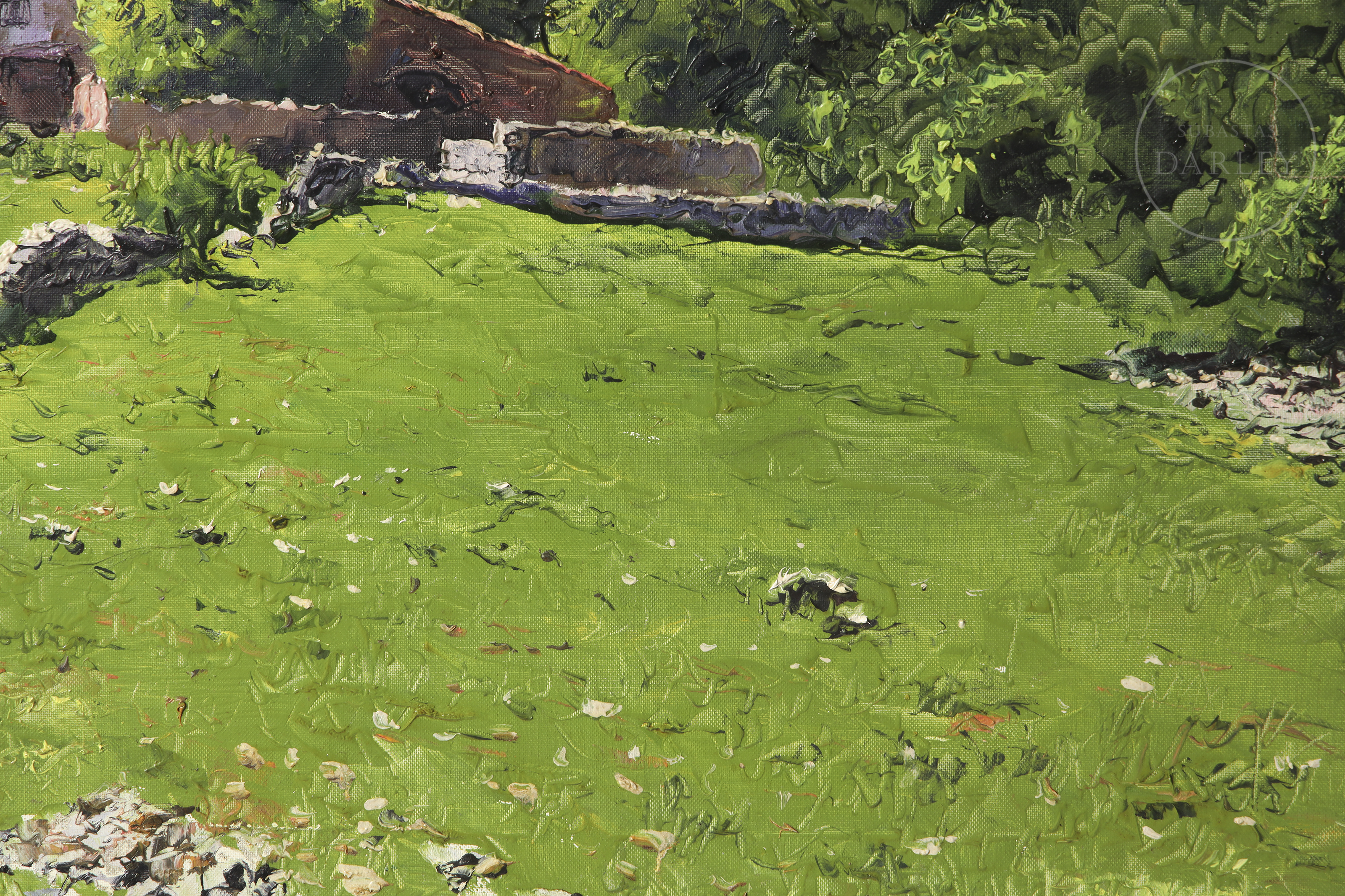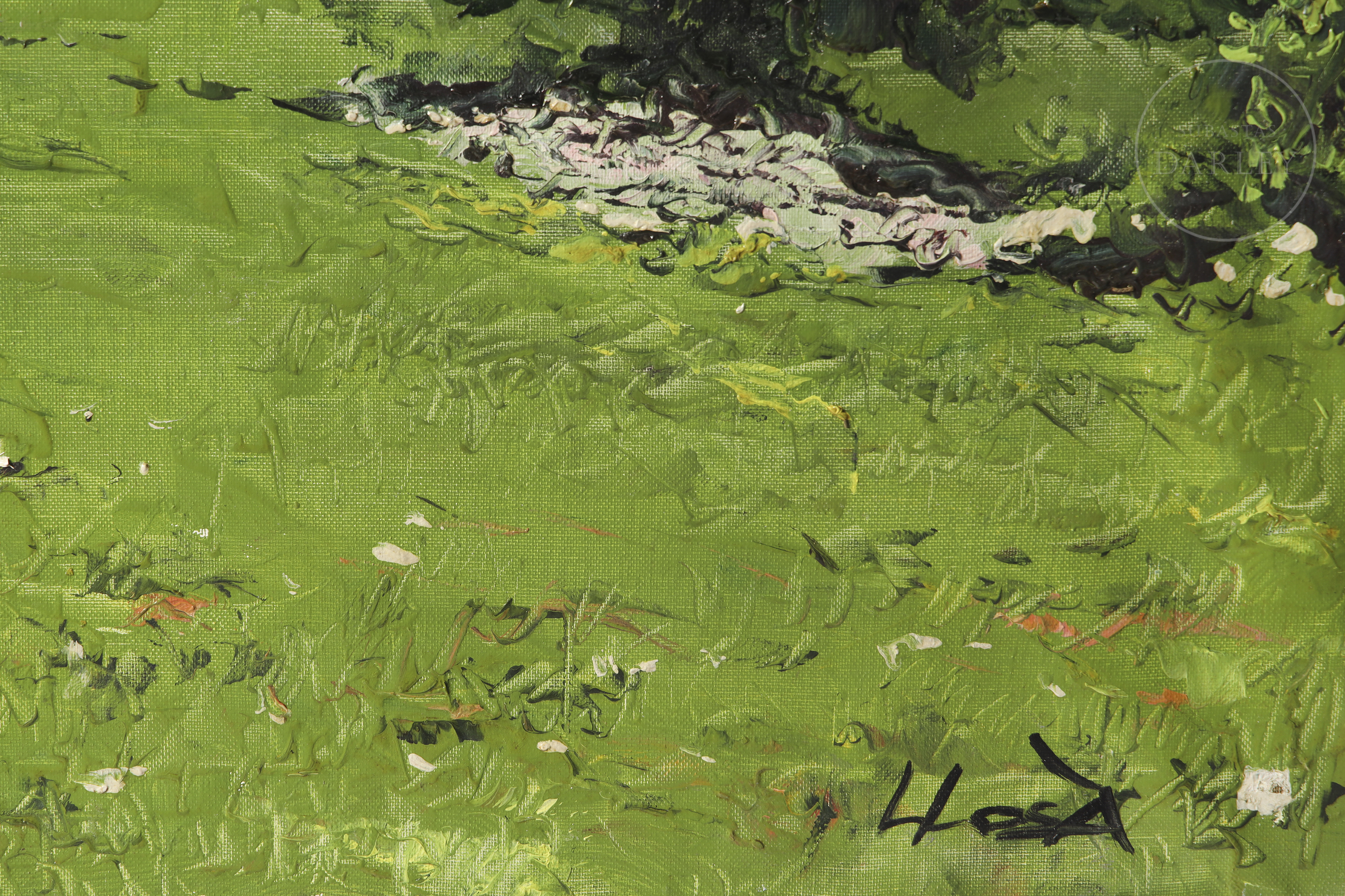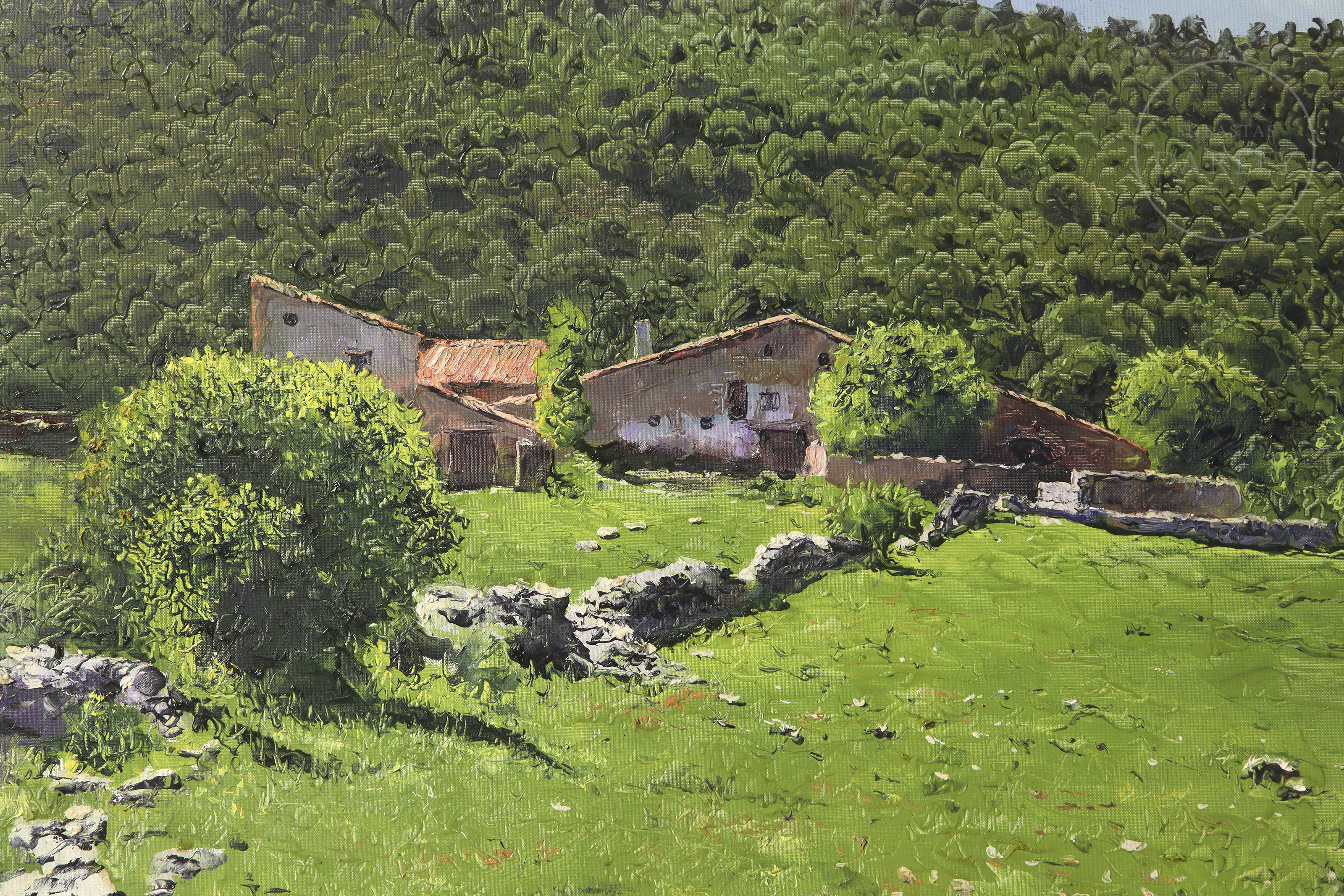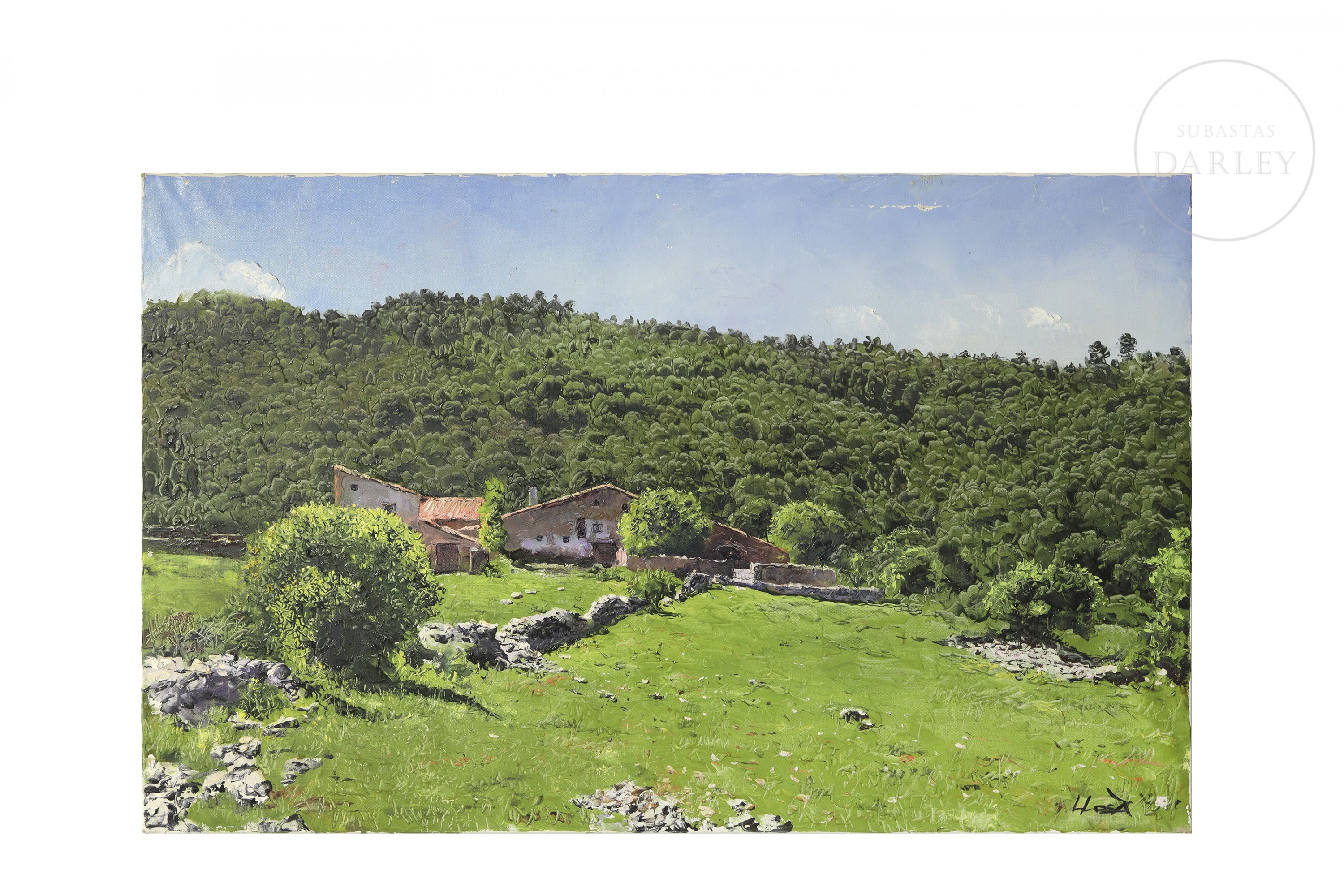 Óleo sobre lienzo. Paisaje que representa una vista rural, con edificaciones tradicionales integradas en una frondosa ladera boscosa. Firmado "LLOSÀ" en la esquina inferior derecha. Titulado en el reverso.