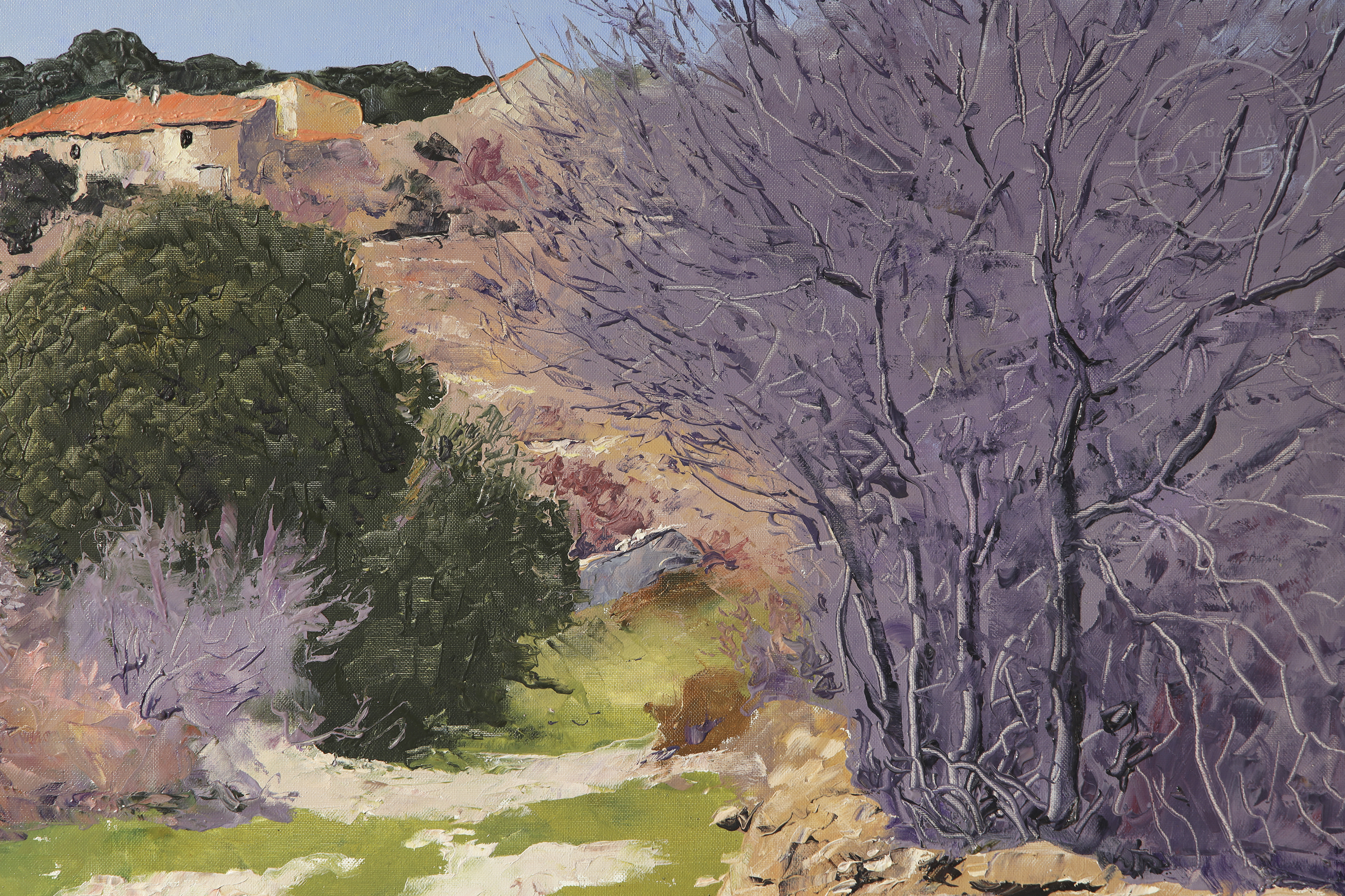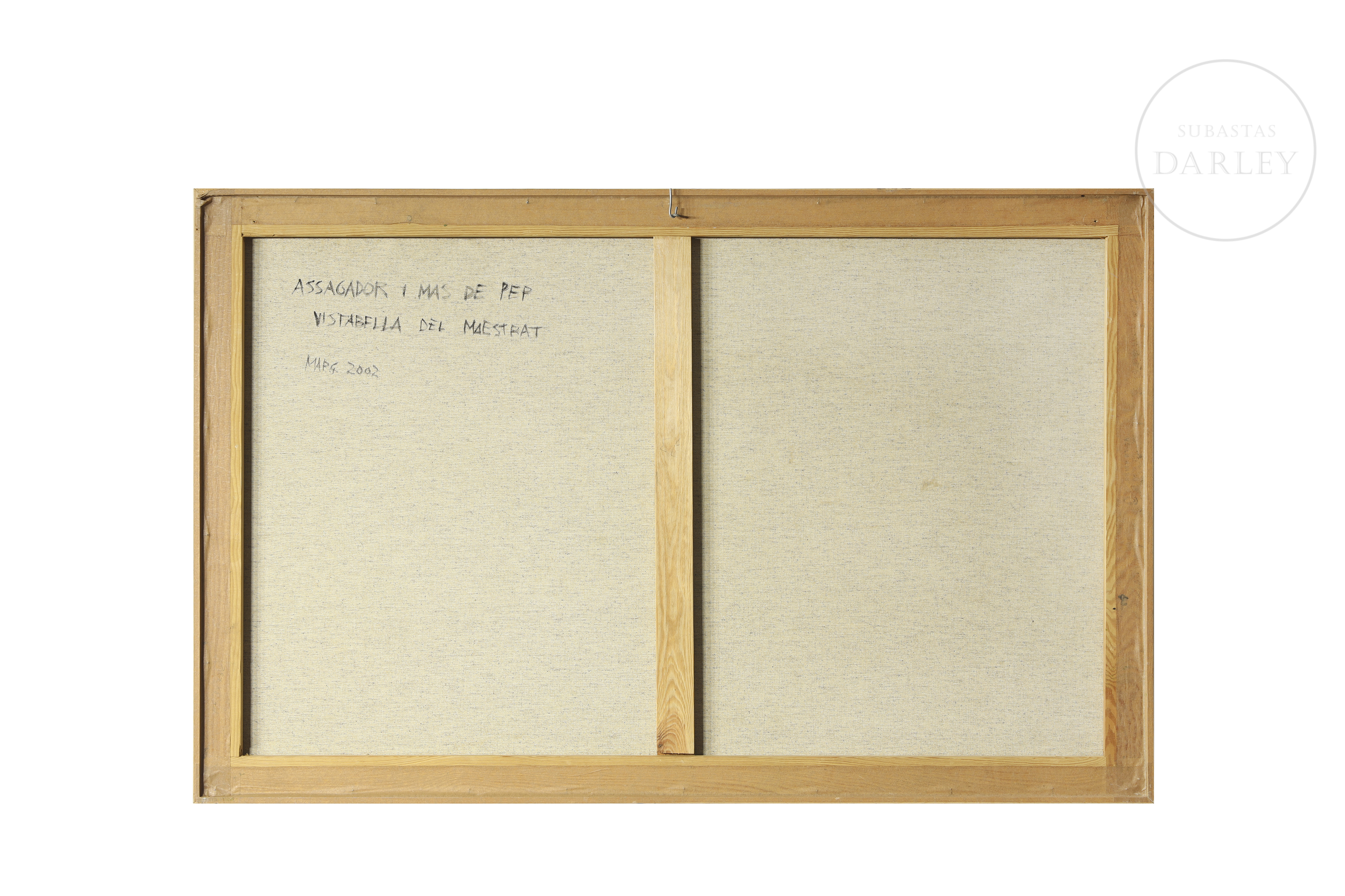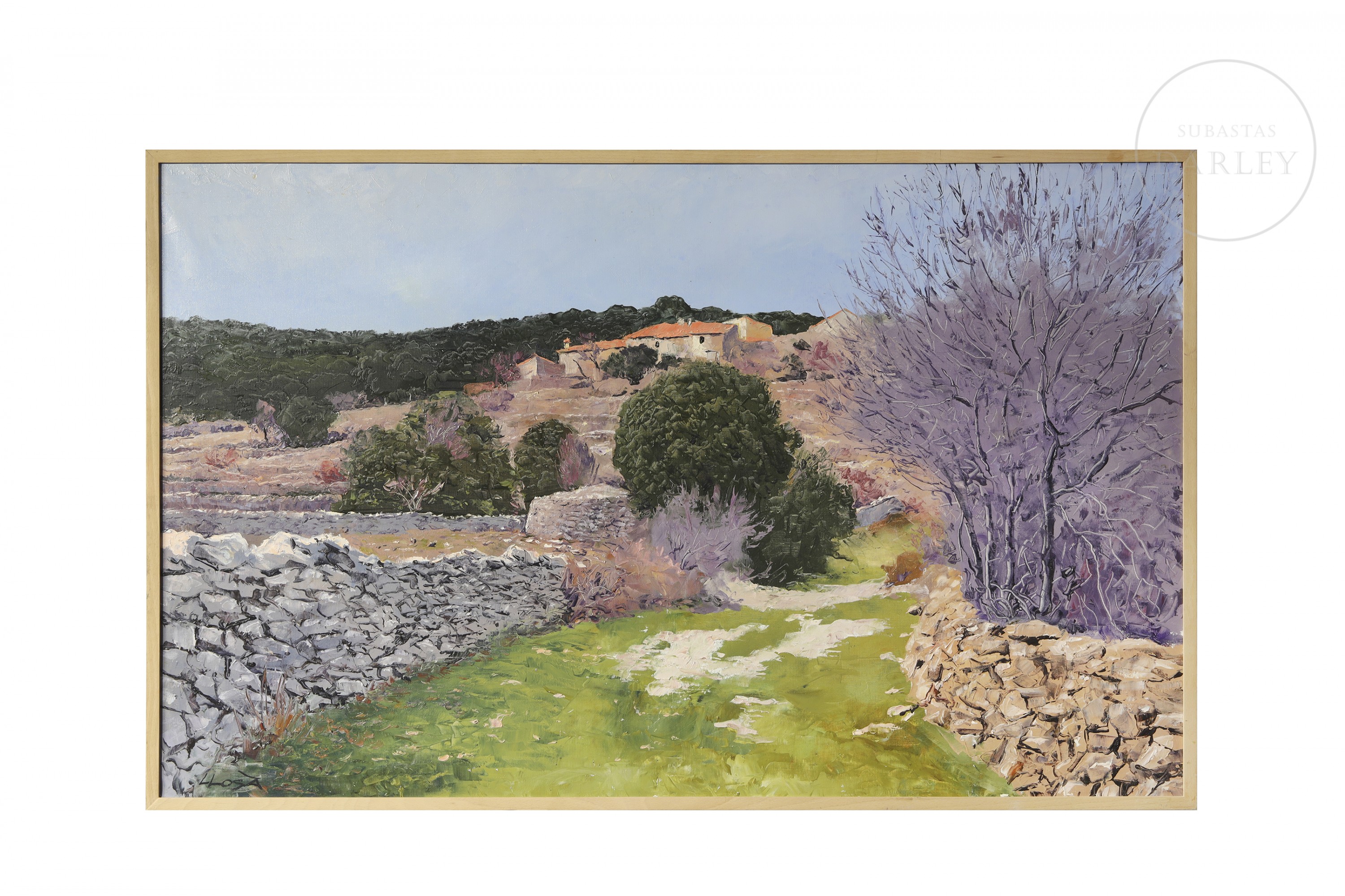 Óleo sobre lienzo. Paisaje rural que representa el paraje de "Assagador i Mas de Pep" en Vistabella del Maestrat. La obra muestra un sendero flanqueado por muros de piedra seca que conduce hacia unas edificaciones bajo un cielo despejado. Firmado "LLOSÀ" en la esquina inferior izquierda.