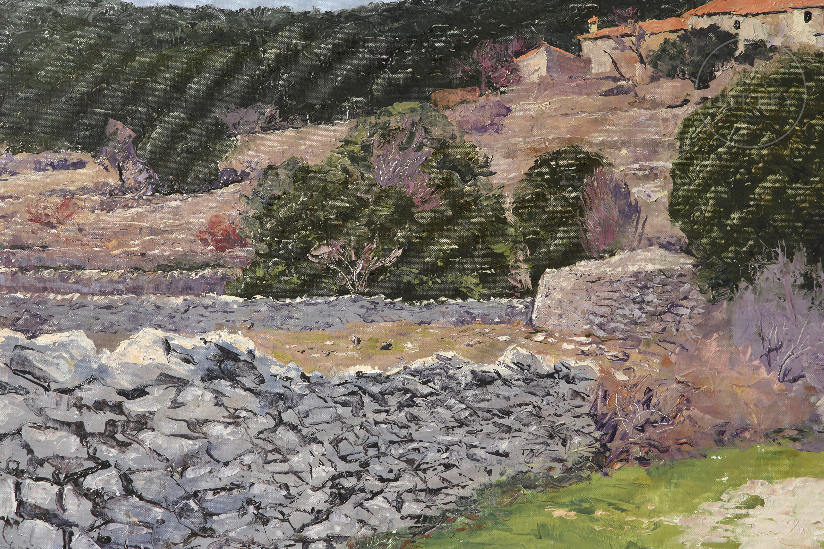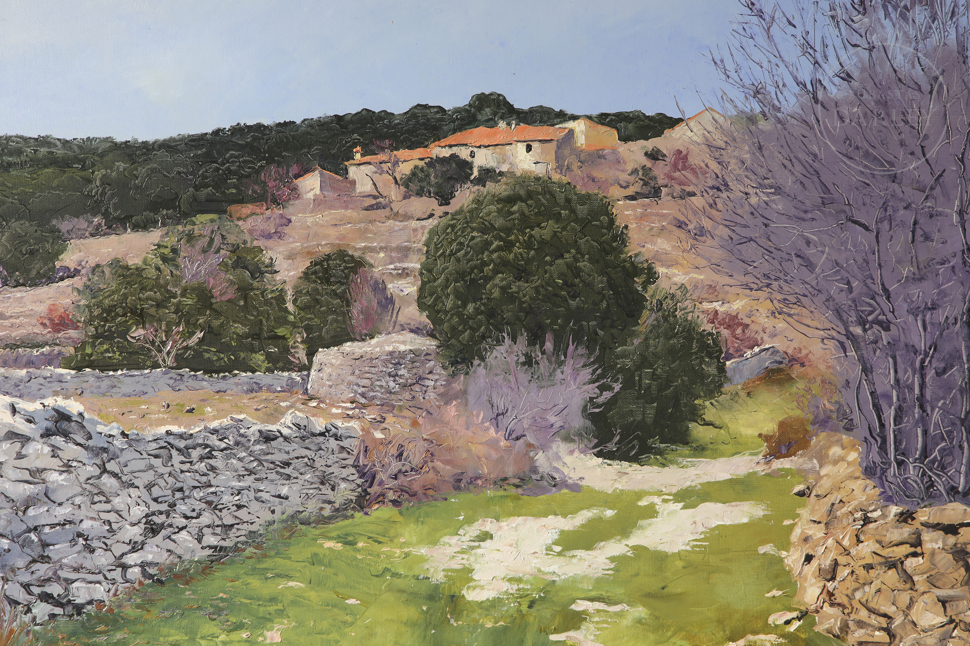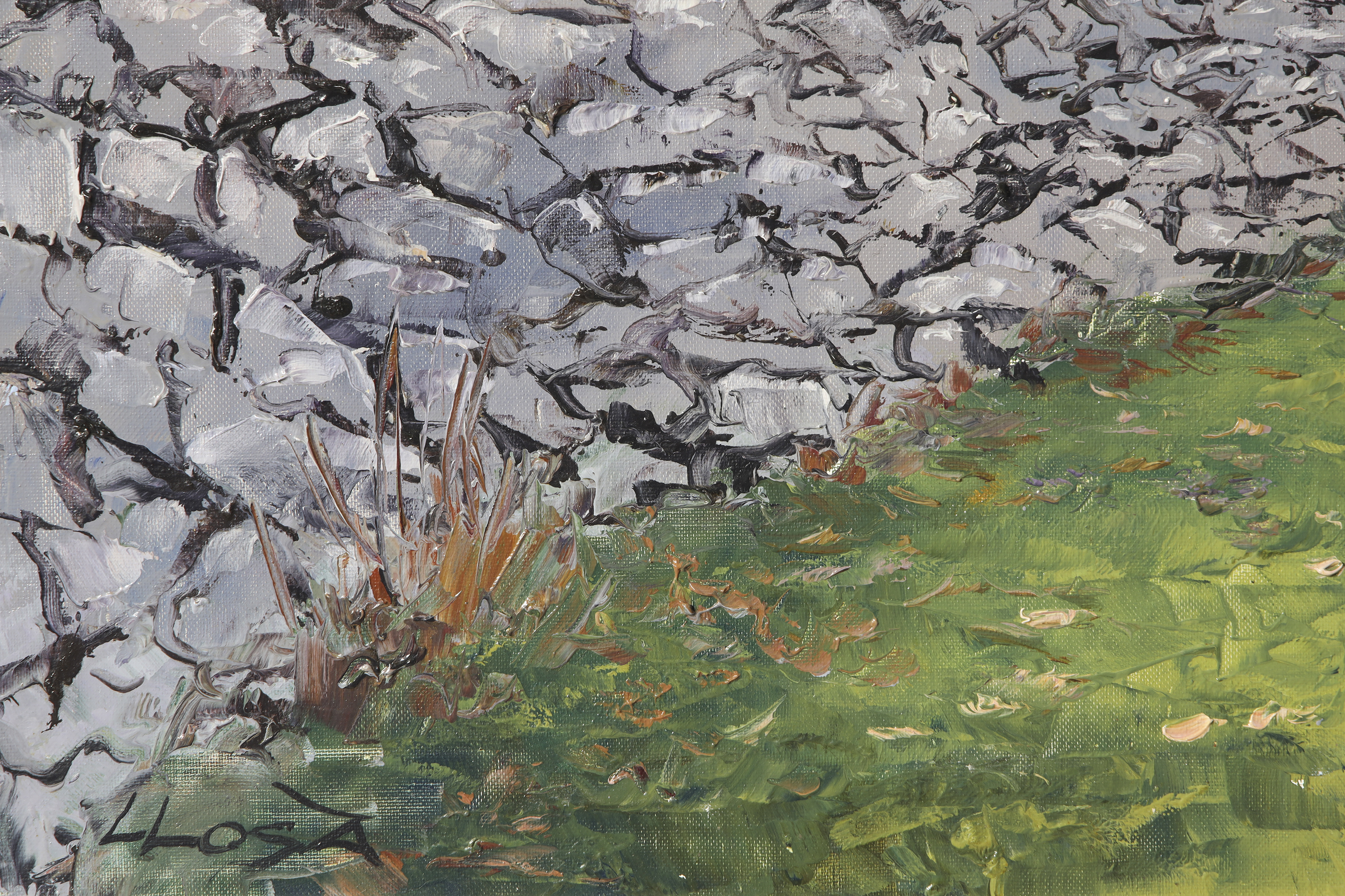Óleo sobre lienzo. Paisaje rural que representa el paraje de "Assagador i Mas de Pep" en Vistabella del Maestrat. La obra muestra un sendero flanqueado por muros de piedra seca que conduce hacia unas edificaciones bajo un cielo despejado. Firmado "LLOSÀ" en la esquina inferior izquierda.
