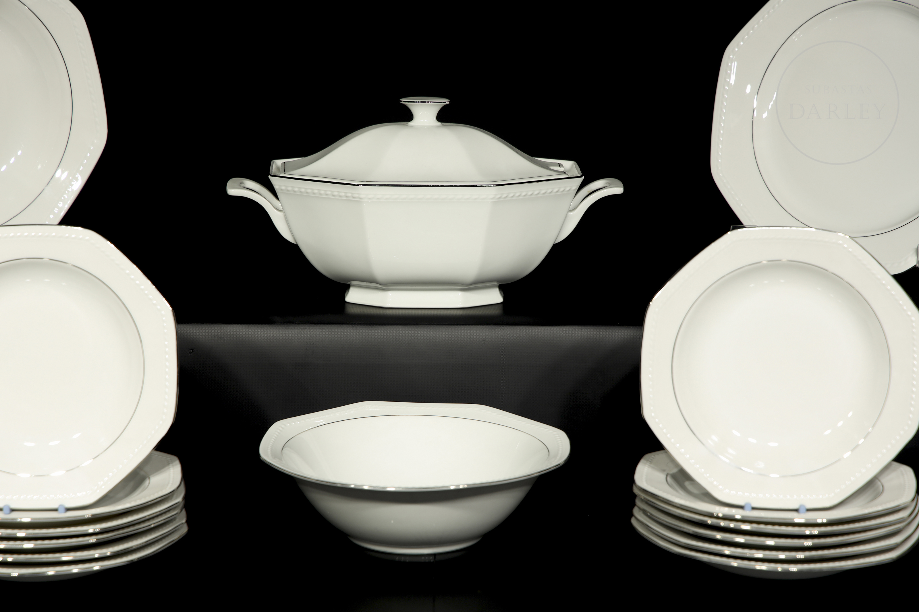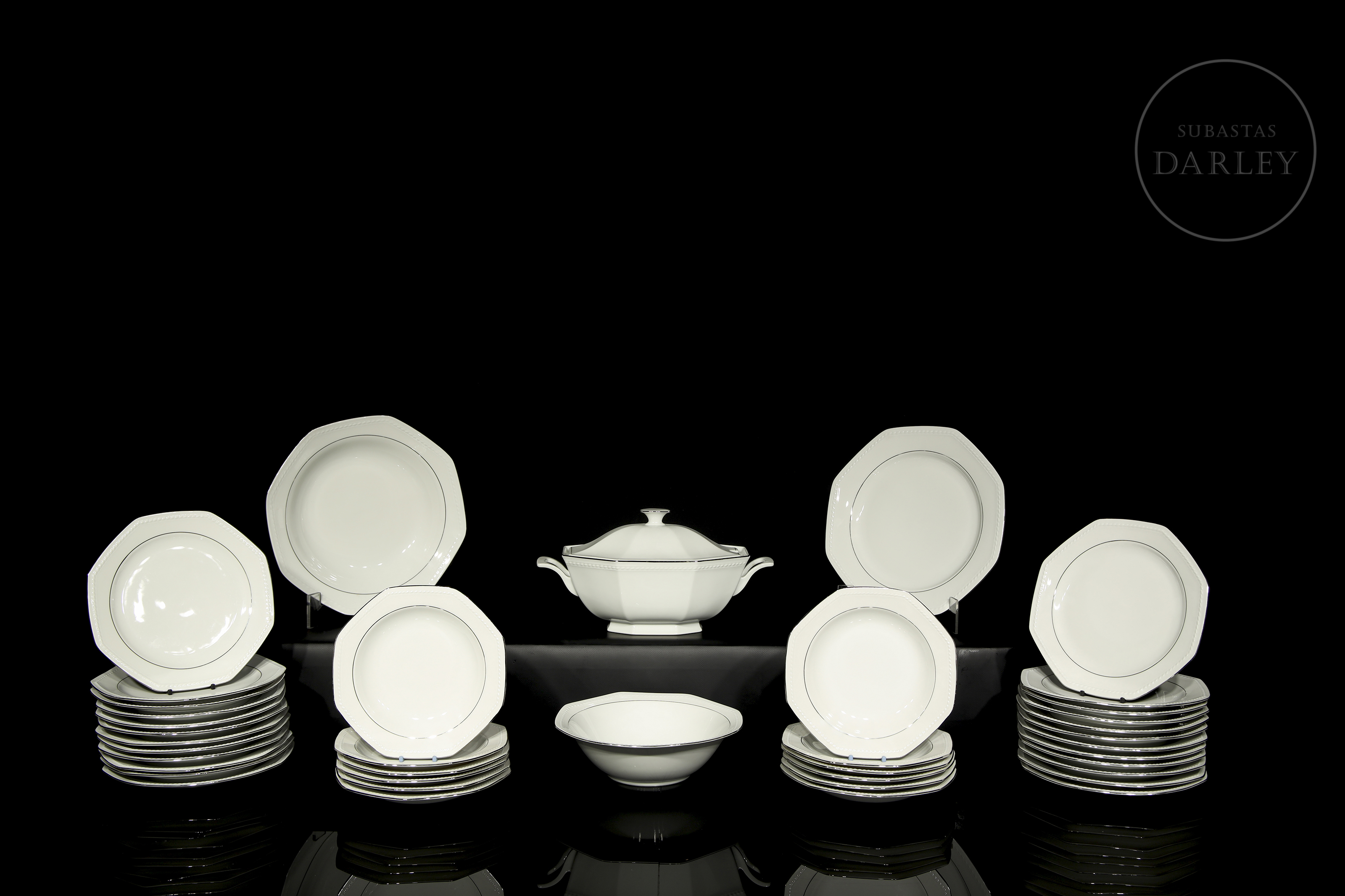 Servicio de mesa con diseño octogonal realizado en porcelana blanca con una elegante orla perimetral en color plata. El conjunto destaca por su sobriedad neoclásica y formas geométricas. Sello de fabricación en el reverso. Compuesto por: platos llanos (24), platos hondos (12), sopera (1), bandejas (2) y ensaladera (1).