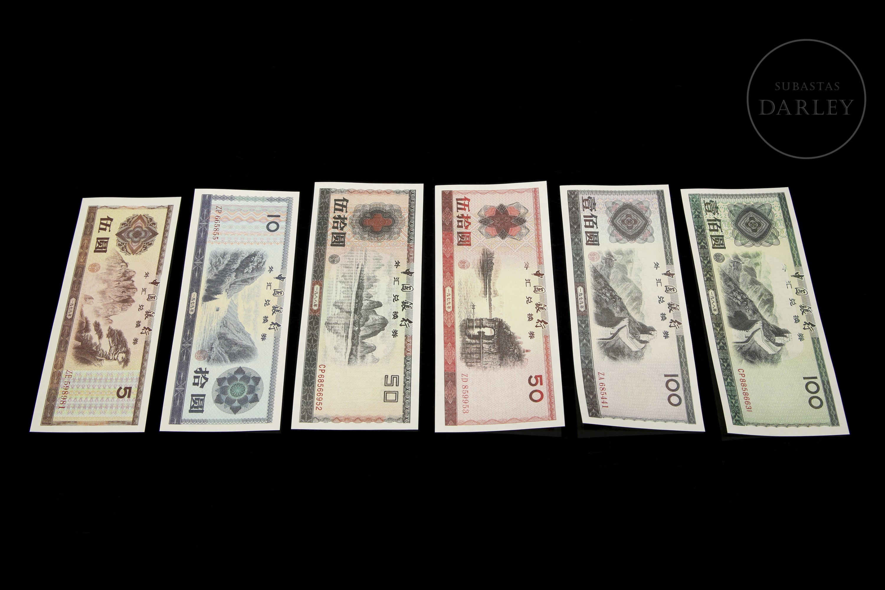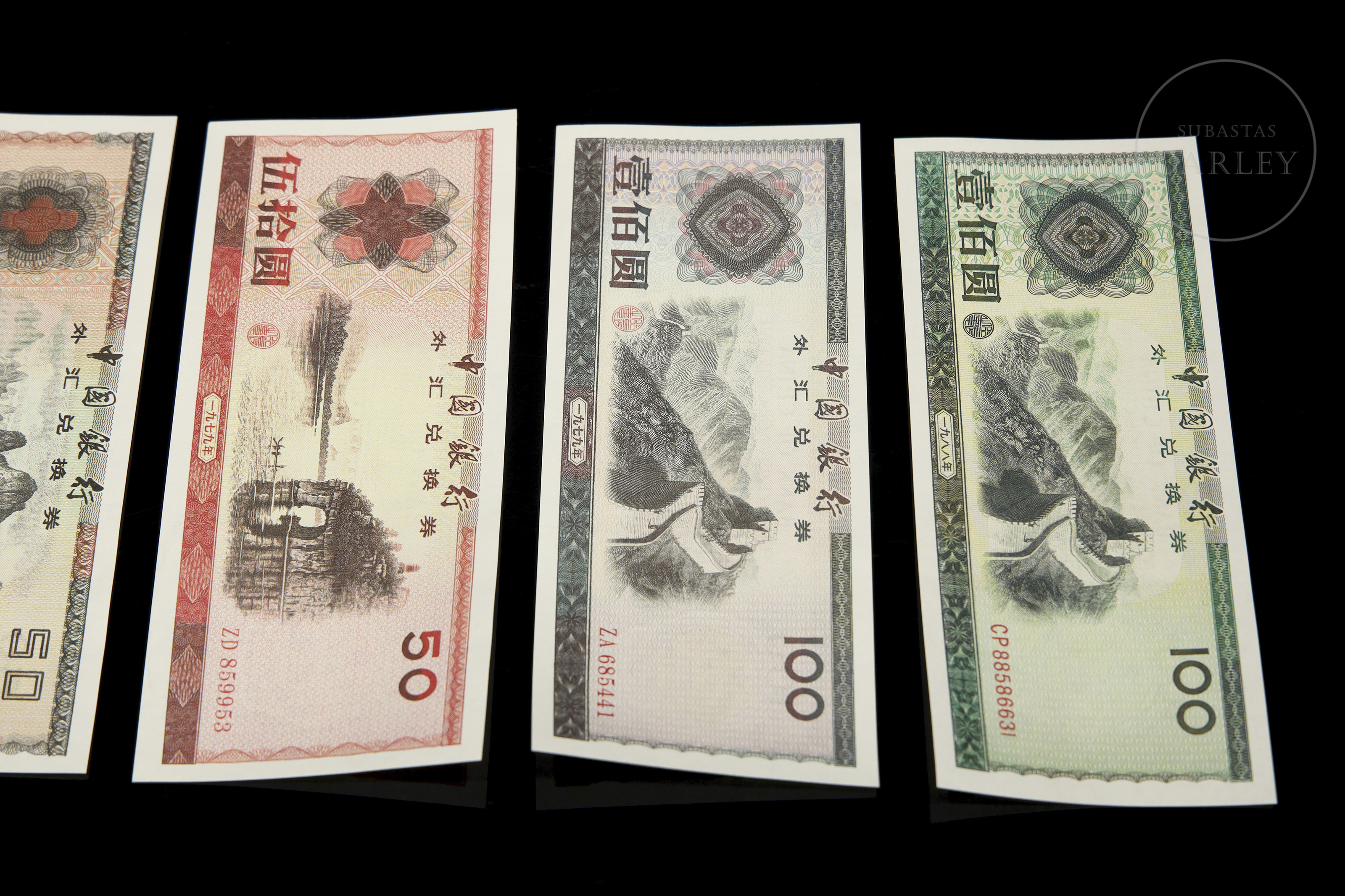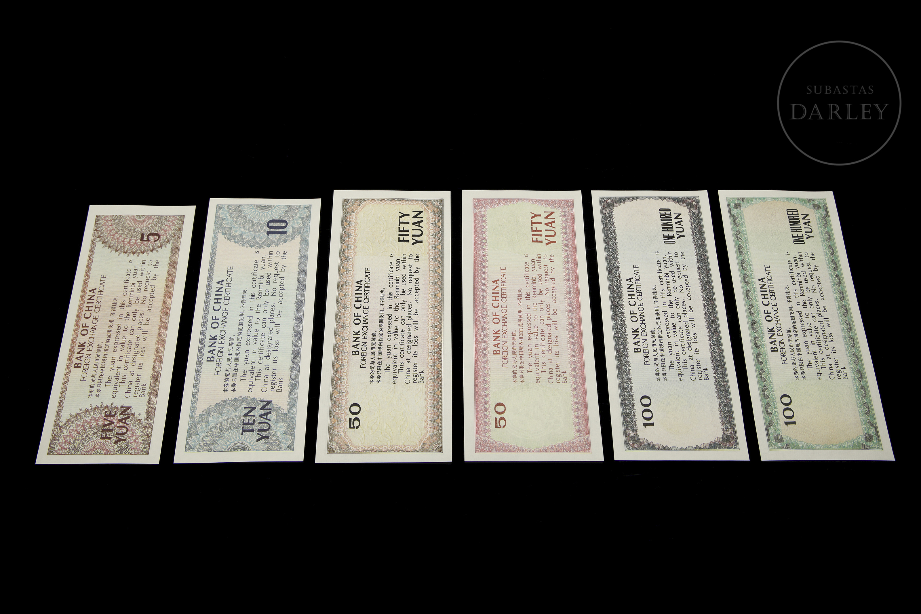 Seis billetes emitidos por el Banco de China, conocidos como Foreign Exchange Certificates (FEC), empleados como moneda especial ente 1980 y 1995, y destinados al uso por visitantes extranjeros. Se muestran denominaciones variadas de 5 Yuan, 10 Yuan, 50 Yuan (dos unidades) y 100 Yuan (dos unidades).
