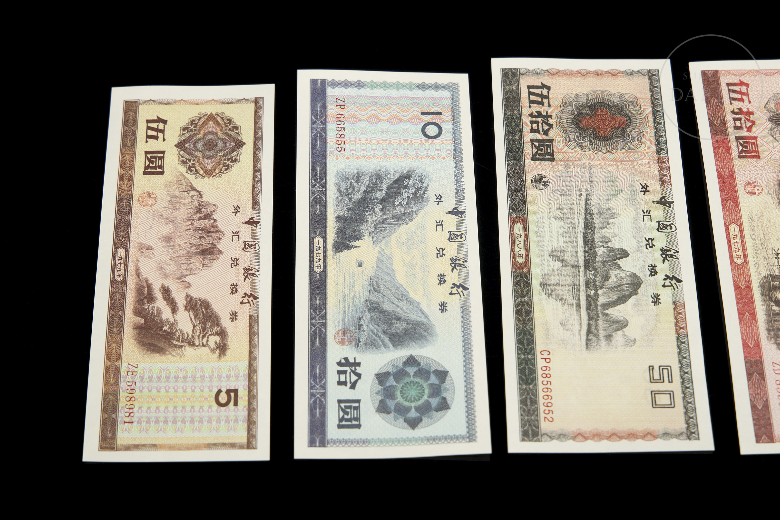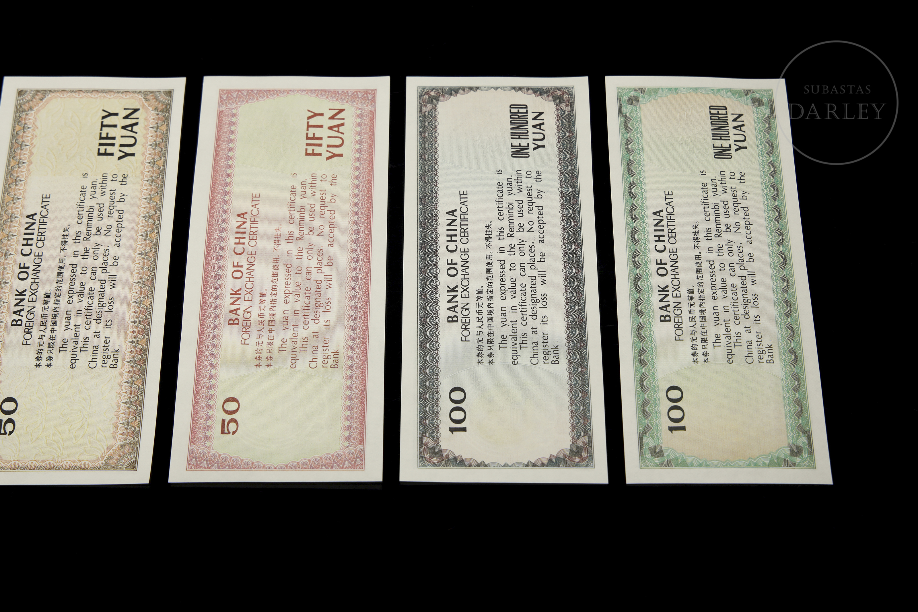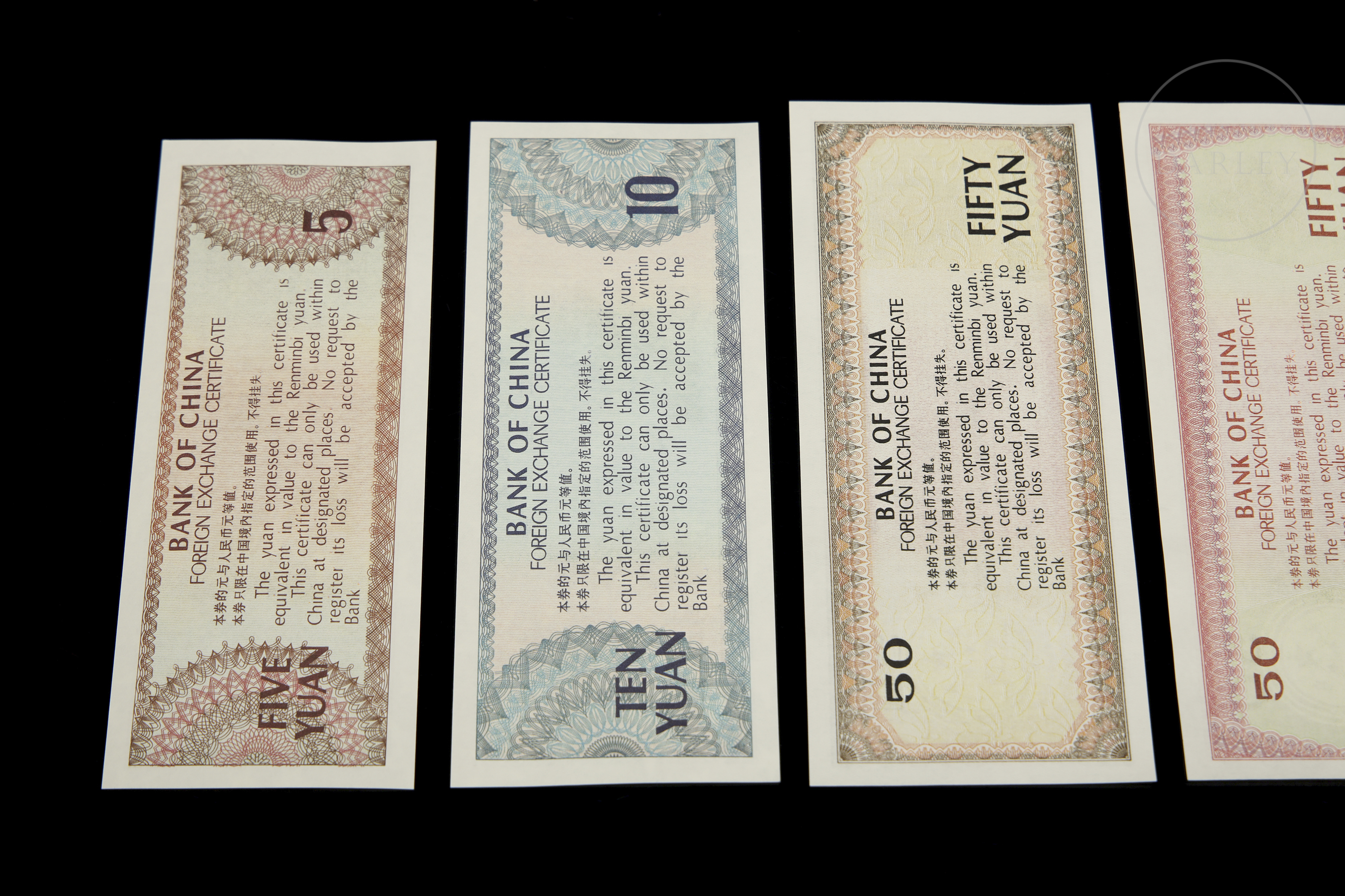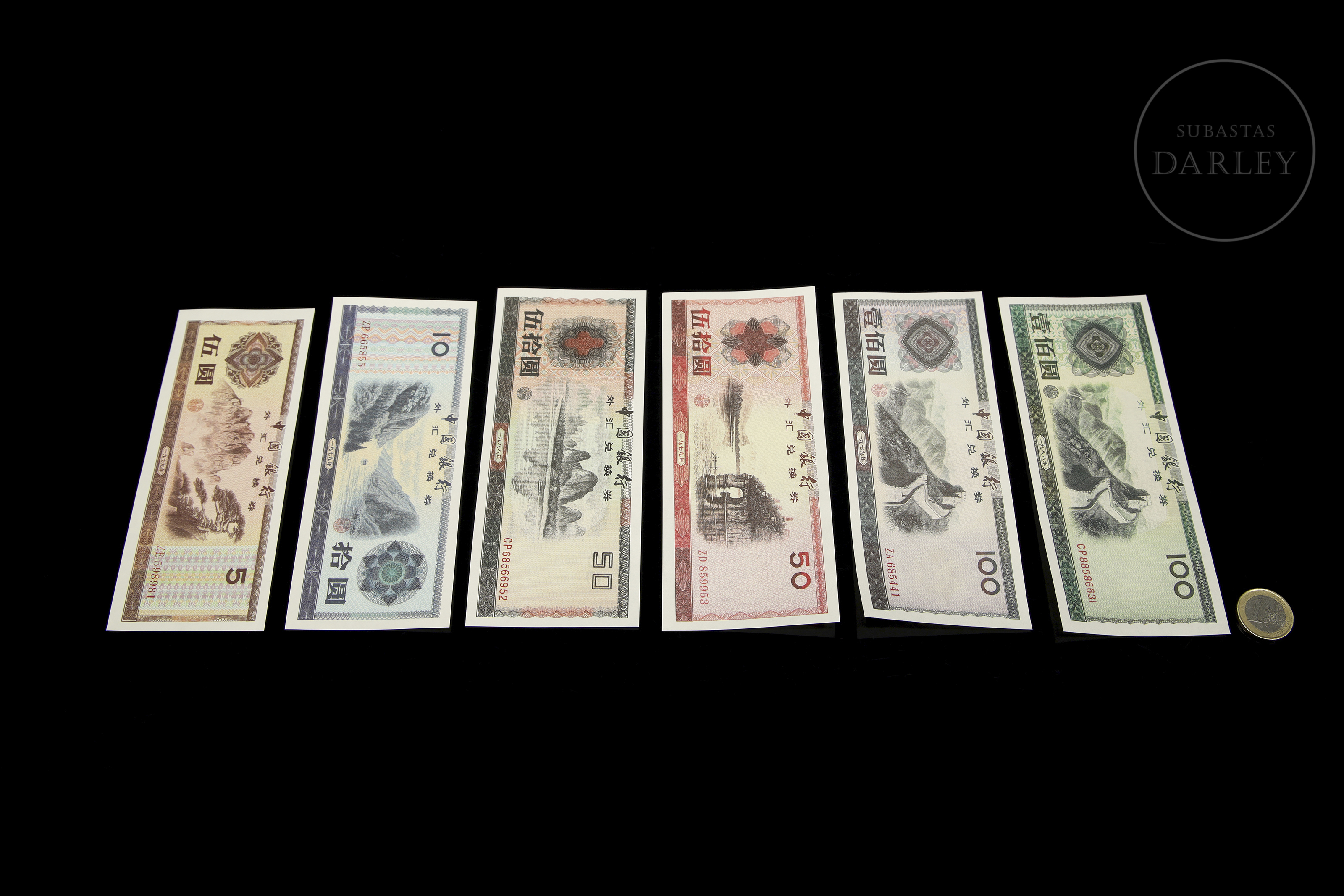 Seis billetes emitidos por el Banco de China, conocidos como Foreign Exchange Certificates (FEC), empleados como moneda especial ente 1980 y 1995, y destinados al uso por visitantes extranjeros. Se muestran denominaciones variadas de 5 Yuan, 10 Yuan, 50 Yuan (dos unidades) y 100 Yuan (dos unidades).