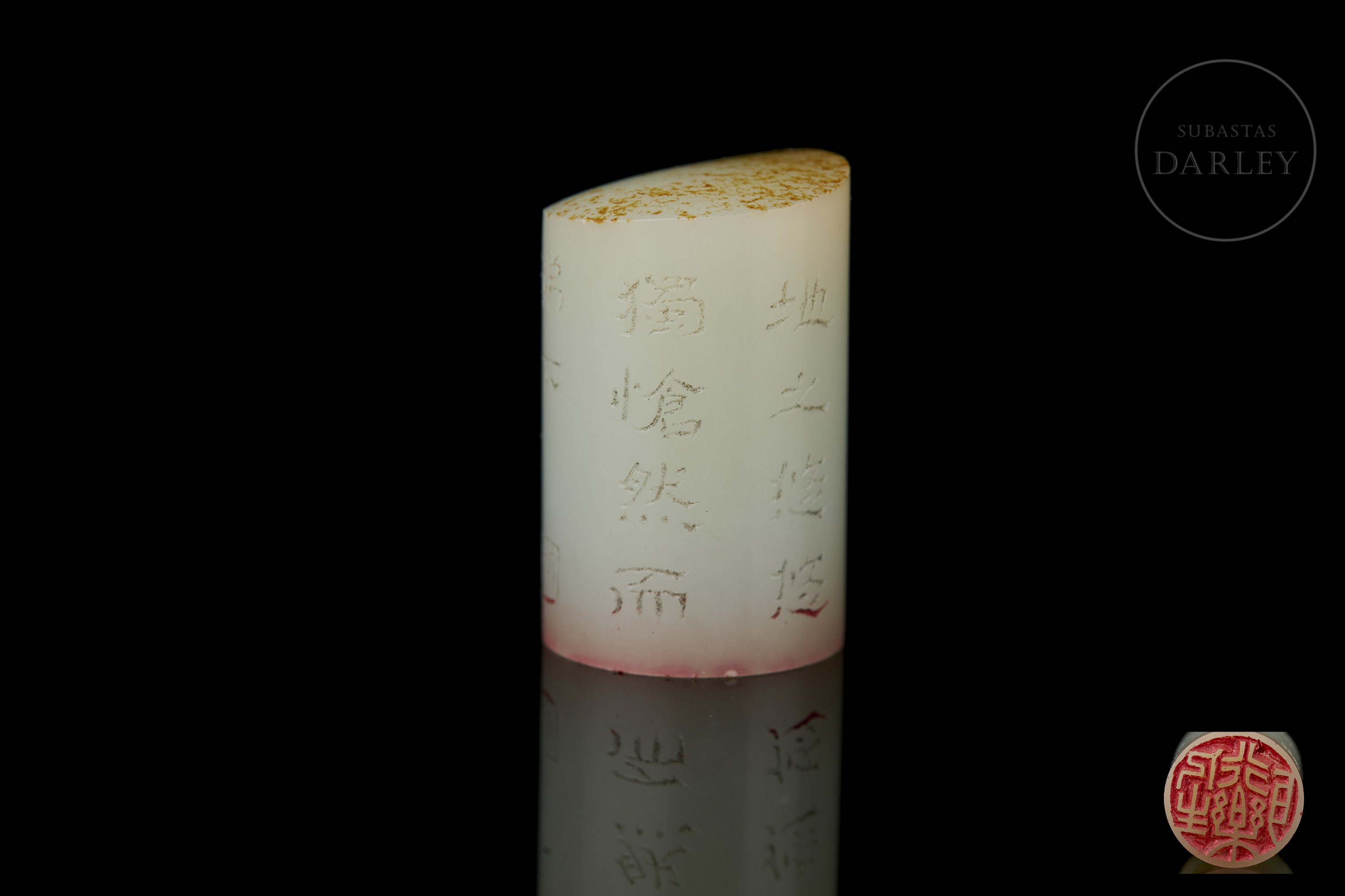 Sello realizado en jade blanco de forma cilíndrica, con pátina ocre en la parte superior. El lateral presenta un poema inciso con los caracteres "來者念天地之连悠", mientras que en la base se encuentra el sello "人生行乐耳".