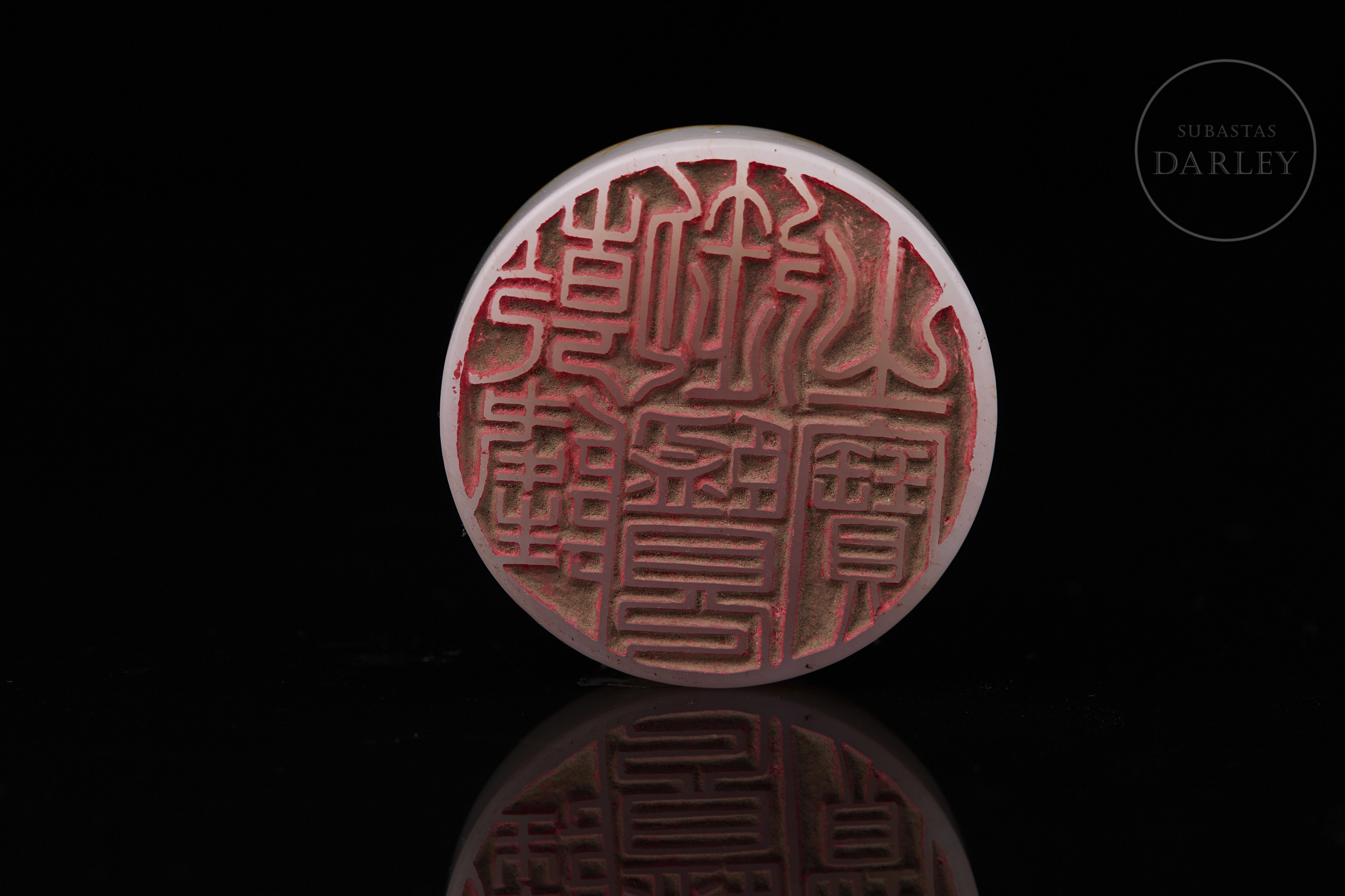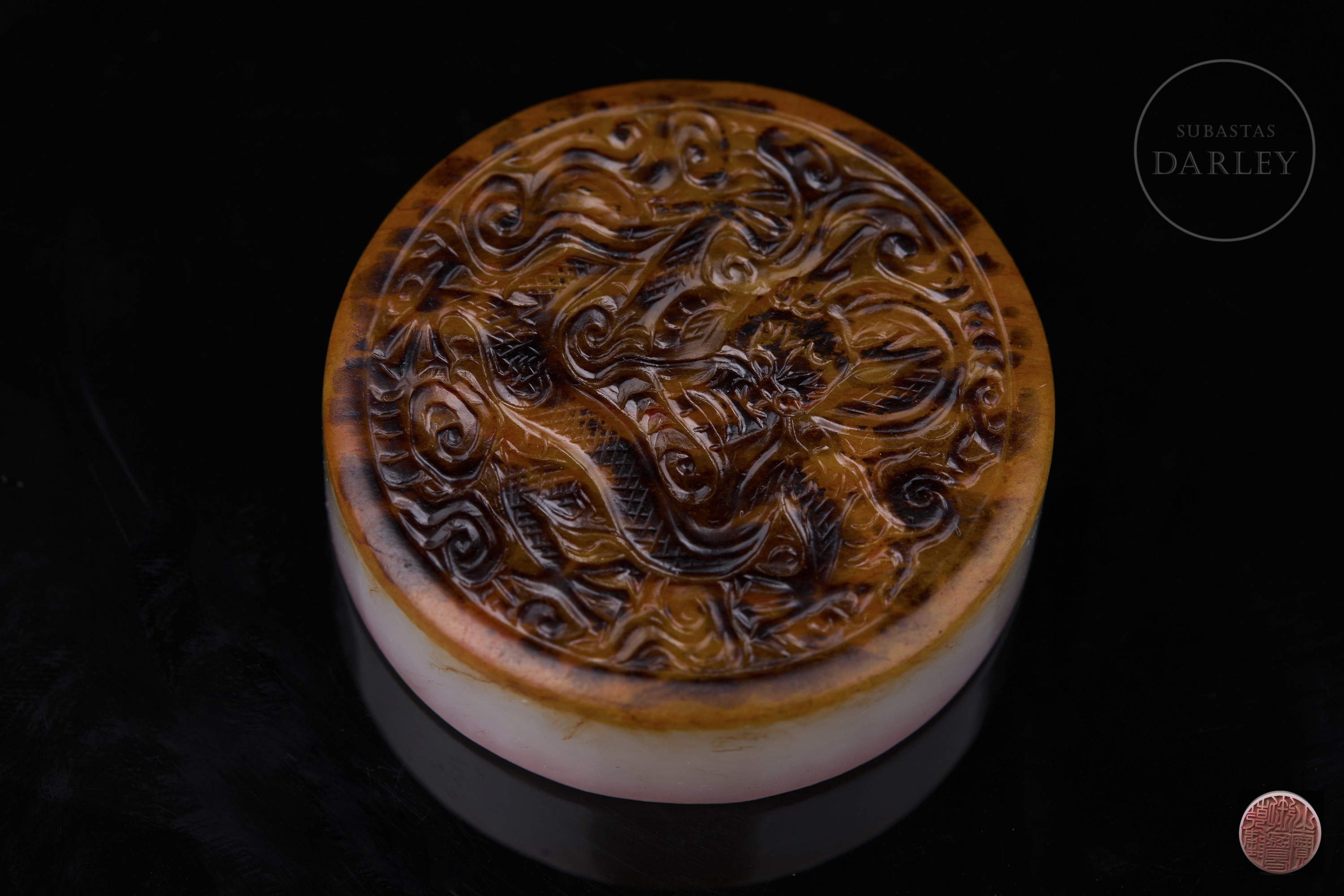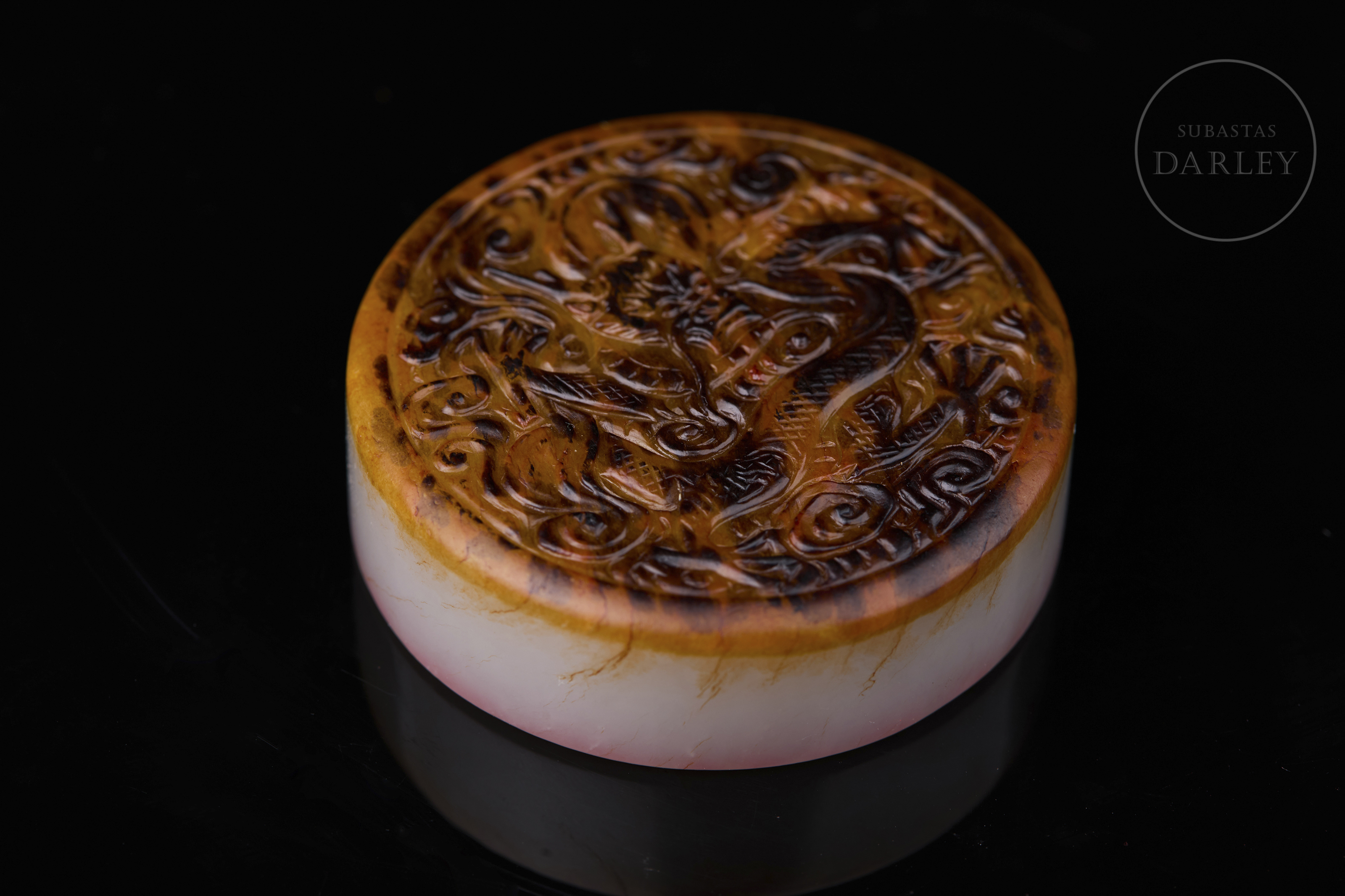 Sello tallado de jade de color blanco cremoso, con una extensa capa de pátina de color ámbar y marrón rojizo en la cima. Muestra una base circular y chata, coronada por un medallón en bajo relieve, con la imagen de un gran dragón de cuerpo robusto, escamado y enroscado, rodeado por un fondo de volutas. En la base se dispone el sello grabado "乾隆御览之宝". Dinastía Qing (1644-1912).