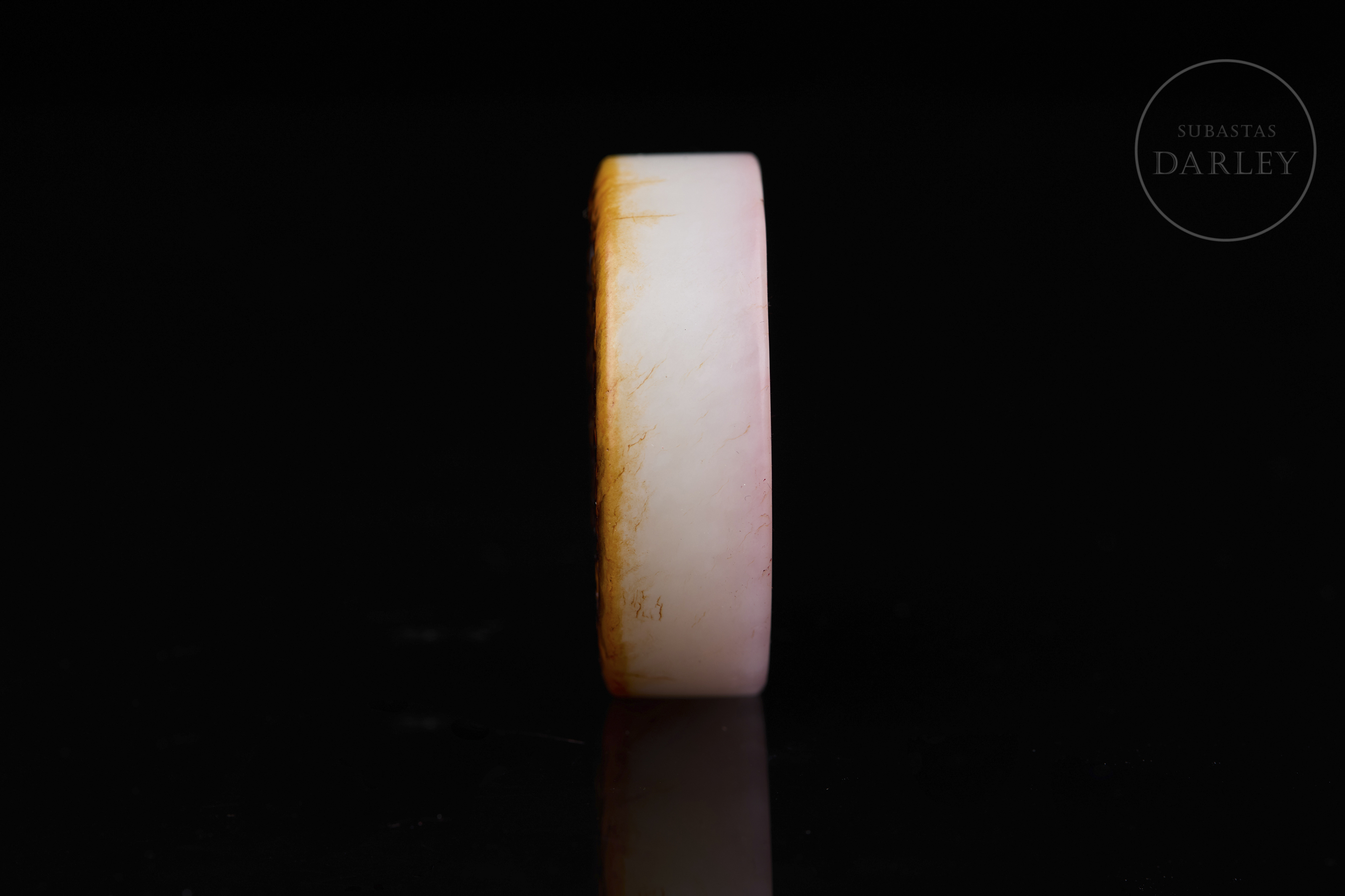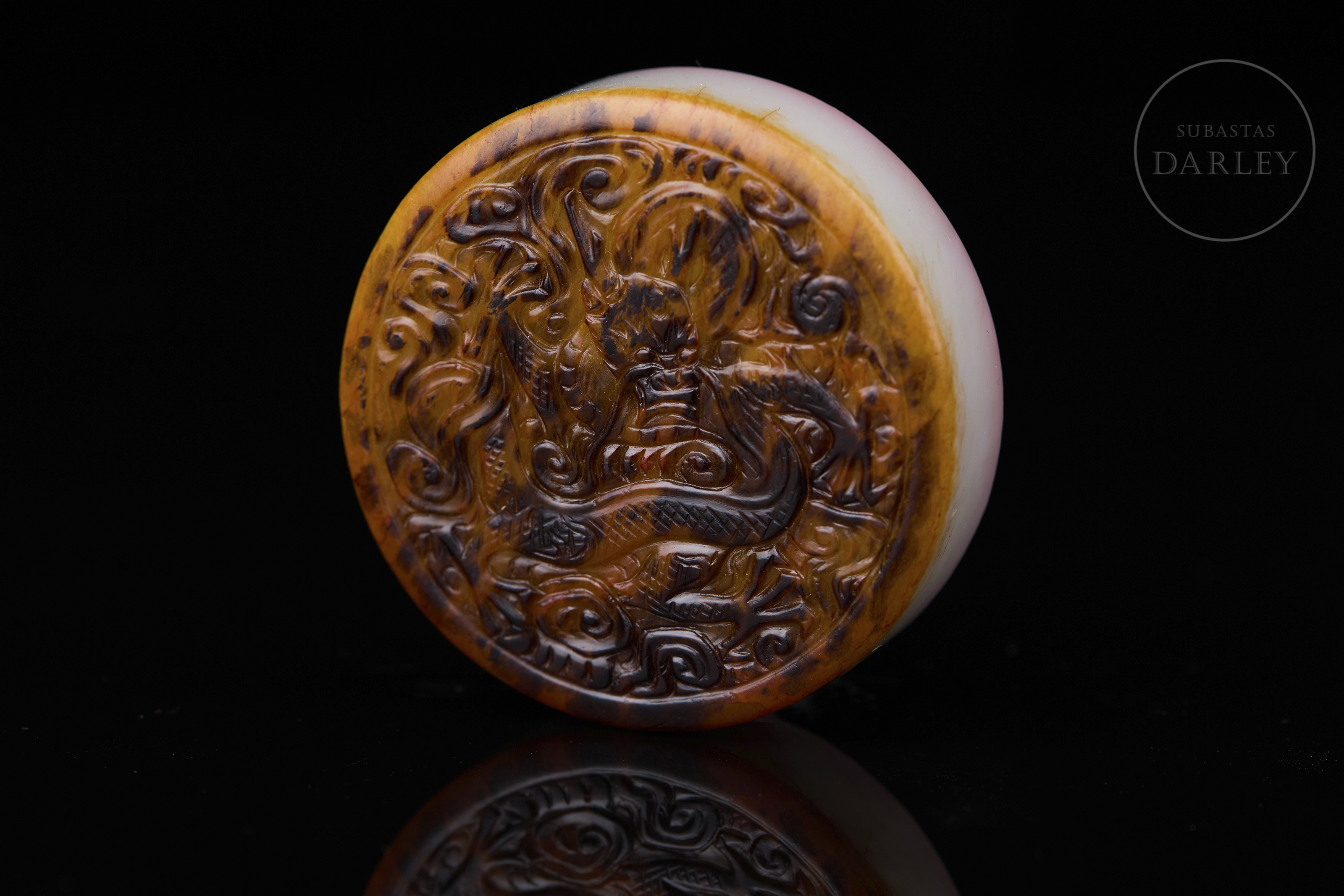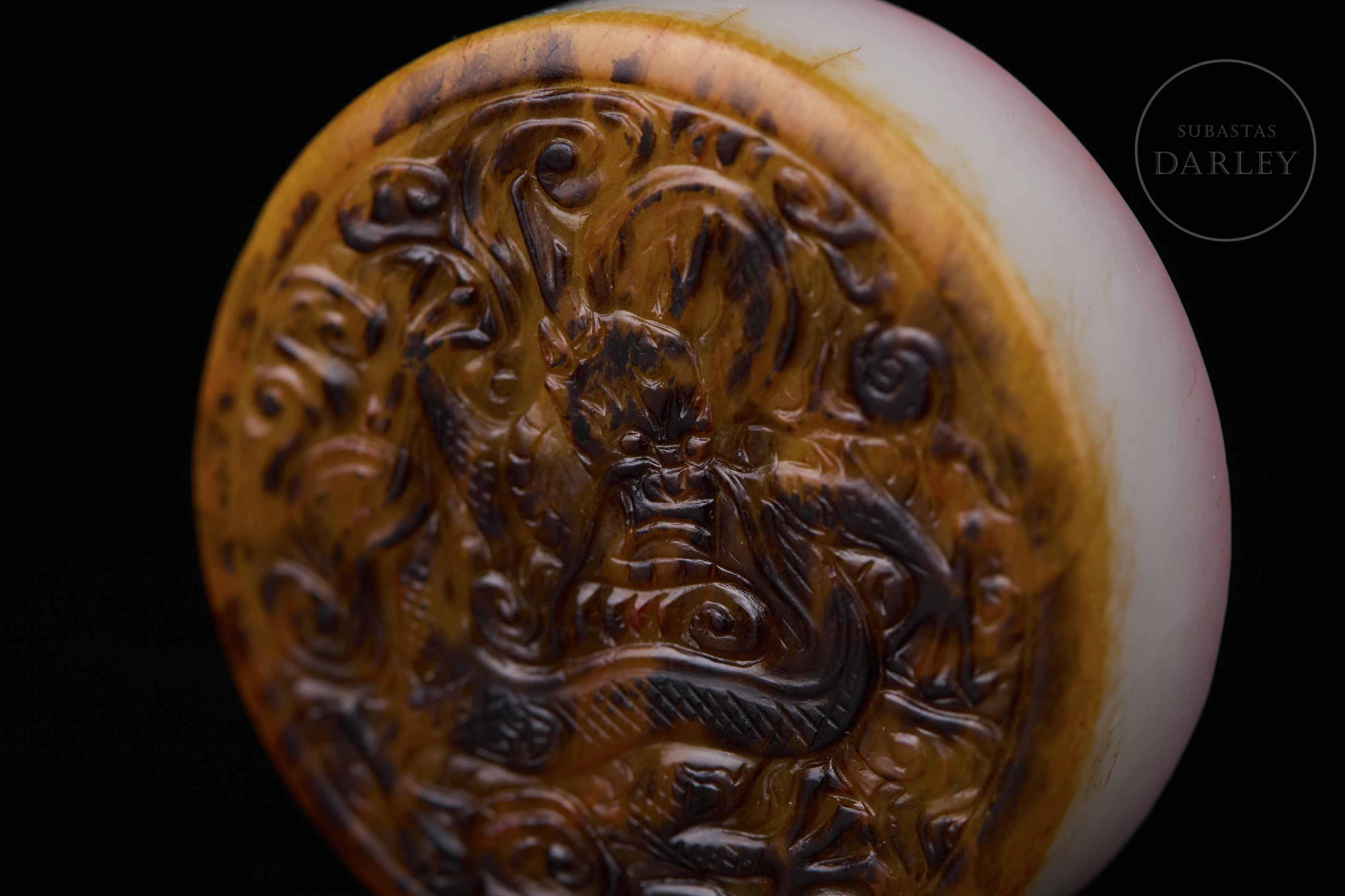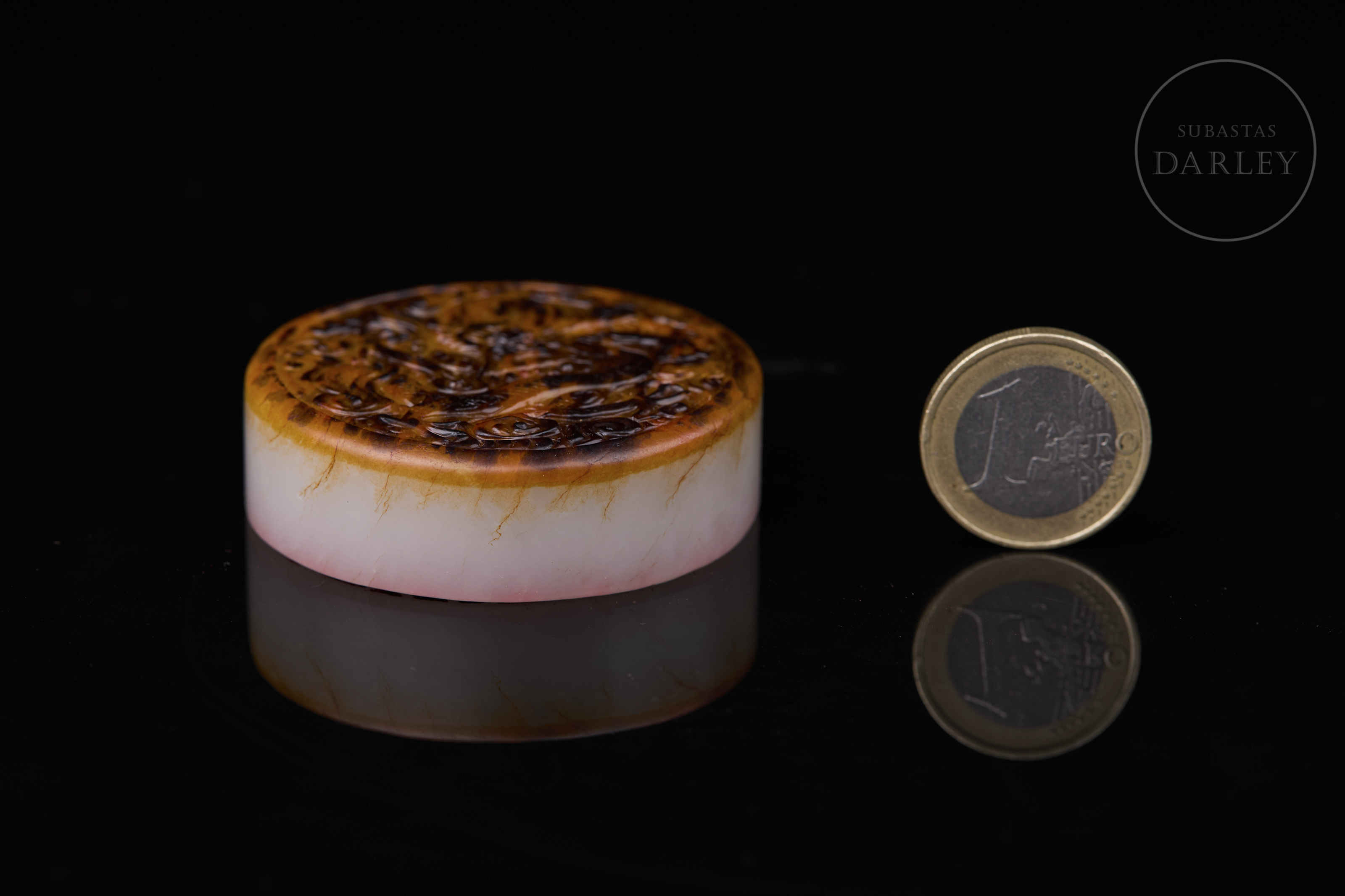 Sello tallado de jade de color blanco cremoso, con una extensa capa de pátina de color ámbar y marrón rojizo en la cima. Muestra una base circular y chata, coronada por un medallón en bajo relieve, con la imagen de un gran dragón de cuerpo robusto, escamado y enroscado, rodeado por un fondo de volutas. En la base se dispone el sello grabado "乾隆御览之宝". Dinastía Qing (1644-1912).