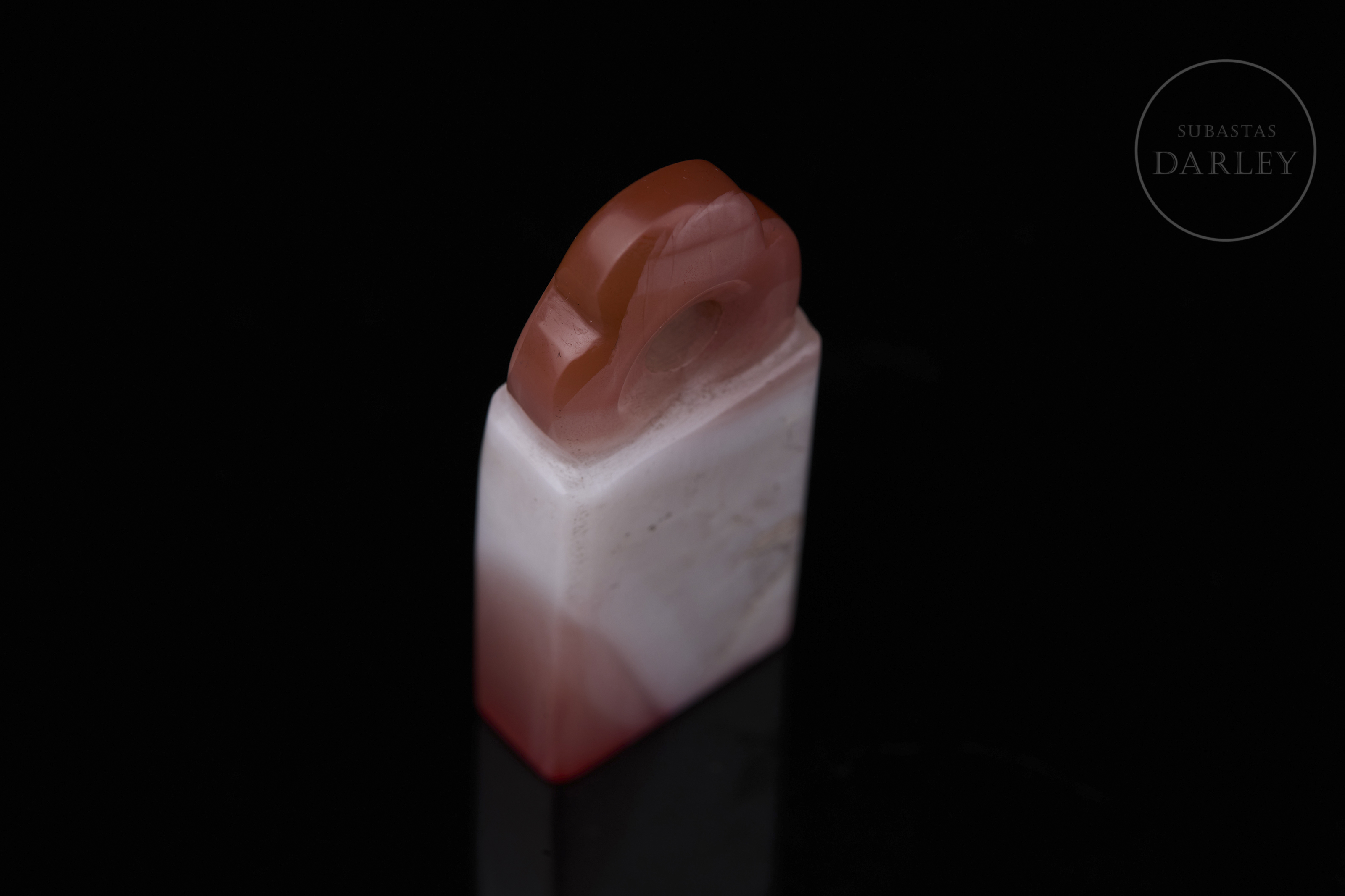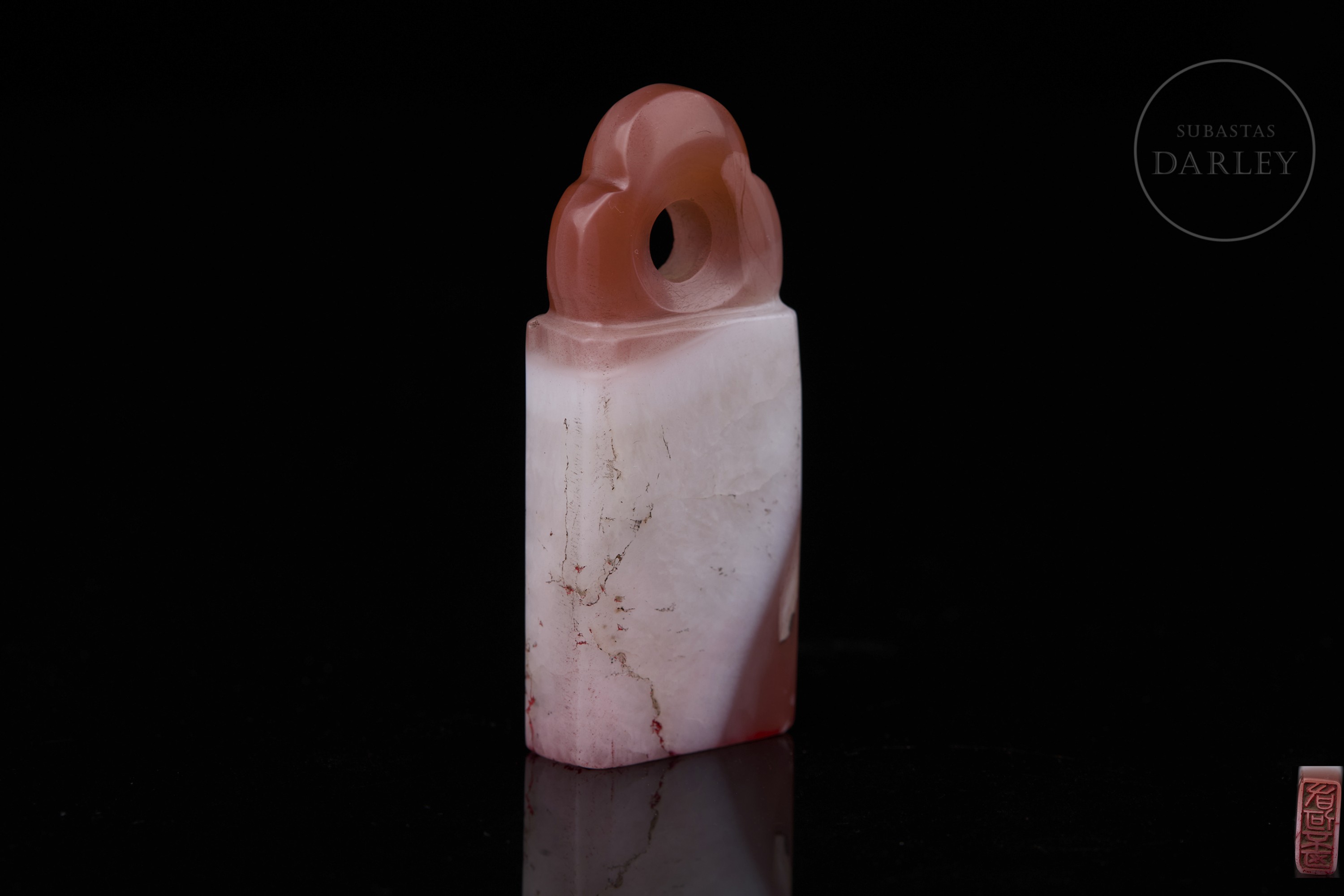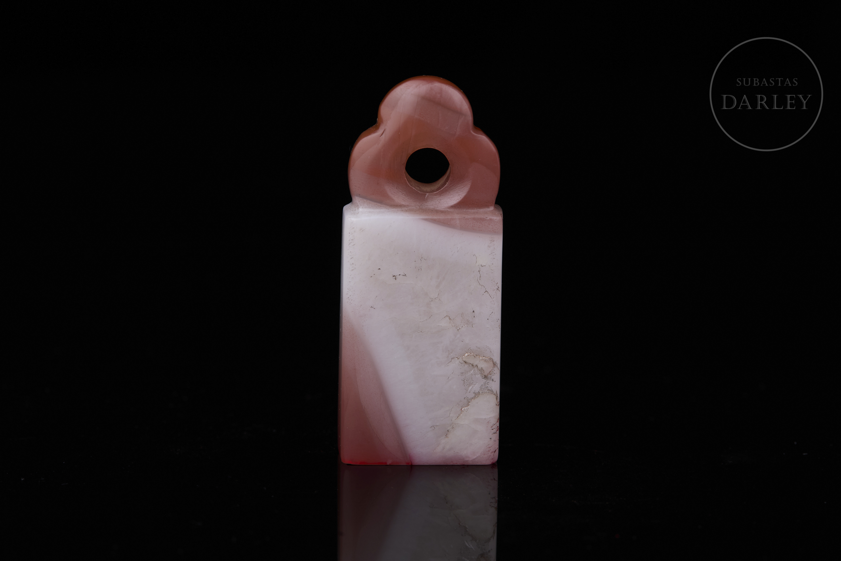 Sello de ágata tallada de color blanco lechoso con vetas de color rojo cinabrio intenso. Muestra un cuerpo rectangular y esbelto, con la parte superior tallada en forma de remate lobulado, con perforación central para su uso como colgante. En la base se dispone un sello grabado con los caracteres "有何不可". Dinastía Qing (1644-1912).