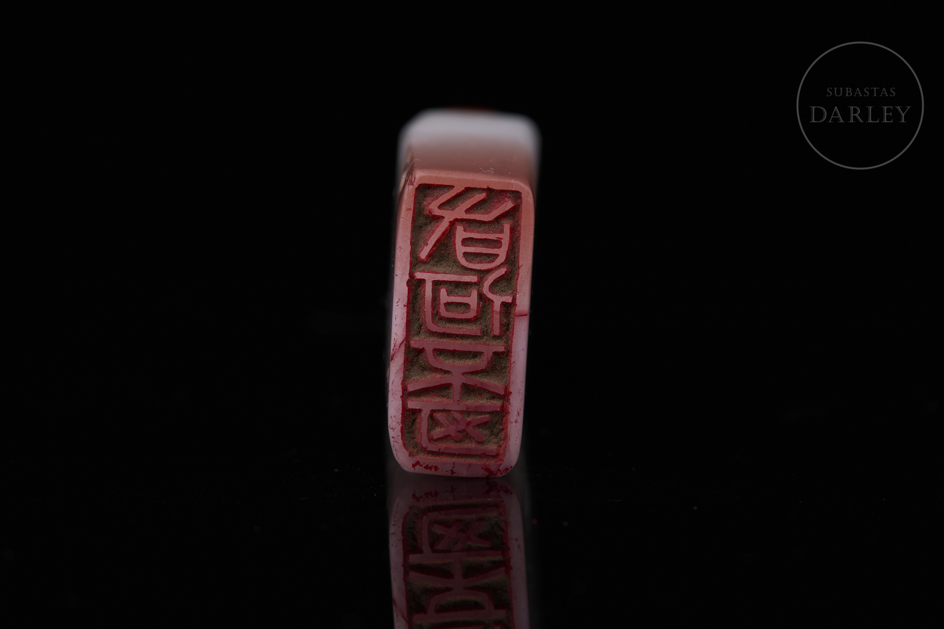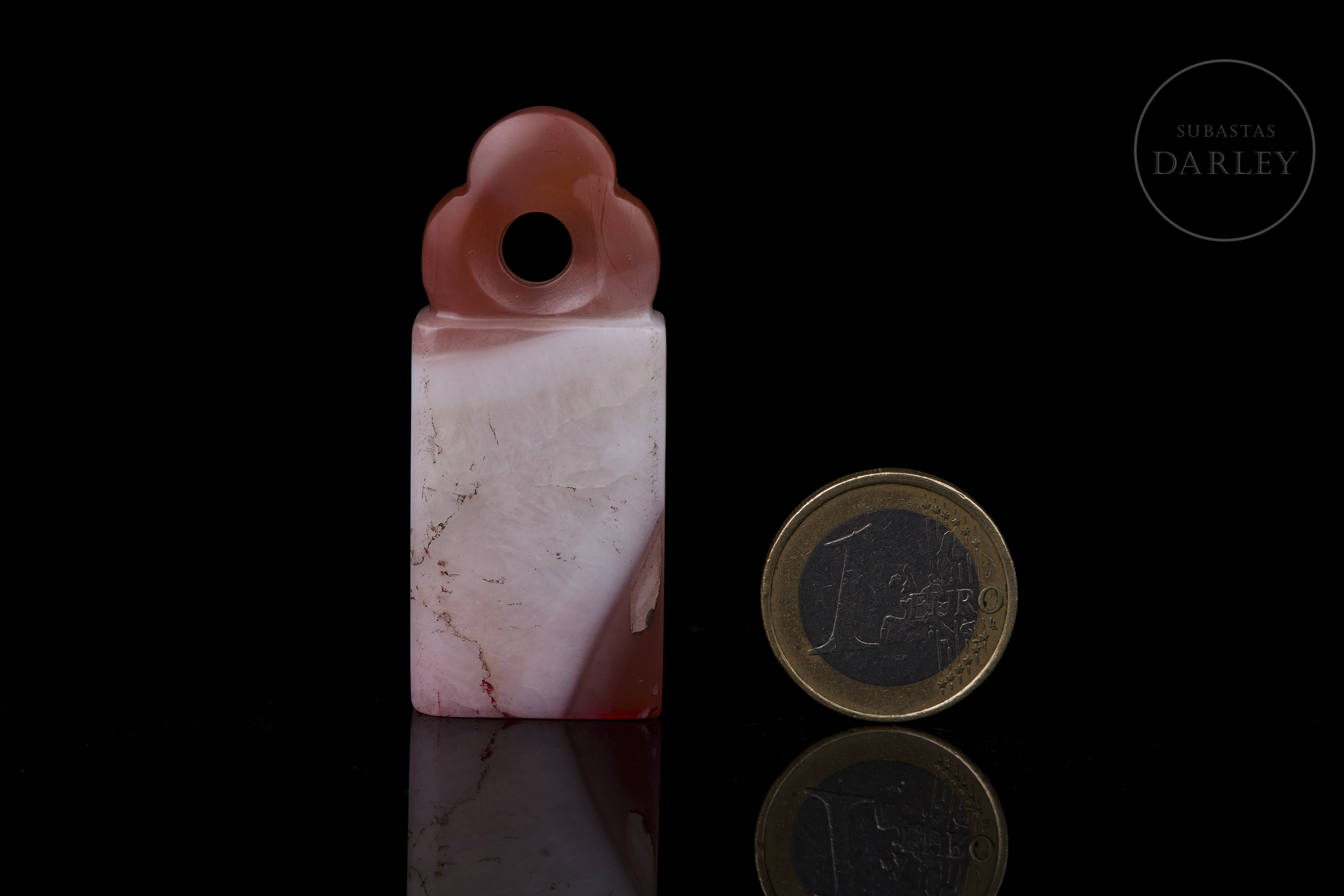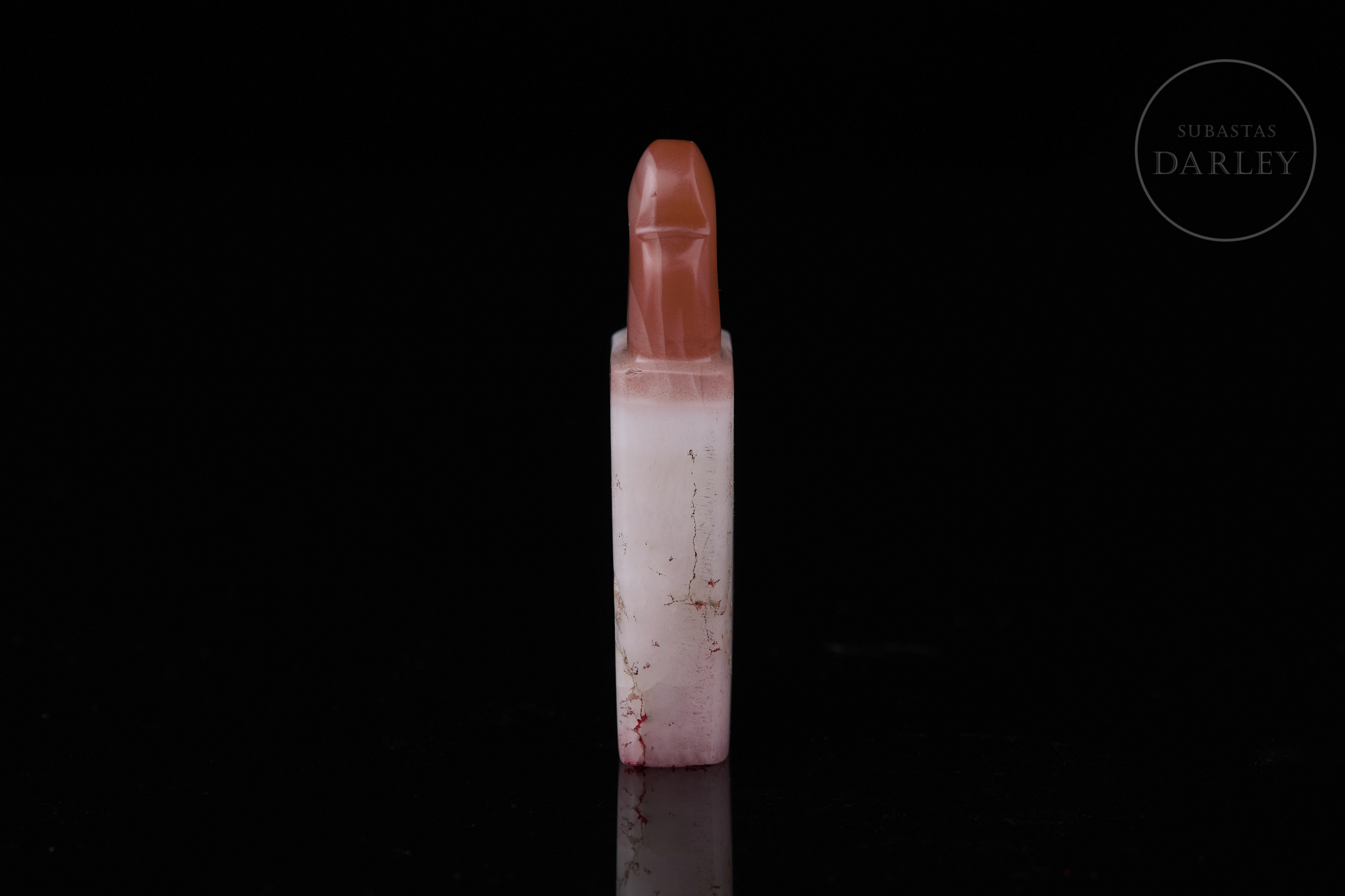 Sello de ágata tallada de color blanco lechoso con vetas de color rojo cinabrio intenso. Muestra un cuerpo rectangular y esbelto, con la parte superior tallada en forma de remate lobulado, con perforación central para su uso como colgante. En la base se dispone un sello grabado con los caracteres "有何不可". Dinastía Qing (1644-1912).