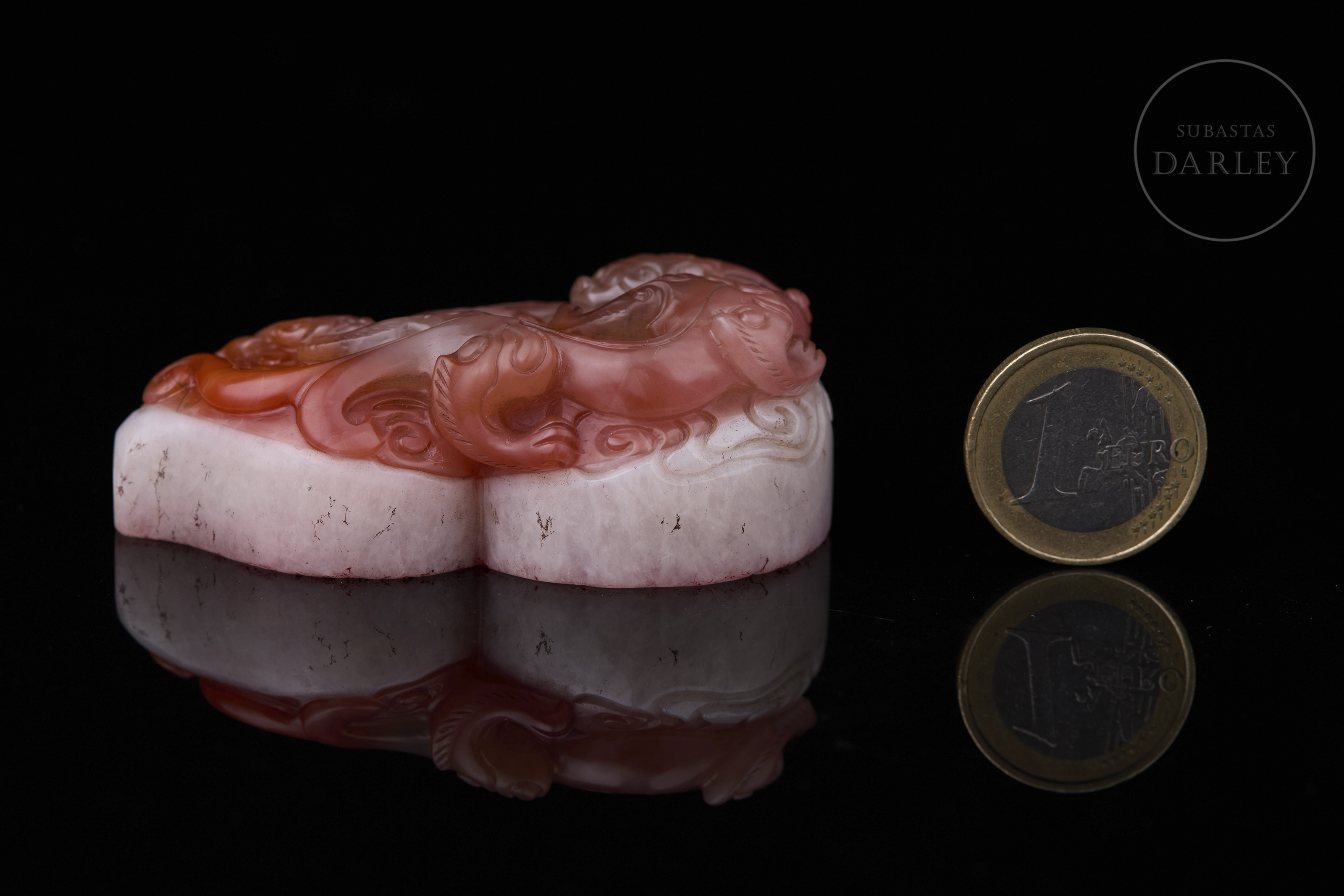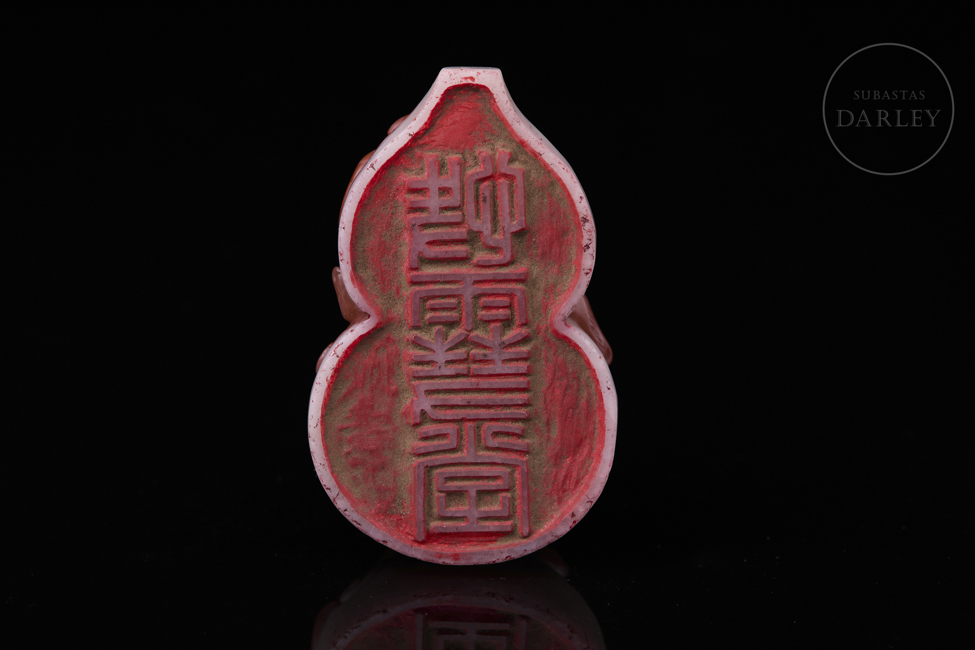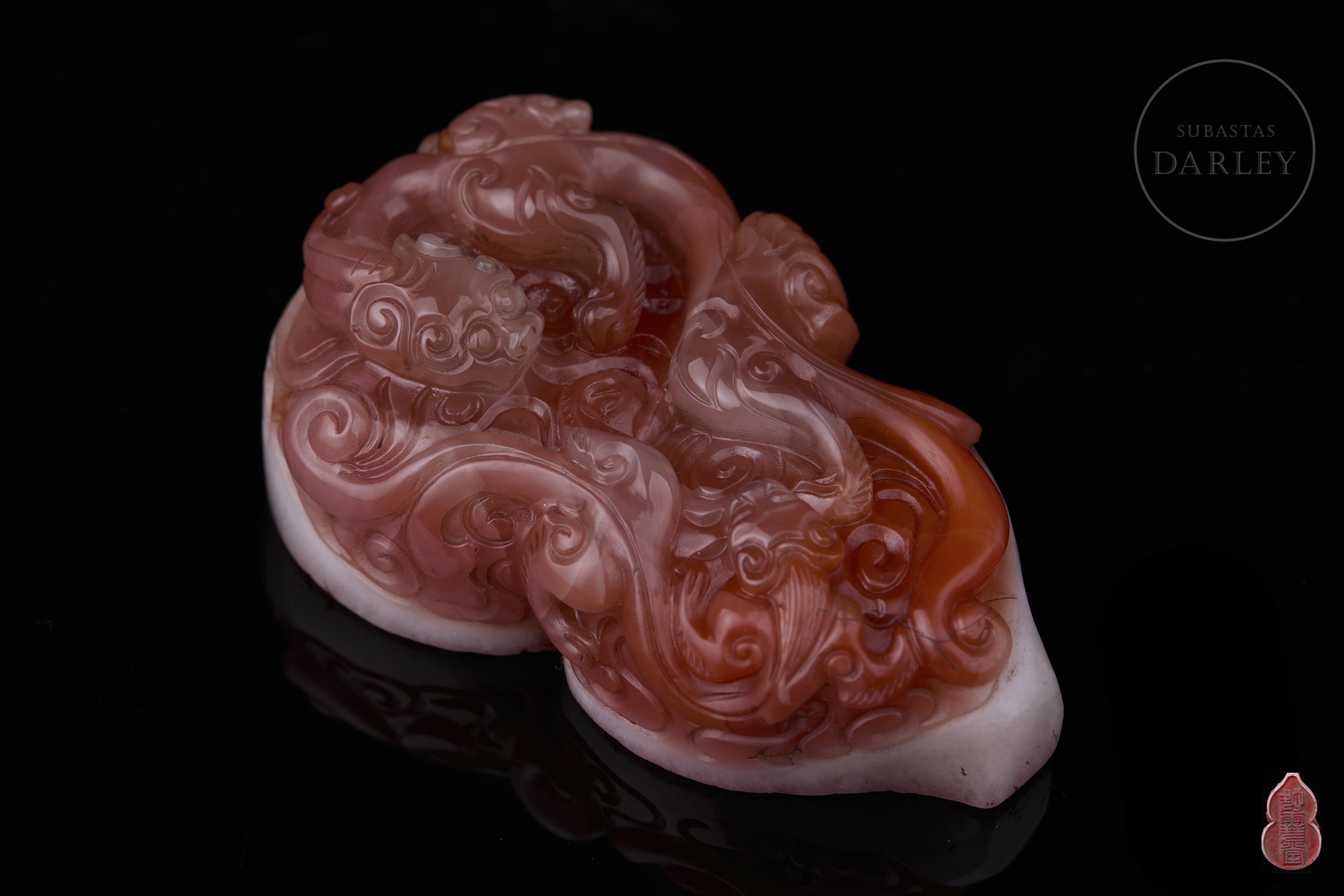 Sello tallado de ágata Nanhong y de forma de calabaza doble (hulu). Se encuentra adornado por un dragón entrelazado entre volutas de nubes, aprovechando las capas de color del ágata. El ágata es de color blanco en la capa inferior, mientras que la capa superior, es de un intenso tono rojo carmesí. La matriz muestra los caracteres "快雪堂" incisos. Dinastía Qing (1644–1912).