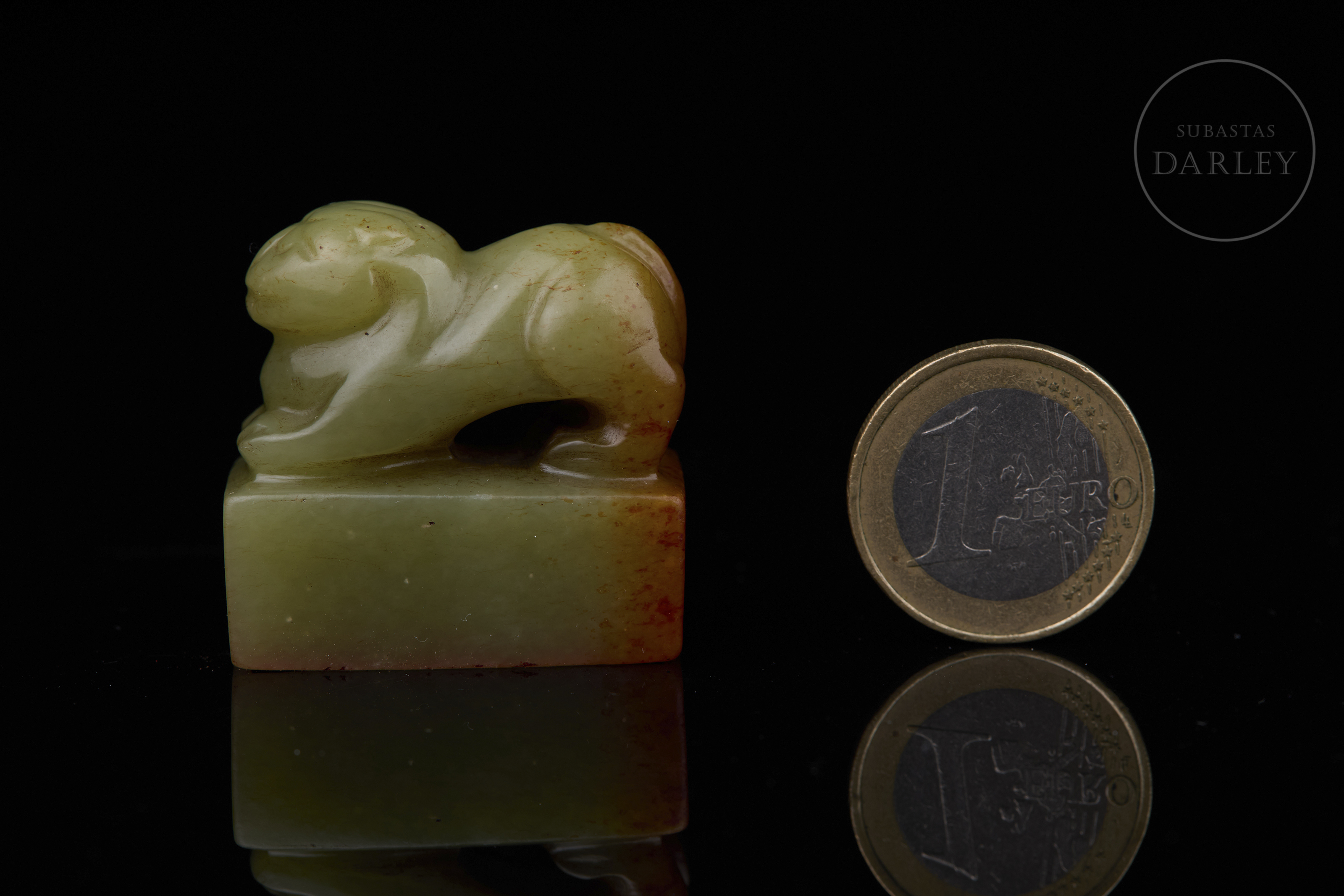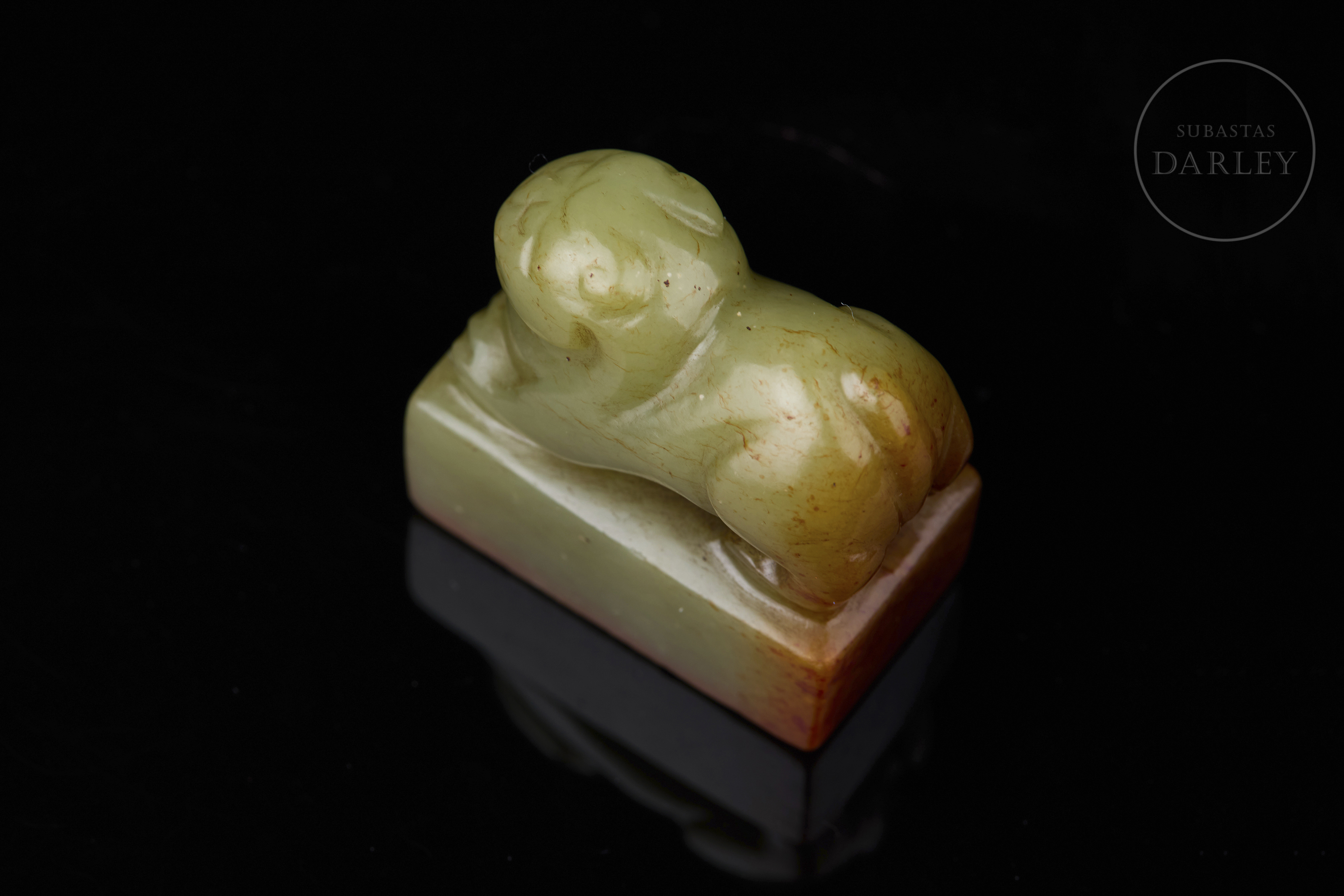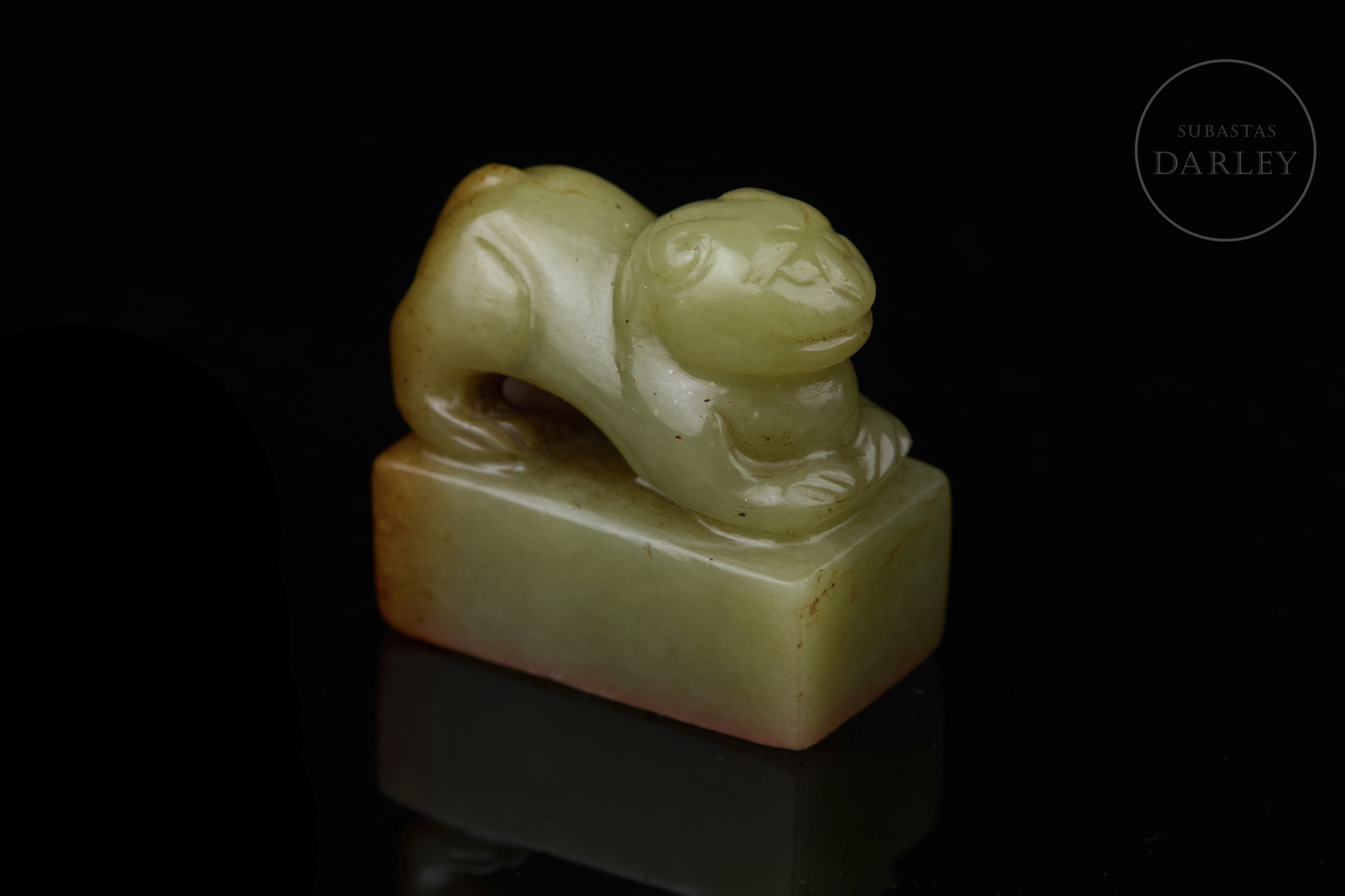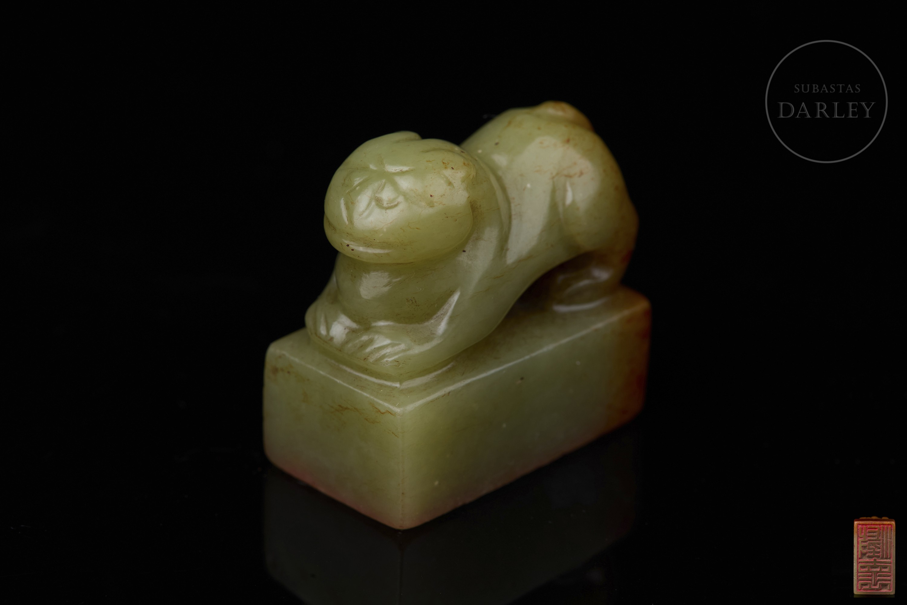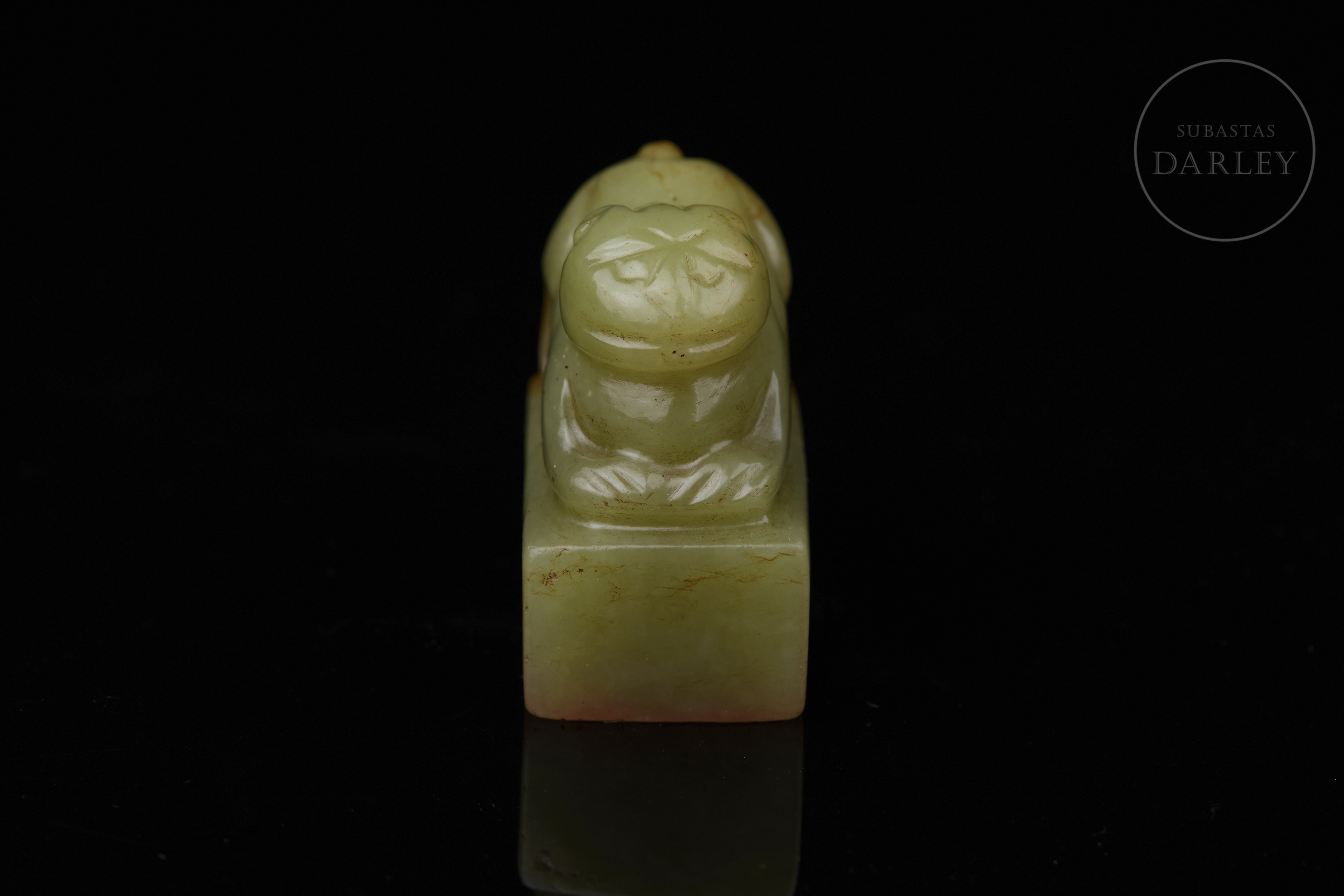 Sello tallado de jade de color verde pálido, de forma rectangular, con un remate escultórico en forma de bestia mítica en reverencia, destacando la musculatura del animal y su expresión hierática. La matriz muestra la inscripción "澄怀" grabada y restos de lacre rojo. Muestra vetas de color óxido rojizo. Dinastía Qing (1644–1912).
