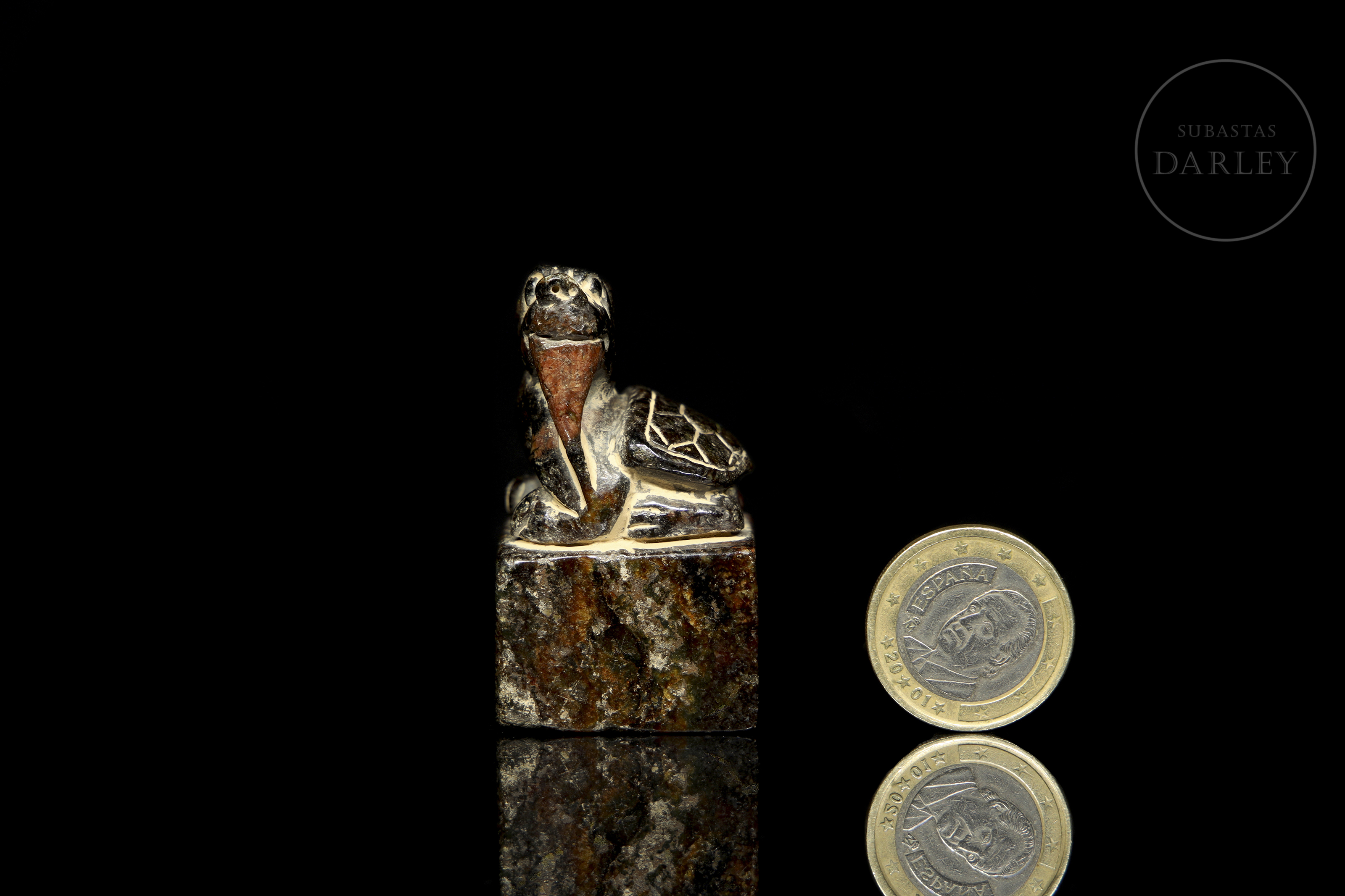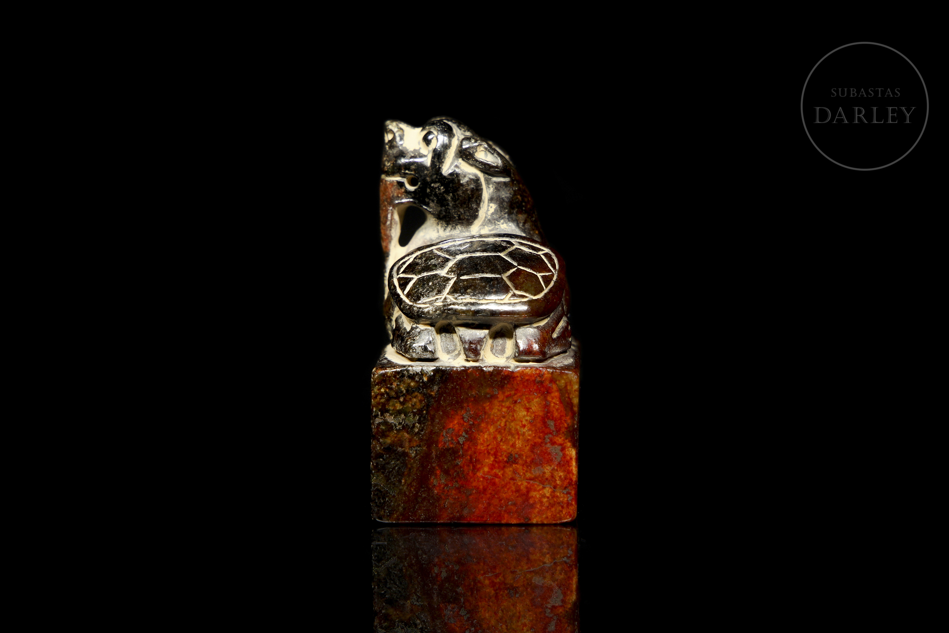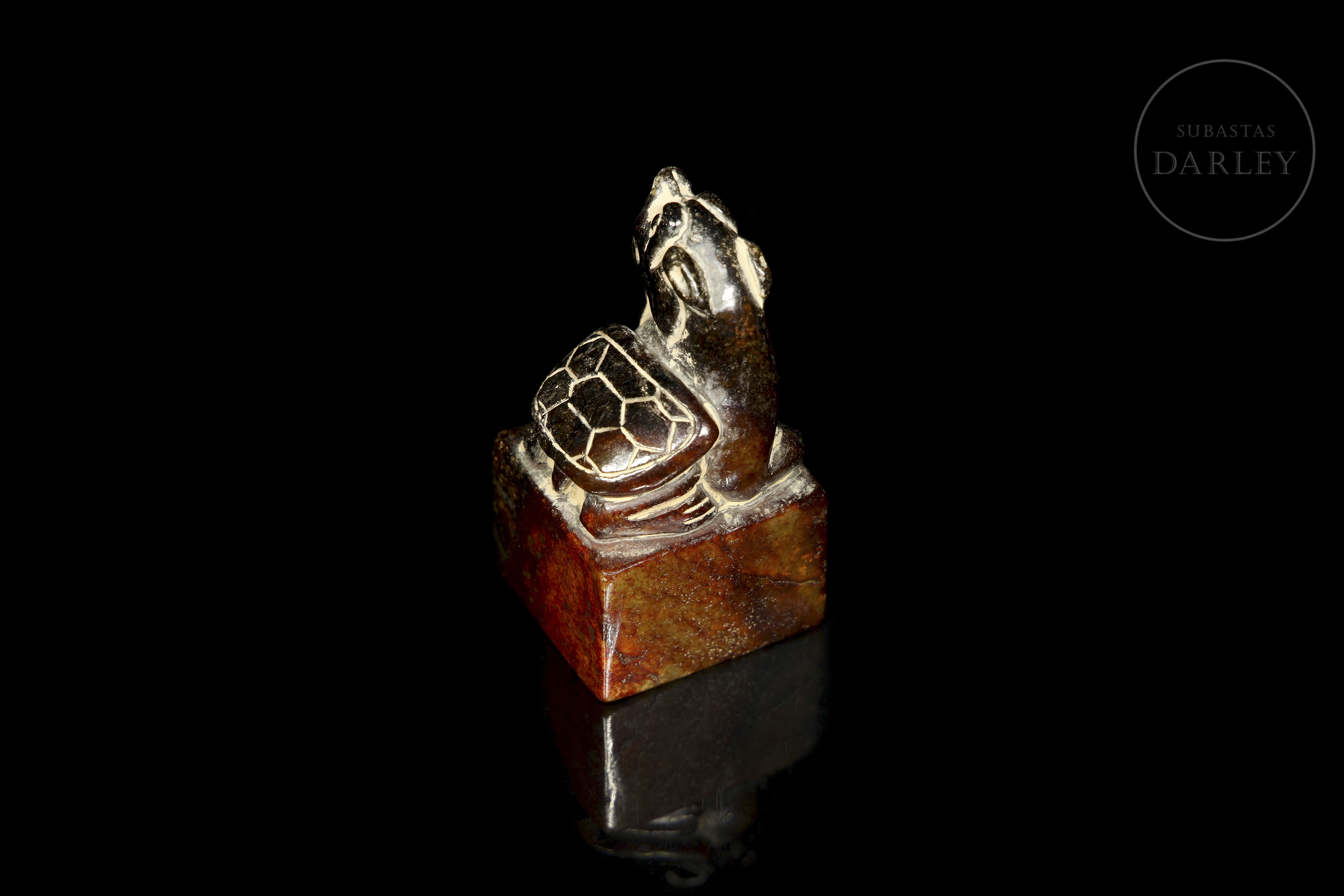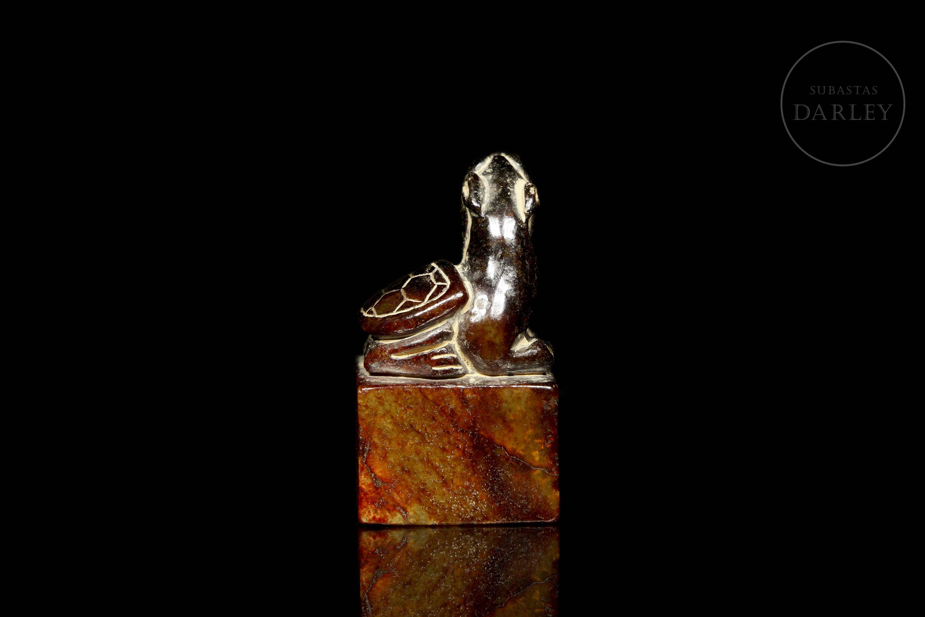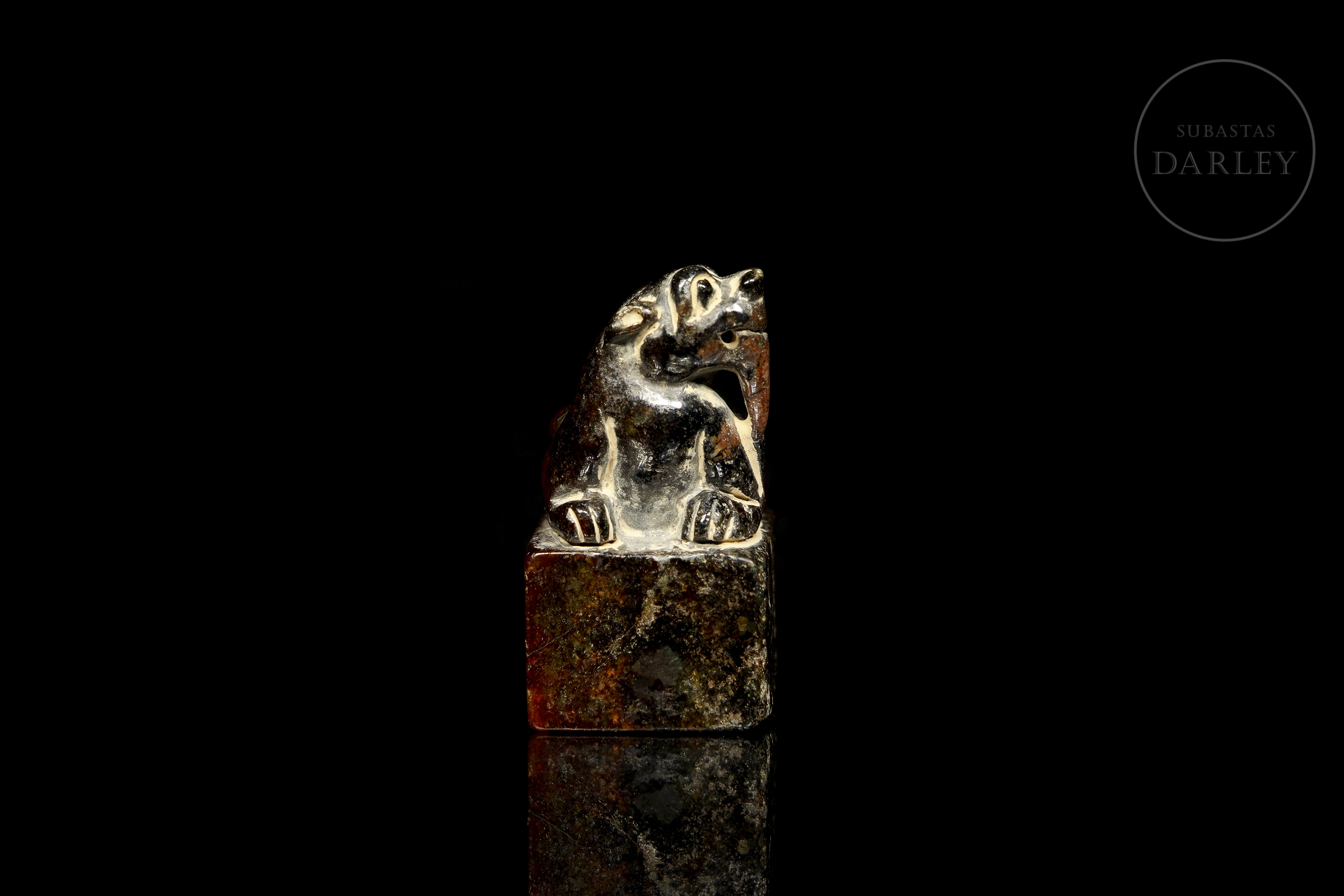 Jade amarillo con una extensa pátina en tonos pardo, marrón rojizo y ocre. Muestra un Bixie agazapado sobre una base cuadrangular. La bestia destaca por su cabeza alzada con una larga barba, extremidades detalladas y un grueso caparazón con patrones hexagonales. La base muestra caracteres incisos. Dinastía Song (960–1279).