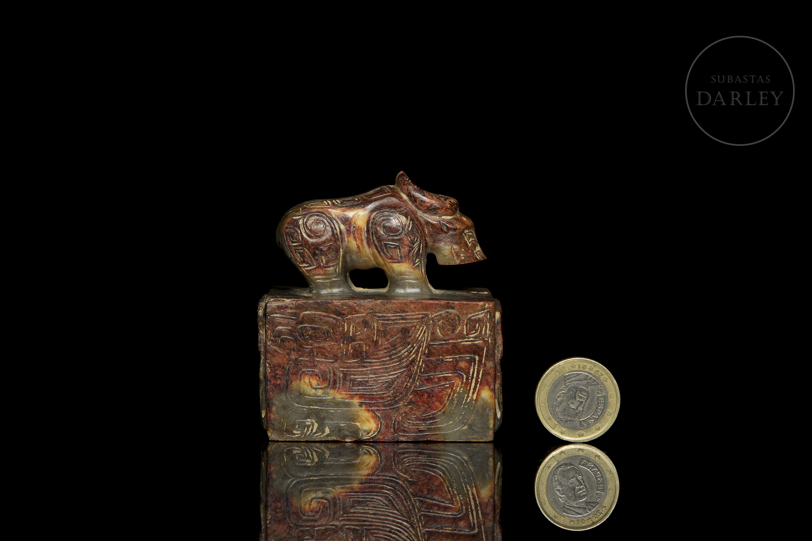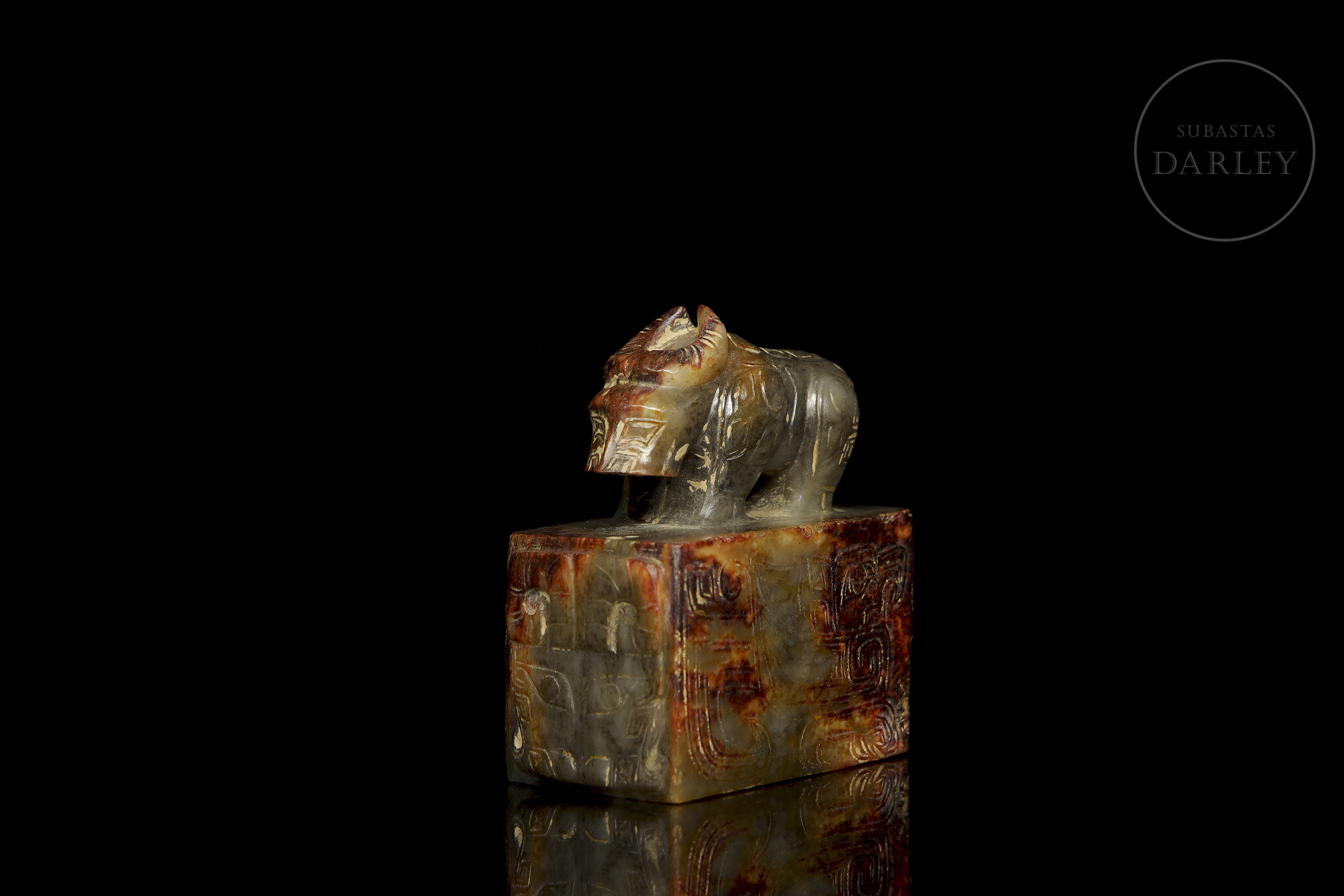 Jade amarillo tallado, cubierto por una intensa pátina de tonos ocres, rojizos y verdosos. Posee una base rectangular, sobre la que se dispone un buey erguido, de talla esquemática, extremidades robustas, afilados cuernos y finos relieves de estilo arcaico incisos, tanto sobre la bestia, como en el perímetro de la base. En la zona inferior se disponen incisos. Dinastía Shang (aprox. 1600–1046 a.C.) o posterior.