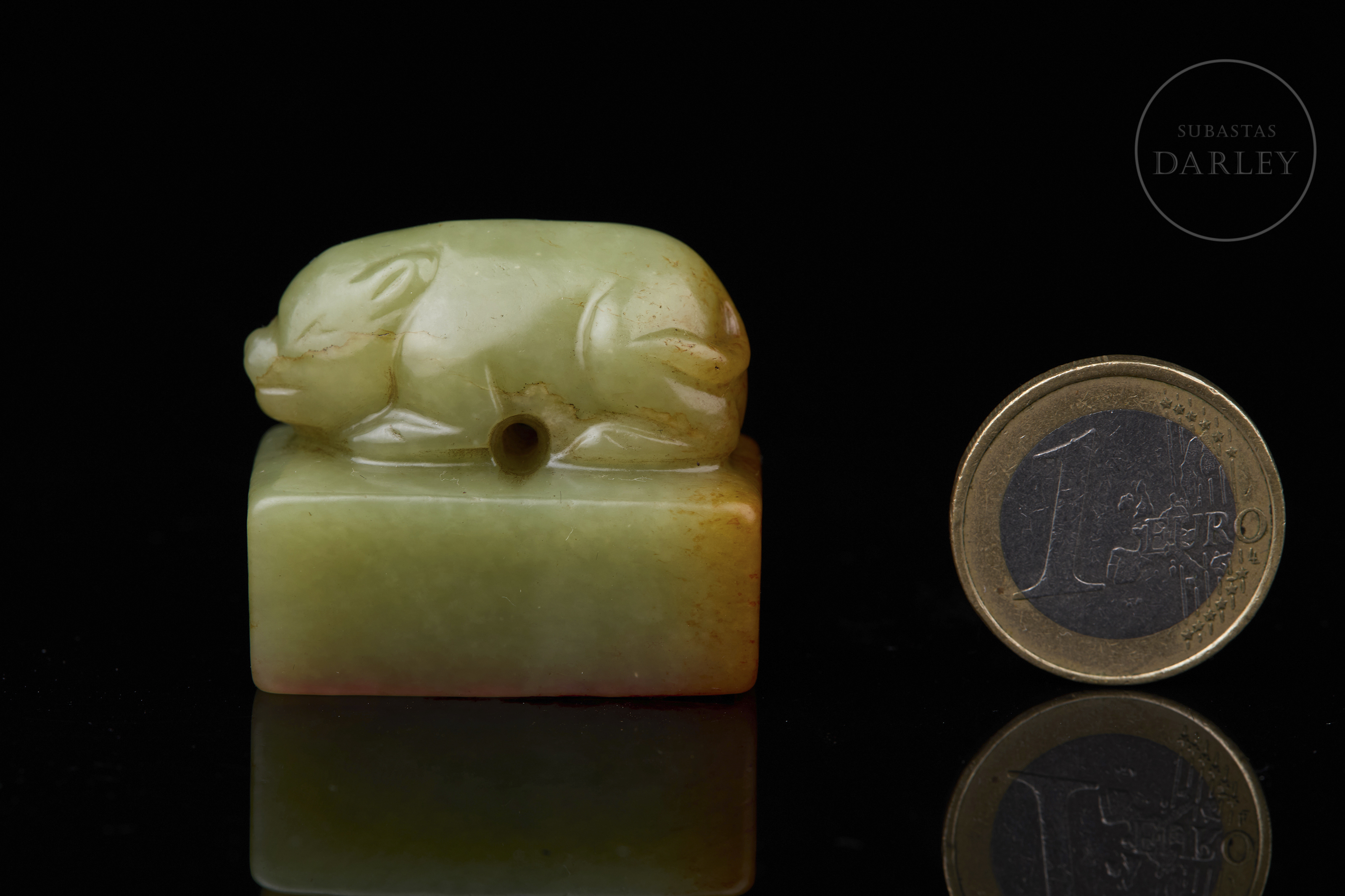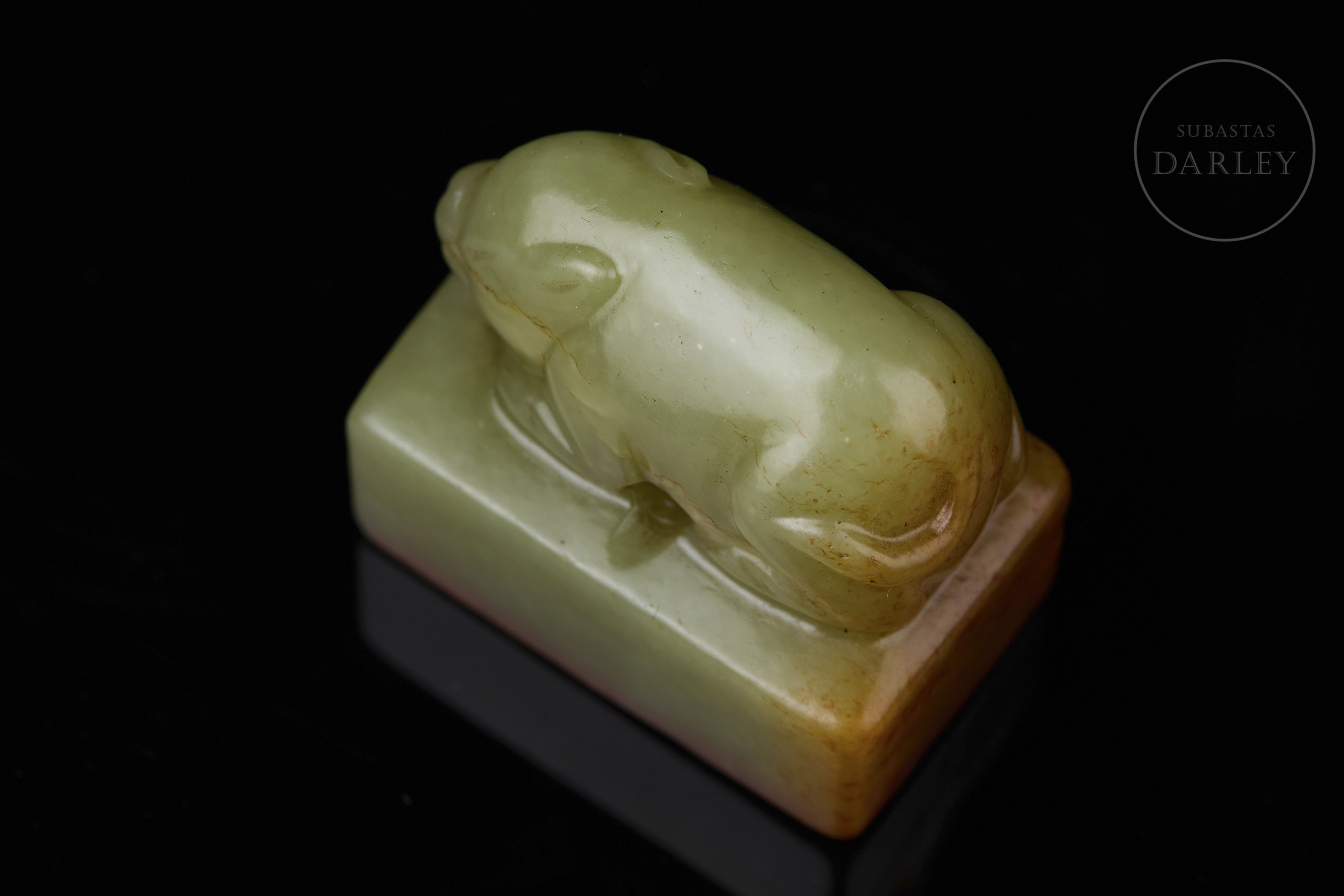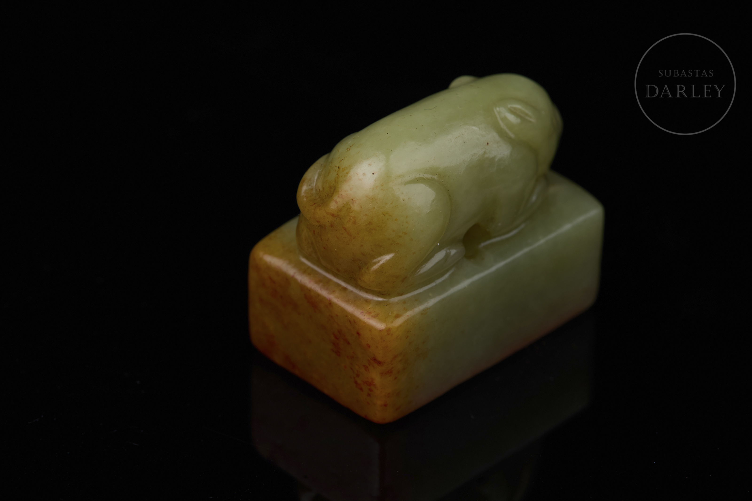Sello tallado de jade de color amarillo verdoso, de forma rectangular, con un remate escultórico en forma de cerdo agazapado que yace tranquilamente sobre la base. El color es un amarillo miel con vetas naturales de tono marrón rojizo en los laterales y base. La base muestra la inscripción " 杏花春雨江南" y restos de lacre rojo. Dinastía Qing (1644–1912).