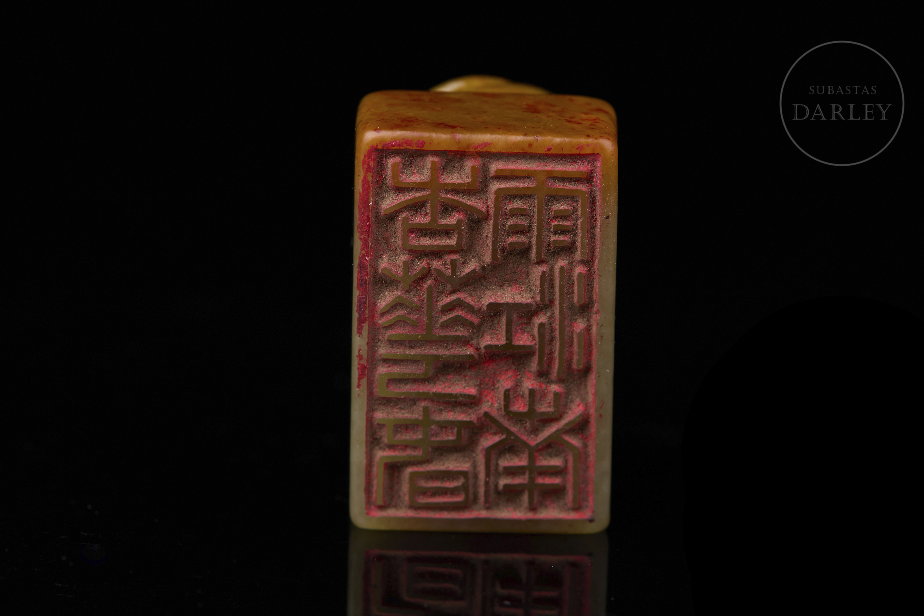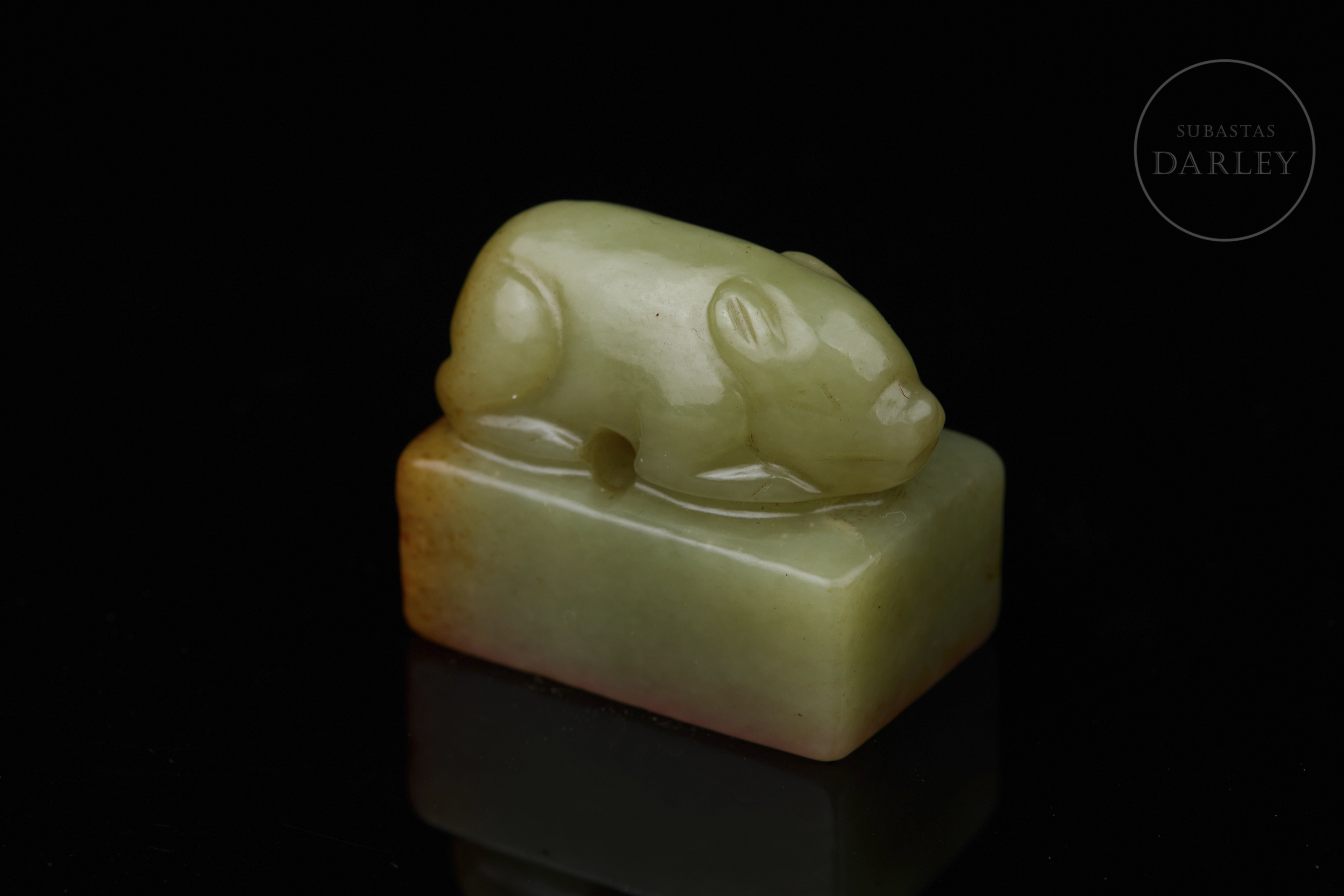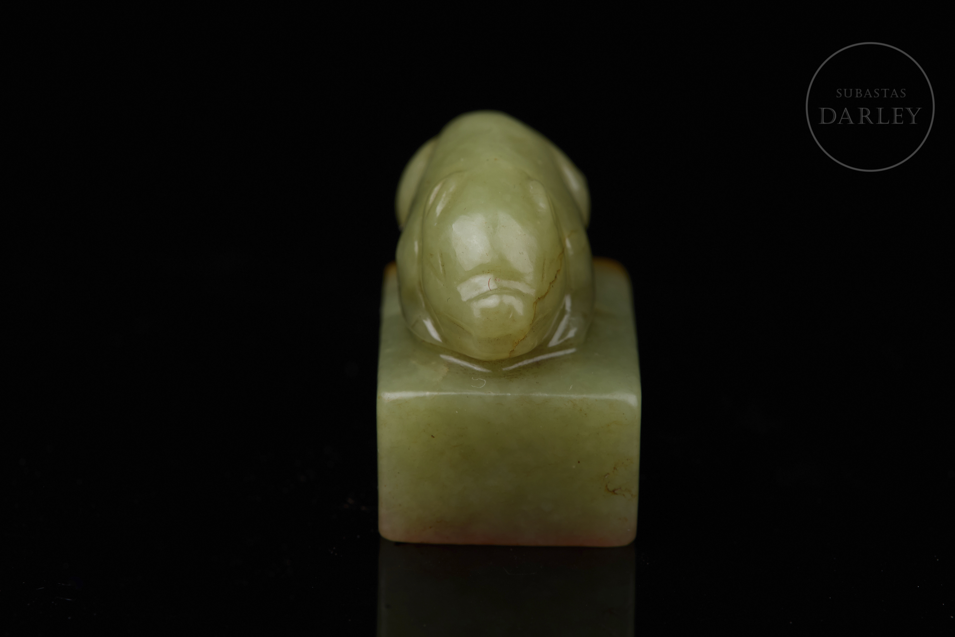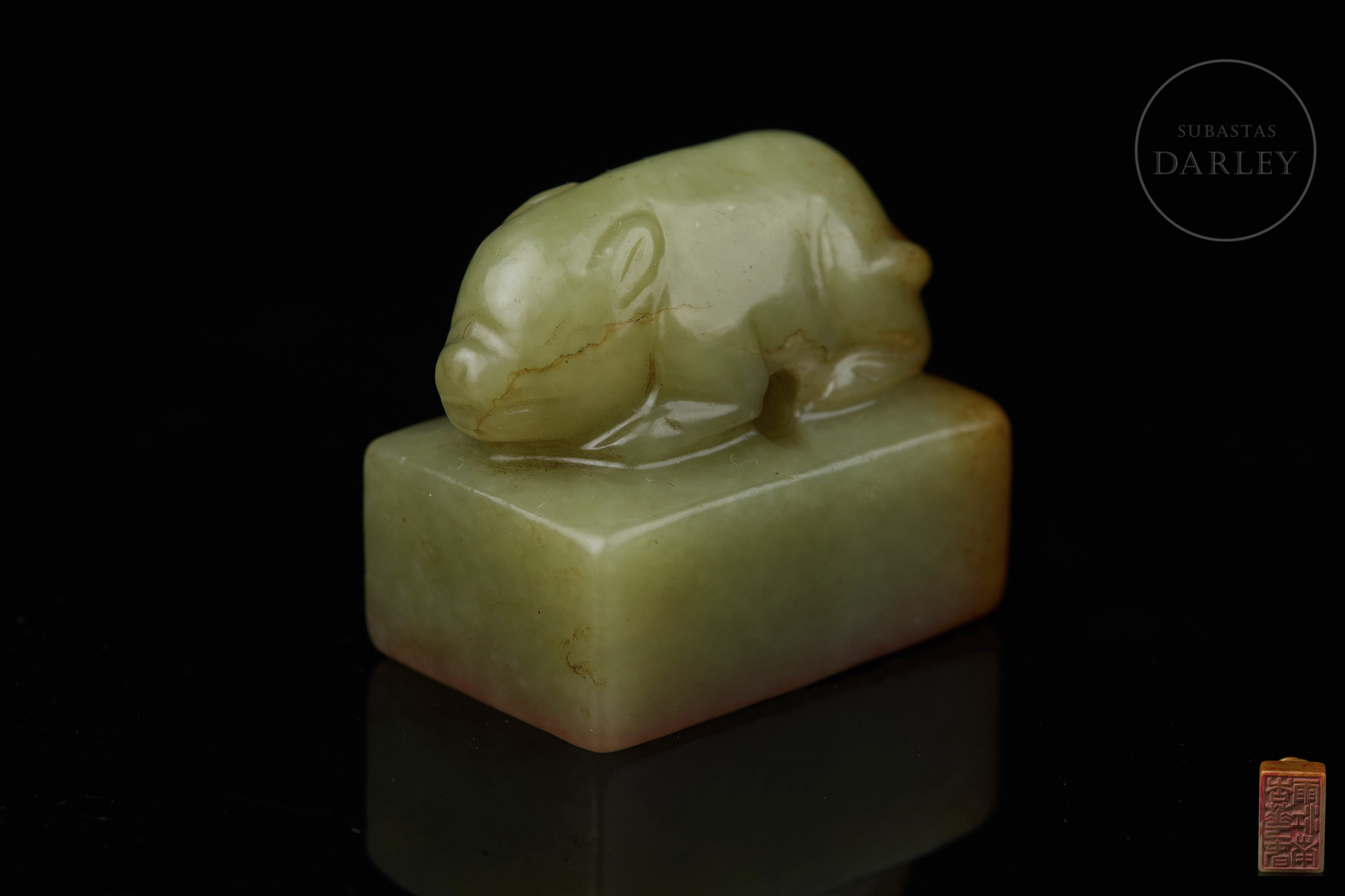 Sello tallado de jade de color amarillo verdoso, de forma rectangular, con un remate escultórico en forma de cerdo agazapado que yace tranquilamente sobre la base. El color es un amarillo miel con vetas naturales de tono marrón rojizo en los laterales y base. La base muestra la inscripción " 杏花春雨江南" y restos de lacre rojo. Dinastía Qing (1644–1912).